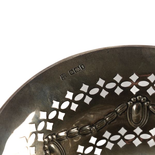 The bonbon dish with pierced decoration, raised on a loaded foot, diameter 15.3cm, Sheffield 1911, the sugar bowl raised on four spherical feet, Sheffield 1910, weight of sugar bowl 146 grams