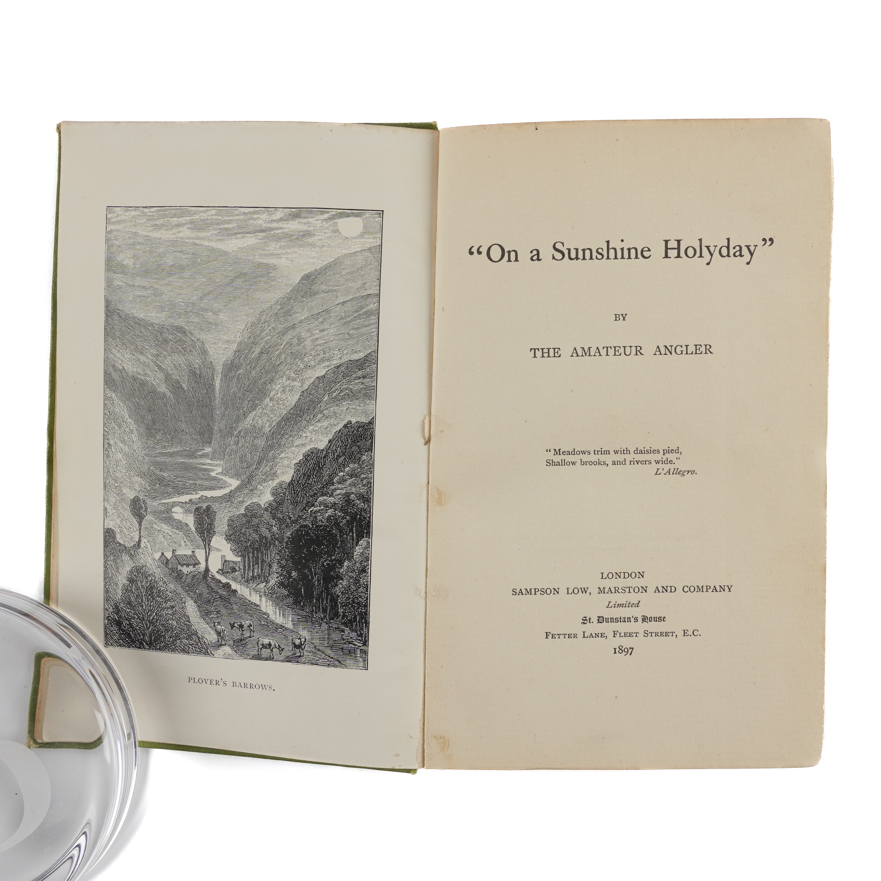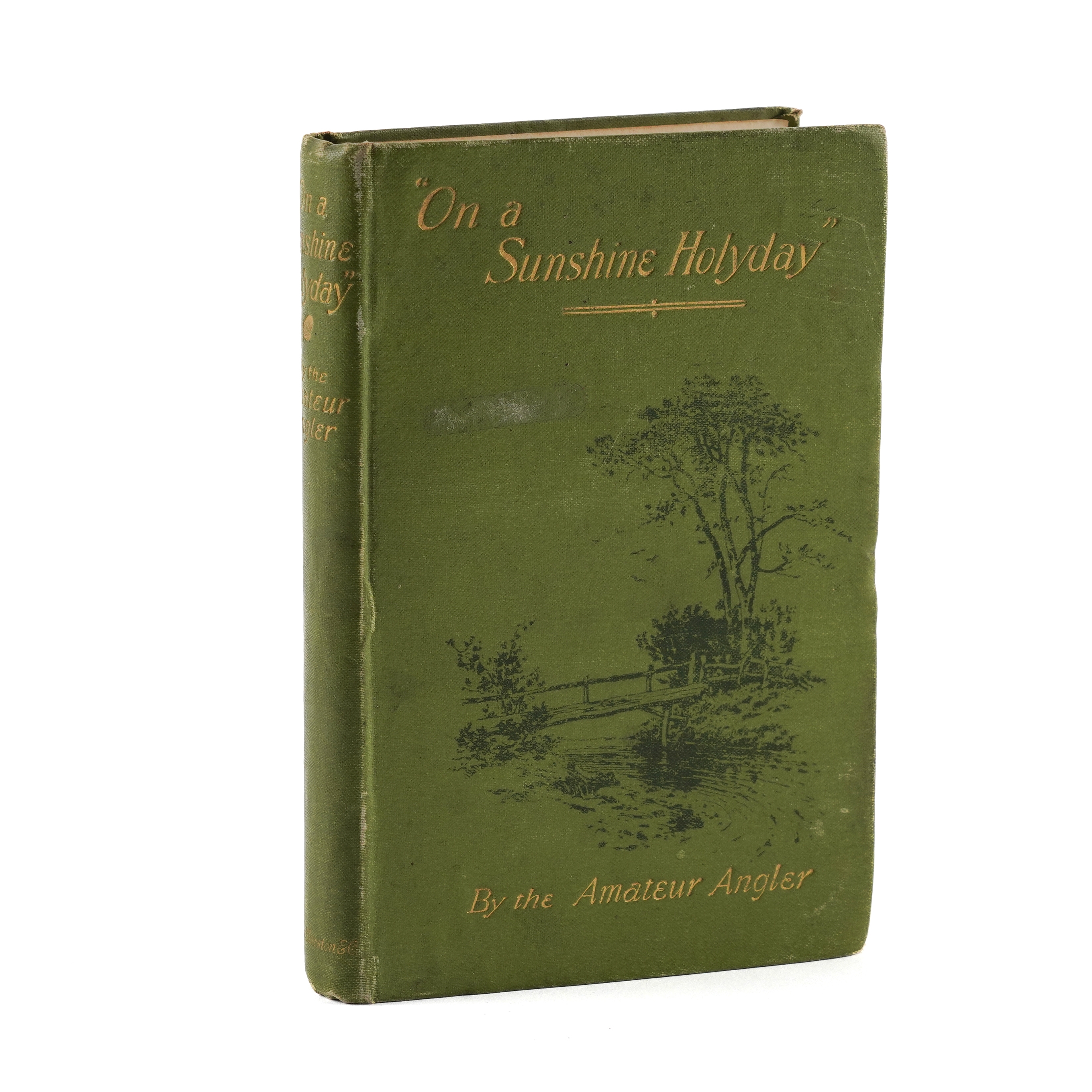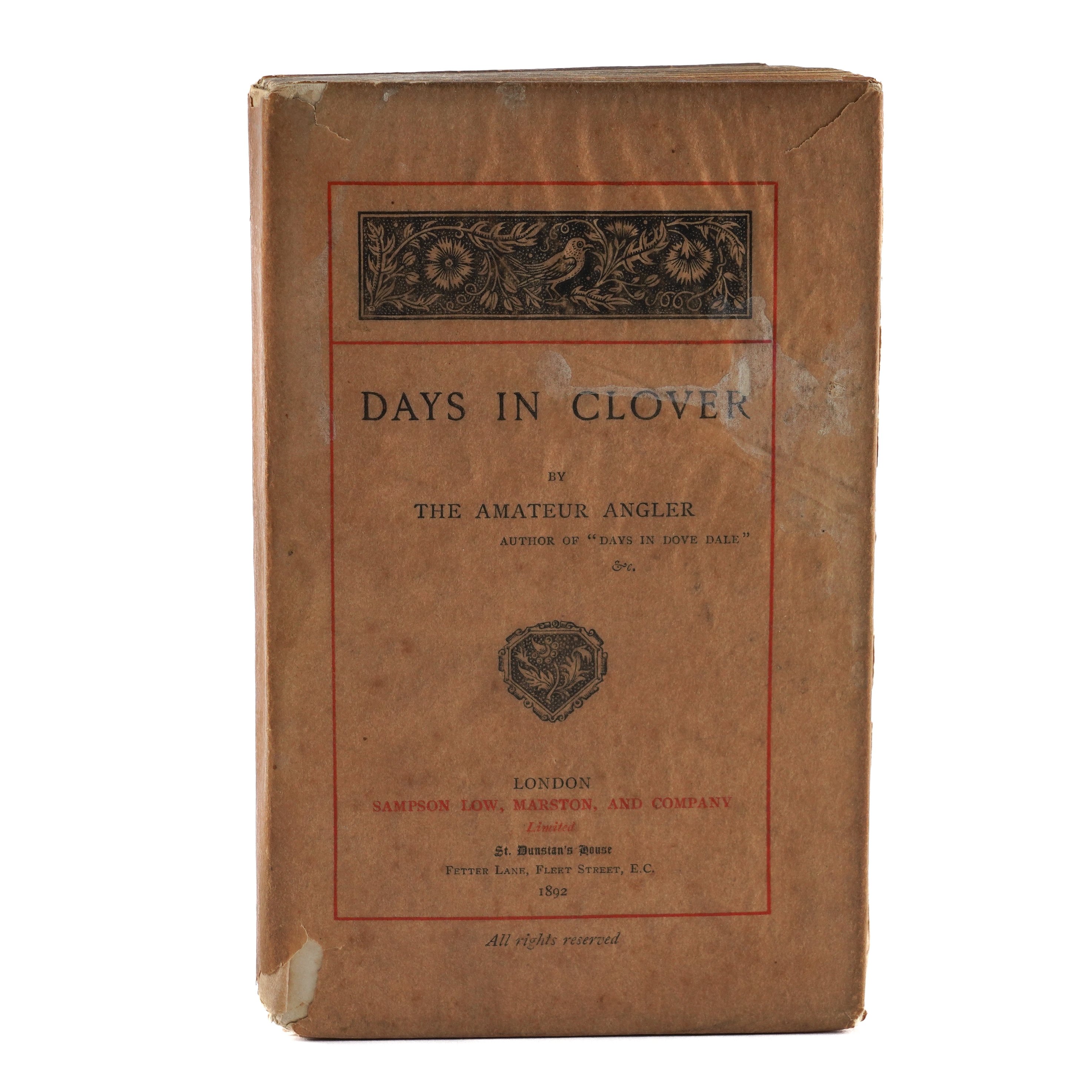 ANGLING - [Edward MARSTON (1825-1914)]. Days in Clover by the Amateur Angler. London: Sampson Low, Marston, and Company, 1892. 8vo (178 x 112mm). Half title, photographed frontispiece and 6 plates, initials and ornaments (some mainly marginal staining to most plates). Original parchment boards printed in red and black (some white staining and browning to the wrappers, a few short tears). FIRST EDITION. NUMBER 71 OF 250 "LARGE PAPER" COPIES INITIALLED BY THE AUTHOR. The book includes letters originally published in "The Fishing Gazette" describing angling holidays principally in Wales and on the River Wye. RARE. With the same author's "On a Sunshine Holyday" [sic] by an Amateur Angler (London, 1897, 8vo, plates, original green pictorial cloth, FIRST EDITION). (2)
