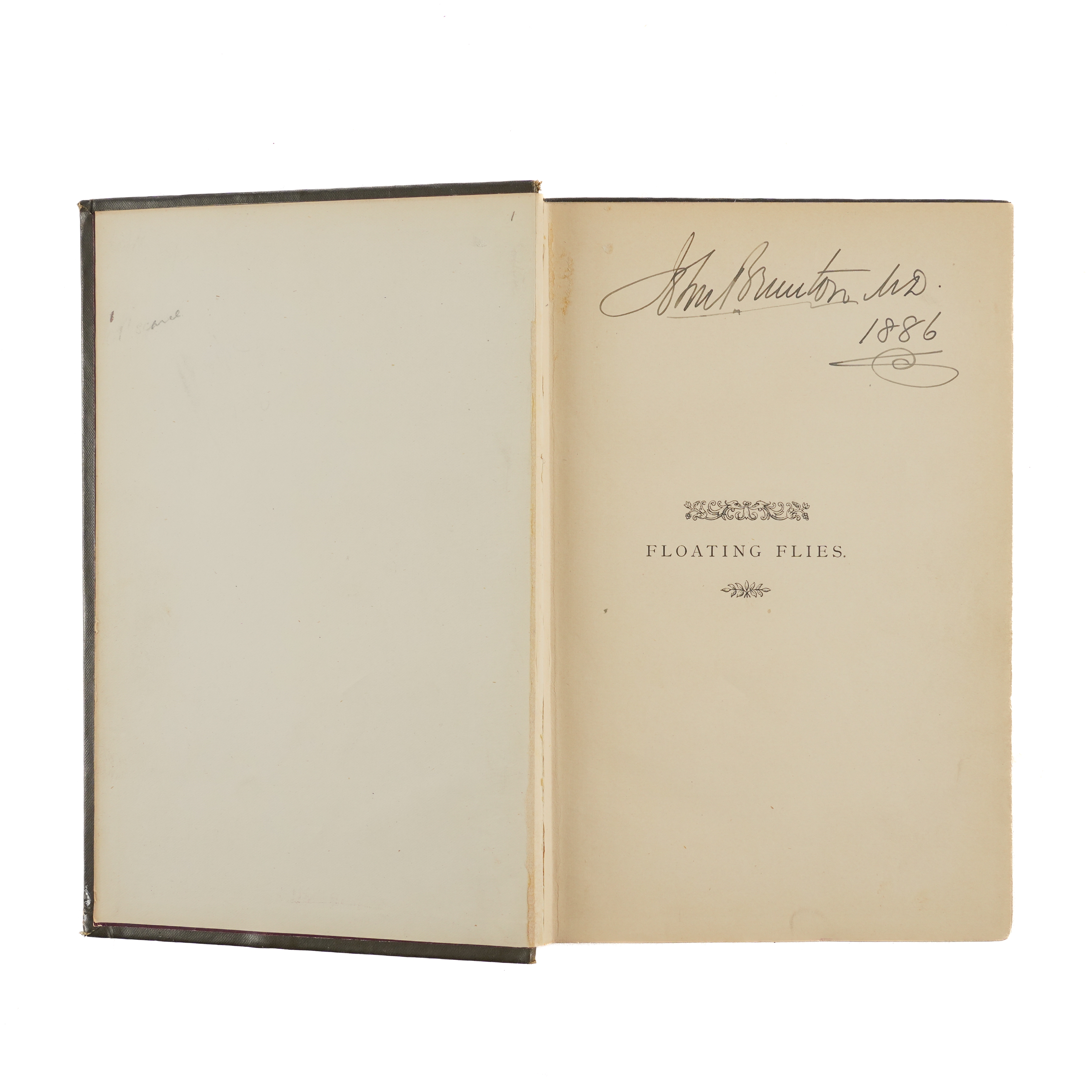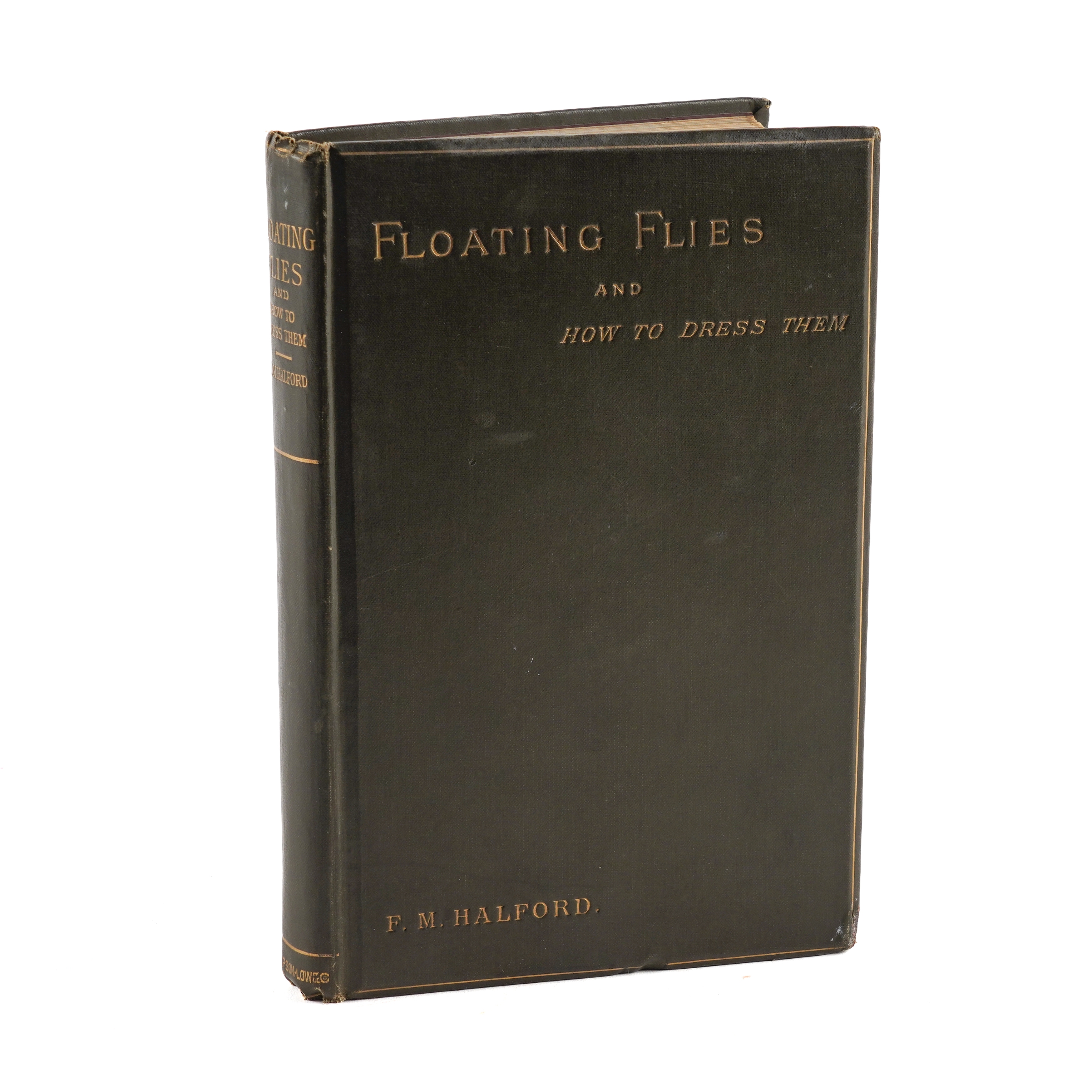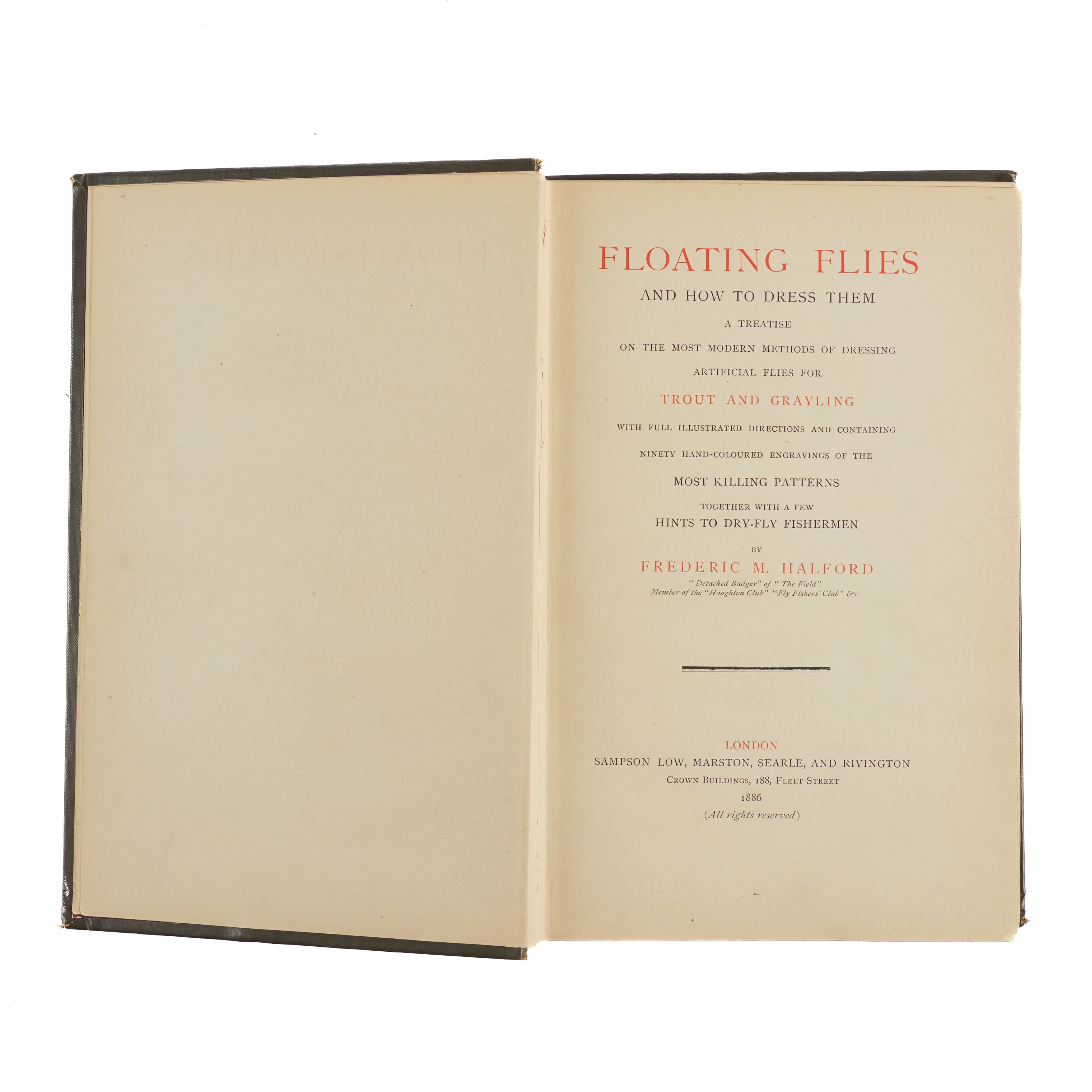 ANGLING - Frederic Maurice HALFORD (1844-1914). Floating Flies and How to Dress Them. A Treatise on the Most Modern Methods of Dressing Artificial Flies for Trout and Grayling. London: Sampson Low, Marston, Searle, and Rivington, 1886. Large 8vo (220 x 140mm). Half title, title printed in red and black, hand-coloured plate of "Crawshaw and Co.'s Special Dyes", 9 hand-coloured plates of flies, 33-pages of publisher's advertisements at the end, illustrations and ornaments. Original khaki buckram ruled and lettered in gilt, burgundy endpapers, top edges gilt, others uncut (bump to lower edge, some fraying to the extremities). Provenance: "John [?]Brunton, M.D. 1886" (signature on the half title). FIRST EDITION. The publisher's advertisements at the end refer to "a large-paper edition, printed on Dutch hand-made paper, limited to 100 copies for England and 50 copies for America, price 30s. (This Edition is exhausted.) Small paper edition - Demy 8vo, first edition limited to 500 copies, cloth, 15s., post free." Although no limitation is stated in the present copy, it would seem to be part of this second set of "500 copies".