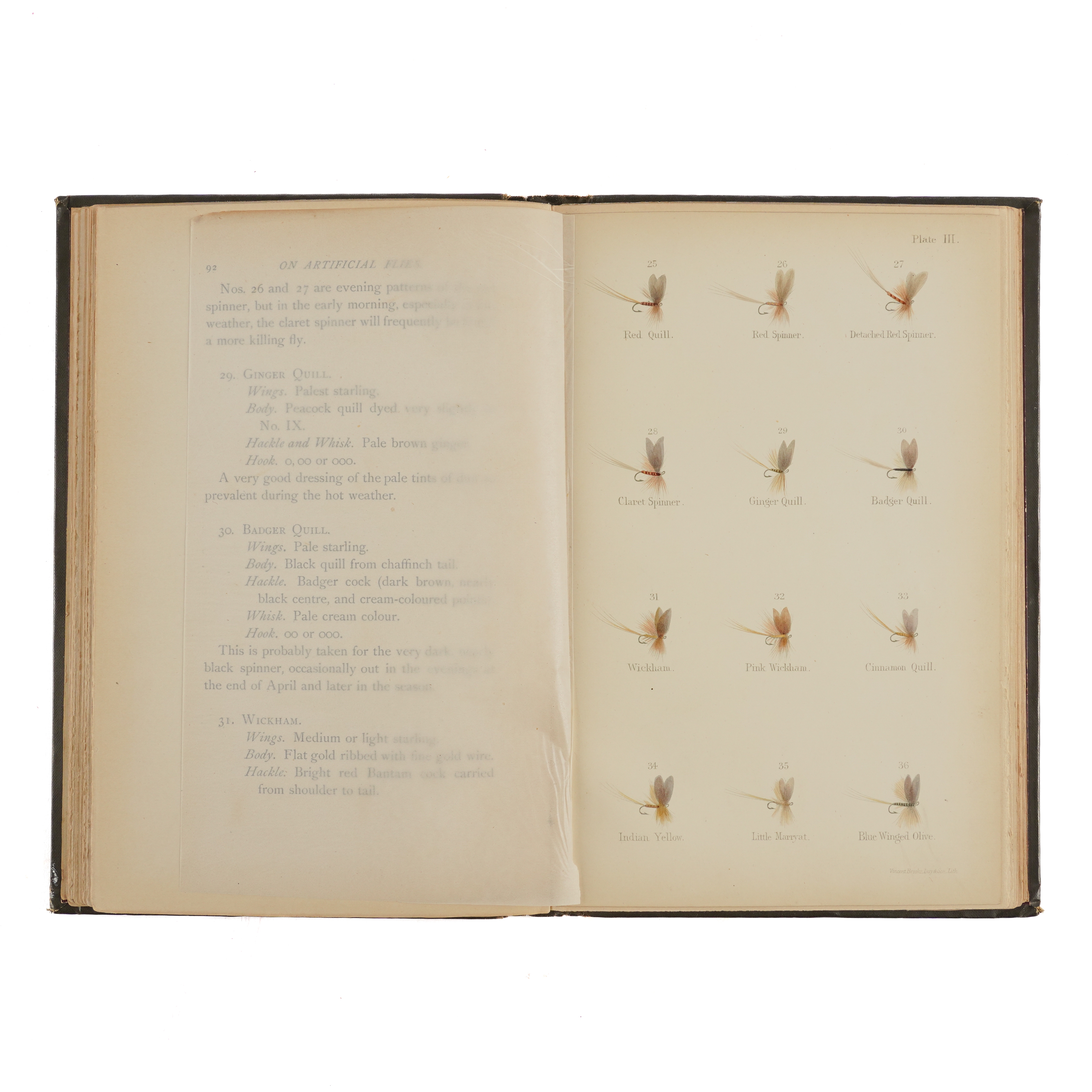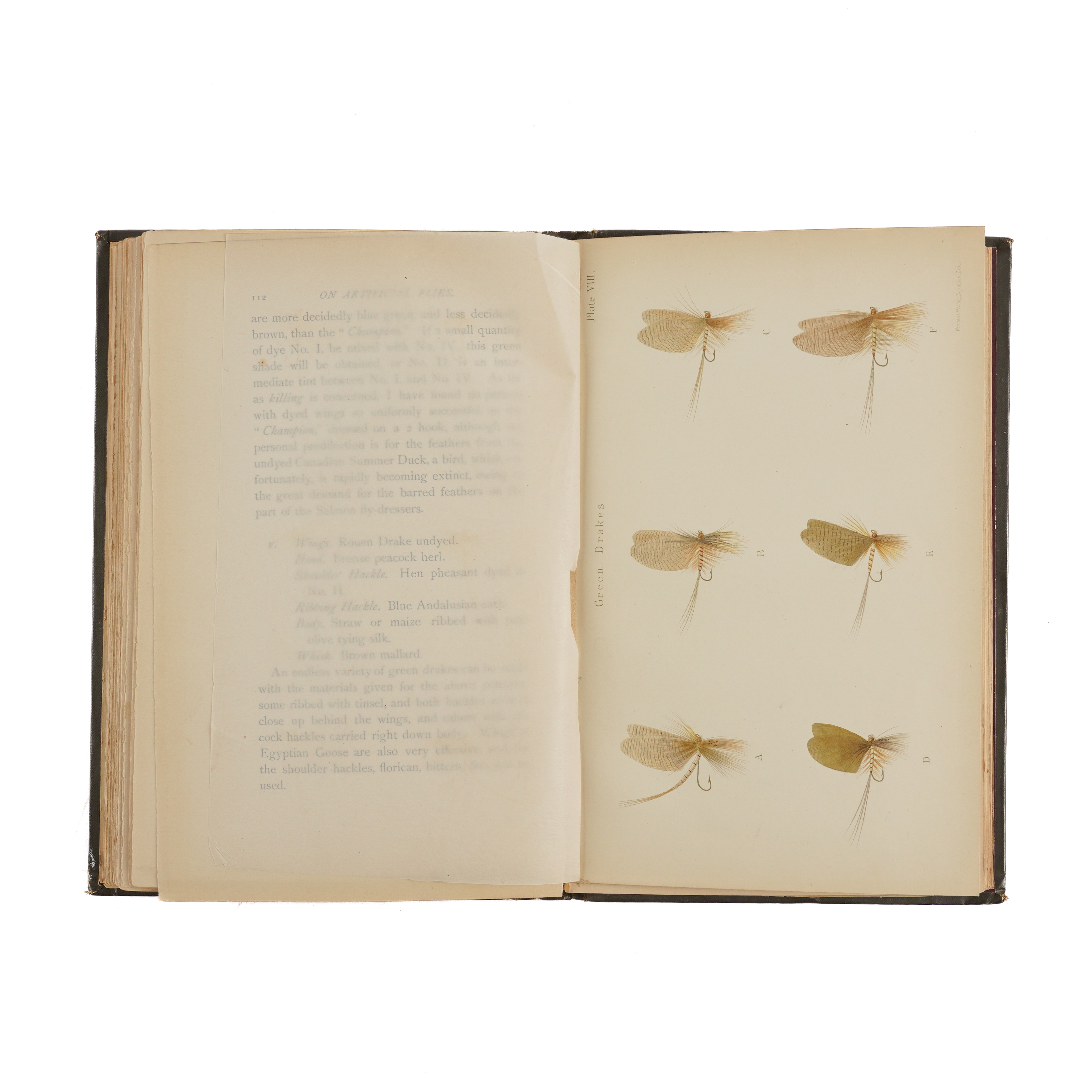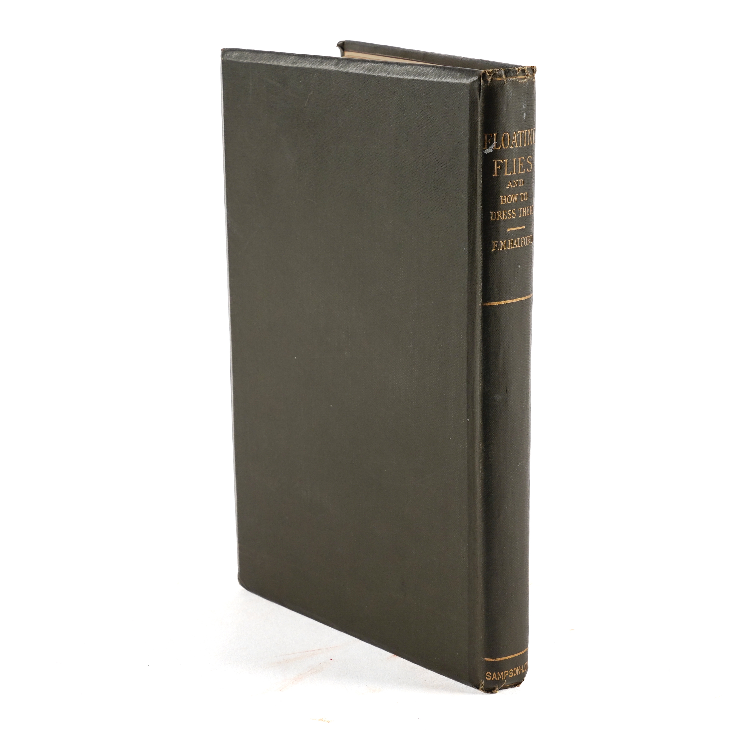 ANGLING - Frederic Maurice HALFORD (1844-1914). Floating Flies and How to Dress Them. A Treatise on the Most Modern Methods of Dressing Artificial Flies for Trout and Grayling. London: Sampson Low, Marston, Searle, and Rivington, 1886. Large 8vo (220 x 140mm). Half title, title printed in red and black, hand-coloured plate of "Crawshaw and Co.'s Special Dyes", 9 hand-coloured plates of flies, 33-pages of publisher's advertisements at the end, illustrations and ornaments. Original khaki buckram ruled and lettered in gilt, burgundy endpapers, top edges gilt, others uncut (bump to lower edge, some fraying to the extremities). Provenance: "John [?]Brunton, M.D. 1886" (signature on the half title). FIRST EDITION. The publisher's advertisements at the end refer to "a large-paper edition, printed on Dutch hand-made paper, limited to 100 copies for England and 50 copies for America, price 30s. (This Edition is exhausted.) Small paper edition - Demy 8vo, first edition limited to 500 copies, cloth, 15s., post free." Although no limitation is stated in the present copy, it would seem to be part of this second set of "500 copies".