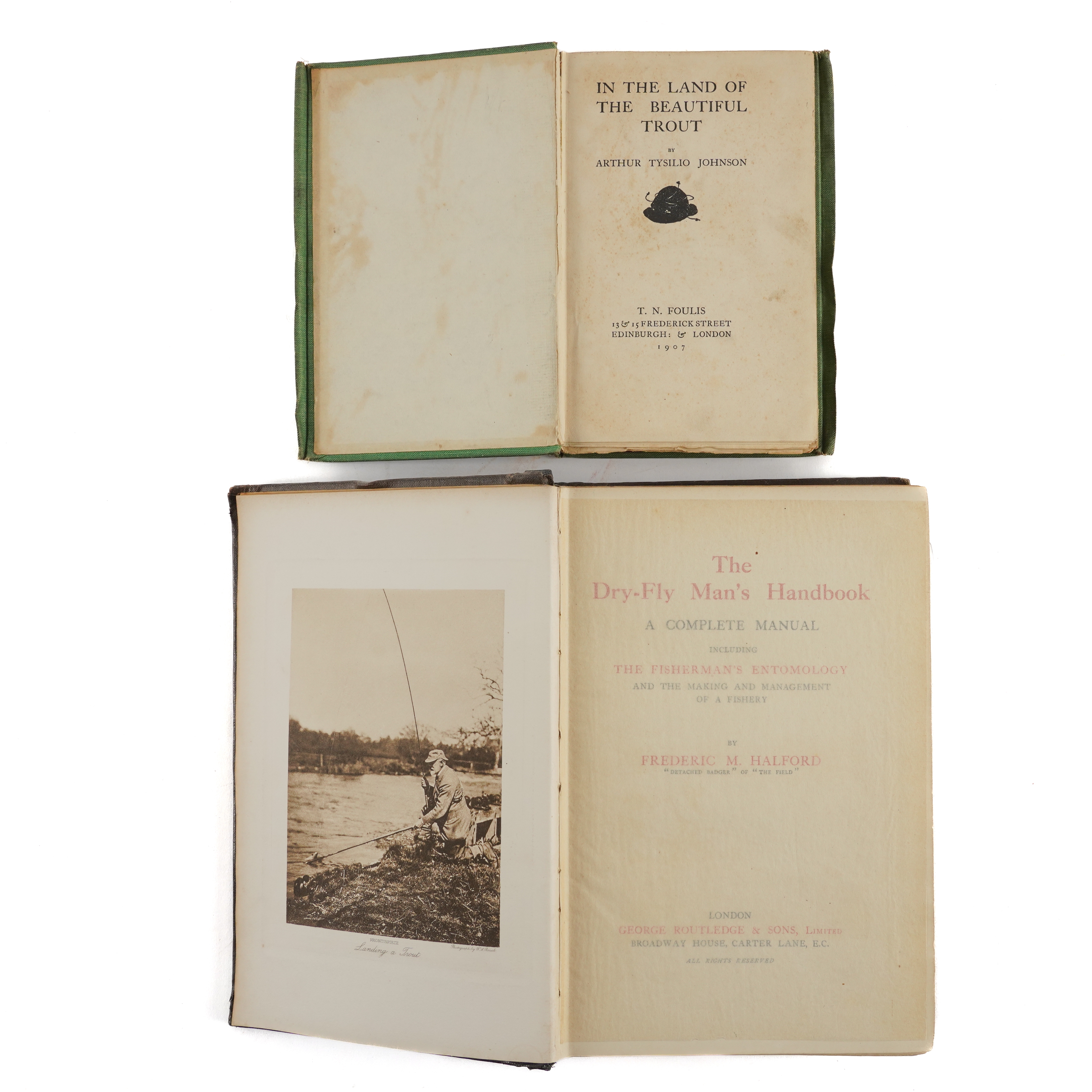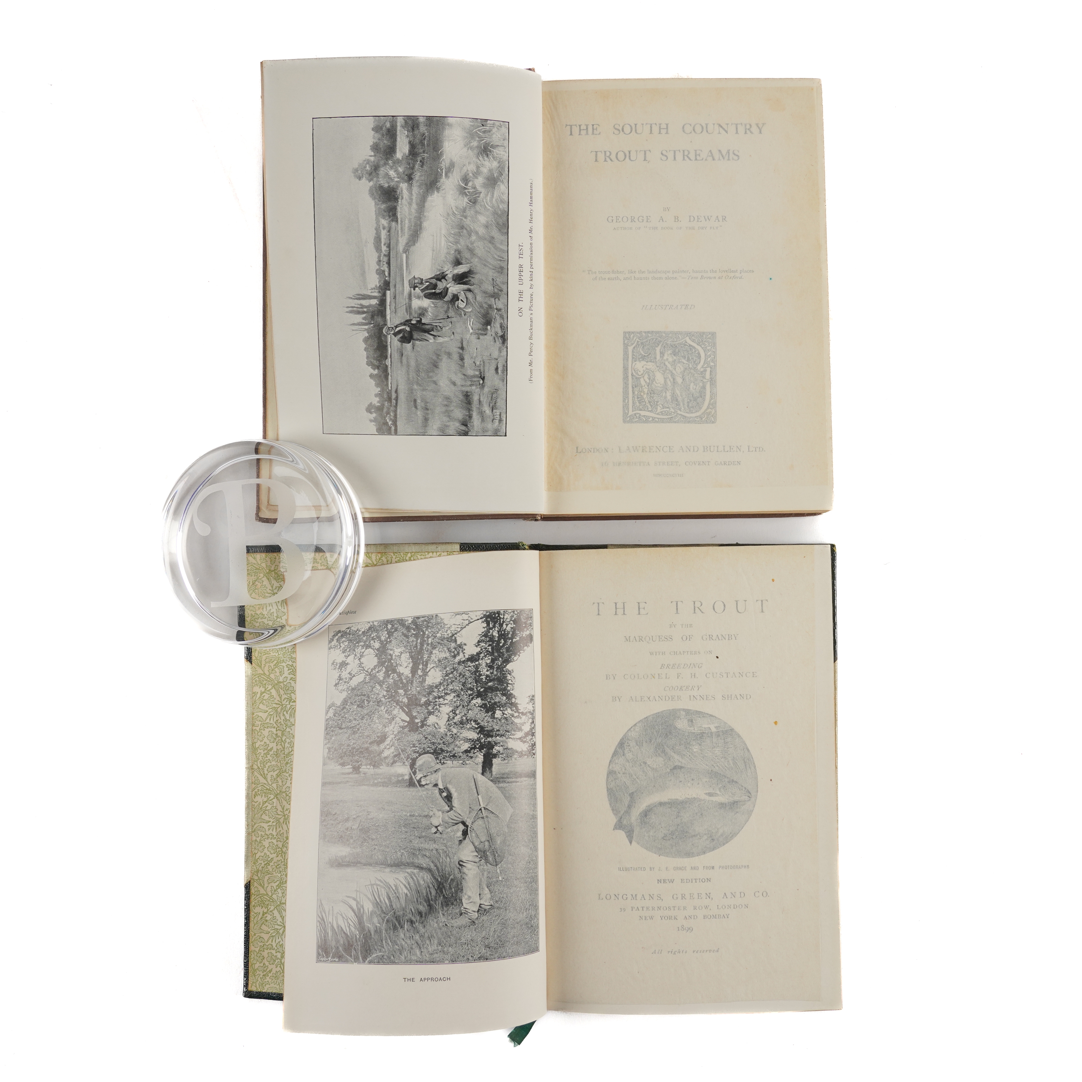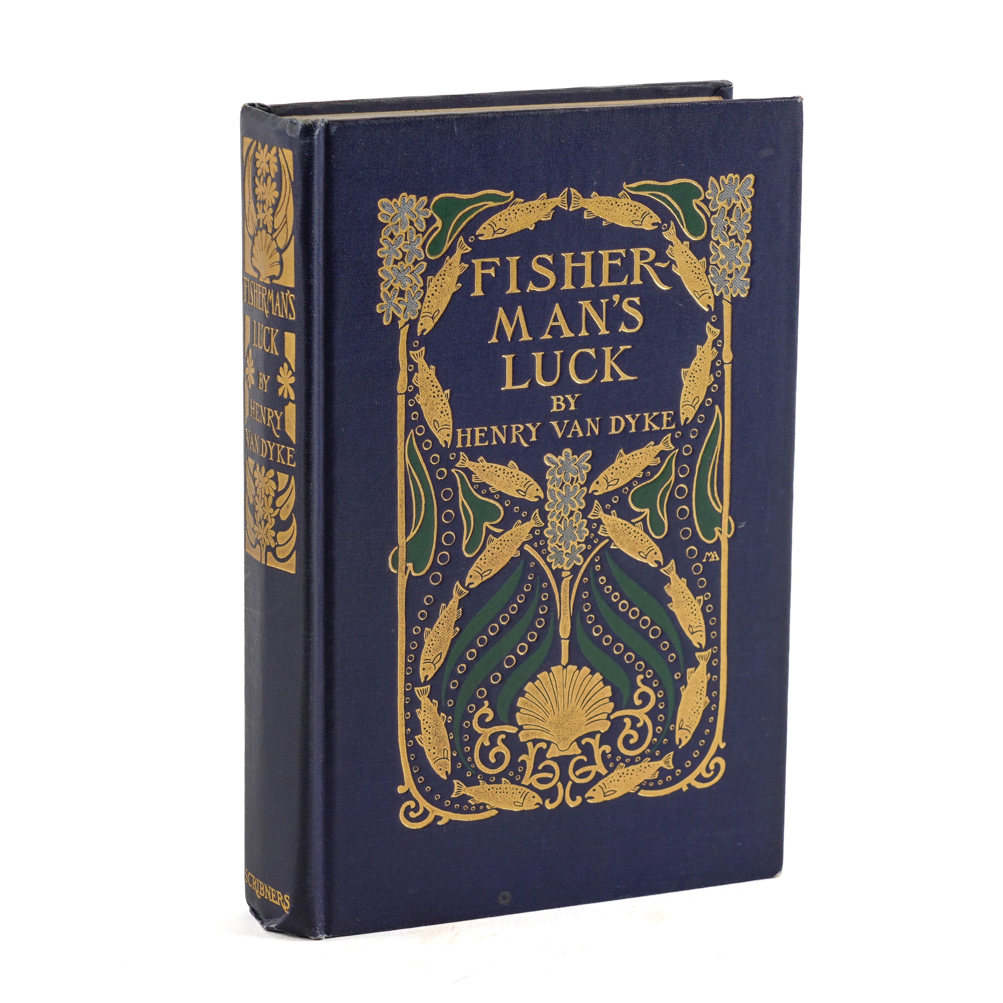 ANGLING - Henry van DYKE (1852-1933). Fisherman's Luck and Some Other Uncertain Things. New York: Charles Scribner's Sons, 1911. 8vo (190 x 125mm). Frontispiece, half title, and 7 plates by F. Walter Taylor. Fine original decorated cloth gilt. Provenance: "Herbert Smith from Mr Alden, Boston, U.S.A., Xmas 1913" (inscription on the front free endpaper); "The Old Corner Book Store, Inc. Boston" (small bookseller's label on the front free endpaper). Reprint. With 7 other books of related interest, namely W. C. Stewart's The Practical Angler or the Art of Trout-Fishing ... Eighth Edition (Edinburgh, 1883, 8vo, illustrations, original pictorial cloth gilt), George A. B. Dewar's The South Country Trout Streams (London, 1898, 8vo, plates, original cloth gilt, FIRST EDITION), The Trout by the Marquess of Granby ... New Edition (London, 1899, 8vo, plates, original half green pictorial morocco gilt, rubbed, part of the "Fur, Feather, & Fin Series edited by Alfred E. T. Watson"), Arthur Tysilio Johnson's In the Land of the Beautiful Trout (London, 1907, 8vo, illustrations, original pictorial cloth gilt, yapp edges, FIRST EDITION), Frederic M. Halford's The Dry-Fly Man's Handbook (London, 1913, large 8vo, plates, original black cloth, rebacked, FIRST EDITION), Harry Plunkett Greene's Where the Bright Waters Meet (London, 1924, large 8vo, plates, original blue cloth gilt, FIRST EDITION) and A Treatise on Fishing with a Hook Attributed to Dame Juliana Berners, Printed in the Book of Saint Albans by Wynken de Worde, Mcccclxxxxvi and Rendered into Modern English by William van Wyck (New York, 1933, 8vo, original pictorial cloth, pencil annotation to the first two pages). (8)