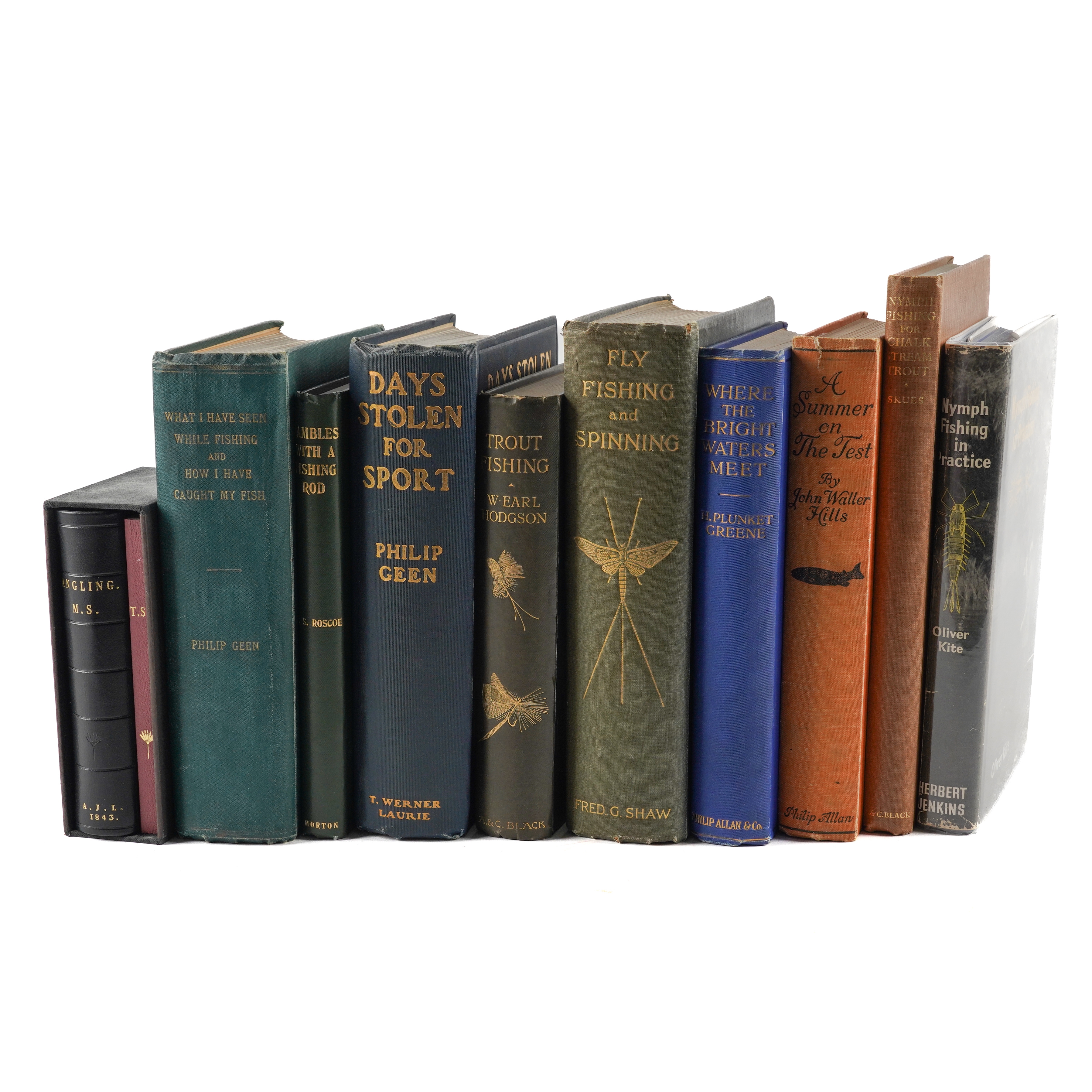 ANGLING - The Diary of A. J. Lane. With a Description of Those Fishes to be Found in British Fresh Waters. A Hitherto Unpublished Manuscript by A. J. Lane, Gentleman (1843). A Transcript from the Original, with Commentary, by Len Cacutt. Ellesmere: The Medlar Press, 1995. 2 volumes, 12mo (147 x 87mm). The printed transcript and commentary in original stiff burgundy wrappers, the facsimile manuscript, with coloured illustrations, in black leatherette ruled in blind and lettered in gilt, both volumes contained in a black cloth slipcase. NUMBER 19 OF 1,489 COPIES. With 9 other books of related interest, namely, Philip Geen's What I Have Seen While Fishing and How I Have Caught my Fish (Richmond, 1905, 8vo, plates, original green cloth gilt, with an original photograph of Thomas Carline "... and some of his many children ..." mounted on the front pastedown, FIRST EDITION), E. S. Roscoe's Rambles with a Fishing-Rod ... Second edition, revised and enlarged (Edinburgh, 1906, 8vo, plates, original green pictorial cloth gilt), Philip Geen's Days Stolen for Sport (London, [n.d. but ?1907], large 8vo, plates, original dark blue cloth gilt, signed by A. V. Oglesby), W. Earl Hodgson's Trout Fishing ... Third Edition (London, 1908, 8vo, plates, original pictorial green buckram gilt), Fred G. Shaw's The Complete Science of Fly Fishing and Spinning (London, 1914, large 8vo, plates, original dark blue pictorial cloth gilt, FIRST EDITION), Harry Plunket Greene's Where the Bright Waters Meet (London, 1924, large 8vo, plates, original blue cloth gilt, FIRST EDITION), John Walter Hills' A Summer on the Test ... The Second Edition (London, 1930, 8vo, plates, original orange cloth), G. E. M. Skues' Nymph Fishing for Chalk Stream Trout (London, 1939, large 8vo, plates, original brown buckram gilt, FIRST EDITION) and Oliver Kite's Nymph Fishing in Practice (London, 1963, 8vo, plates, original blue cloth gilt, dust-jacket, FIRST EDITION). (11)