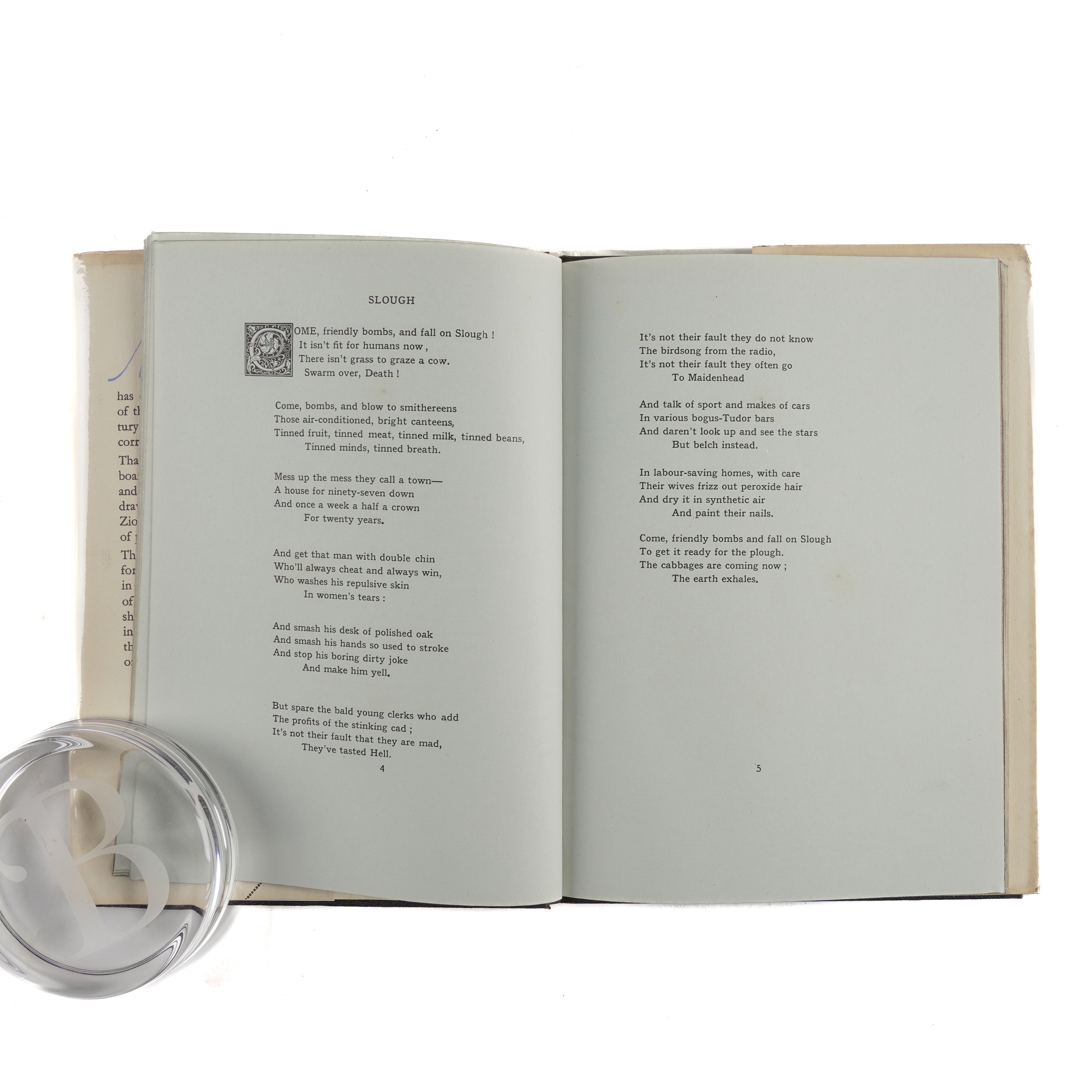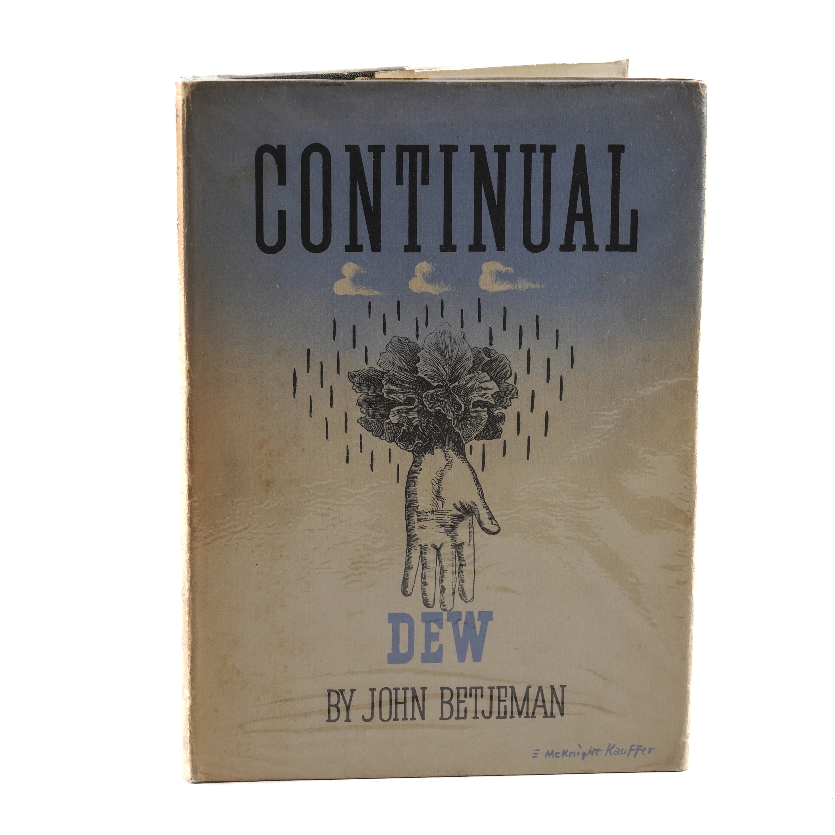 BETJEMAN, John (1906-84). Continual Dew. A Little Book of Bourgeois Verse. London: John Murray, Albemarle Street, 1937. 4to (206 x 146mm). Half title, diagram of a tap on the title page, printed almost entirely on pale blue paper, illustrations and decorations by Hubert de Cronin Hastings, Osbert Lancaster and Gabriel Pippet, initials. Original black textured cloth with decorated lettering and metallic "hinge" design, gilt edges, dust-jacket by Edward McKnight Kauffer with the price of 7/6 unclipped. A FINE COPY OF THE FIRST EDITION OF THE AUTHOR'S SECOND VOLUME OF POETRY which contains two of his most famous poems, "The Arrest of Oscar Wilde at the Cadogan Hotel" and (the contentious) "Slough". "The verse is nostalgic and designed for those who appreciate Sunday in a provincial town, the subtleties of high, low and broad churchmanship, gaslit London, bottle parties in the suburbs, civil servants on the hike, and half-timbered houses on the Southern Electric" (from the turn-in). Please note that the original dust-jacket has been photographed in its modern protective archival Mylar wrapper, thereby avoiding any risk of damage through its temporary removal. Peterson John Betjeman. A Bibliography (2006) A5a.