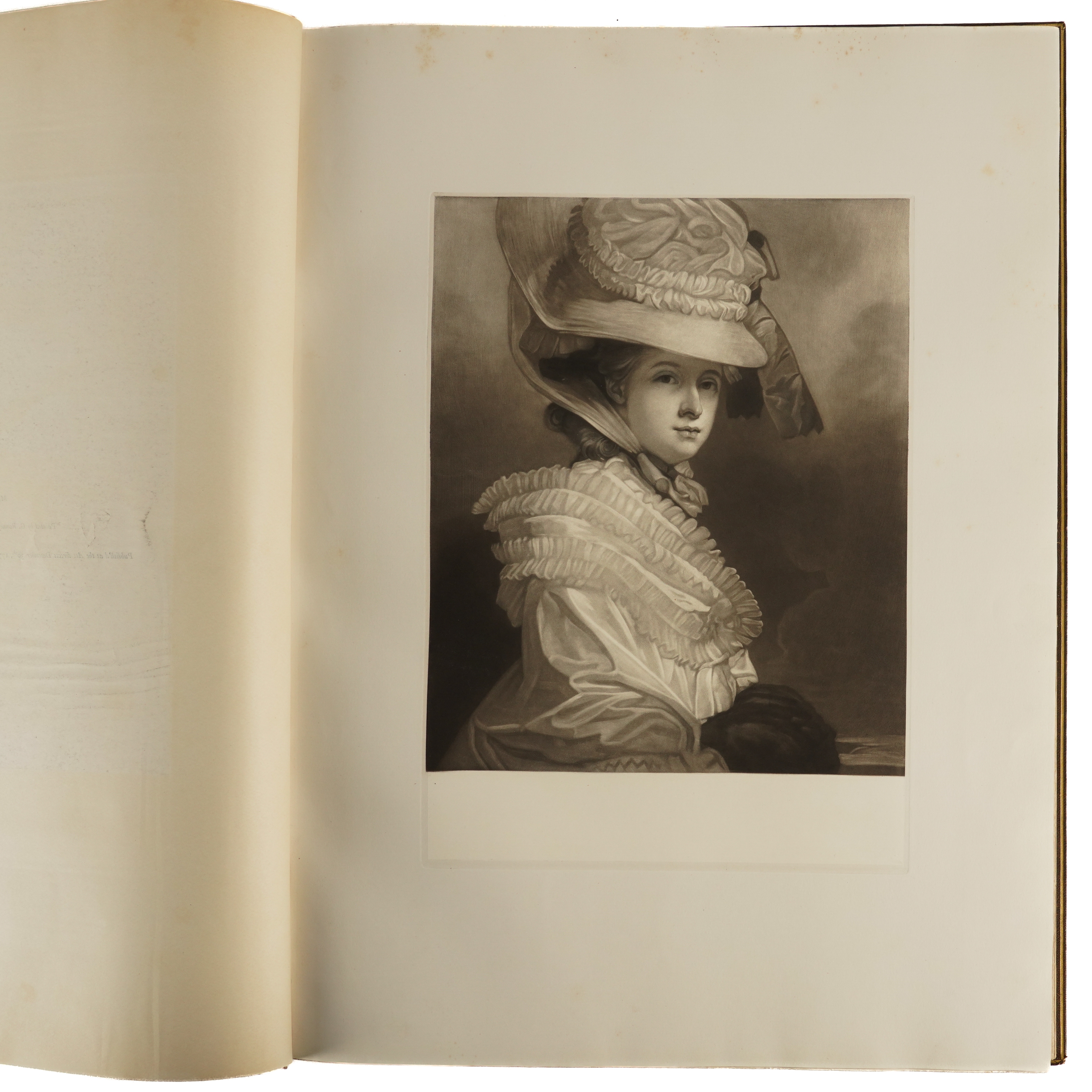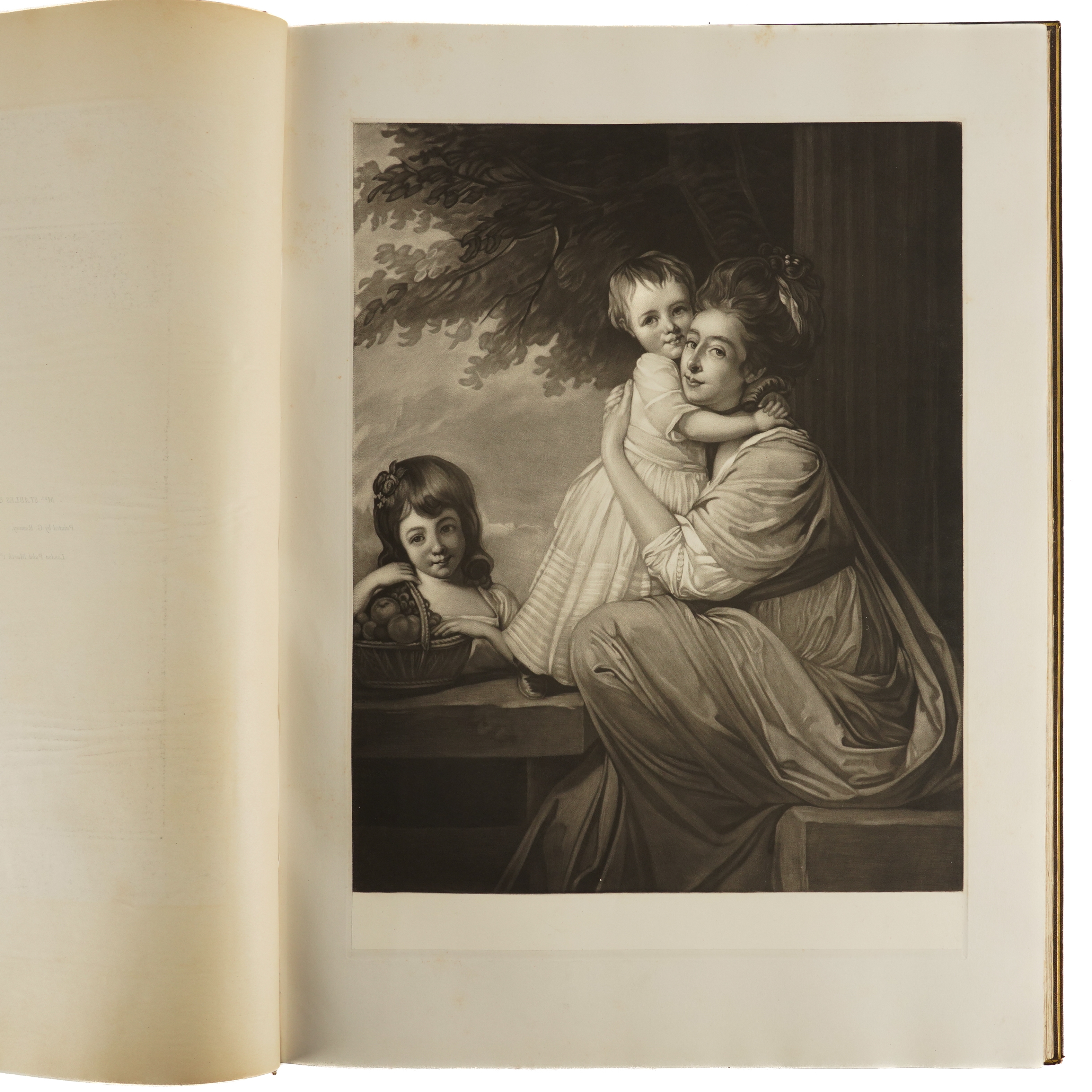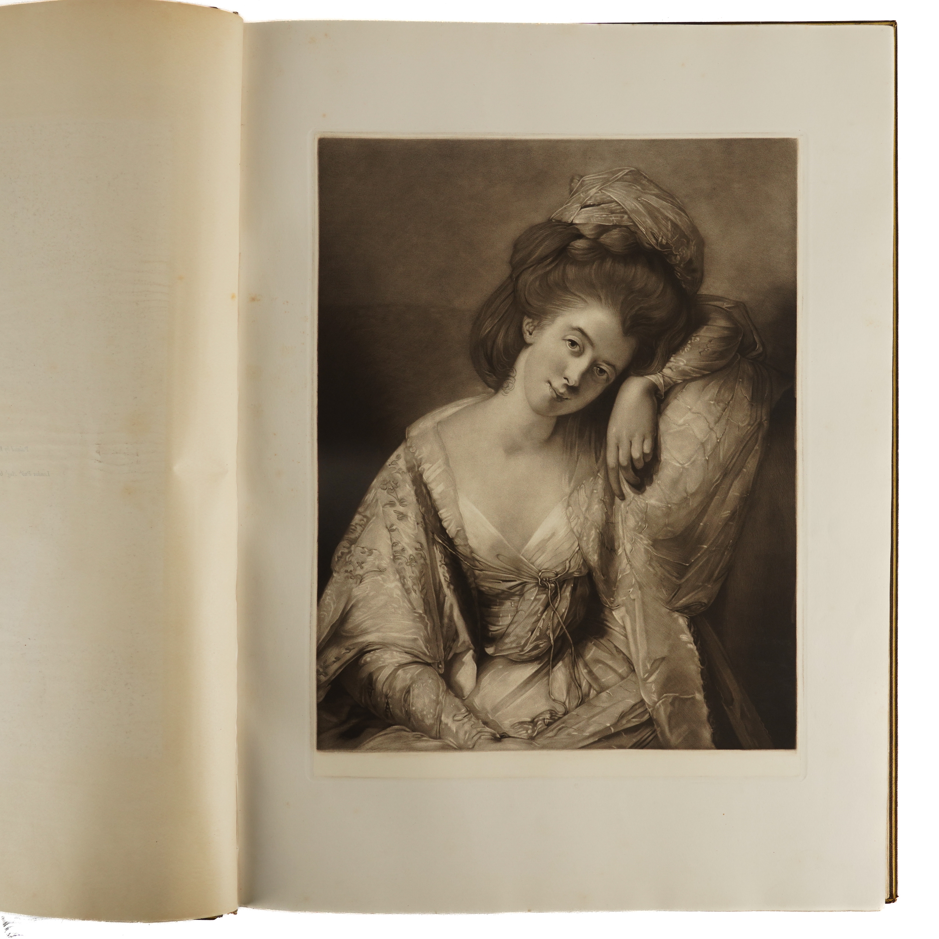 BINDING - Julia FRANKAU (1859-1916). An Eighteenth Century Artist and Engraver. John Raphael Smith. His Life and Works ... A Portfolio containing Fifty Examples of Stipple, Mezzotints Paintings [sic] and Drawings, Printed in Colours and Monochrome. London: Macmillan and Company, 1902. Plate volume only. Very large folio (602 x 445mm). Half title, 50 fine photogravure plates including the title vignette, by John Raphael Smith after Sir Joshua Reynolds, George Romney, John Opie, George Morland and other artists, some coloured, tissue guards (some light spotting and browning to tissue guards, but plate images unaffected). EXCEPTIONALLY FINELY BOUND IN FULL GREEN MOROCCO GILT BY MORRELL, the covers with elaborate tendril and foliate decoration within gilt fillet borders, the spine with 4 raised bands, with foliate decoration in the compartments, wide elaborate dentelles gilt, terracotta watered silk liners (a few inconspicuous scratch marks to the covers, narrow strip lightly rubbed on the lower cover, some very light patches of white staining to the spine and inner edges, corners lightly rubbed, the spine slightly faded). The spine has "Extra Plates" stamped in gilt in one compartment which refers to the 50 plates in the present plate volume rather than the 30 plates in the text volume which is not included here: a printed note indicates its existence on the leaf before the title: "A volume containing a Life of John Raphael Smith, with a Description of Prints and Short Biographies of Persons represented, is issued with this portfolio of prints."