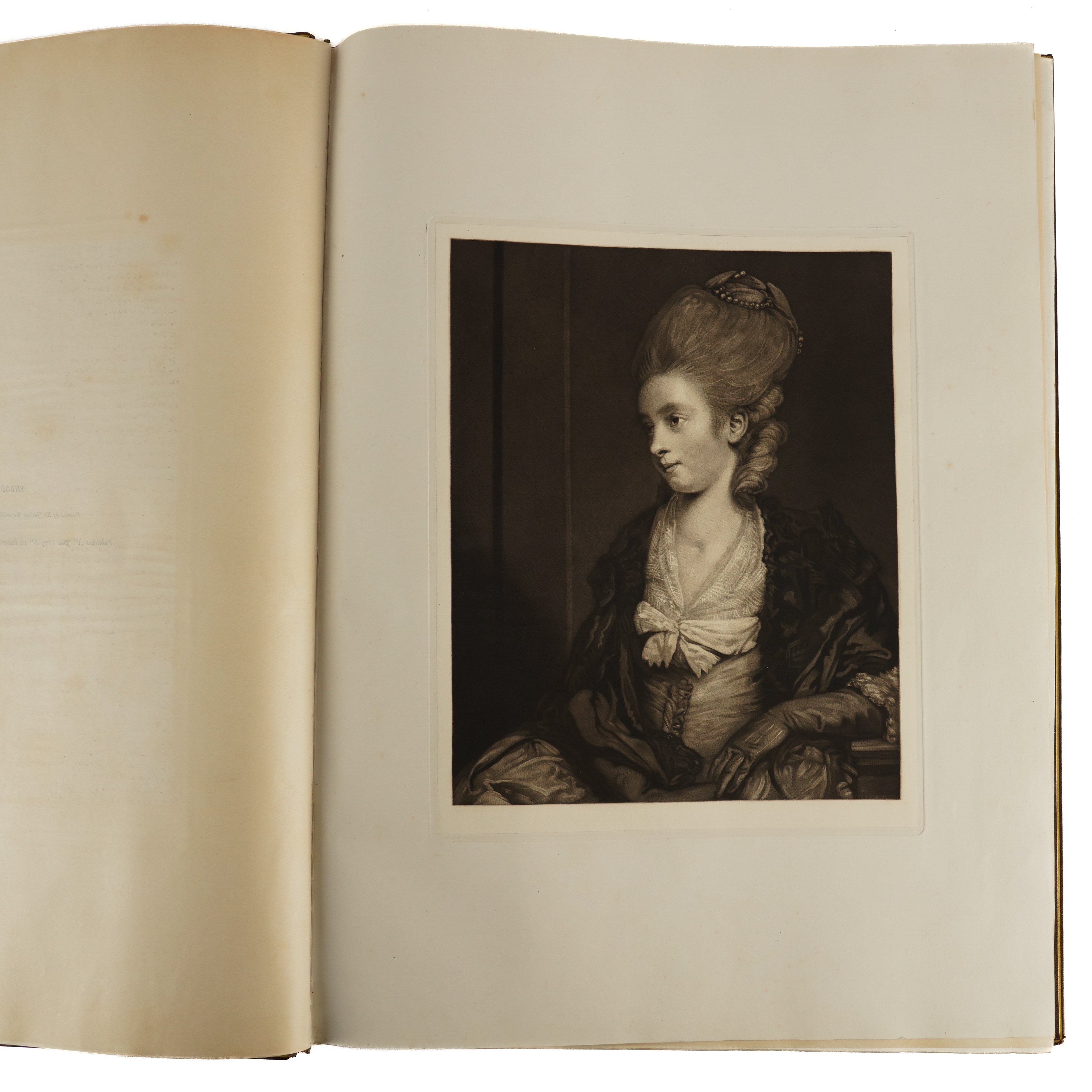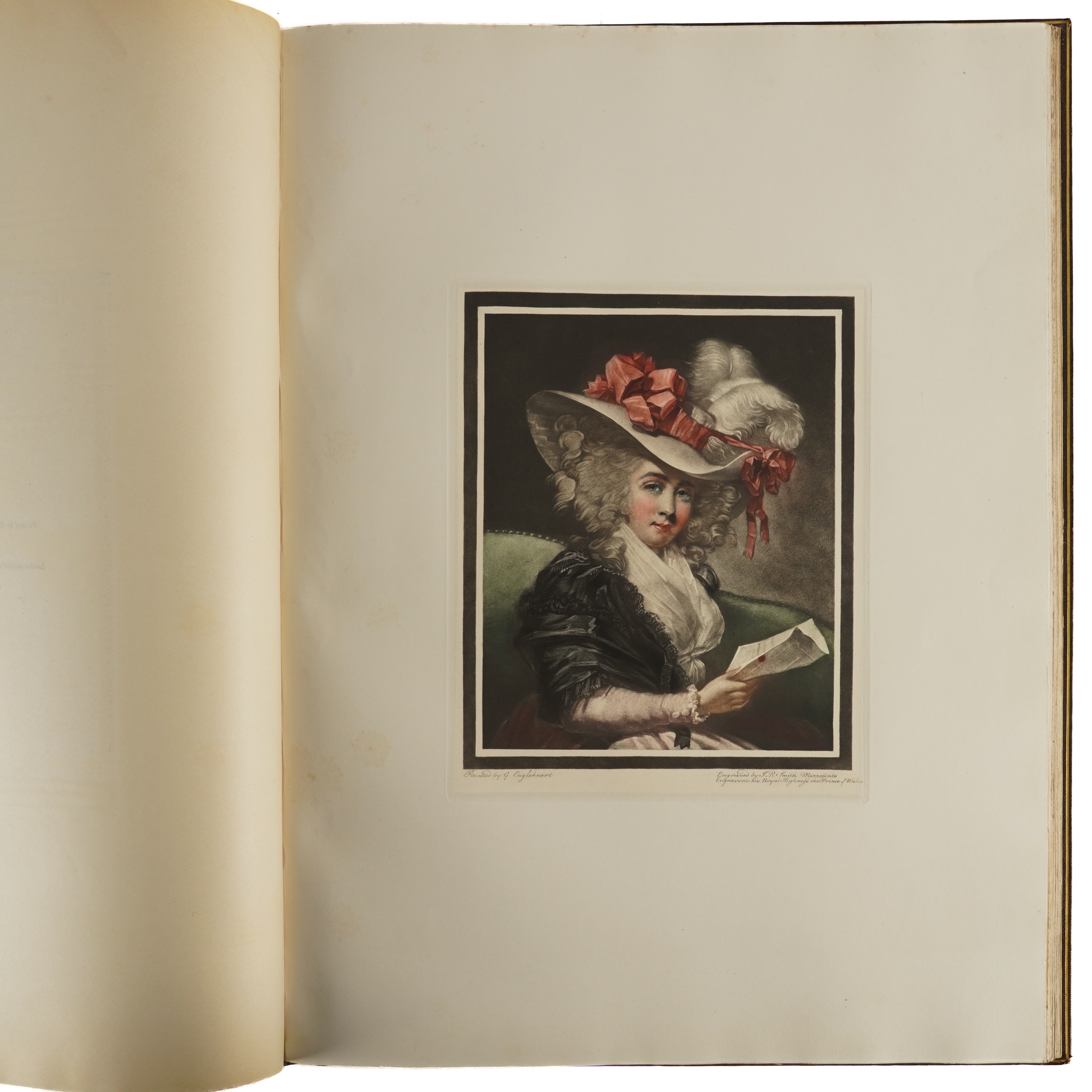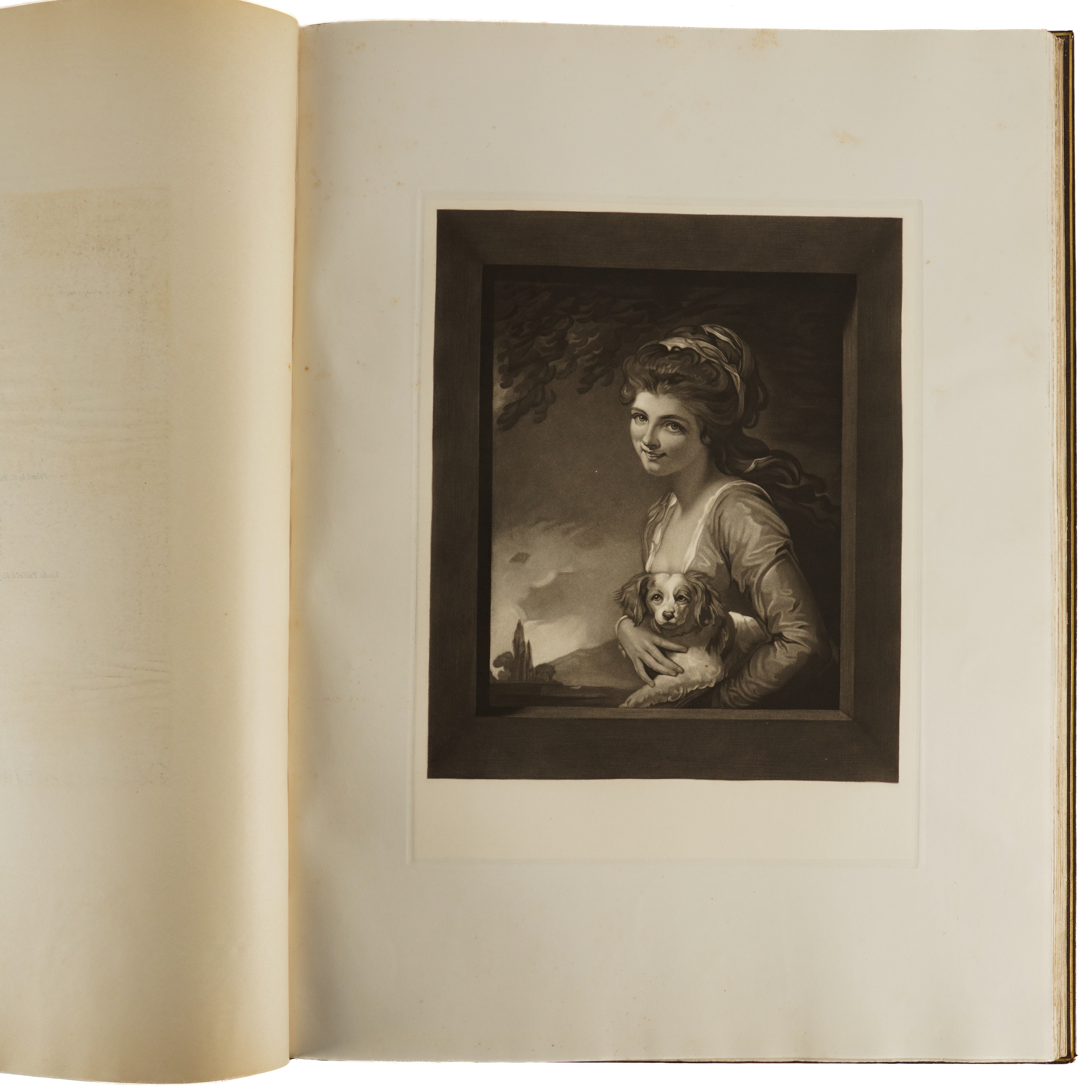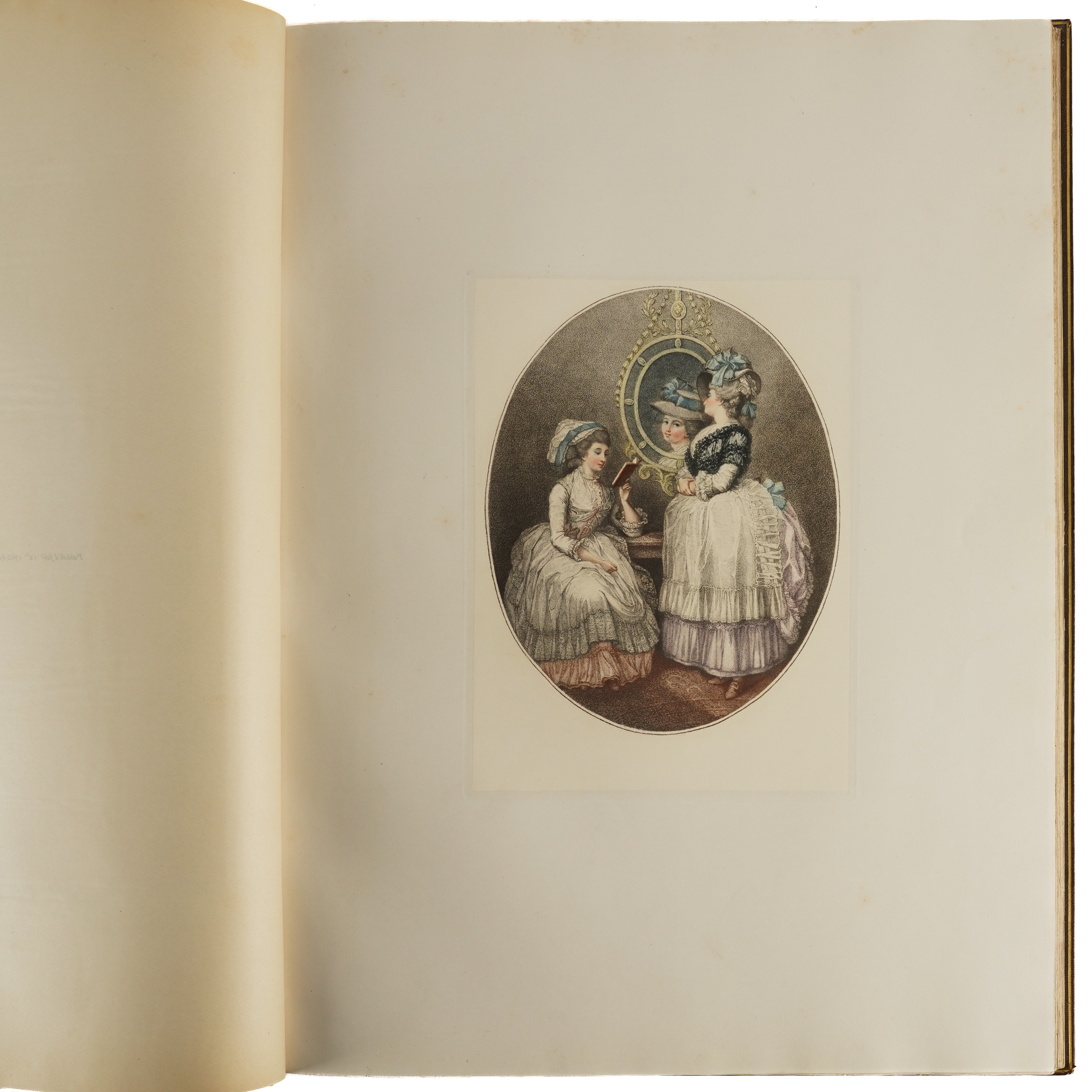 BINDING - Julia FRANKAU (1859-1916). An Eighteenth Century Artist and Engraver. John Raphael Smith. His Life and Works ... A Portfolio containing Fifty Examples of Stipple, Mezzotints Paintings [sic] and Drawings, Printed in Colours and Monochrome. London: Macmillan and Company, 1902. Plate volume only. Very large folio (602 x 445mm). Half title, 50 fine photogravure plates including the title vignette, by John Raphael Smith after Sir Joshua Reynolds, George Romney, John Opie, George Morland and other artists, some coloured, tissue guards (some light spotting and browning to tissue guards, but plate images unaffected). EXCEPTIONALLY FINELY BOUND IN FULL GREEN MOROCCO GILT BY MORRELL, the covers with elaborate tendril and foliate decoration within gilt fillet borders, the spine with 4 raised bands, with foliate decoration in the compartments, wide elaborate dentelles gilt, terracotta watered silk liners (a few inconspicuous scratch marks to the covers, narrow strip lightly rubbed on the lower cover, some very light patches of white staining to the spine and inner edges, corners lightly rubbed, the spine slightly faded). The spine has "Extra Plates" stamped in gilt in one compartment which refers to the 50 plates in the present plate volume rather than the 30 plates in the text volume which is not included here: a printed note indicates its existence on the leaf before the title: "A volume containing a Life of John Raphael Smith, with a Description of Prints and Short Biographies of Persons represented, is issued with this portfolio of prints."