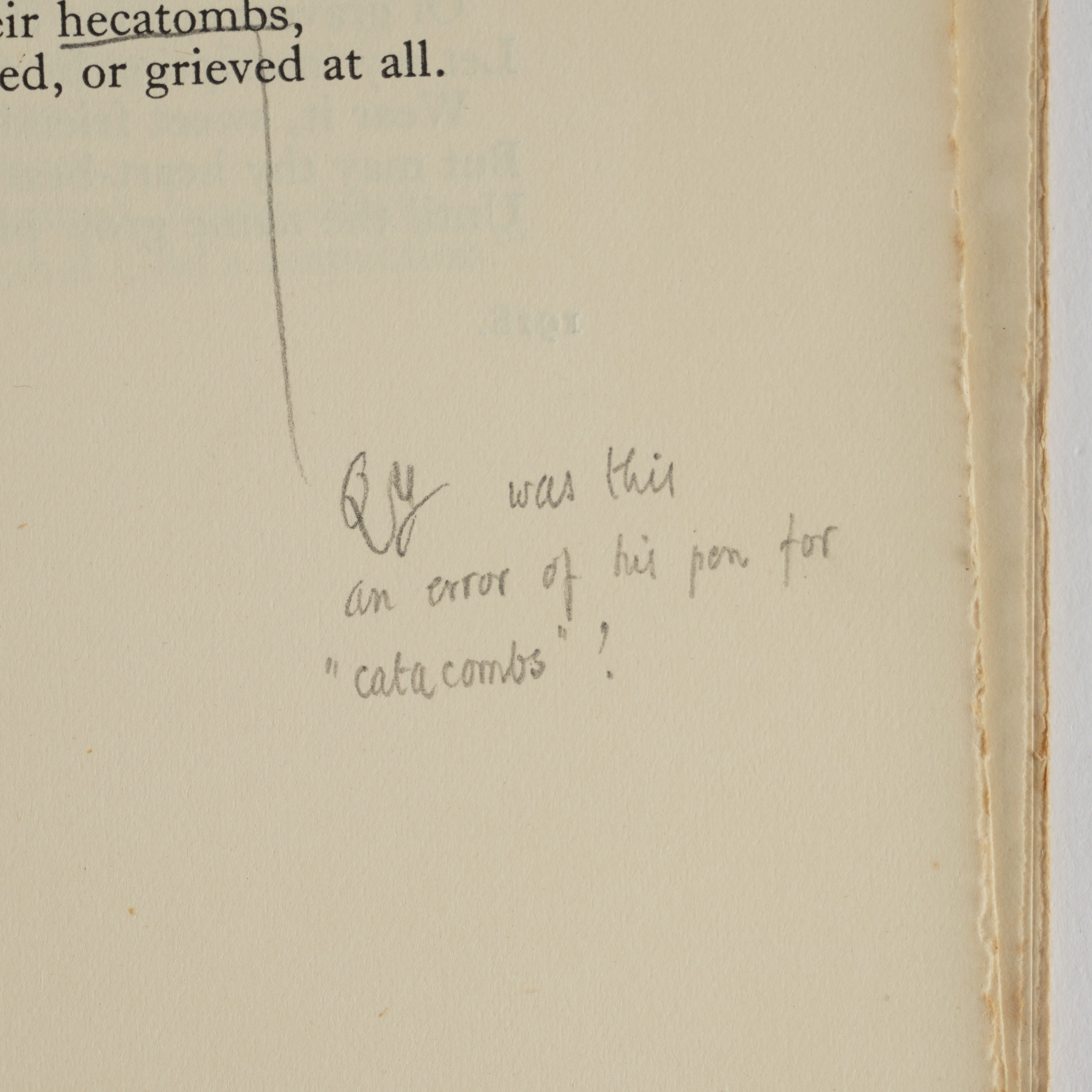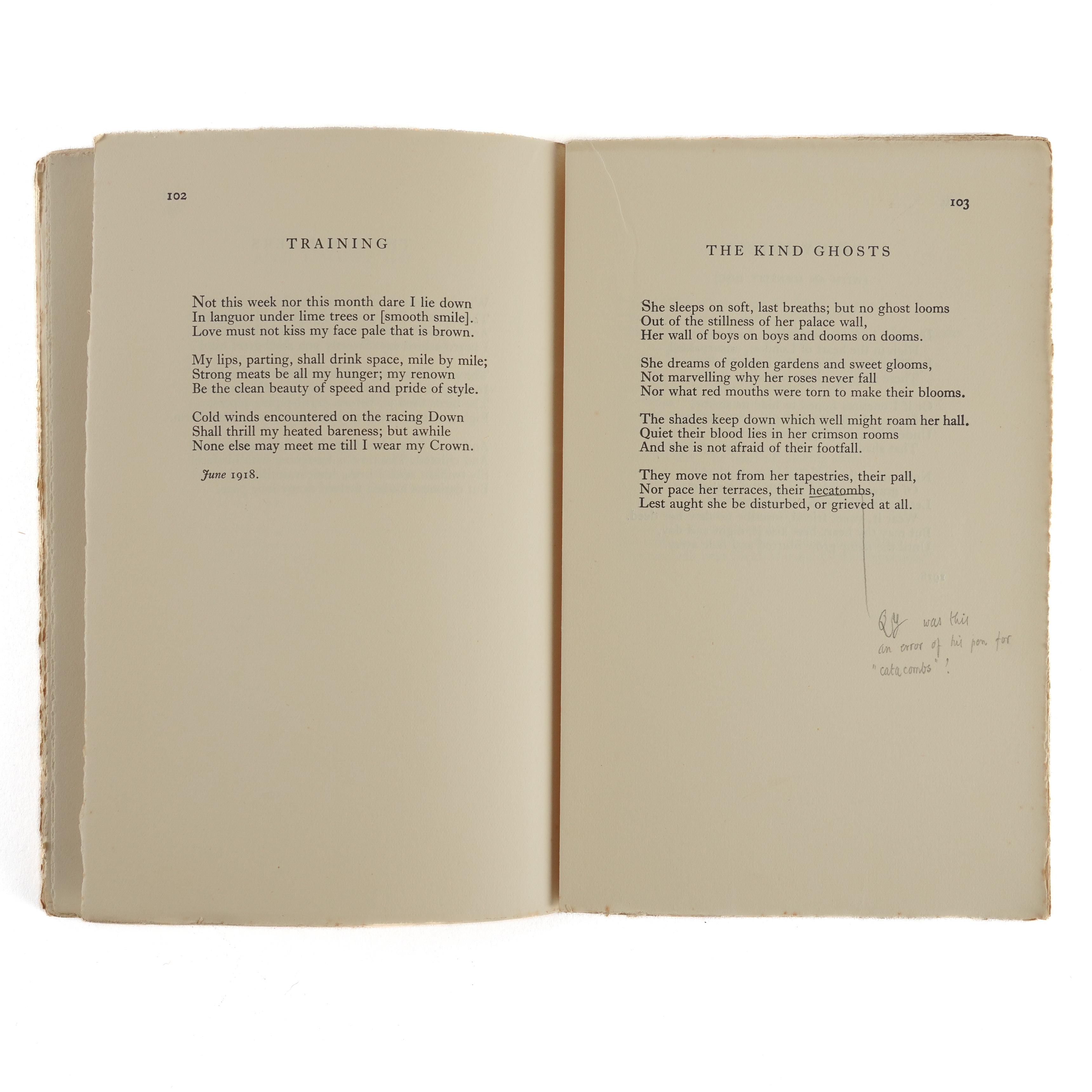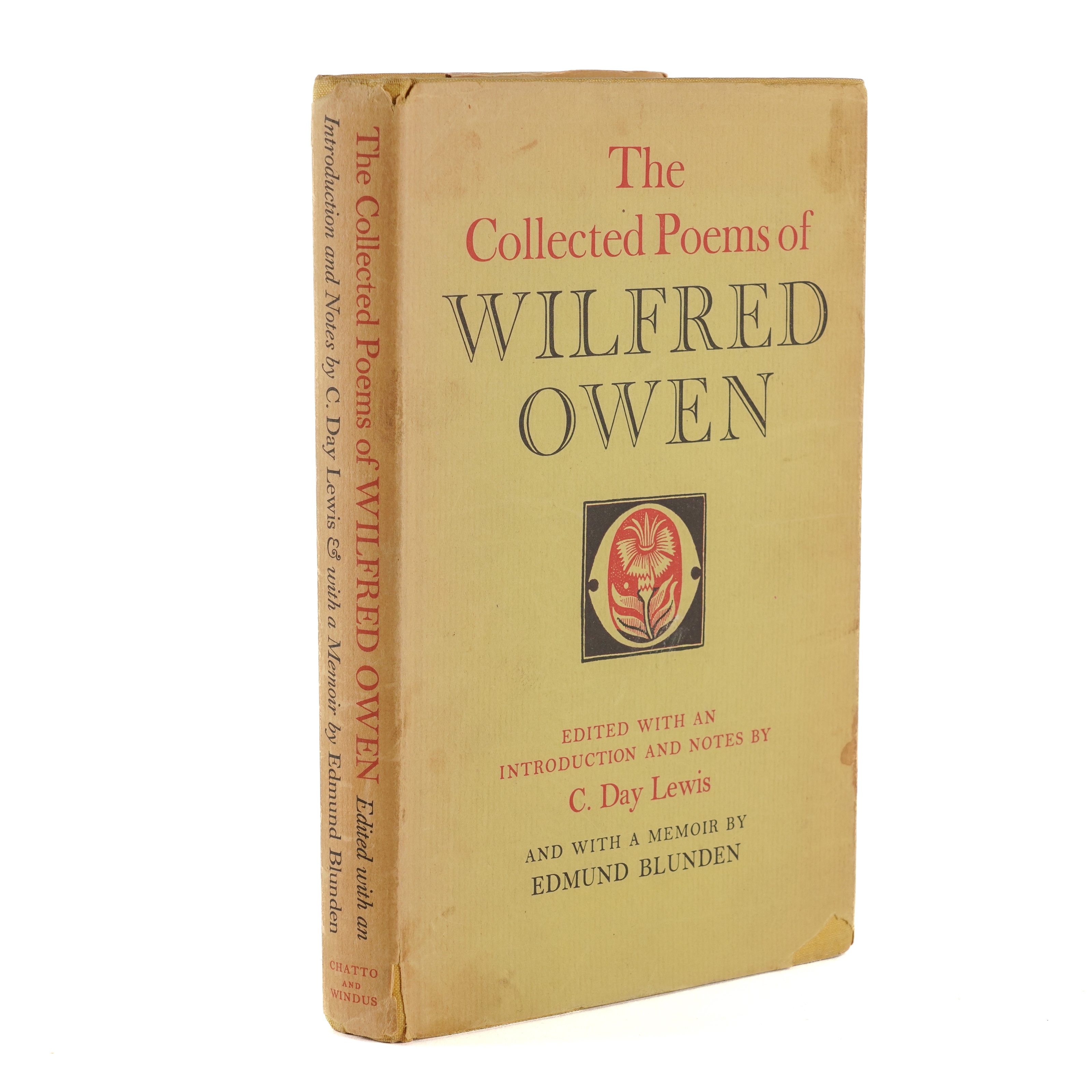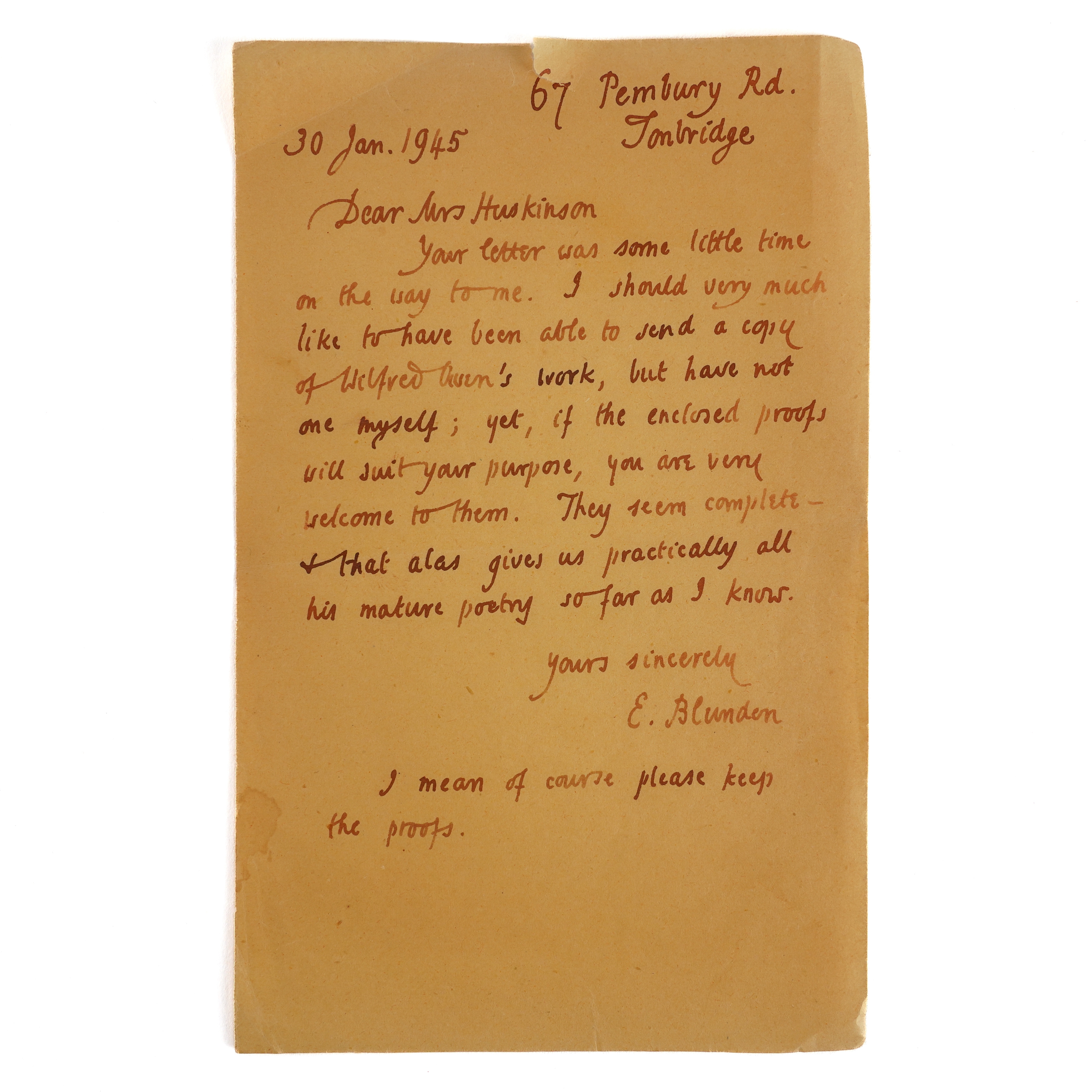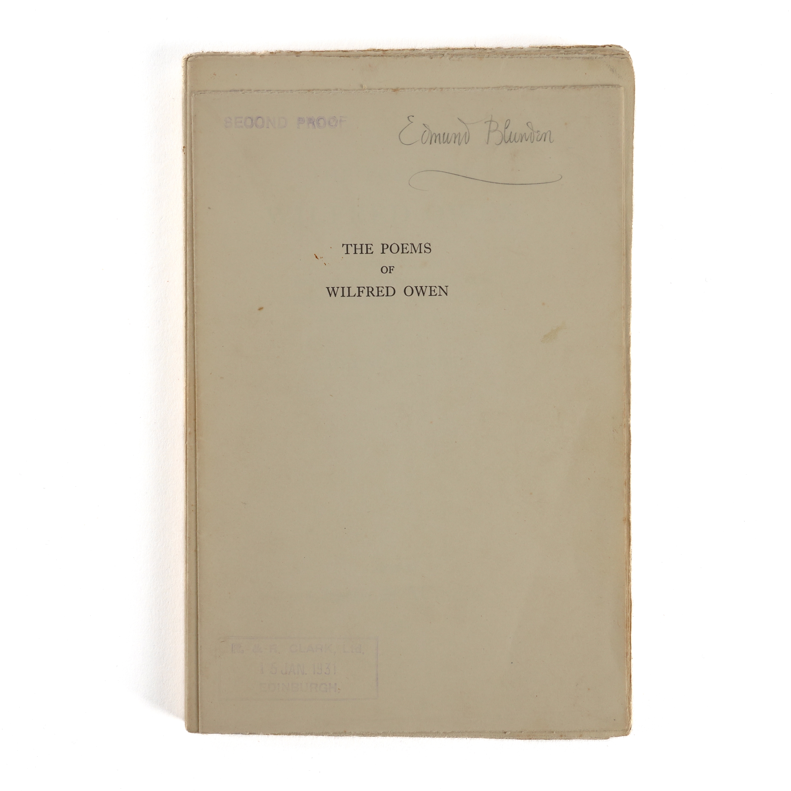 BLUNDEN, Edmund (1896-1974) & Wilfred OWEN (1893-1918). A one-page autograph letter from Edmund Blunden, on paper headed "67 Pembury Road, Tonbridge,", and dated, "30 Jan. 1945", stating, "Dear Mrs Huskinson, Your letter was some little time on the way to me. I should very much like to have been able to send a copy of Wilfred Owen's work, but have not one myself; yet, if the enclosed proofs will suit your purpose, you are very welcome to them. They seem complete - & that alas gives us practically all his mature poetry as far as I know. Yours sincerely, E. Blunden. I mean of course please keep the proofs." Accompanying the letter is his PROOF COPY of the work in question, titled, "The Poems of Wilfred Owen. A New Edition including many Pieces now First Published, and Notices of his Life and Work by Edmund Blunden," published by Chatto & Windus, London, and dated 1931. A printed note on the verso of the title outlines Wilfred Owen's publishing history, concluding with the present edition: "Poems by Wilfred Owen with an introduction by Siegfried Sassoon was first published in 1920, reprinted in 1921. This complete edition was first published in 1931." The copy is 135-pages long, and disbound, without proofs of the covers. The half title is stamped "Second Proof" (as it is on a number of internal pages) and is SIGNED by Edmund Blunden, who, apart from a very minor pencil amendment to the "Memoir" (p.19) which opens the book in the manner of a preface, makes only one textual suggestion relating to a word in one of the poems, "The Kind Ghosts" (p.103), where a pencil line from the printed word "hecatombs" points down to Blunden's pencil comment, "... was this an error of his pen for 'catacombs'?" With a somewhat tatty envelope from "The Spectator" addressed to Blunden, and a copy of "The Collected Poems of Wilfred Owen. Edited with an Introduction and Notes by C. Day Lewis and with a Memoir by Edmund Blunden" (London, 1964, signed and dated 21.iii.88 by Clive Wilmer). Although Wilfred Owen and Edmund Blunden did not know each other personally, they both saw active service in the trenches of the first world war, with Blunden fighting at Ypres and the Somme. Owen, after a period of recovery in England from shell-shock - during which he wrote many of his most famous poems - insisted on returning to the Front and was killed in action exactly one week before the end of hostilities. Blunden recognised his greatness as a war poet and played a key roll in ensuring his lasting legacy as perhaps the greatest of them all. (3)