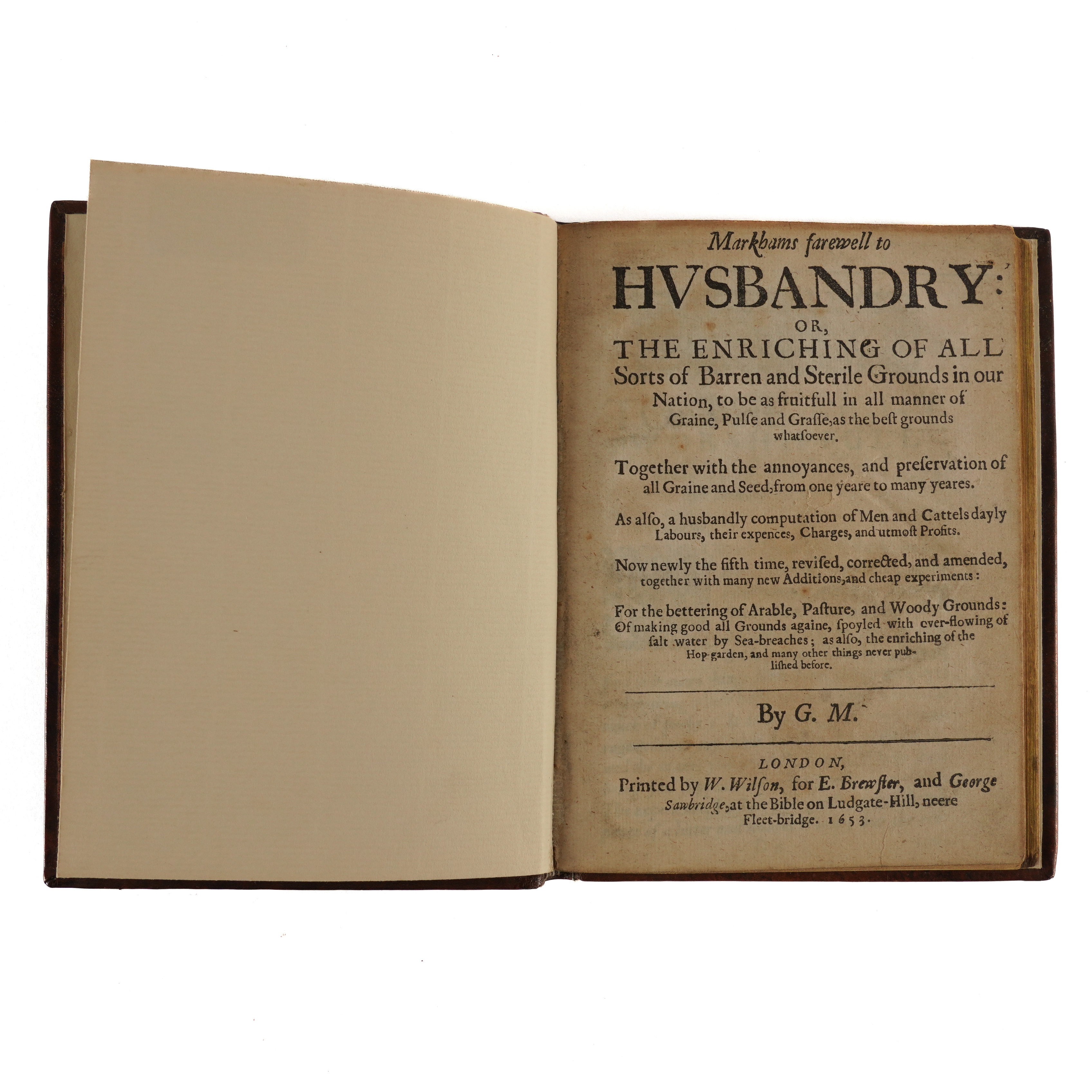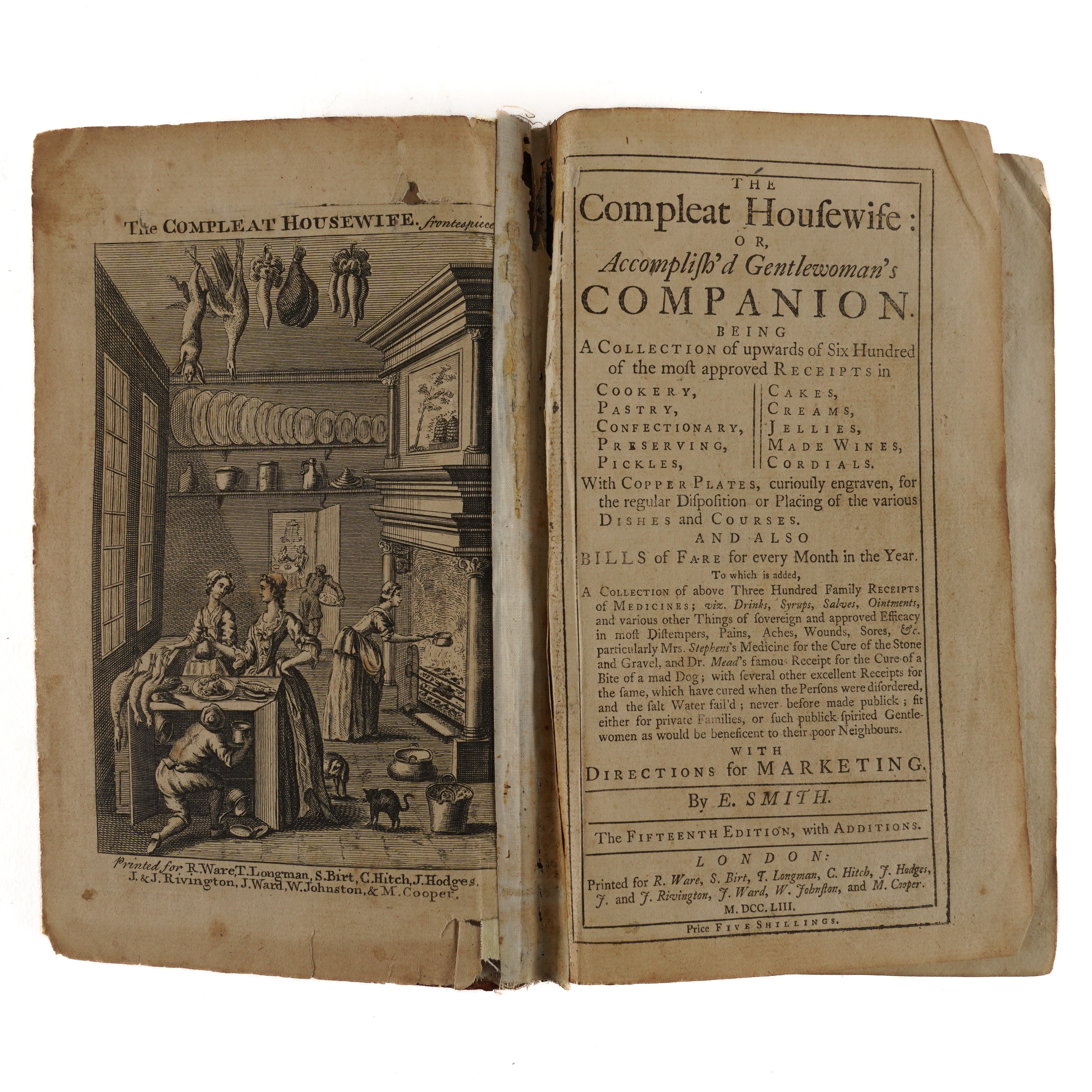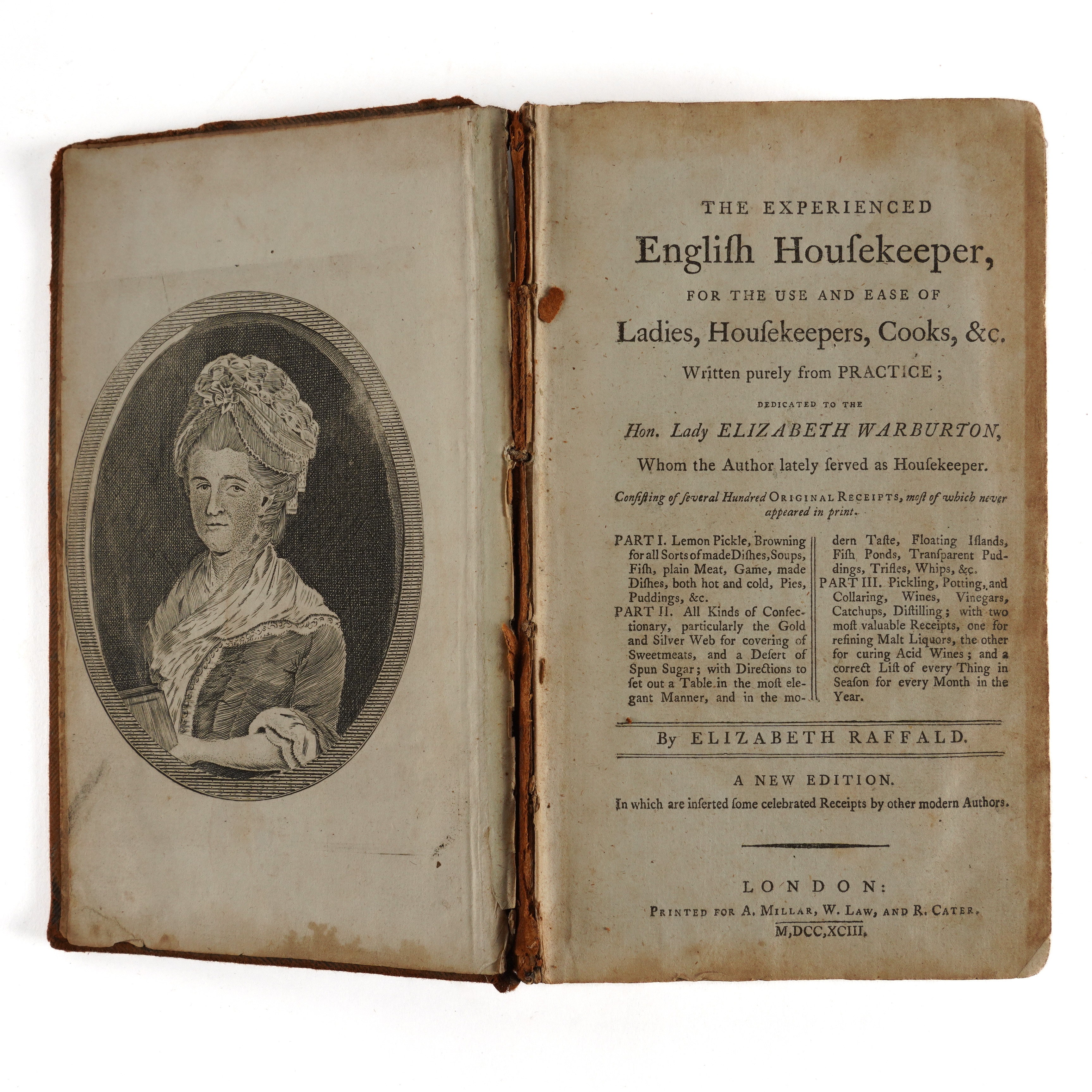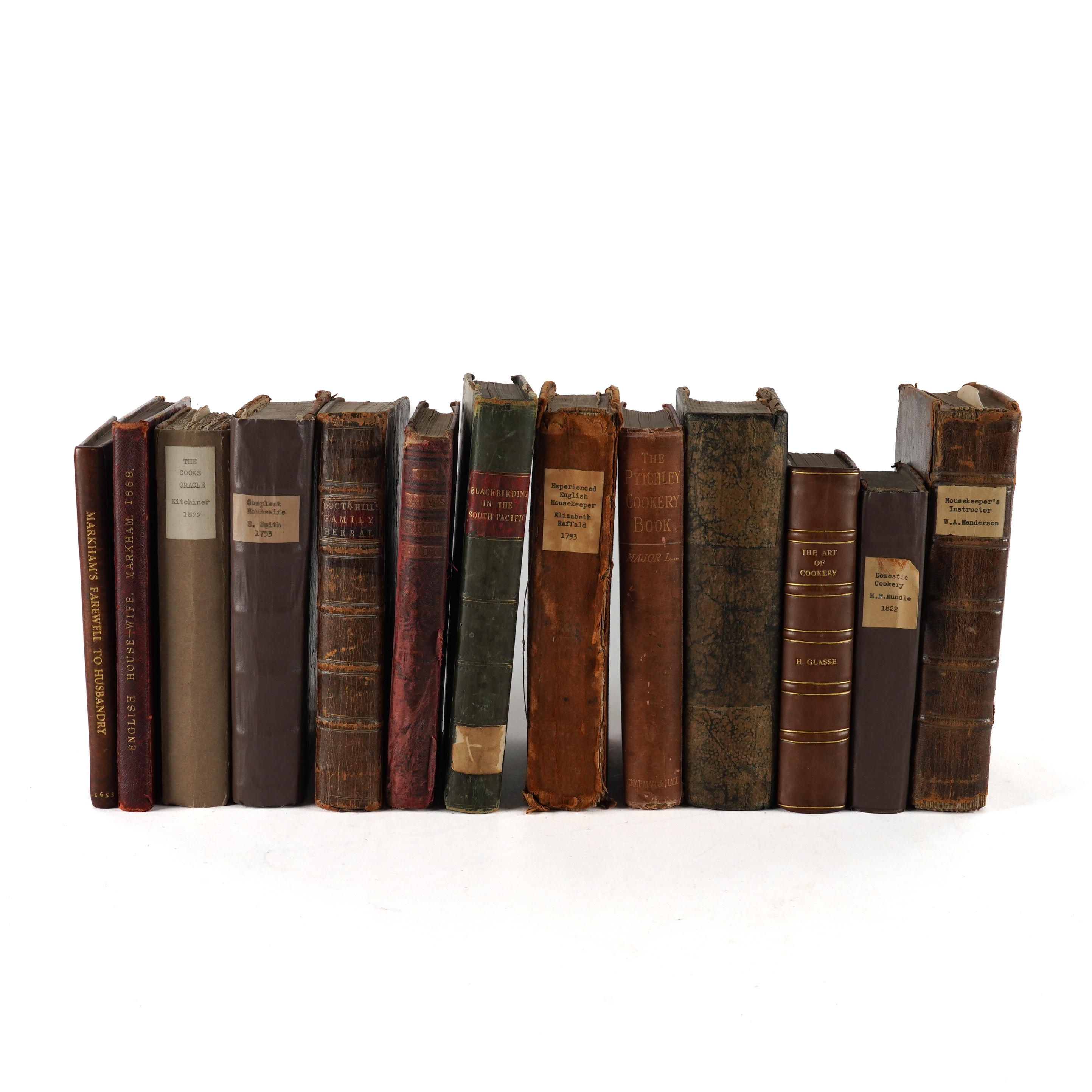 COOKERY & HUSBANDRY - [Gervase MARKHAM (c.1568-1637)]. The English House-Wife containing The inward and outward Vertues which ought to be in a Compleat Woman: As her Skill in Physick, Chirurgery, Cookery, Extraction of Oyles, Banqueting stuff, Ordering of Great Feasts, Preserving of all sorts of Wines, conceited Secrets, Distillations, Perfumes, Ordering of Wool, Hemp, Flax: making Cloth and Dying; the Knowledge of Dayries: Office of Malting; of Oats, their excellent uses in Families: of Brewing, Baking, and all other things belonging to an Houshold. A Work generally approved, and now the Eighth time much augmented, purged, and made most profitable and necessary for all men, and the general good of this Nation. By G. M. London: "Printed by J. Streater for George Sawbridge, dwelling on Clerkenwell-Green," 1668. Small 4to (194 x 145mm). Typographical decorative borders, initials printed in bold, woodcut diagrams on one page (Mmm1-4 mispaginated, hole in upper margin of [Ooo4], Ppp1-4 mispaginated, some minor worming at upper margins, browned and spotted throughout, a few larger and darker spots). 19th-century roan-backed marbled boards (extremities rubbed, later endpapers). Provenance: Wm. Geo. Waters (armorial bookplate); Mrs Jean Morrison (modern label). cf. Bitting Gastronomic Bibliography (1939) p.309; Poynter A Bibliography of Gervase Markham (1962) pp.128-131; Simon Bibliotheca gastronomica (1953) 1005. The work was first published in 1615. With 12 other books, most of related interest, including the same author's Markham's farewell to Husbandry: or, the Enriching of all Sorts of Barren and Sterile Grounds in our Nation ... Now newly the fifth time, revised, corrected, and amended, together with many new Additions, and cheap experiments (London, "Printed by W. Wilson, for E. Brewster, and George Sawbridge", 1653, small 4to, woodcut illustrations, modern old-style calf), Eliza Smith's The Compleat Housewife: or, Accomplish'd Gentlewoman's Companion ... The Fifteenth Edition (London, 1753, 8vo, engraved frontispiece and plates, some defective, contemporary calf, crudely rebacked), John Hill's The Useful Family Herbal ... The Second Edition (London, 1755, 8vo, 8 engraved plates, index in contemporary manuscript at the end, contemporary calf), Hannah Glasse's The Art of Cookery Made Plain and Easy ... The Twentieth Edition (Edinburgh, "Printed by James Donaldson," 1791, 8vo, contemporary calf, rebacked, new endpapers), Elizabeth Raffald's The Experienced English Housekeeper ... A New Edition (London, 1793, 8vo, engraved portrait frontispiece and folding plates, with 4-pages of contemporary manuscript recipes inserted at the end [see illustration], contemporary reverse calf, worn, with a later pencil note at the front stating "This edition of 1793 is believed to be a pirated edition") and [William Kitchiner's] The Cook's Oracle (London, 1822, 8vo, defective, lacking leaves at the end, original paper boards, rebacked). Sold as a collection, not subject to return. (13)