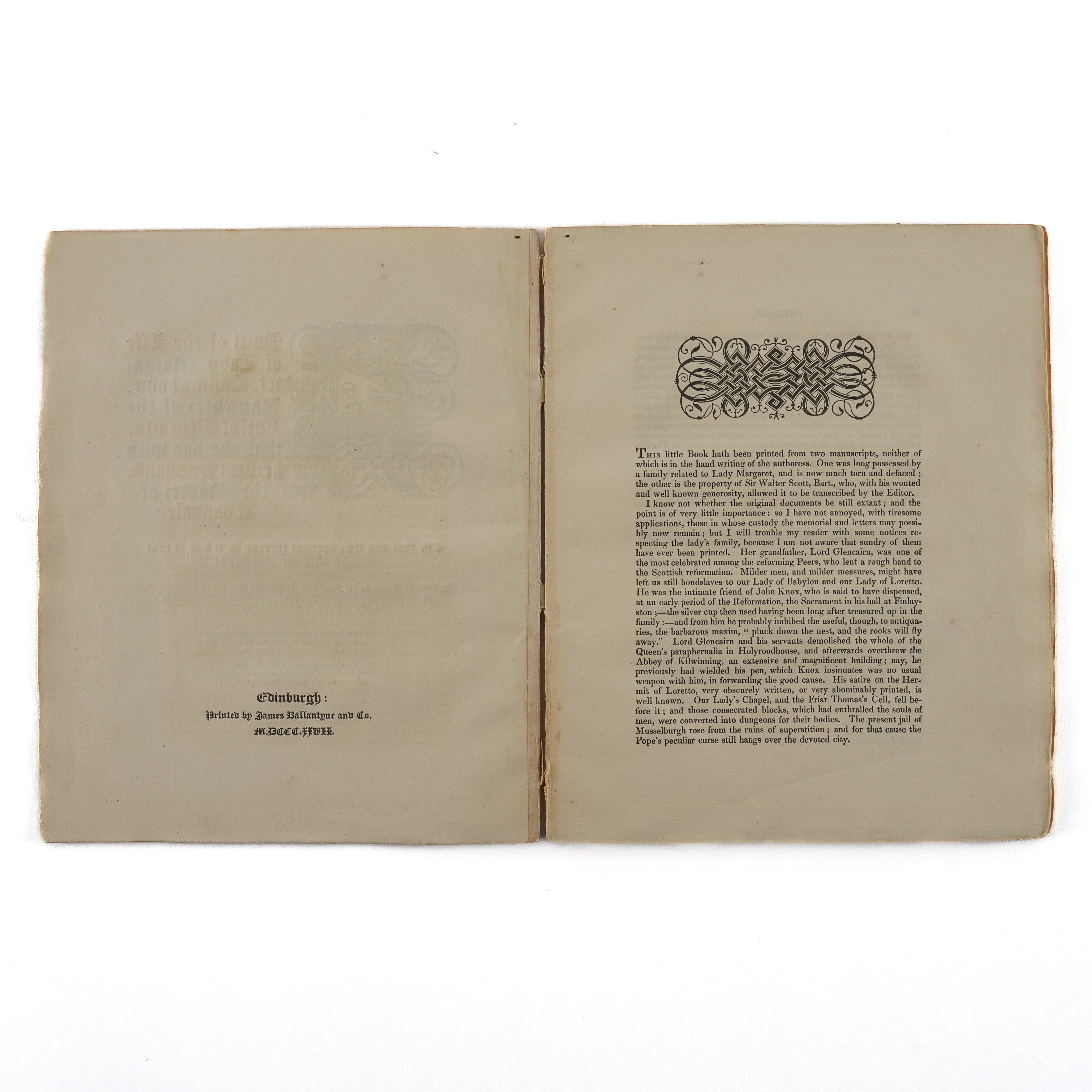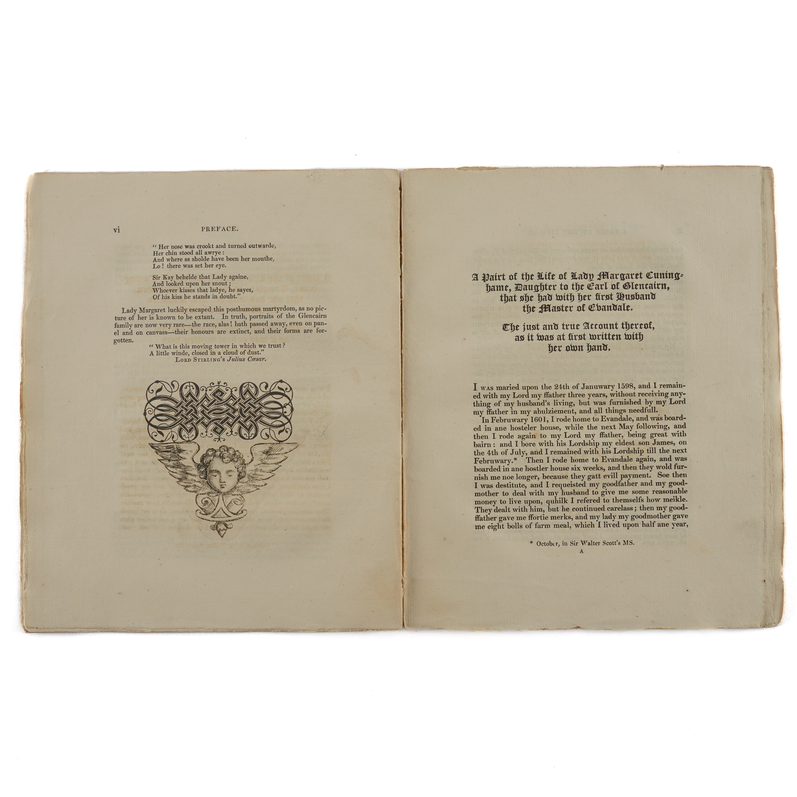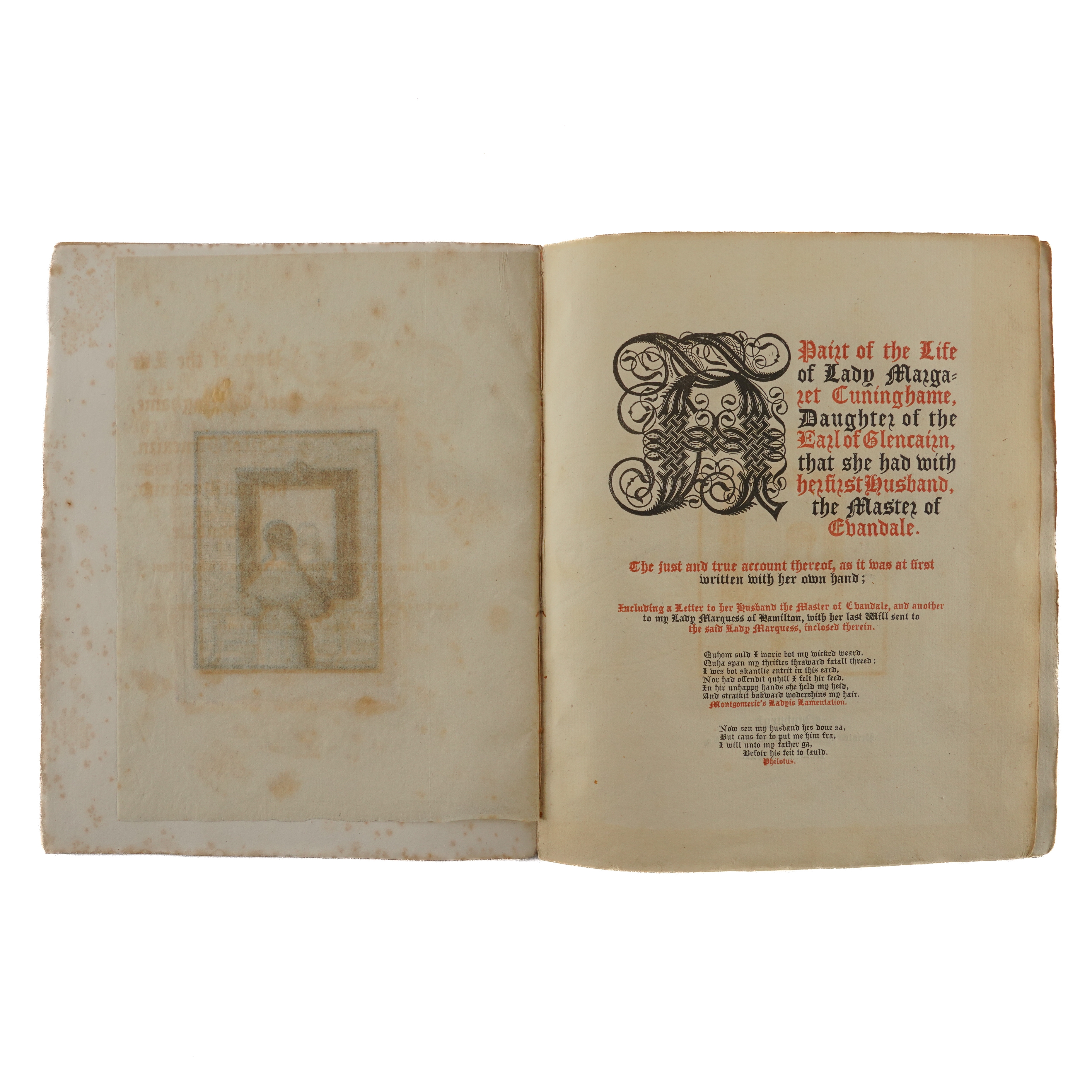 CUNINGHAME, Margaret, Lady (d. c.1622). A Pairt of the Life of Lady Margaret Cuninghame, Daughter of the Earl of Glencairn, that she had with her first husband, the Master of Evandale. The just and true account thereof, as it was at first written with her own hand; Including a Letter to her husband the Master of Evandale, and another to my Lady Marquess of Hamilton, with her last Will sent to the said Lady Marquess, inclosed therein. Edinburgh: "Printed by James Ballantyne and Co.," 1827. 4to (208 x 170mm). Engraved frontispiece on india paper, mounted, title printed in red and black with large woodcut initial, ornaments (frontispiece spotted, some light mainly marginal browning and offsetting to the title). Contemporary plain paper boards (spine rather worn, some light spotting and staining). Provenance: "Robert Cunninghame [sic] Cunninghame Graham Bontine as being the direct descendent & representative of Robert, the 2nd son of Nicol Graham of Gartmore, & who was the first Bontine of Ardoch & then succeeded his father to Gartmore in 1775 and in 1796 succeeded to Findlaystone & name of Cunninghame as hier [sic] to his mother, daughter to the Earl of Glencairn, Lady Margaret Cunninghame. From his cousins, the Miss Speirs. [added in a different hand:] Laurel Hill. G. C. G. Gartmore" (19th-century inscription on the front blank leaf); M. H. Spiers (old signature on the upper cover). FIRST EDITION. [?ONE OF 50 COPIES.]