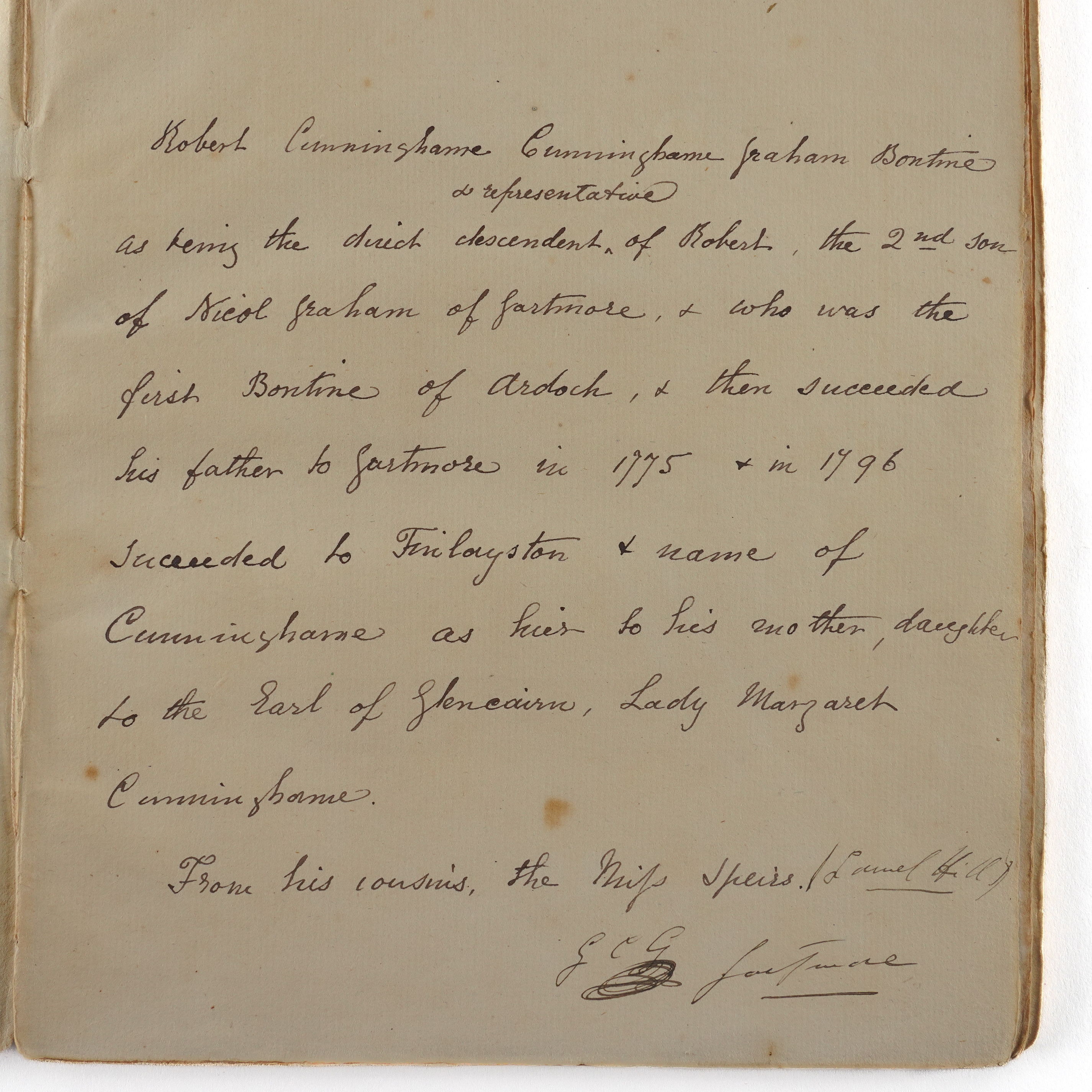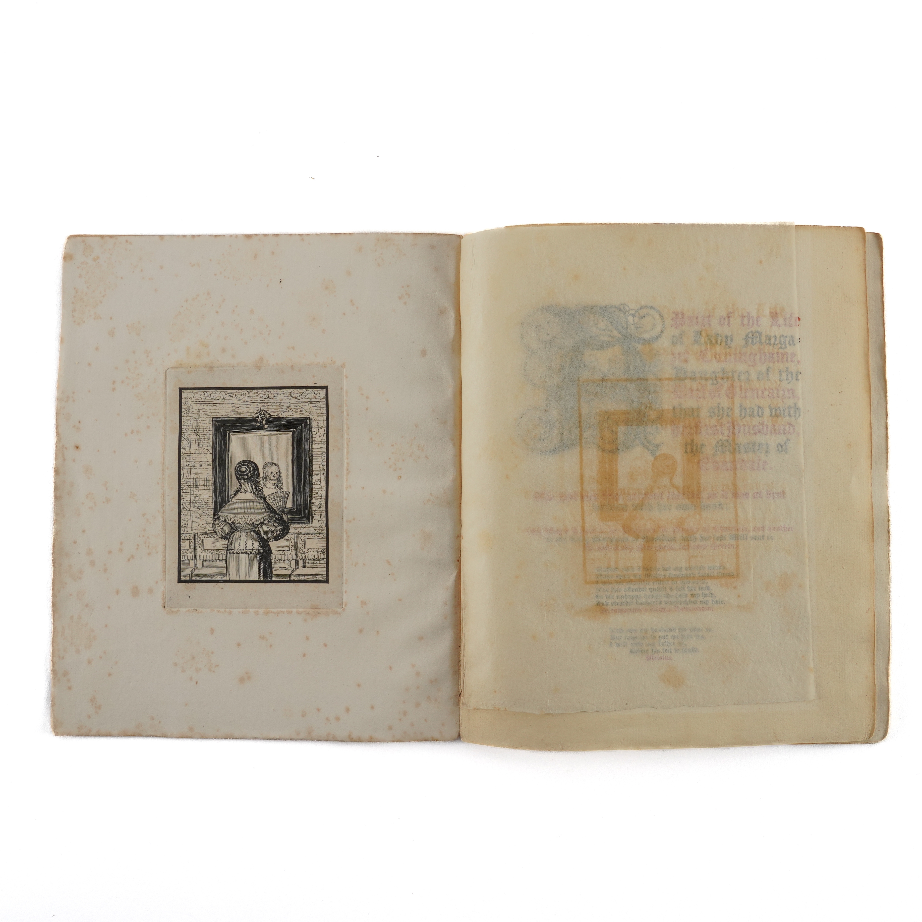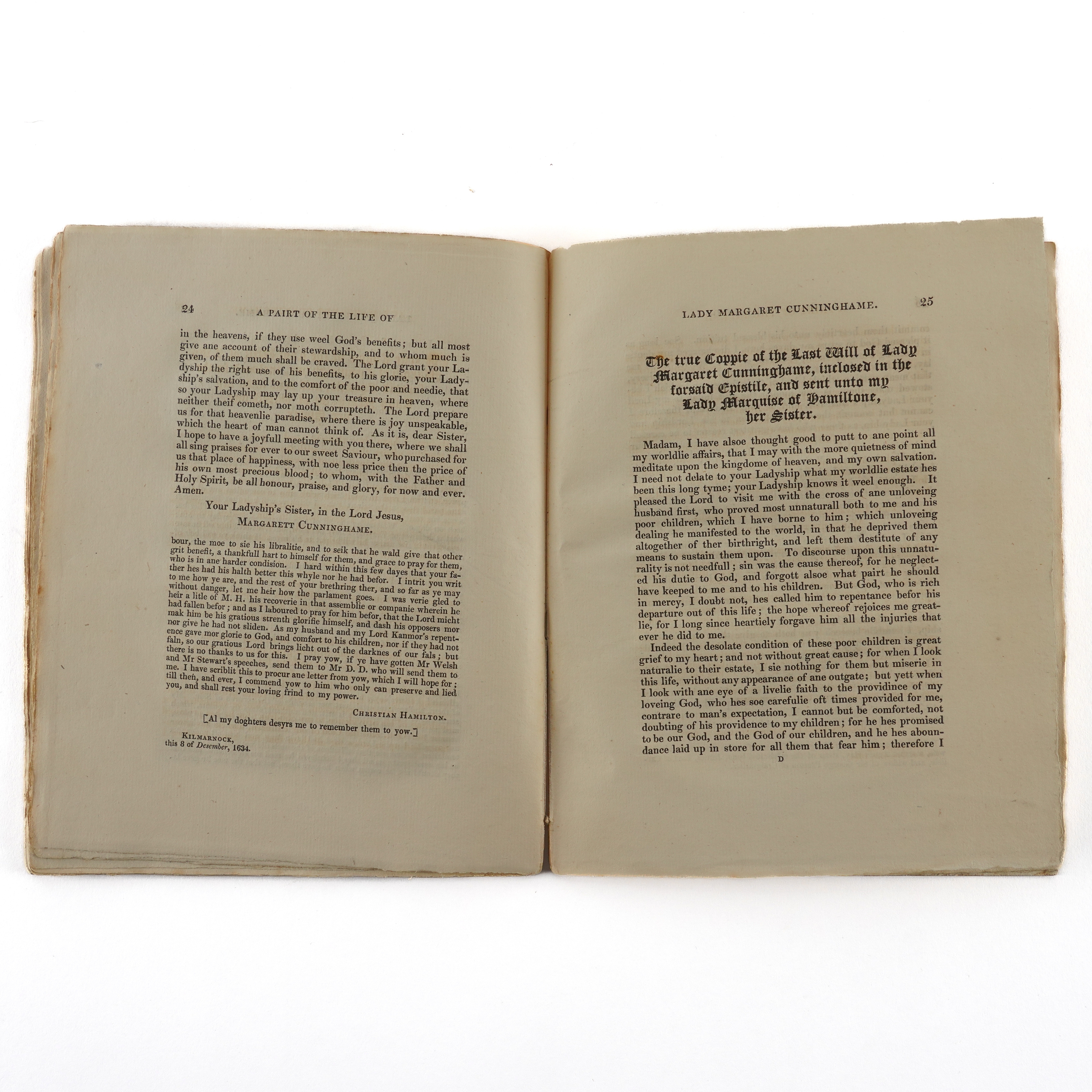 CUNINGHAME, Margaret, Lady (d. c.1622). A Pairt of the Life of Lady Margaret Cuninghame, Daughter of the Earl of Glencairn, that she had with her first husband, the Master of Evandale. The just and true account thereof, as it was at first written with her own hand; Including a Letter to her husband the Master of Evandale, and another to my Lady Marquess of Hamilton, with her last Will sent to the said Lady Marquess, inclosed therein. Edinburgh: "Printed by James Ballantyne and Co.," 1827. 4to (208 x 170mm). Engraved frontispiece on india paper, mounted, title printed in red and black with large woodcut initial, ornaments (frontispiece spotted, some light mainly marginal browning and offsetting to the title). Contemporary plain paper boards (spine rather worn, some light spotting and staining). Provenance: "Robert Cunninghame [sic] Cunninghame Graham Bontine as being the direct descendent & representative of Robert, the 2nd son of Nicol Graham of Gartmore, & who was the first Bontine of Ardoch & then succeeded his father to Gartmore in 1775 and in 1796 succeeded to Findlaystone & name of Cunninghame as hier [sic] to his mother, daughter to the Earl of Glencairn, Lady Margaret Cunninghame. From his cousins, the Miss Speirs. [added in a different hand:] Laurel Hill. G. C. G. Gartmore" (19th-century inscription on the front blank leaf); M. H. Spiers (old signature on the upper cover). FIRST EDITION. [?ONE OF 50 COPIES.]