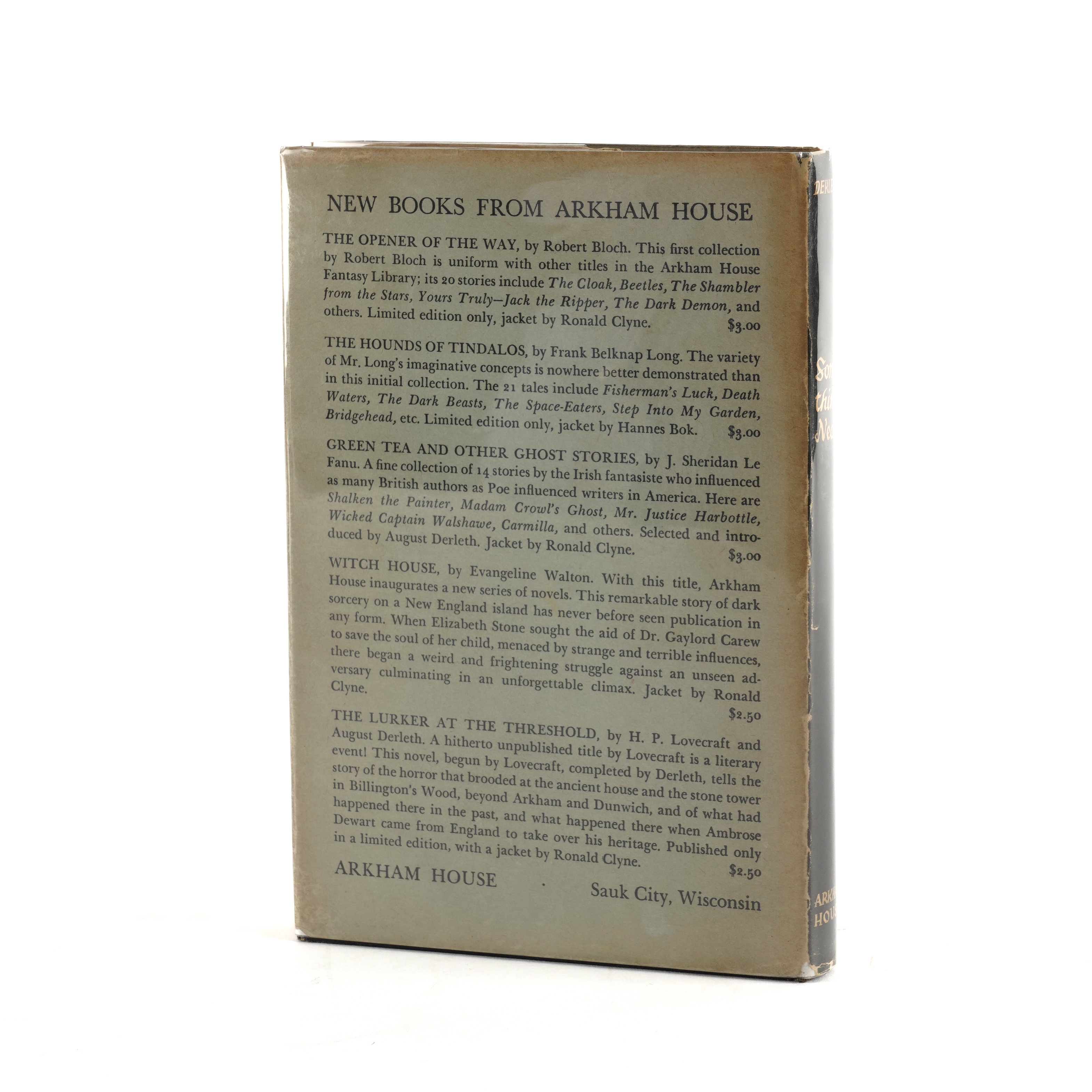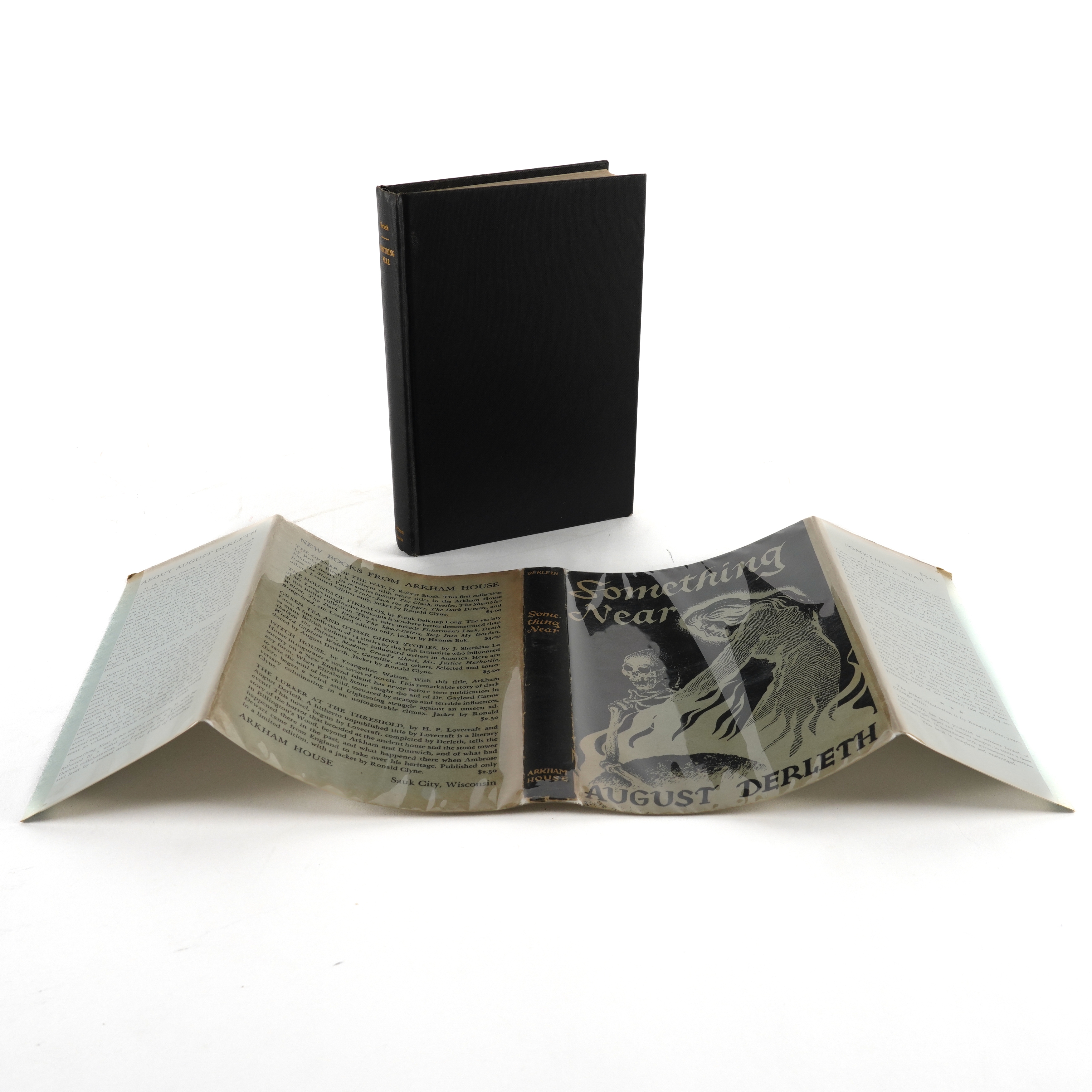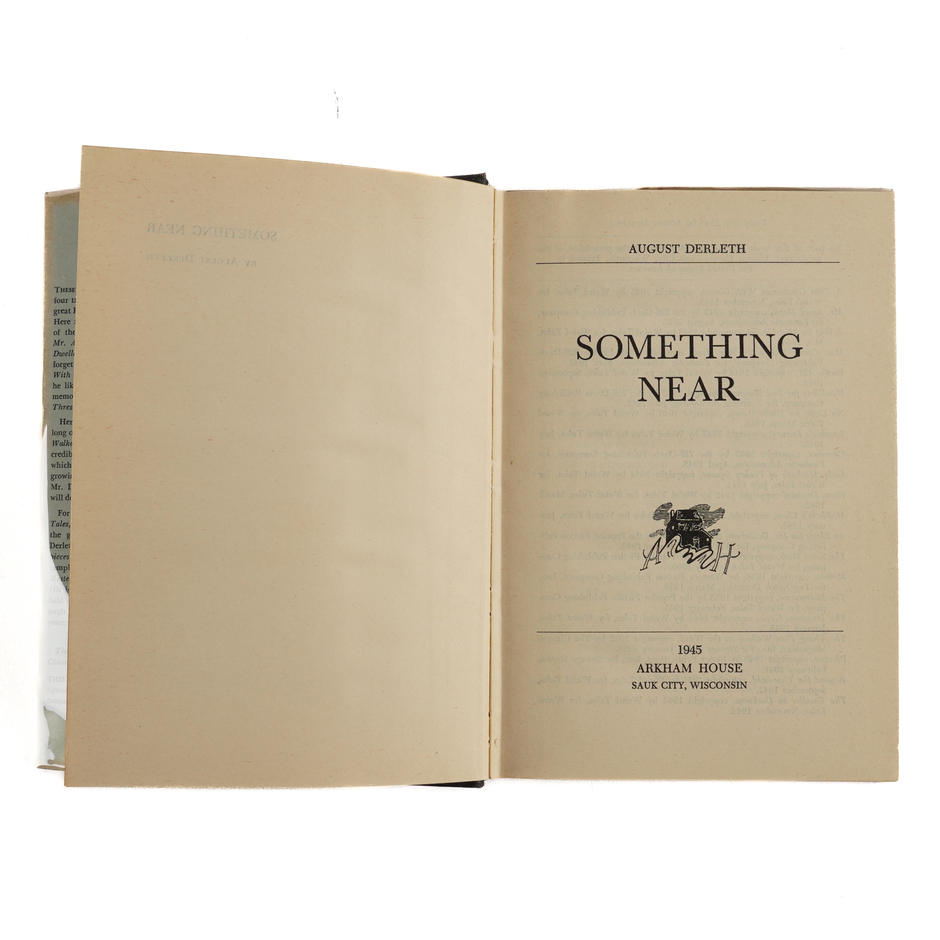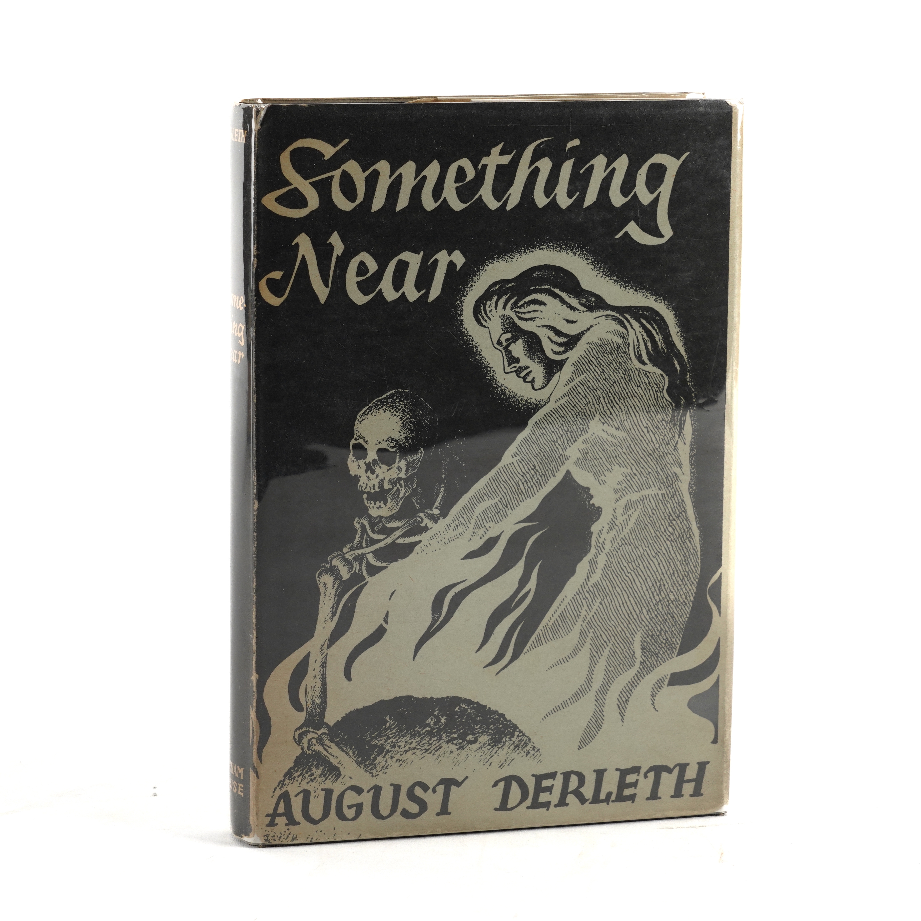DERLETH, August (1909-71). Something Near. Sauk City, Wisconsin: Arkham House, 1945. 8vo (188 x 130mm). Half title, woodcut printer's device on the title (very lightly and consistently browned throughout, commensurate with wartime paper standards). Original black cloth, the spine lettered in gilt, the dust-jacket by Ronald Clyne with the price of $3.00 unclipped (some very minor rubbing to the corners of the jacket, some discolouration to the edges of the wrappers). FIRST EDITION. A printed note at the end states: "Two thousand copies of this book have been printed by The Collegiate Press, George Banta Publishing Company, from linotype Caledonia on Cream Eggshell. The binding cloth is Holliston Black Novelex." A note on the front turn-in states: "These twenty new stories by August Derleth include four tales in the Cthulhu Mythos pattern of the late great H. P. Lovecraft, two of them of novelette length." Please note that the original dust-jacket has been photographed in its modern protective archival Mylar wrapper, thereby avoiding any risk of damage through its temporary removal. Bleiler The Guide to Supernatural Fiction (1983) 519; Jaffery The Arkham House Companion (1992) 9.