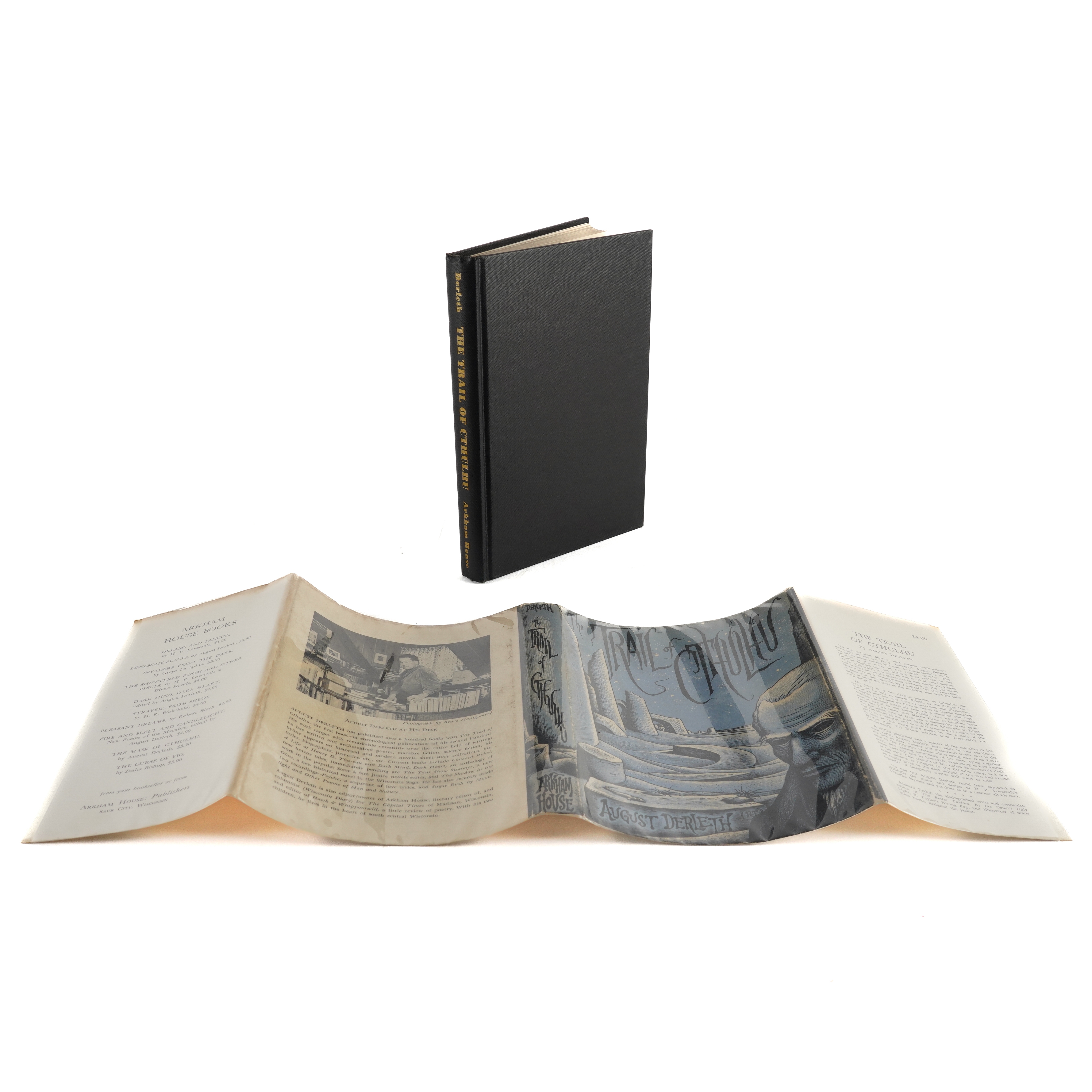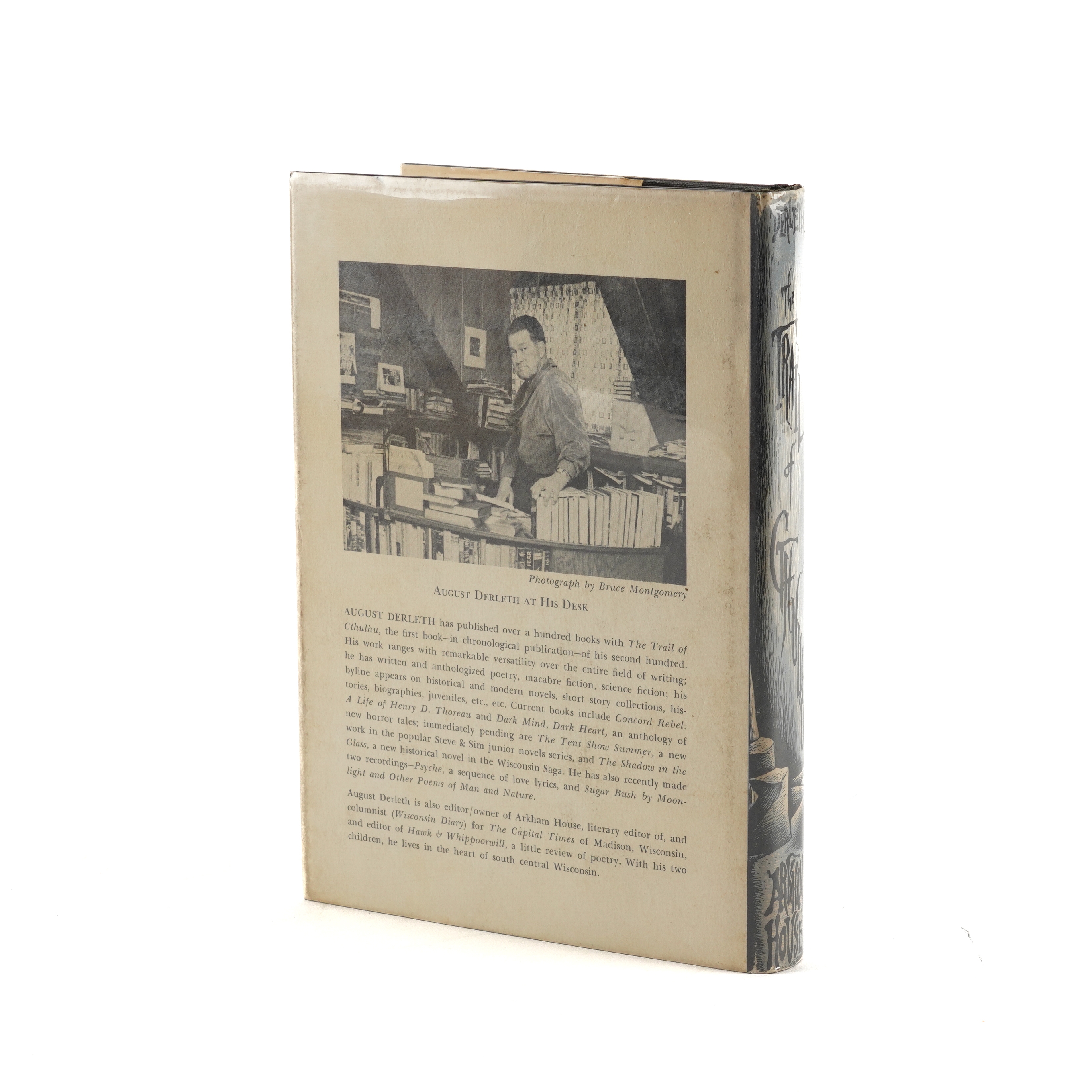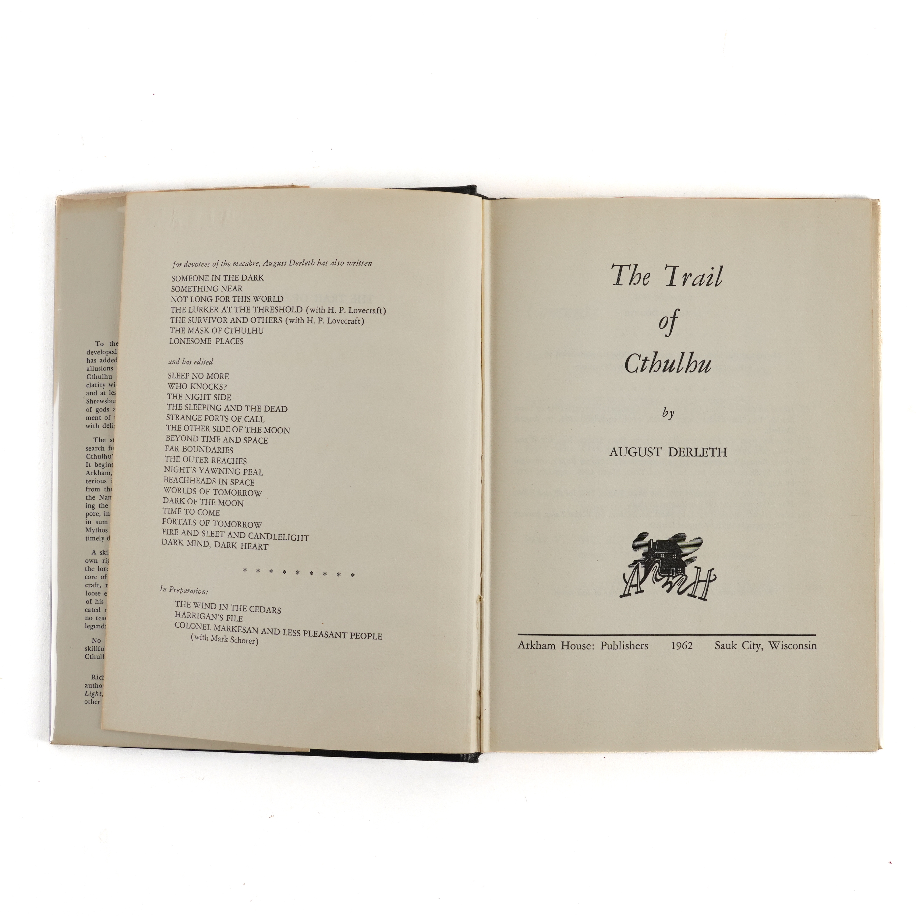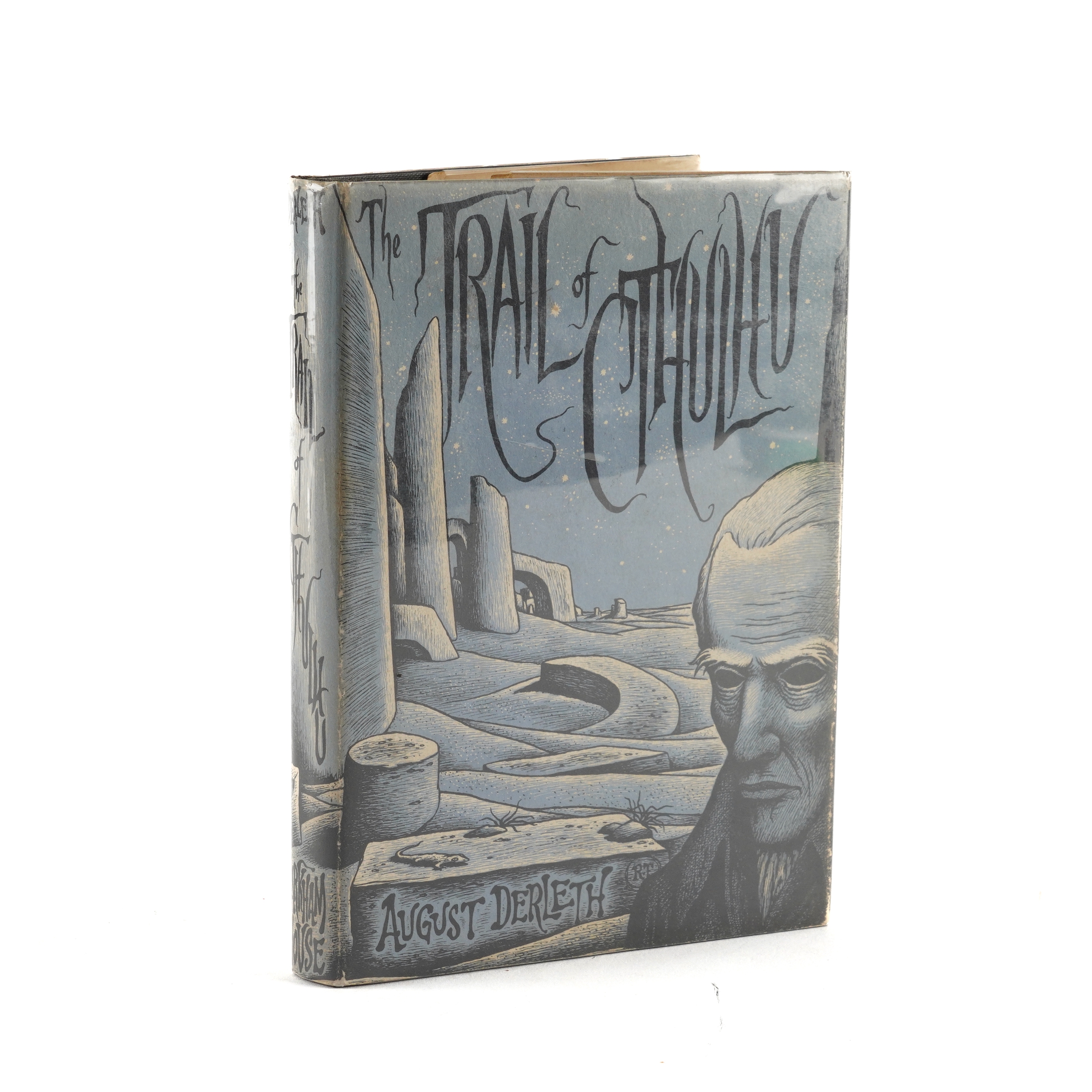 DERLETH, August (1909-71). The Trail of Cthulhu. Sauk City, Wisconsin: Arkham House, 1962. 8vo (187 x 135mm). Half title, woodcut printer's device on the title. Original black cloth, the spine lettered in gilt, the dust-jacket by Richard Taylor with the price of $4.00 unclipped and with a photographed portrait of the author by Bruce Montgomery on the lower wrapper (some staining to the internal edges of the jacket, lower wrapper lightly browned, some minor rubbing at the corners). Provenance: former owner's signatures on the front free endpaper and the half title rubbed out with some corresponding thinning to the paper. FIRST EDITION. A printed note at the end states: "Two thousand five hundred copies of this book have been printed by The Collegiate Press, George Banta Company, Inc., Menasha, Wisconsin, from Linotype Garamond on Winnebago Eggshell. The binding cloth is Holliston Black Novelex." "To the Cthulhu Mythos, that curious myth-pattern developed by the late H. P. Lovecraft, August Derleth has added many stories, but none as comprehensive in its allusions as this novel in five related episodes ... No one but August Derleth could have captured so skillfully the mood and design of H. P. Lovecraft's Cthulhu Mythos and yet done so in a manner all his own" (from the front turn-in). The "five related episodes" originally appeared as separate stories in "Weird Tales" between 1944 and 1953. Please note that the original dust-jacket has been photographed in its modern protective archival Mylar wrapper, thereby avoiding any risk of damage through its temporary removal. Bleiler The Guide to Supernatural Fiction (1983) 522; Jaffery The Arkham House Companion (1992) 70.