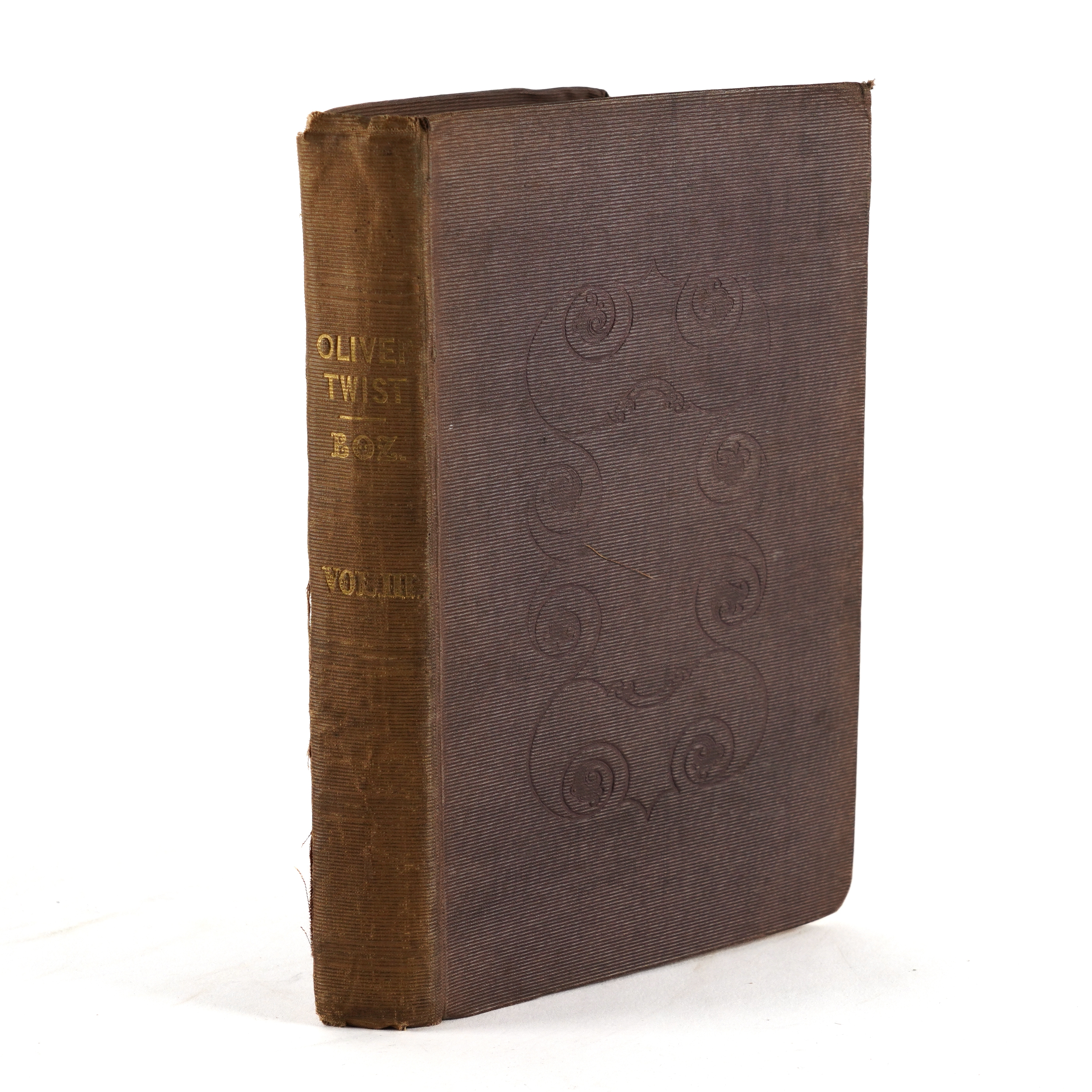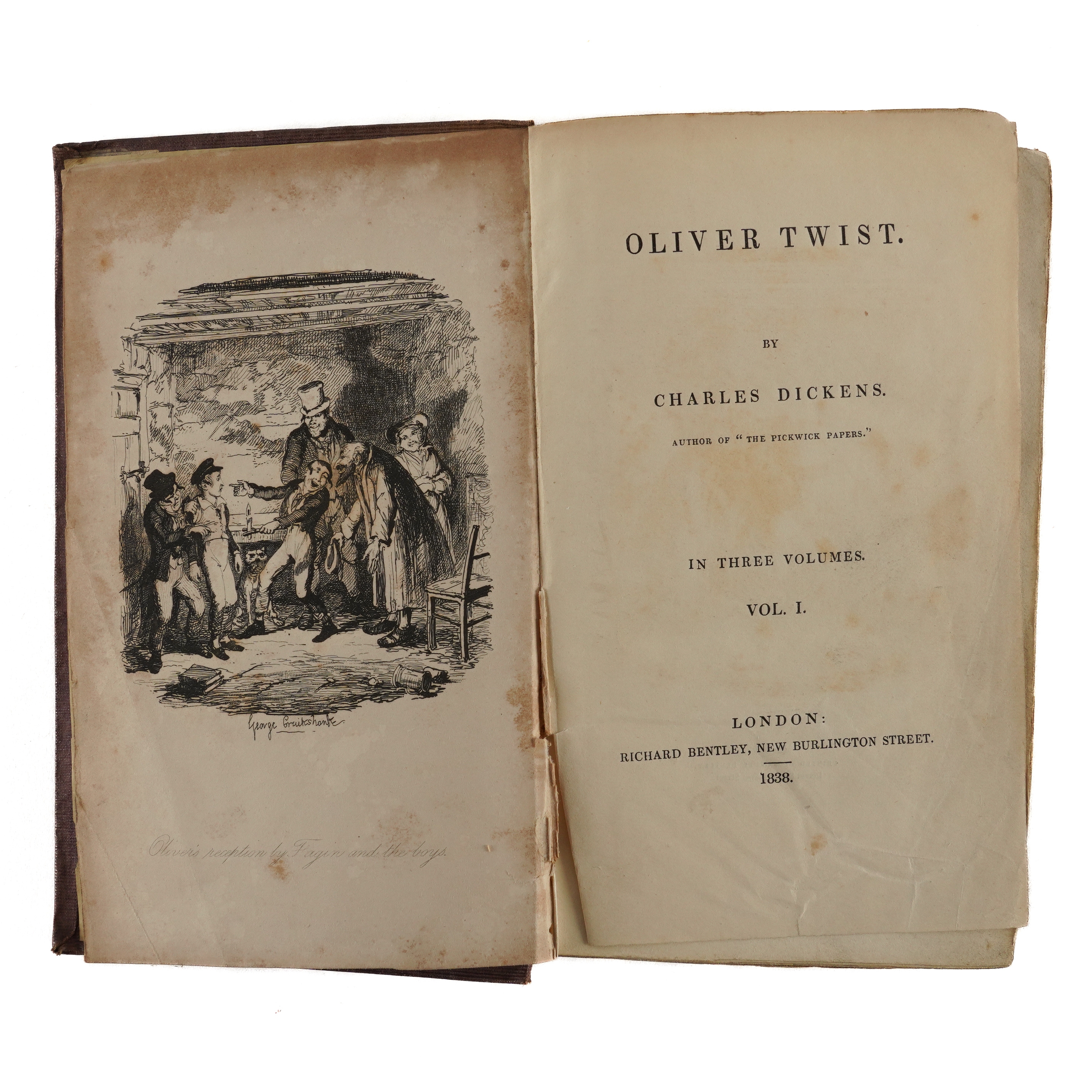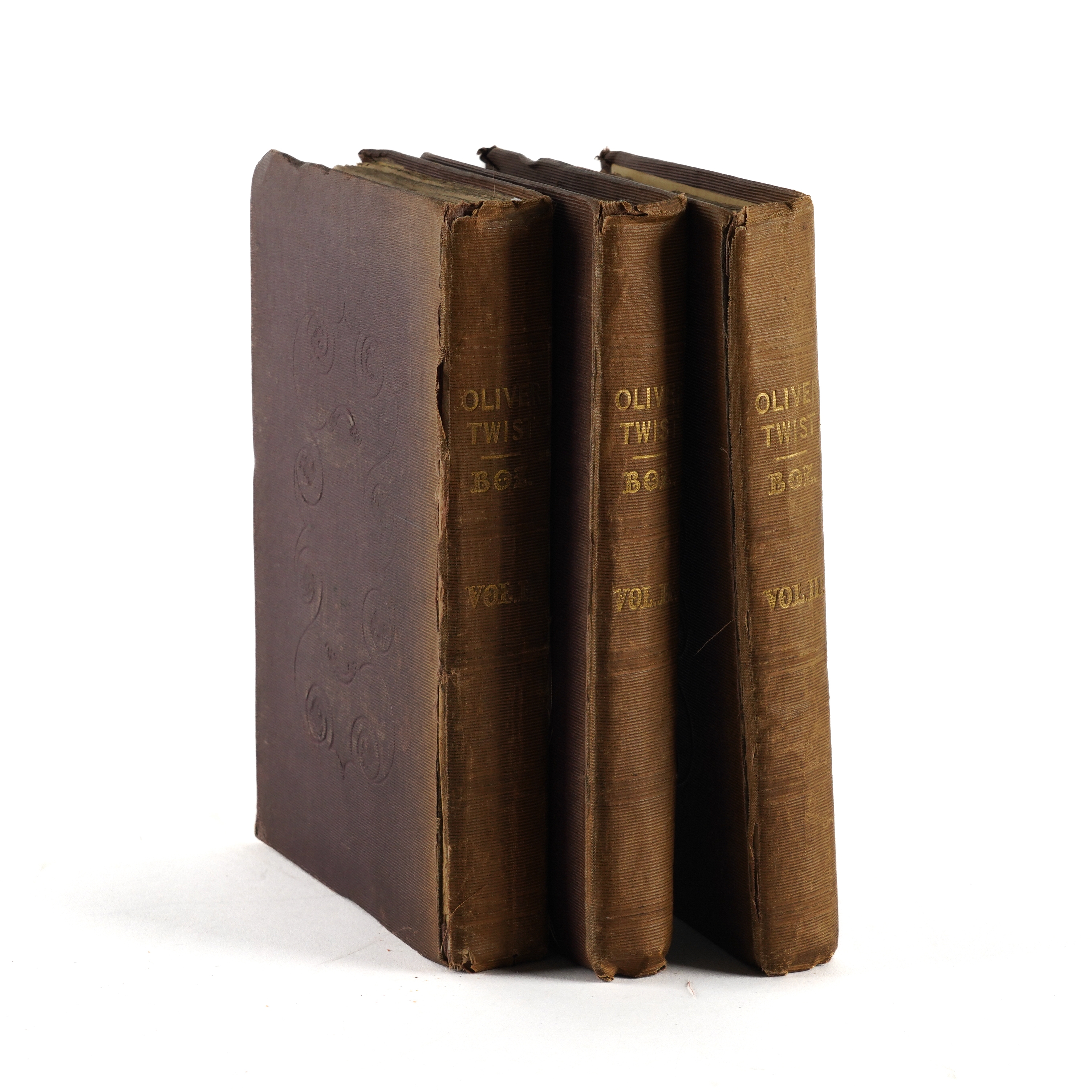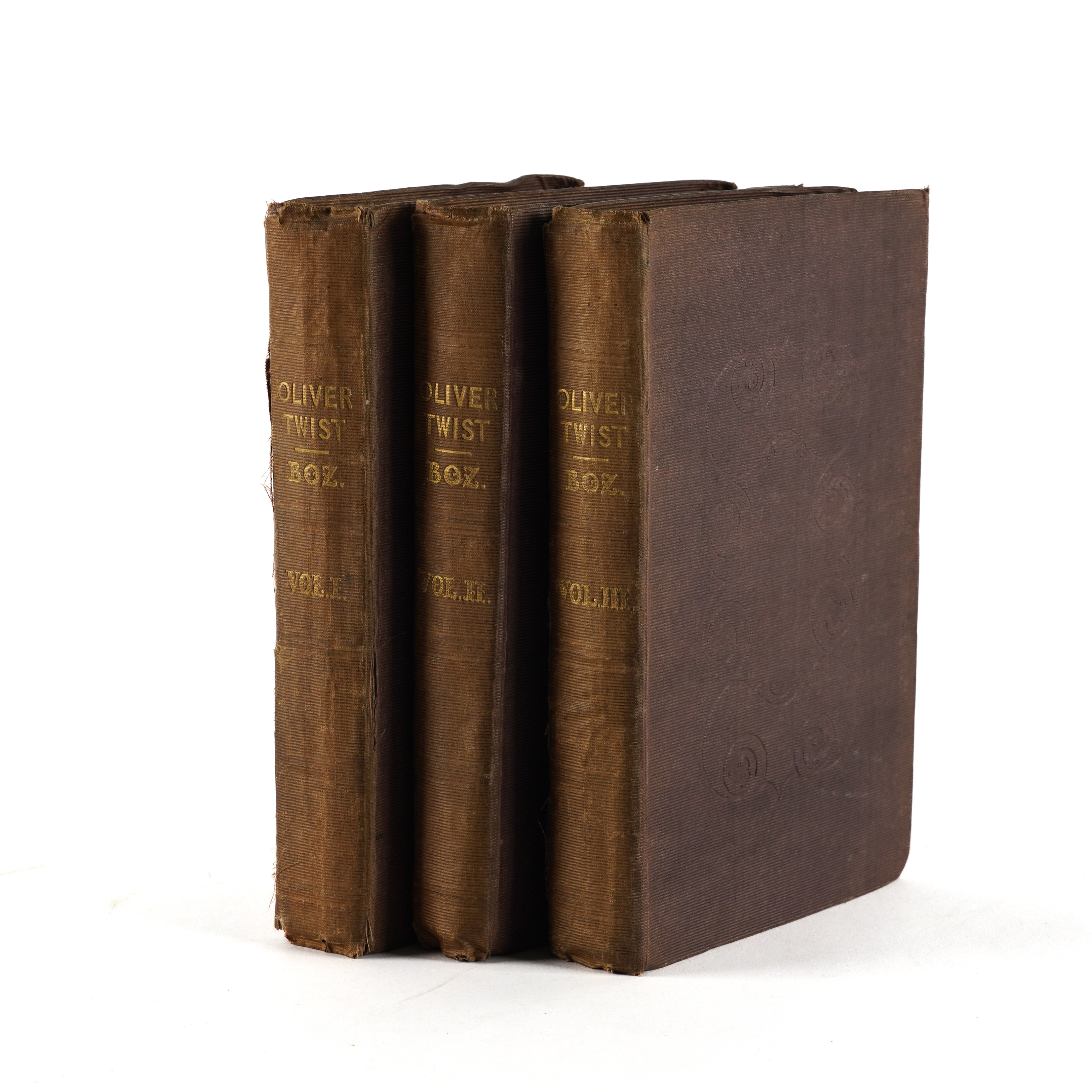 DICKENS, Charles (1812-70). Oliver Twist. London: "Richard Bentley, New Burlington Street," [?November] 1838. 3 volumes, 8vo (202 x 122mm). Half titles in volumes I and II [only, as called for], 24 etched plates by George Cruikshank, 4-pages of publisher's advertisements at the end of vol. one, one-page of publisher's advertisements dated "November 1838" at the front of vol. II (some mainly marginal staining to the plates, the title of vol. one separated from the binding at the lower half of the gutter without loss, the same volume with marginal tear to p.159 and two cleanly repaired marginal tears to pp.175 and 177, frontispiece detached from vol. III, occasional light spotting and staining). Original publisher's plum cloth, the covers decorated in blind with arabesque designs, the spines lettered in gilt, yellow endpapers (the spines faded, some fraying and creasing to the spines, corners bumped, somewhat shaken). Provenance: E. Gott, Armley House (old signature on the half of title of vol. one, presumably a relation of Benjamin Gott (1762-1840) of the same address, later known as Gotts Park Mansion, one of the leading figures in textiles in the Industrial Revolution whose factory in Leeds was once the largest in the world). FIRST EDITION IN BOOK FORM (although the book was published before all the periodicals had been issued, the last periodical appearing in March 1839), second issue, released a week after the first following hurried amendments, with the author's name on the title rather than "Boz" (although "Boz" is retained on the publisher's spines), without the subtitle ("... or, The Parish Boy's Progress") on the title page, with the "church" plate replacing the "fireside" plate opposite page 313 in the third volume, and with "pilaster" twice on p.164 of the third volume. Boxall (ed.) 1001 Books (2006) pp.108-109; Eckel The First Editions of the Writings of Charles Dickens (1913) pp.59-62; Gimbel [Podeschi] Dickens and Dickensiana: A Catalogue of the Richard Gimbel Collection (1980) A27; Sadleir XIX Century Fiction (1969) 696; Smith Charles Dickens in the Original Cloth; A Bibliographical Record (1982) I, 4. (3)