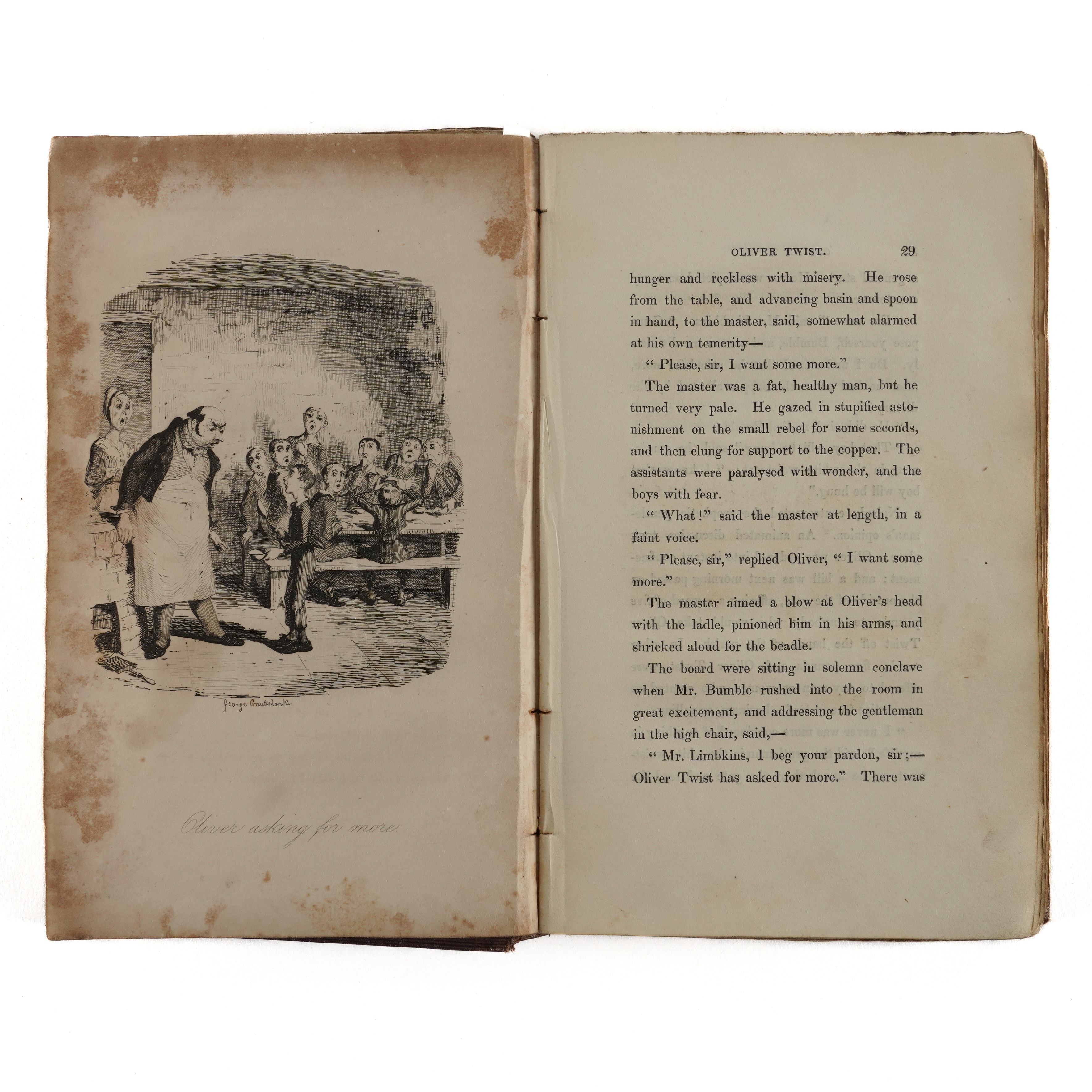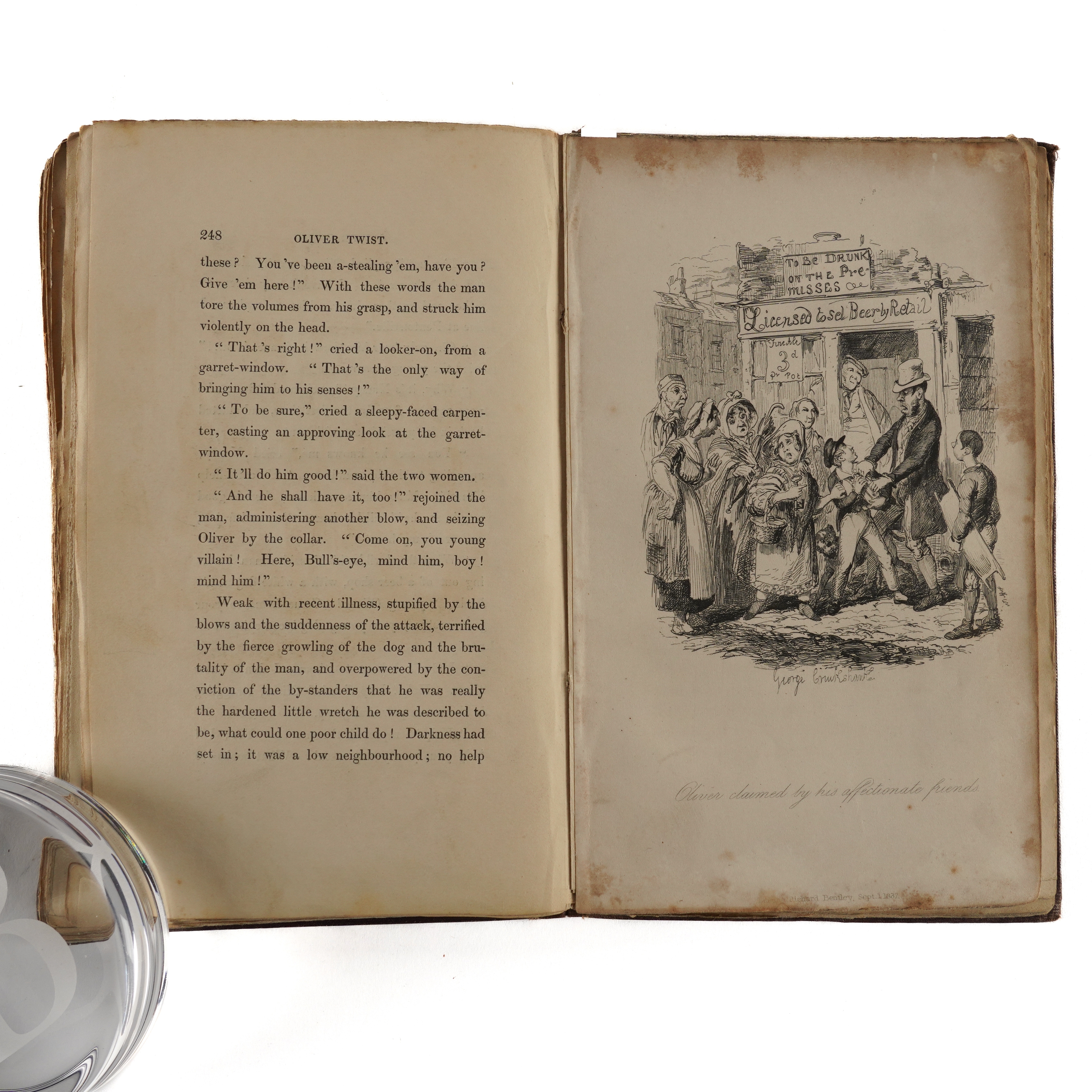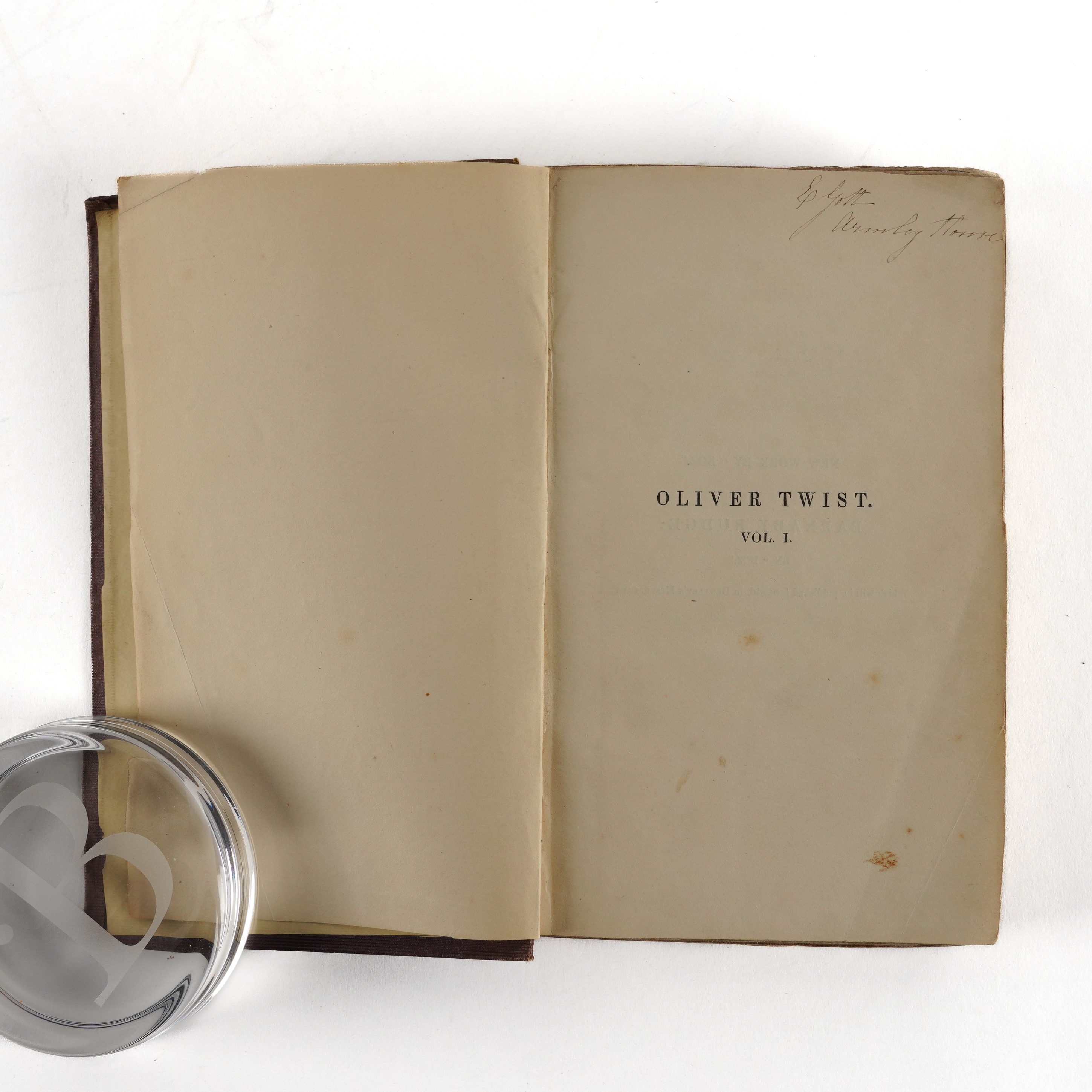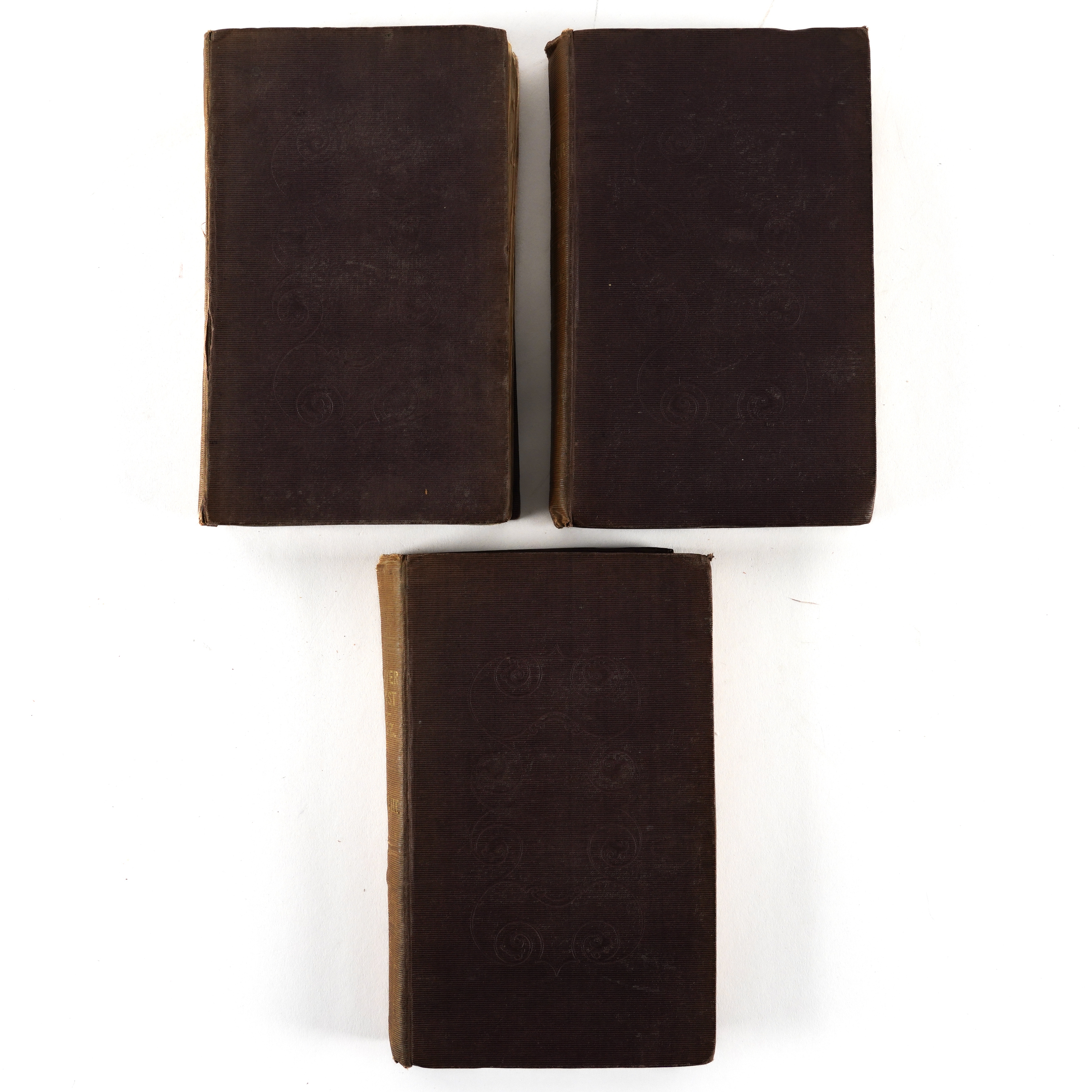DICKENS, Charles (1812-70). Oliver Twist. London: "Richard Bentley, New Burlington Street," [?November] 1838. 3 volumes, 8vo (202 x 122mm). Half titles in volumes I and II [only, as called for], 24 etched plates by George Cruikshank, 4-pages of publisher's advertisements at the end of vol. one, one-page of publisher's advertisements dated "November 1838" at the front of vol. II (some mainly marginal staining to the plates, the title of vol. one separated from the binding at the lower half of the gutter without loss, the same volume with marginal tear to p.159 and two cleanly repaired marginal tears to pp.175 and 177, frontispiece detached from vol. III, occasional light spotting and staining). Original publisher's plum cloth, the covers decorated in blind with arabesque designs, the spines lettered in gilt, yellow endpapers (the spines faded, some fraying and creasing to the spines, corners bumped, somewhat shaken). Provenance: E. Gott, Armley House (old signature on the half of title of vol. one, presumably a relation of Benjamin Gott (1762-1840) of the same address, later known as Gotts Park Mansion, one of the leading figures in textiles in the Industrial Revolution whose factory in Leeds was once the largest in the world). FIRST EDITION IN BOOK FORM (although the book was published before all the periodicals had been issued, the last periodical appearing in March 1839), second issue, released a week after the first following hurried amendments, with the author's name on the title rather than "Boz" (although "Boz" is retained on the publisher's spines), without the subtitle ("... or, The Parish Boy's Progress") on the title page, with the "church" plate replacing the "fireside" plate opposite page 313 in the third volume, and with "pilaster" twice on p.164 of the third volume. Boxall (ed.) 1001 Books (2006) pp.108-109; Eckel The First Editions of the Writings of Charles Dickens (1913) pp.59-62; Gimbel [Podeschi] Dickens and Dickensiana: A Catalogue of the Richard Gimbel Collection (1980) A27; Sadleir XIX Century Fiction (1969) 696; Smith Charles Dickens in the Original Cloth; A Bibliographical Record (1982) I, 4. (3)