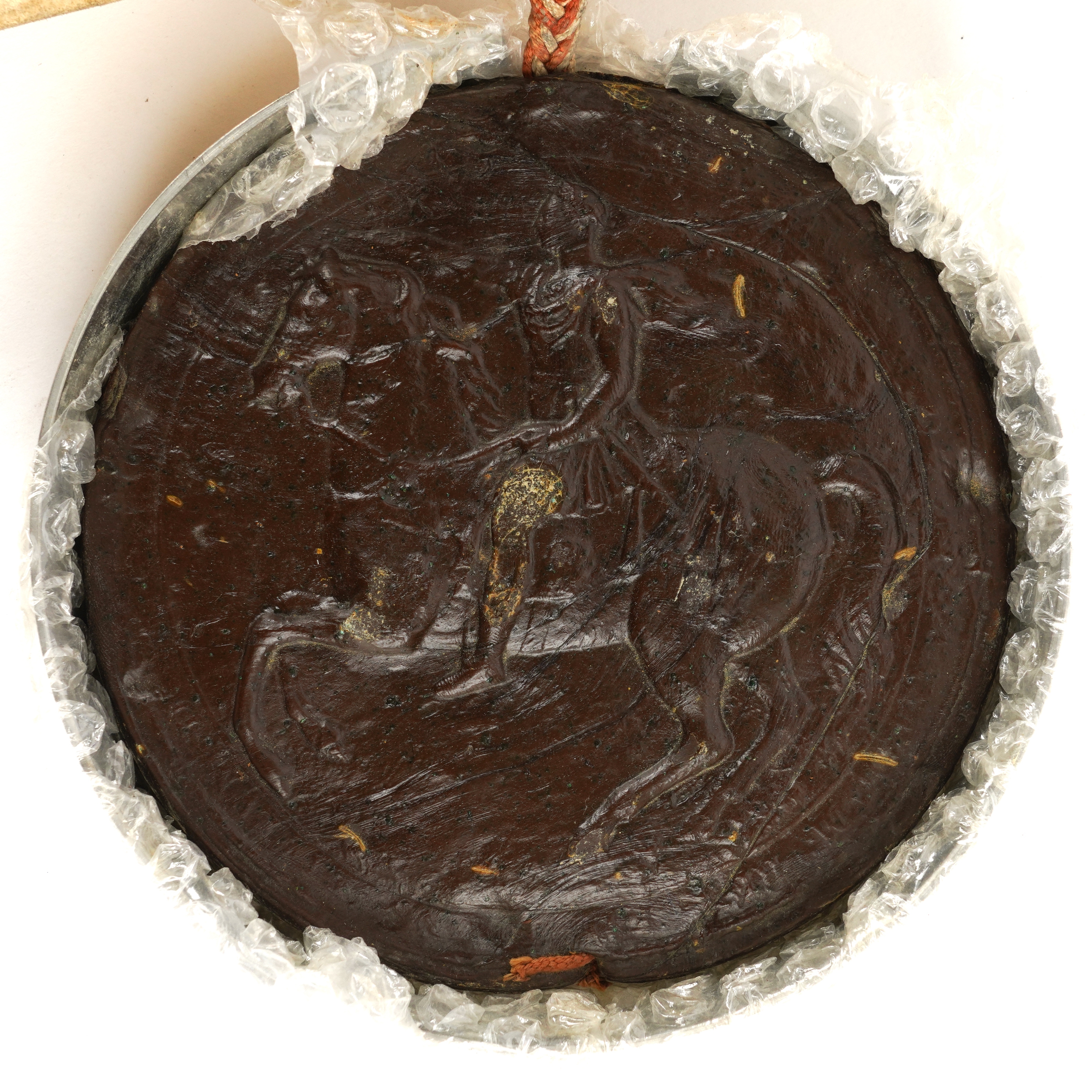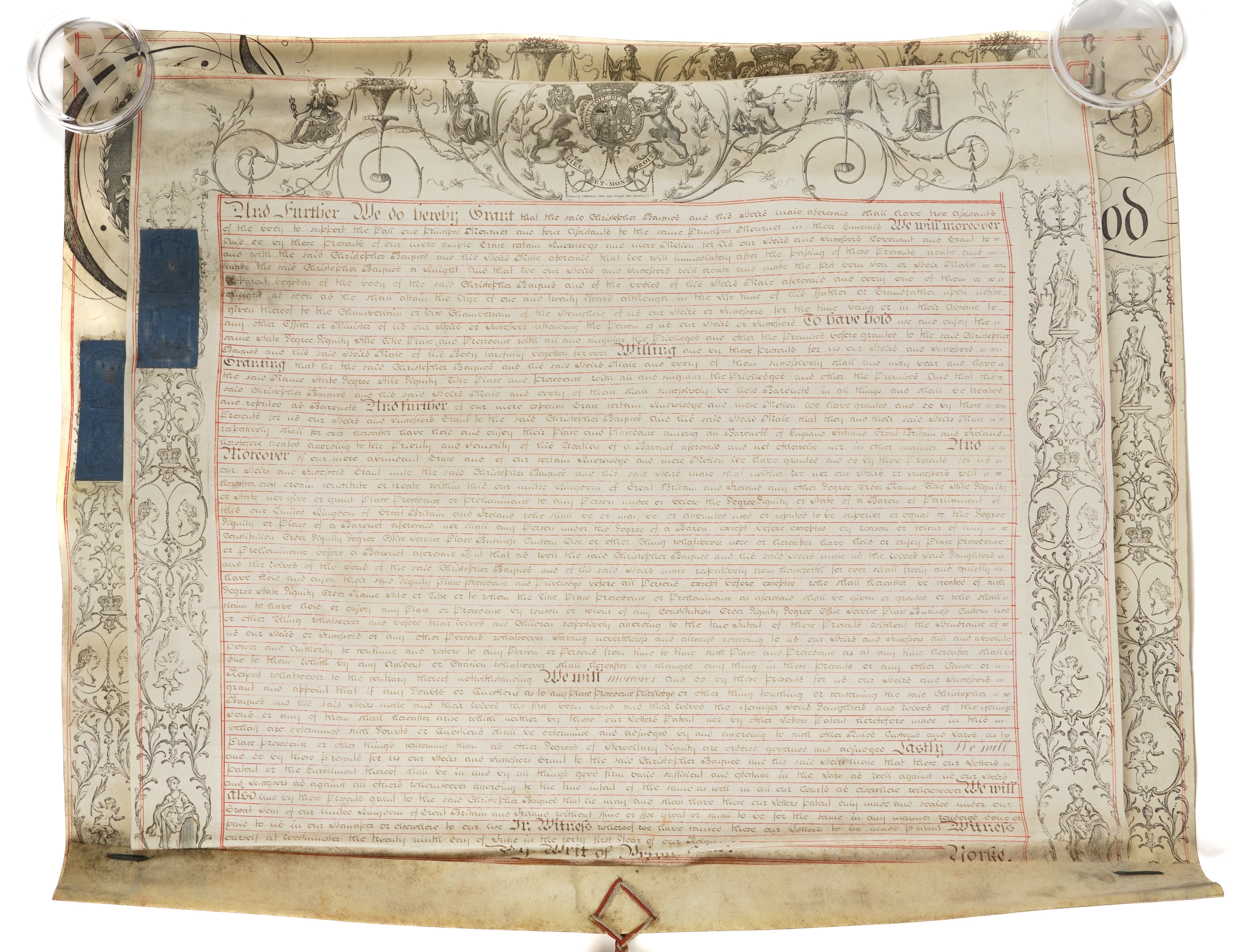 DOCUMENT ON VELLUM - Letters patent granting a baronetcy to Christopher Baynes of Harefield Place, Middlesex, on 2 sheets of vellum, with an engraved portrait of George III at the head of the first sheet, and engraved marginal decoration by J. Hawkins, rubricated, each sheet approximately 600 x 800mm., with a large circular wax seal, diameter 170mm., protected in a metal container, the whole contained in a shaped box, with clasps, [c.1801]. The Baynes Baronetcy was created for Christopher Baynes (1755-1837) on 29 June 1801. He was Major-Commandant of the Uxbridge Gentlemen and Yeomanry Cavalry, which he helped to raise. The title descended from father to son until the death of his great-great-grandson, the fifth baronet, in 1971, whereupon it succeeded to his first cousin, the sixth baronet.