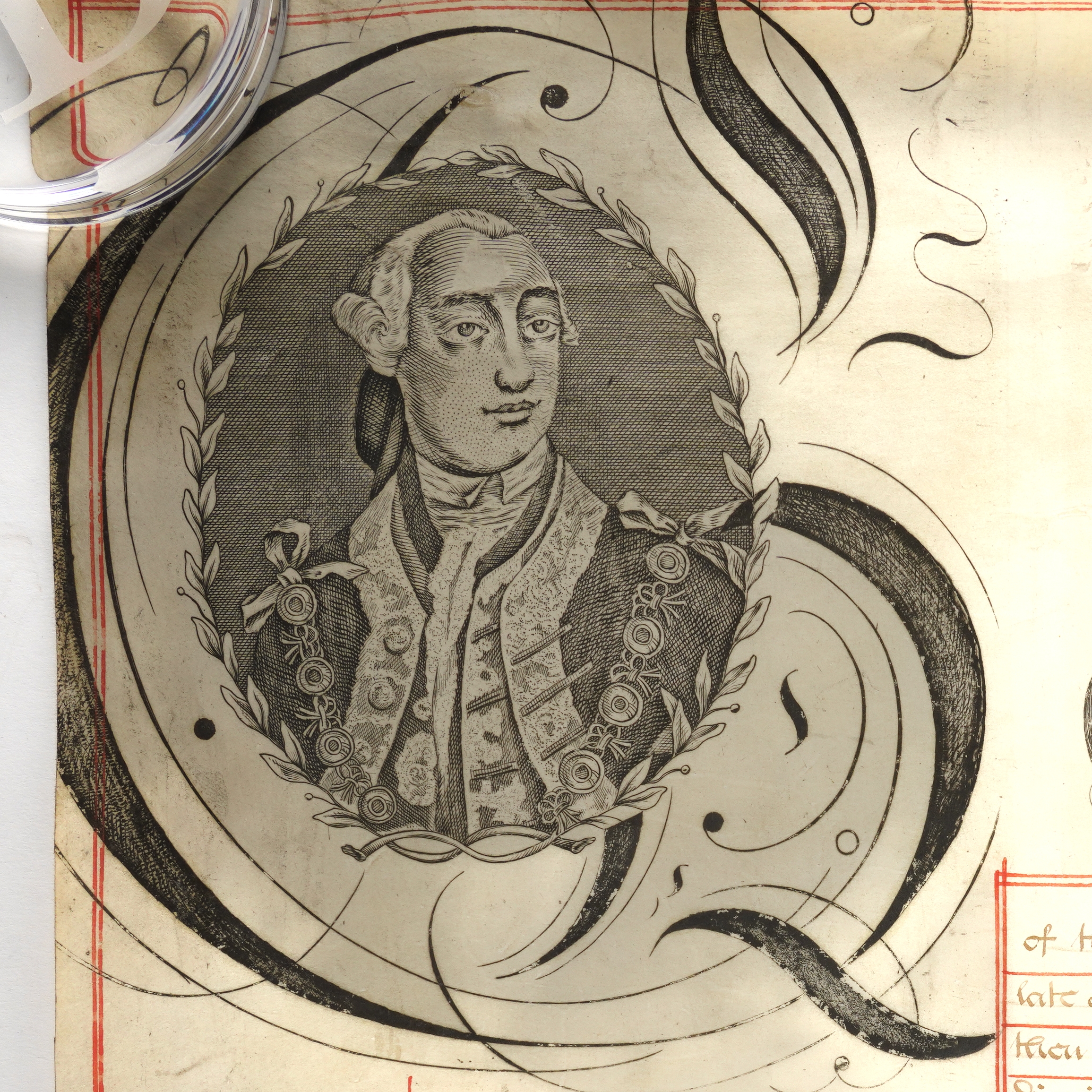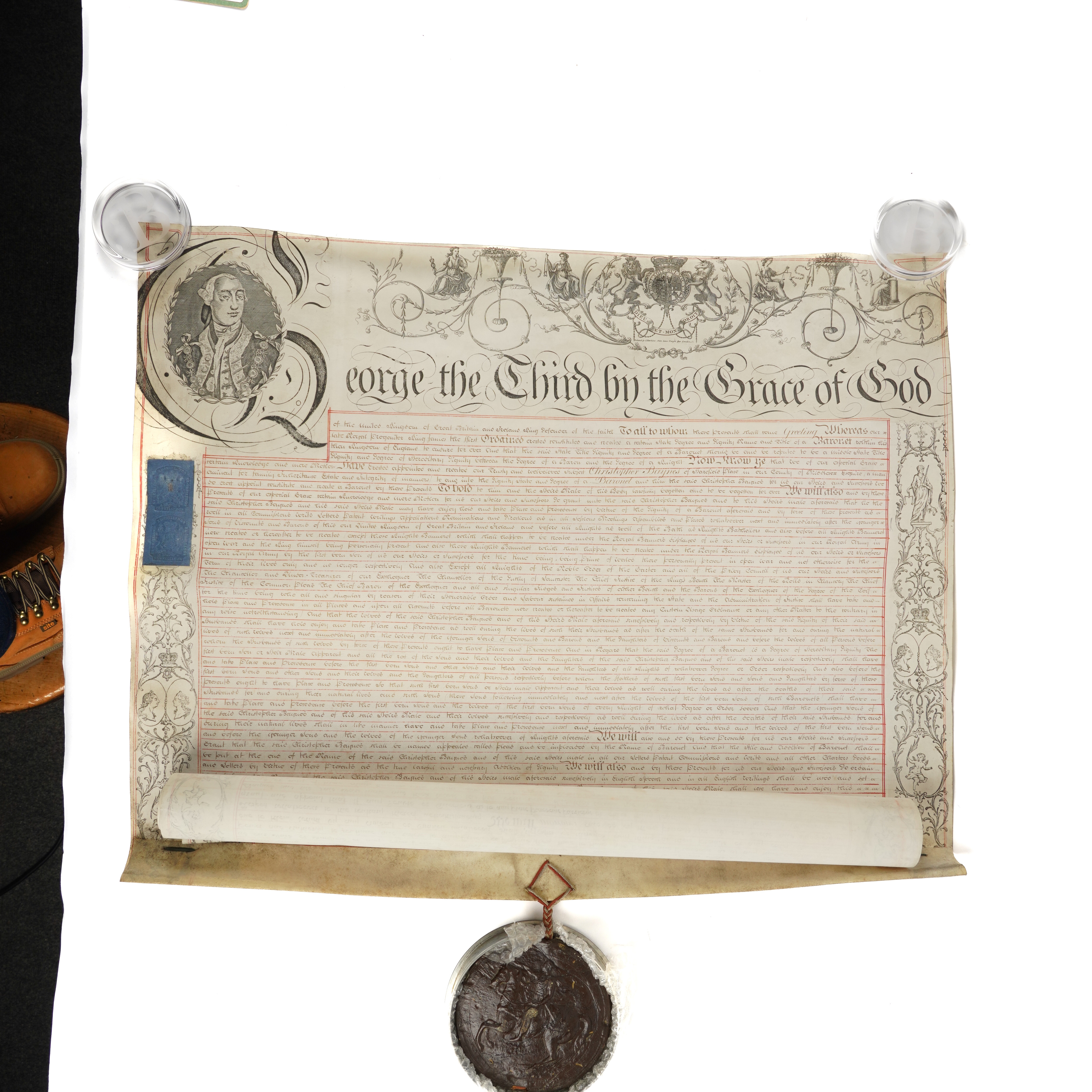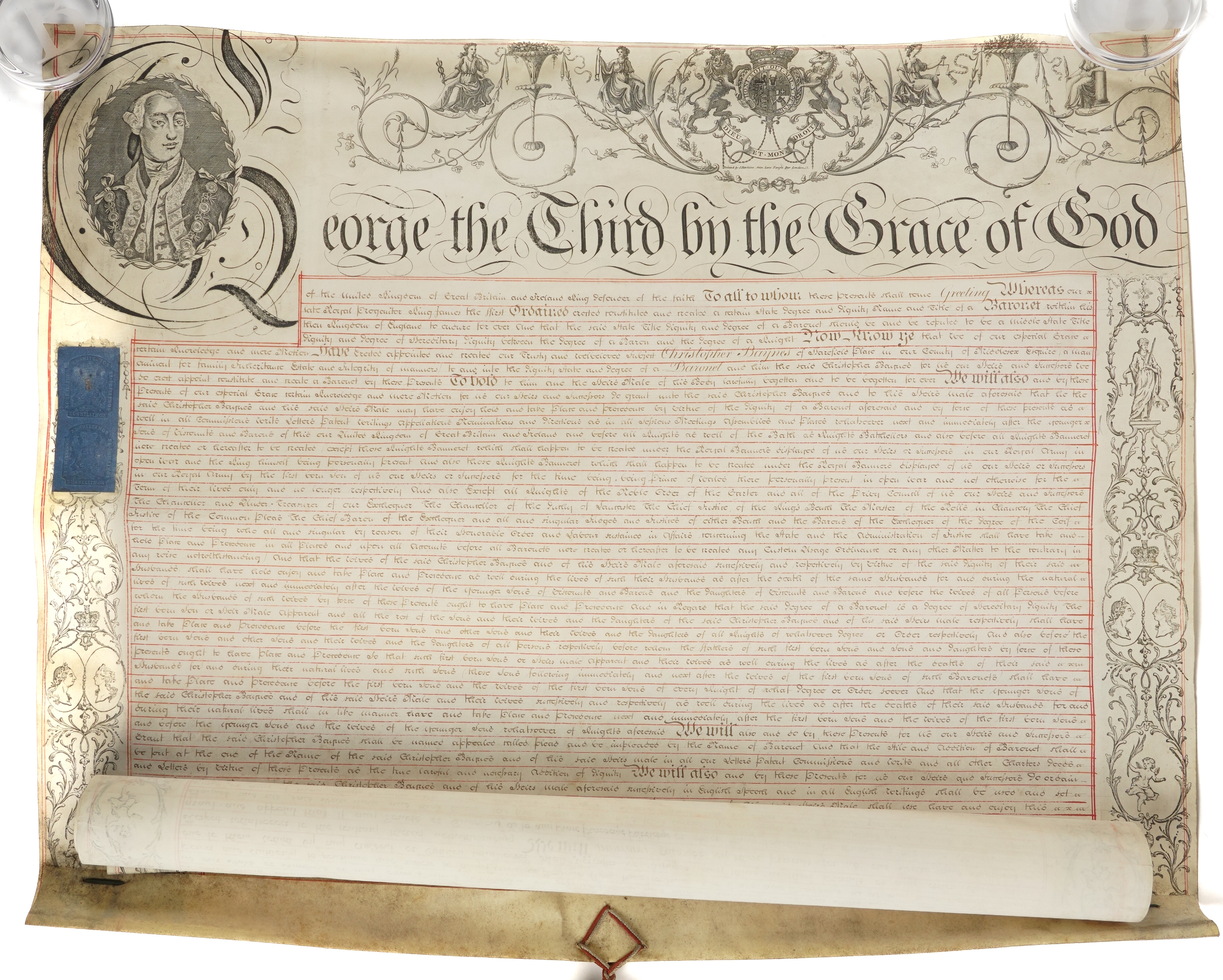 DOCUMENT ON VELLUM - Letters patent granting a baronetcy to Christopher Baynes of Harefield Place, Middlesex, on 2 sheets of vellum, with an engraved portrait of George III at the head of the first sheet, marginal decoration, wax seal, in shaped box.