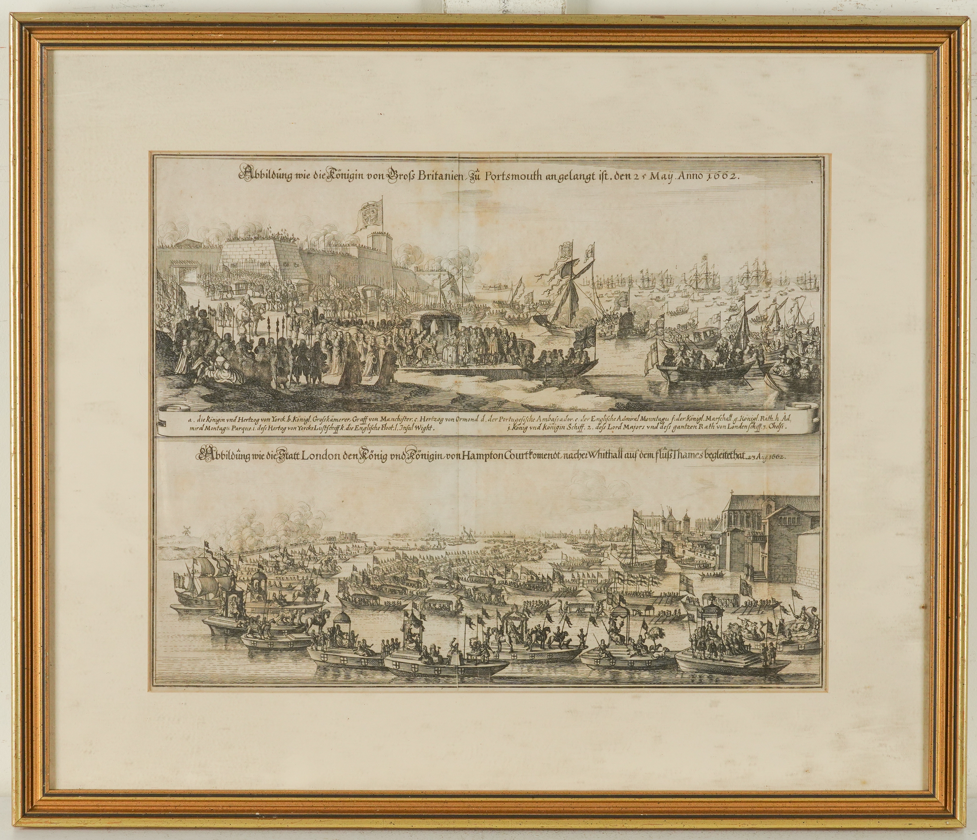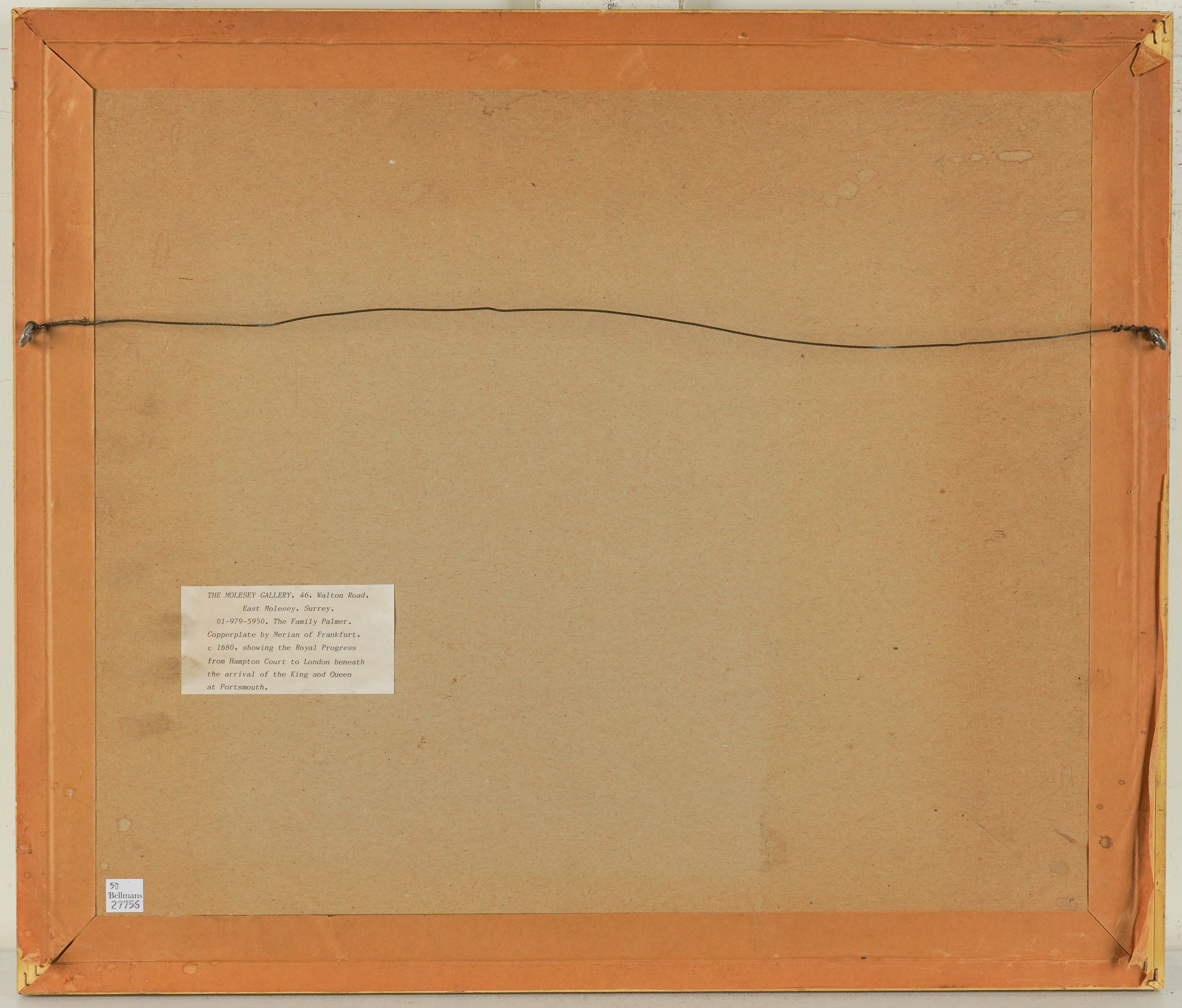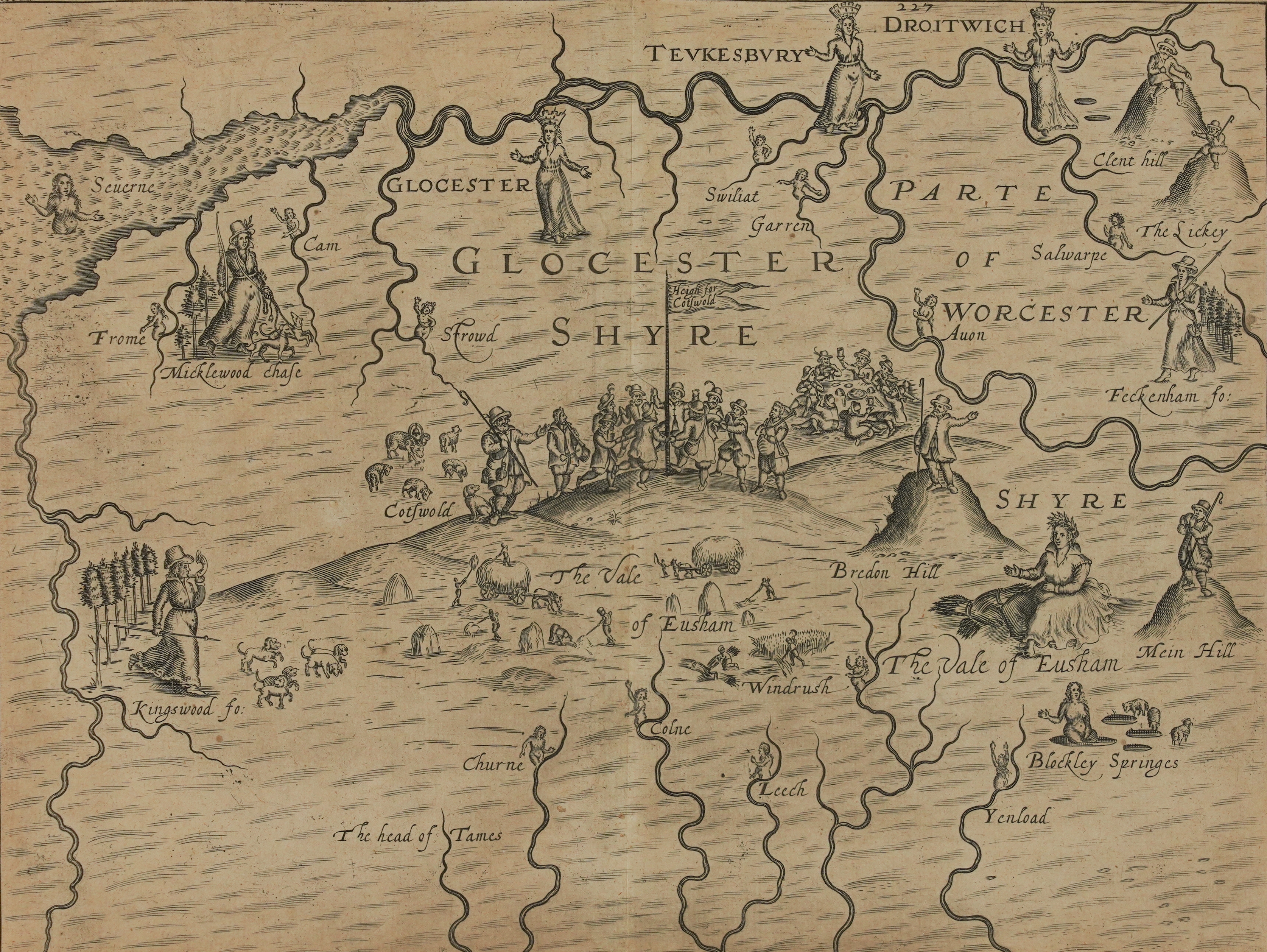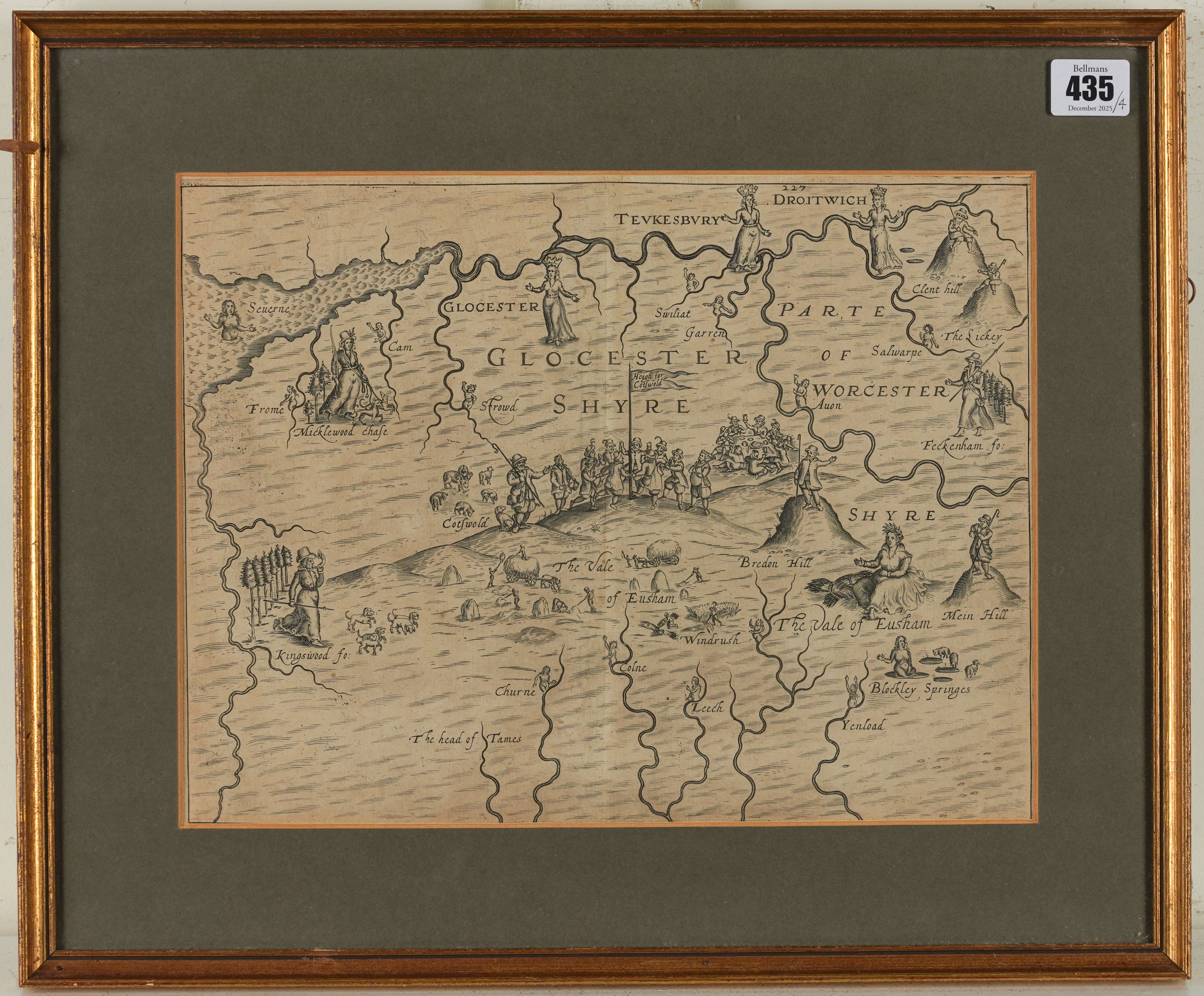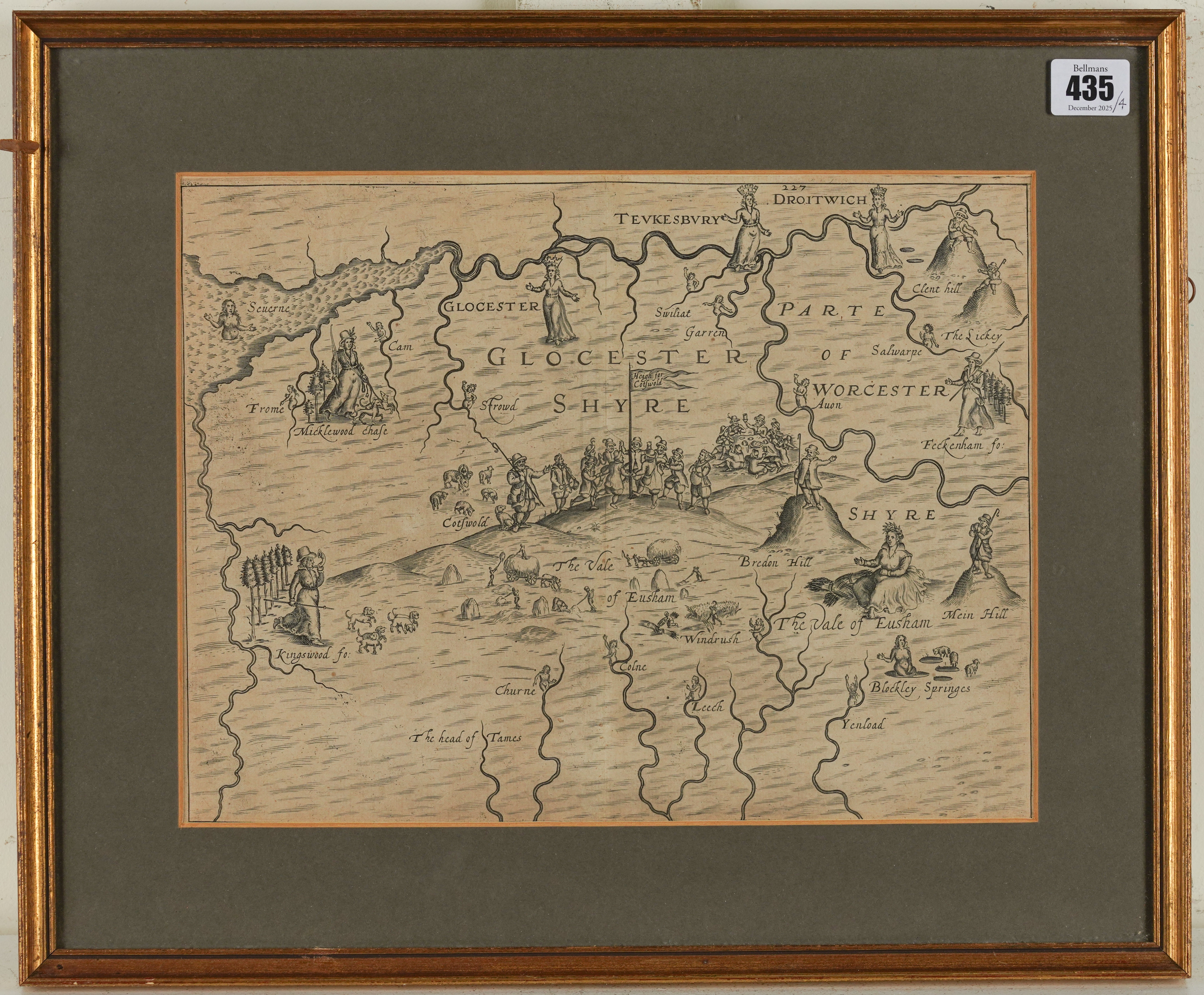 DRAYTON, Michael (1563-1631) & William HOLE (d.1624, engraver). Glocester Shyre ... Worcester Shyre. [London: c.1612]. Engraved map including Gloucestershire and Worcestershire, numerous allegorical figures, 250 x 330mm., framed and glazed. The map is extracted from Michael Drayton's work "Poly-Olbion" which was published between 1612 and 1620. With 3 other miscellaneous maps including one by Merian, in 2 lateral sections, c.1620, "showing the Royal Progress from Hampton Court to London beneath the arrival of the King and Queen at Portsmouth" (according to a label pasted onto the verso of the frame). (4)