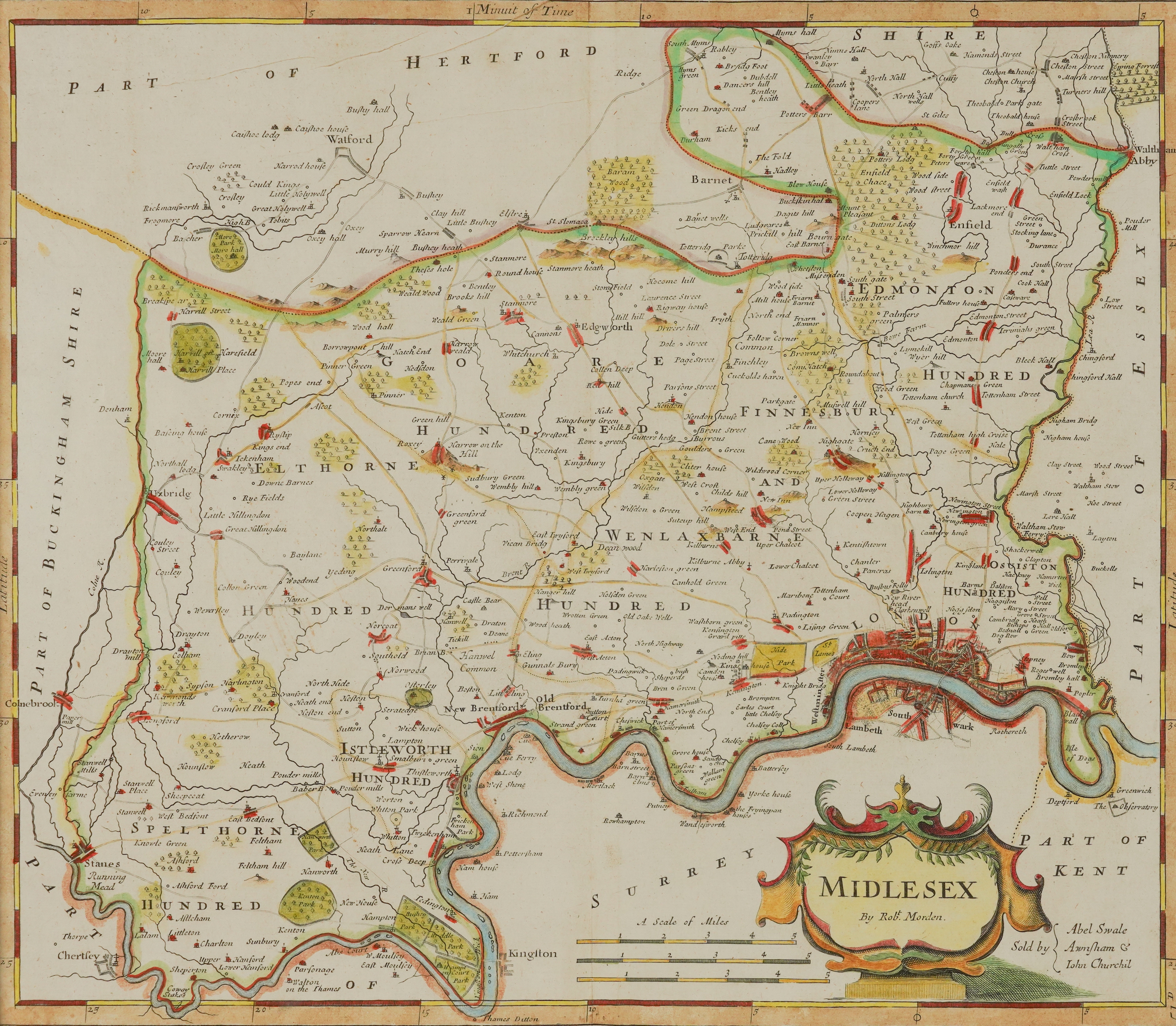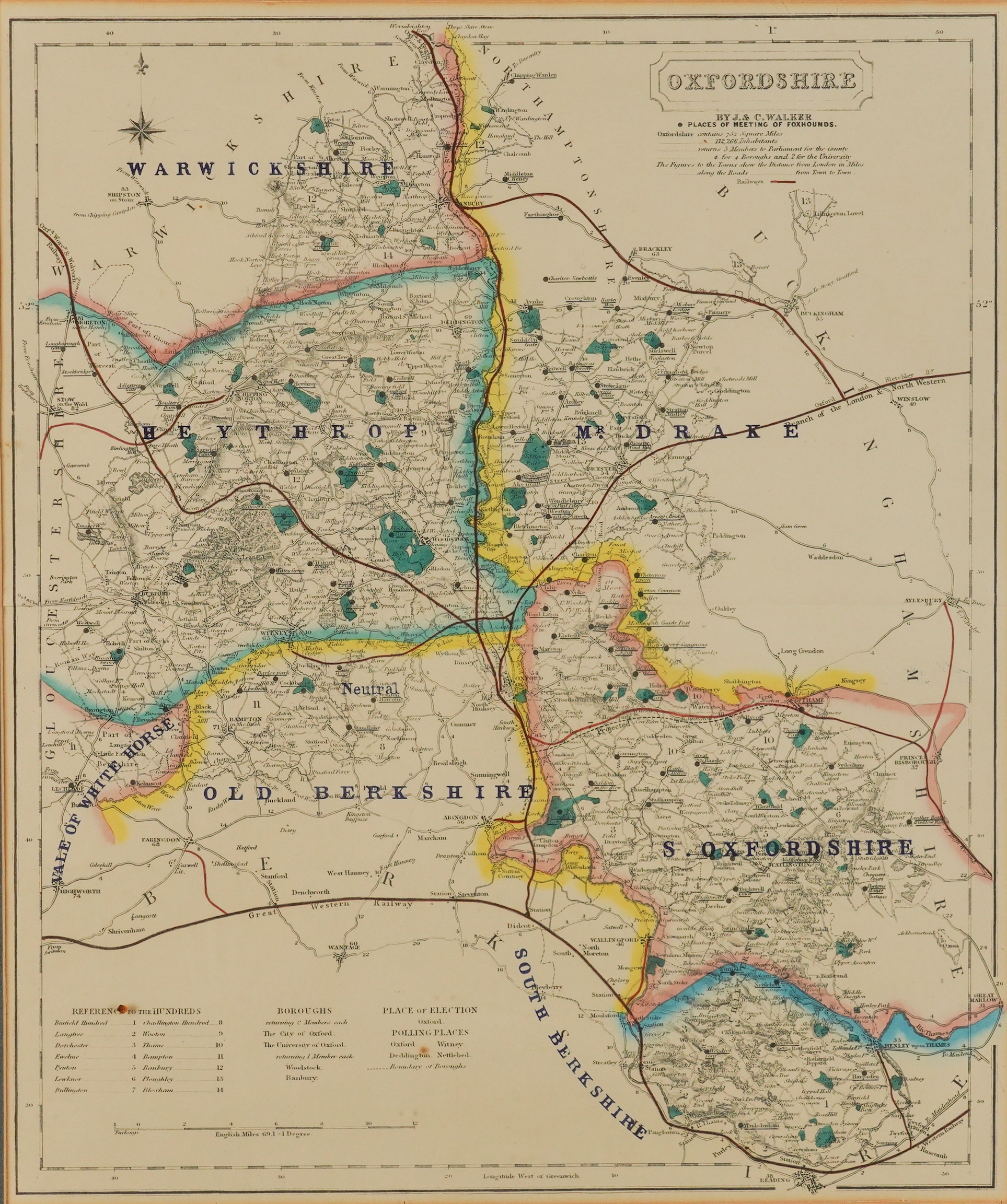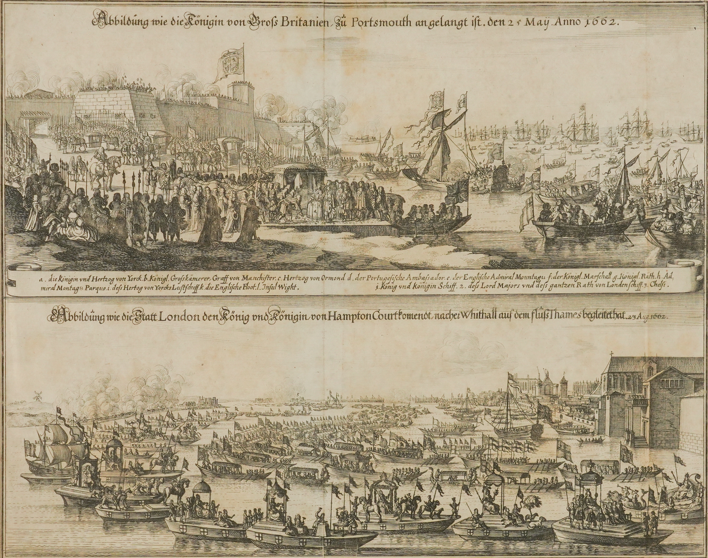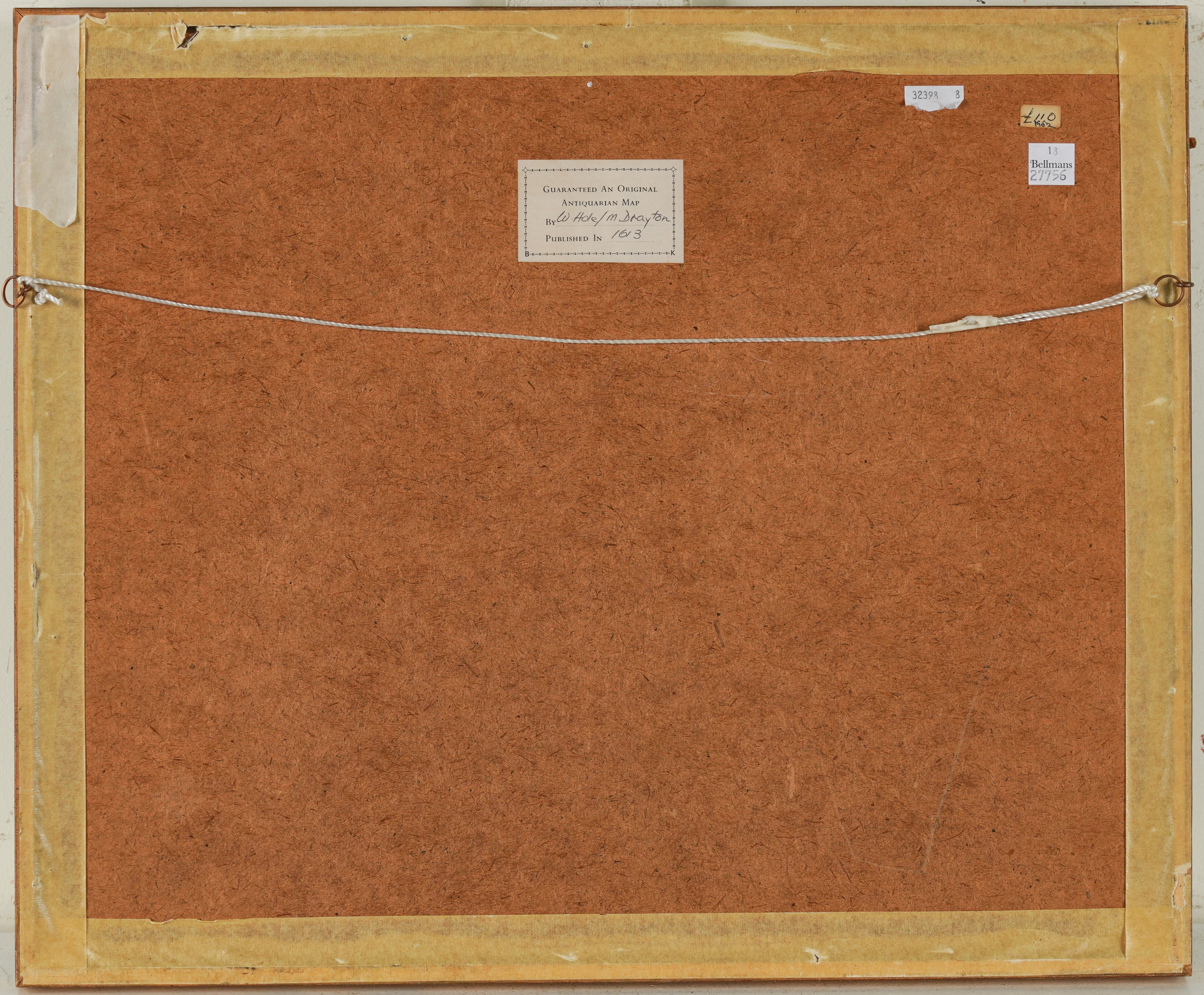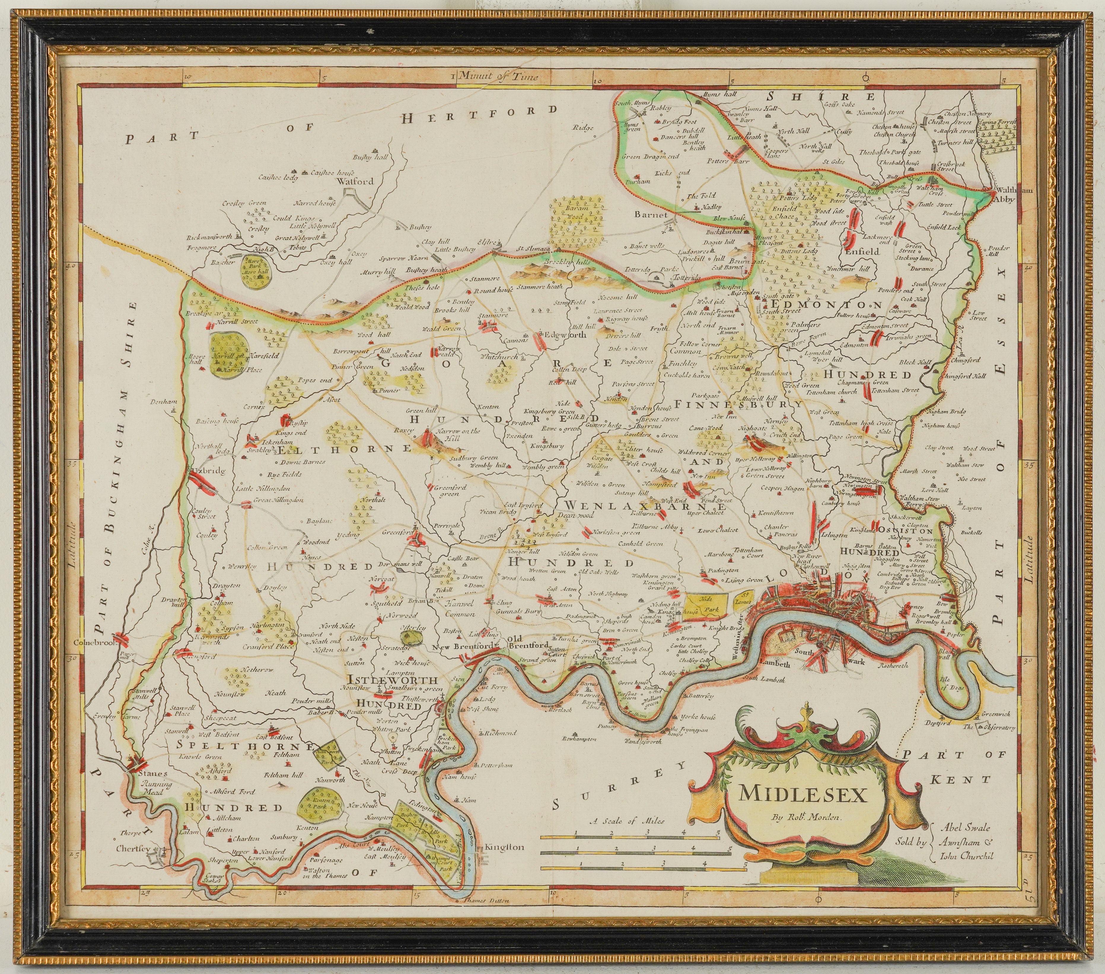 DRAYTON, Michael (1563-1631) & William HOLE (d.1624, engraver). Glocester Shyre ... Worcester Shyre. [London: c.1612]. Engraved map including Gloucestershire and Worcestershire, numerous allegorical figures, 250 x 330mm., framed and glazed. The map is extracted from Michael Drayton's work "Poly-Olbion" which was published between 1612 and 1620. With 3 other miscellaneous maps including one by Merian, in 2 lateral sections, c.1620, "showing the Royal Progress from Hampton Court to London beneath the arrival of the King and Queen at Portsmouth" (according to a label pasted onto the verso of the frame). (4)