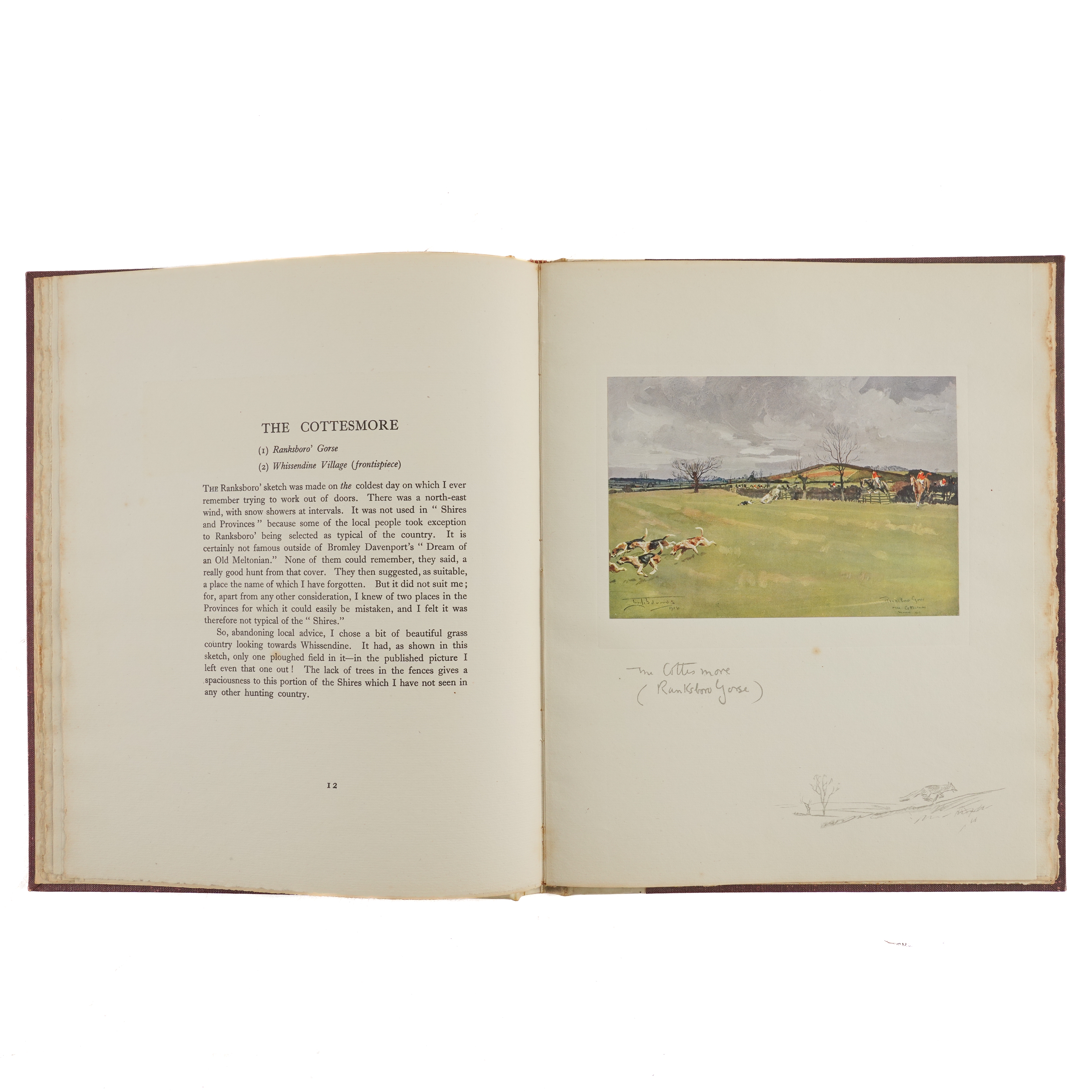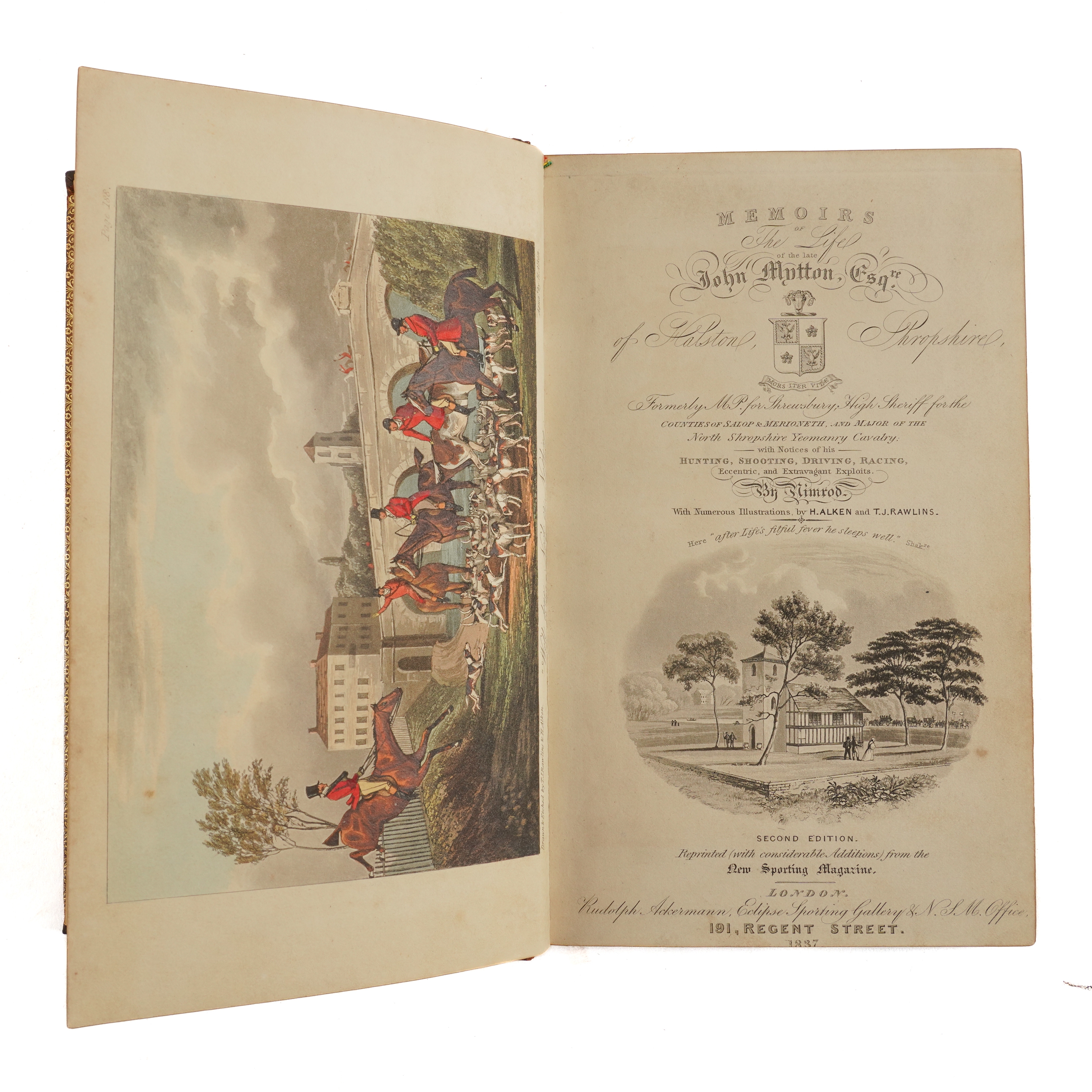 EDWARDS, Lionel (1878-1966, illustrator). My Hunting Sketch Book. London: Eyre and Spottiswoode Limited, 1928. 4to (317 x 250mm). Half title, 15 mounted coloured plates by Lionel Edwards (occasional light mainly marginal spotting). Original vellum-backed burgundy cloth boards lettered in gilt, top edges gilt, others uncut. FIRST EDITION. NUMBER 226 OF 250 COPIES SIGNED BY THE ARTIST. With [Charles James Apperley's] Memoirs of the Life of the Late John Mytton, Esq. ... with Notices of his Hunting, Shooting, Driving, Racing, Eccentric and Extravagant Exploits. By Nimrod ... Second Edition, Reprinted (with Considerable Additions) from the New Sporting Magazine (London, Rudolph Ackermann, 1837, 8vo, 18 fine hand-coloured aquatint plates by H. Alken and T. J. Rawlins, contemporary calf gilt, rebacked with some repairs). (2)