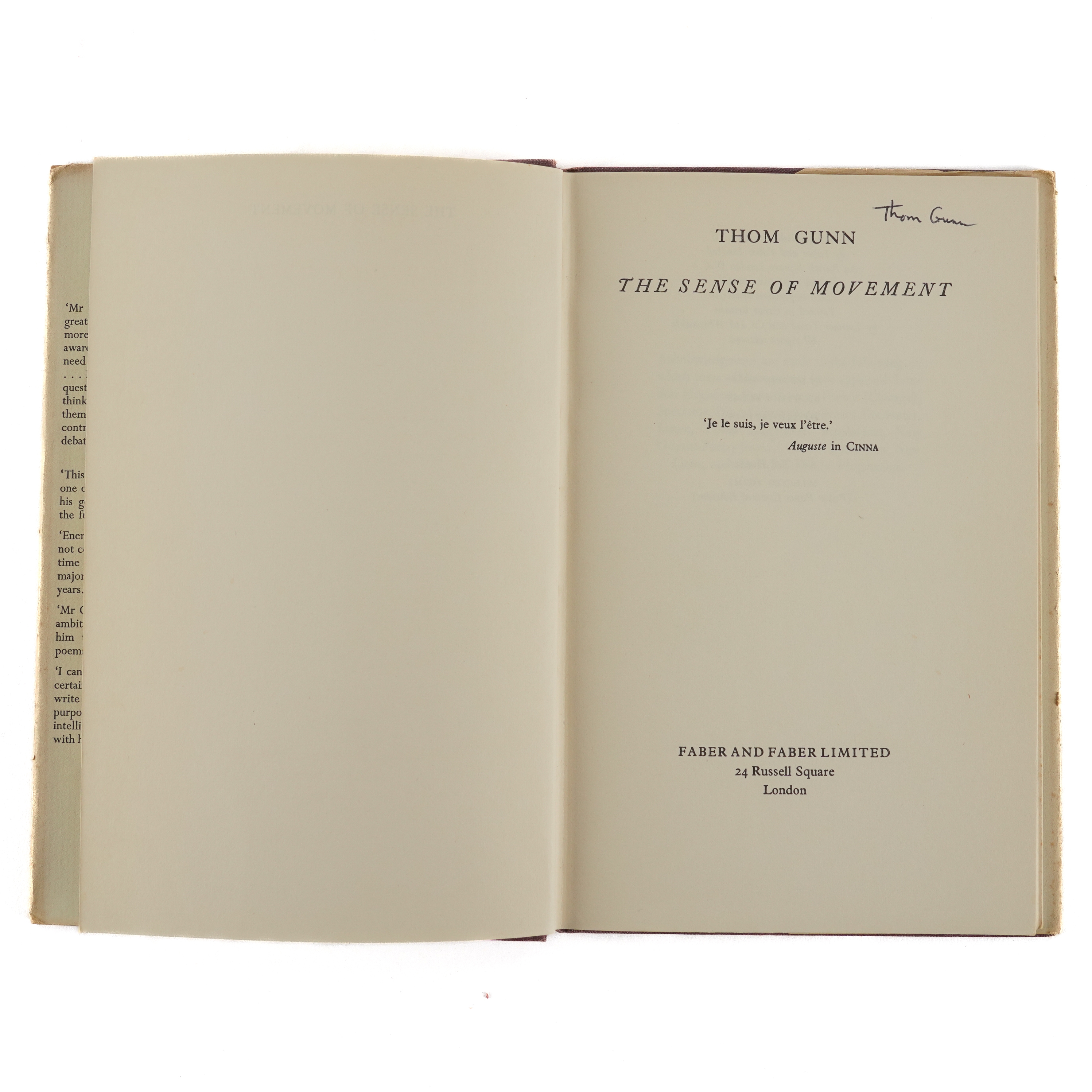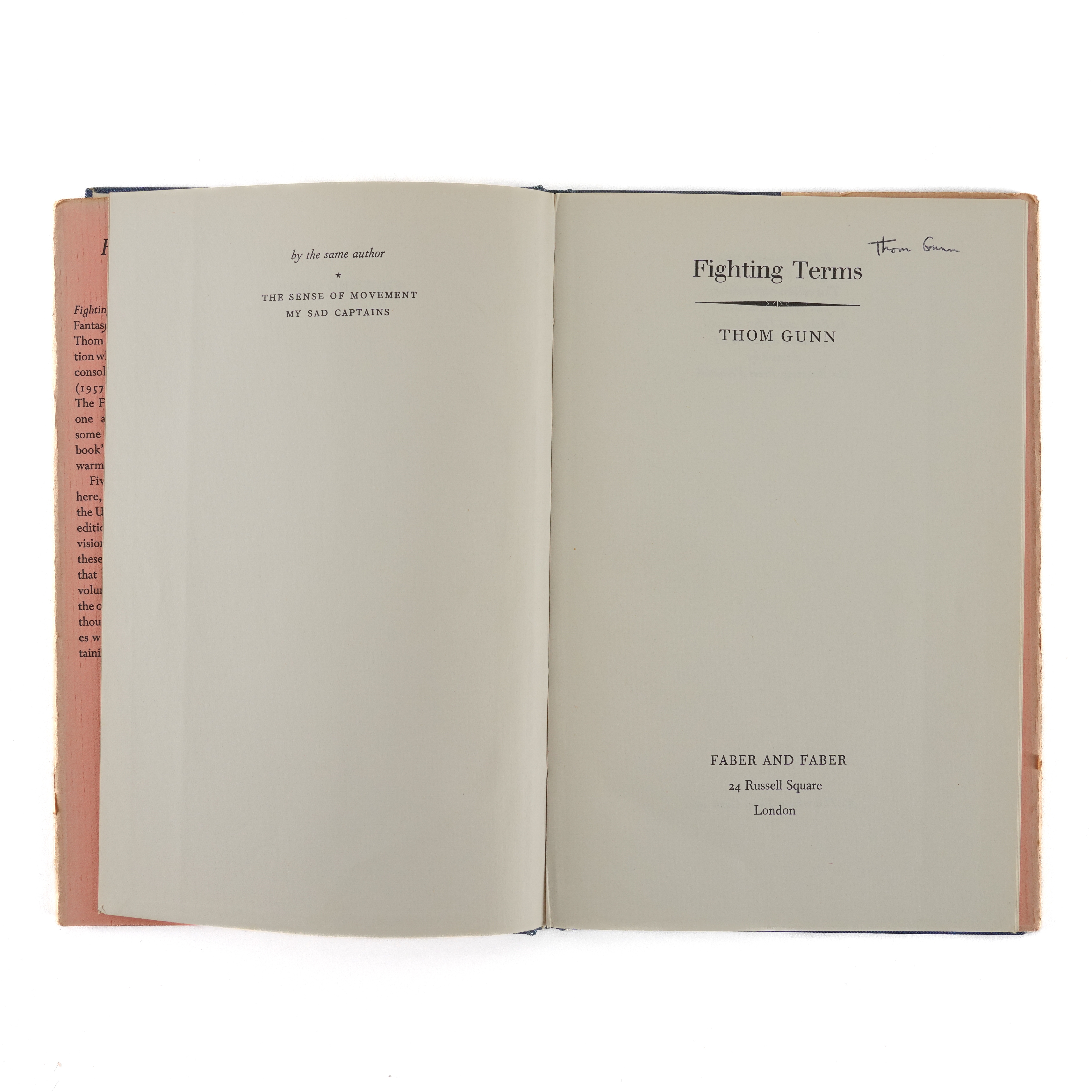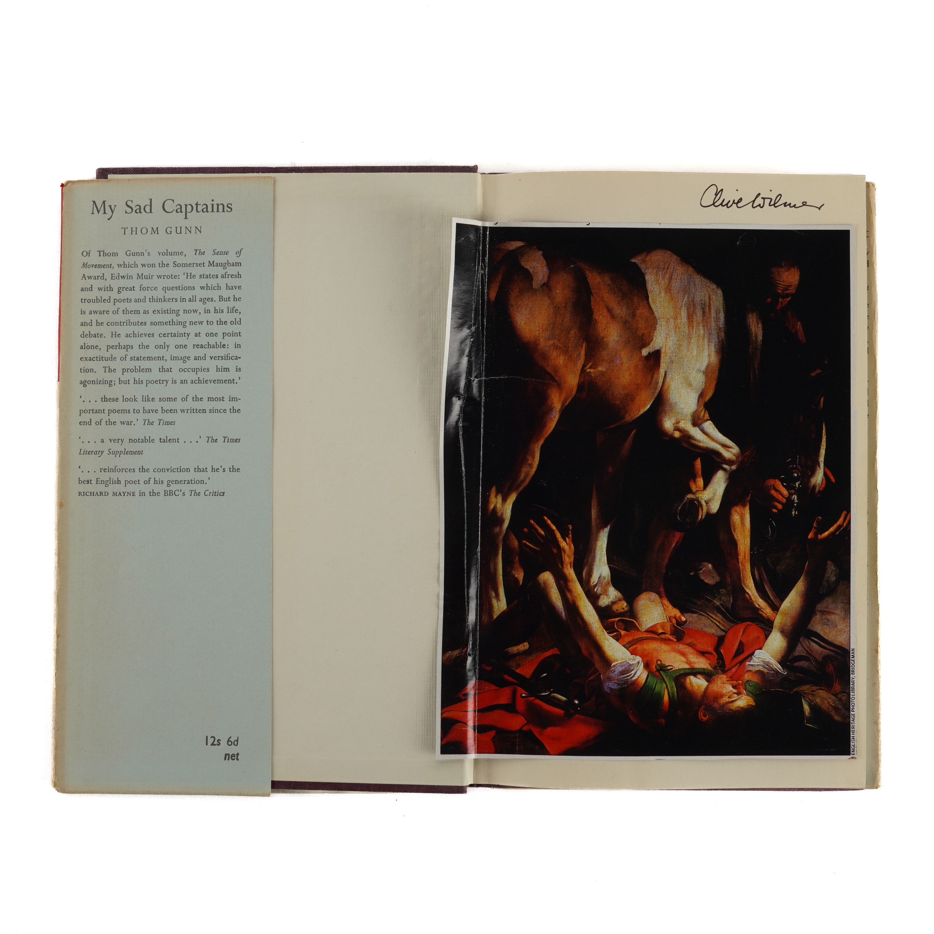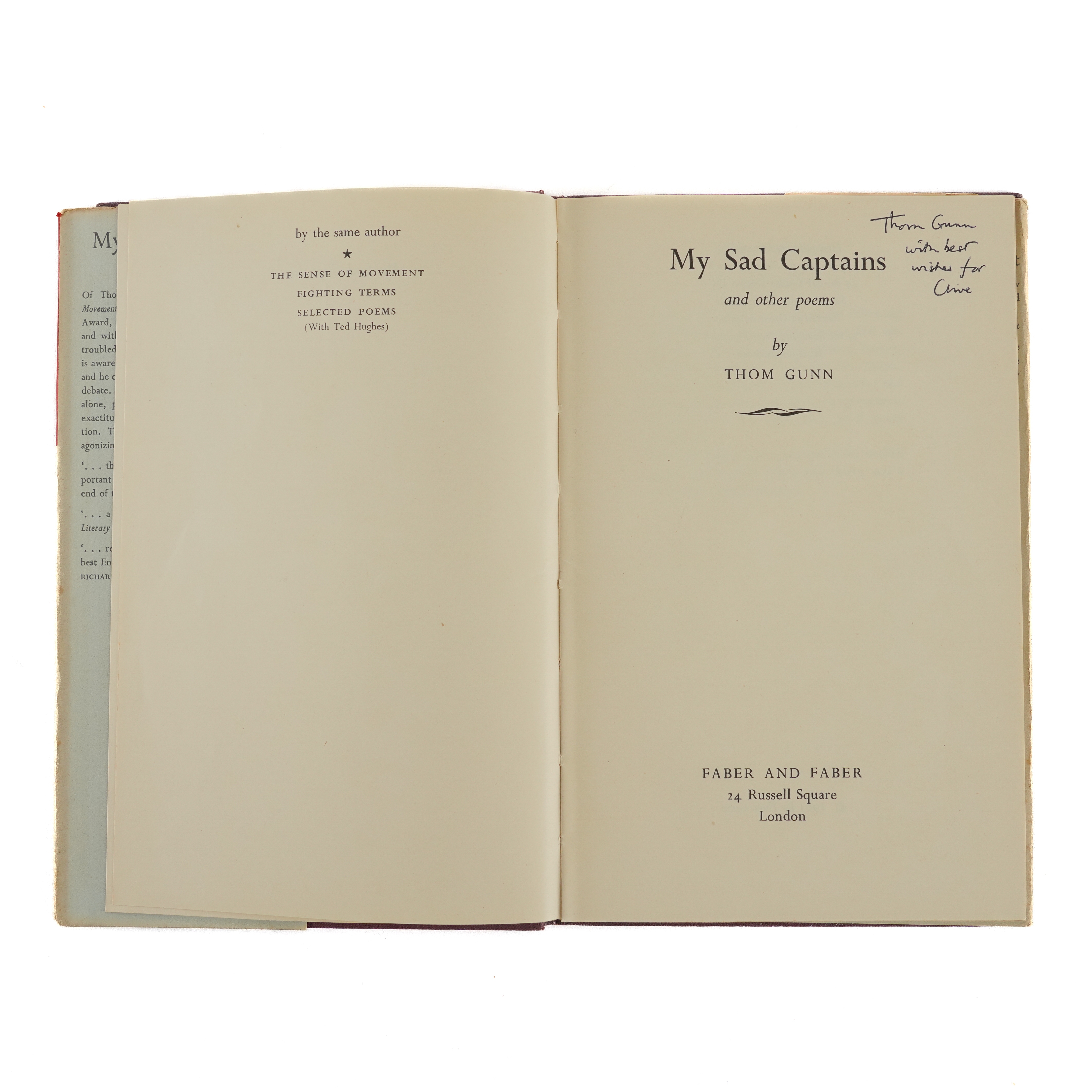 GUNN, Thom (1929-2004). My Sad Captains and other poems. London: Faber and Faber, 1962. 8vo (217 x 140mm). Half title. Original purple cloth, the spine lettered in gilt, dust-jacket with the price of 12s 6d. unclipped (the jacket with a few short tears and very slight loss at the corners). Provenance: Clive Wilmer (signature on the front free endpaper); a few pencil notes by the same. FIRST EDITION, second impression, PRESENTATION COPY, inscribed on the title page, "Thom Gunn, with best wishes for Clive." A modern reproduction of Caravaggio's "Conversion on the Way to Damascus" is pasted onto the front free endpaper, the painting which forms the subject matter of the opening poem of the collection, "In Santa Maria Del Popolo." With 5 other books by Thom Gunn, namely, Fighting Terms (London, 1962, original cloth, dust-jacket, reprint based on the 1954 original with a printed note on the verso of the title stating: "This edition with revisions first published in 1962"), The Sense of Movement (London, 1963, original cloth, dust-jacket, third impression), Touch (London, 1967, original cloth, dust-jacket, FIRST EDITION), Moly (London, 1971, original cloth, dust-jacket, FIRST EDITION, with a newspaper photograph of the poet pasted onto the front free endpaper) and Jack Straw's Castle (London, 1976, original cloth, dust-jacket), ALL SIGNED BY THOM GUNN on the title pages. "[Thom Gunn's] celebration of men of action (soldiers, motorcyclists, tough boys), his fascination with violence, his gallery of heroes (who range from Elvis Presley to Caravaggio), together with his predominantly low-key, rational, laconic, colloquial manner provide an interesting synthesis of the English Movement and the romantic elements of American Beat Poetry" (The Oxford Companion to English Literature, ed. Drabble, 1985). Provenance: From the Collection of Clive Wilmer (1945-2025; please see lot 418 for further biographical information about Clive Wilmer, in particular the section relating to Thom Gunn, with whom Clive Wilmer, a distinguished poet himself, maintained an enduring friendship over forty years). (6)