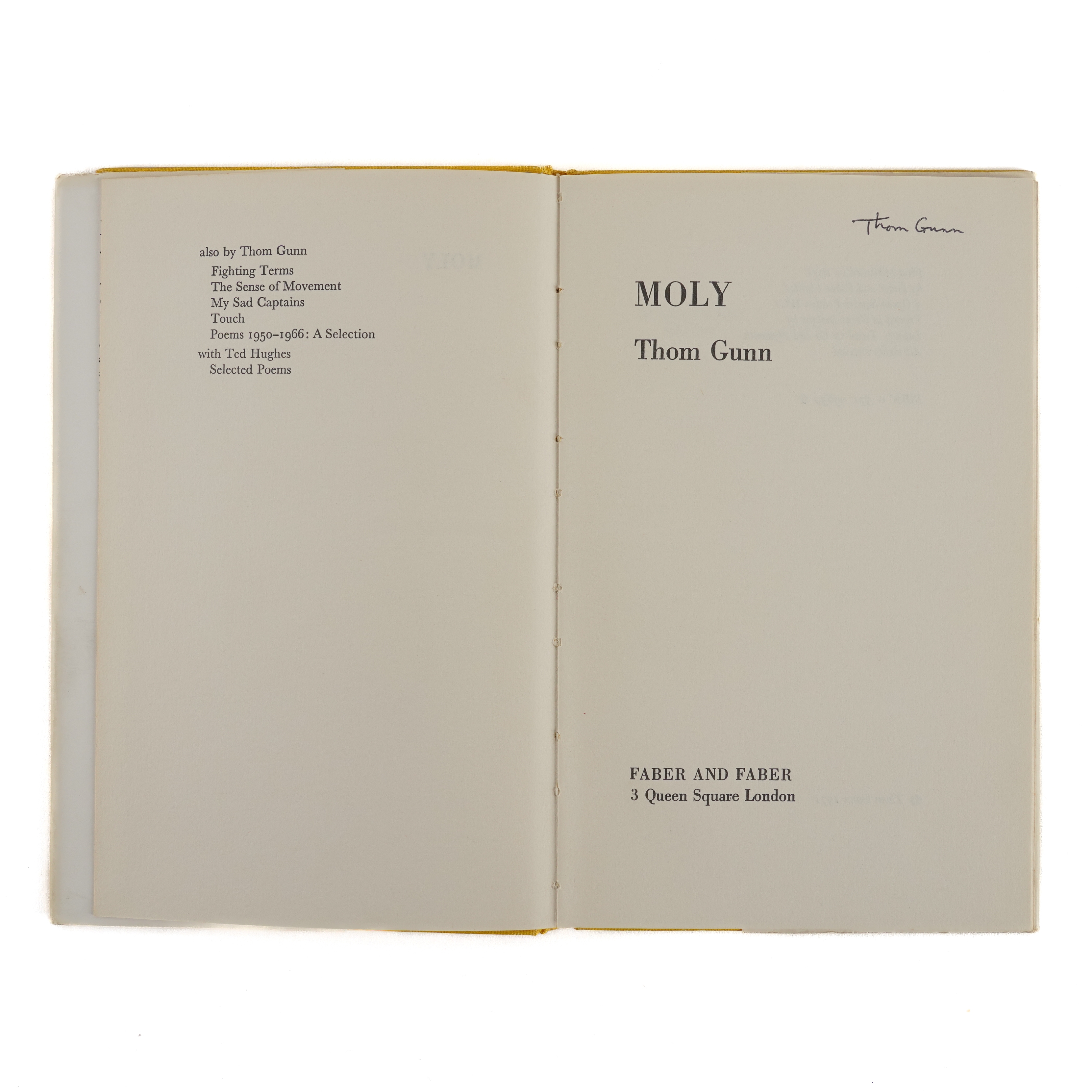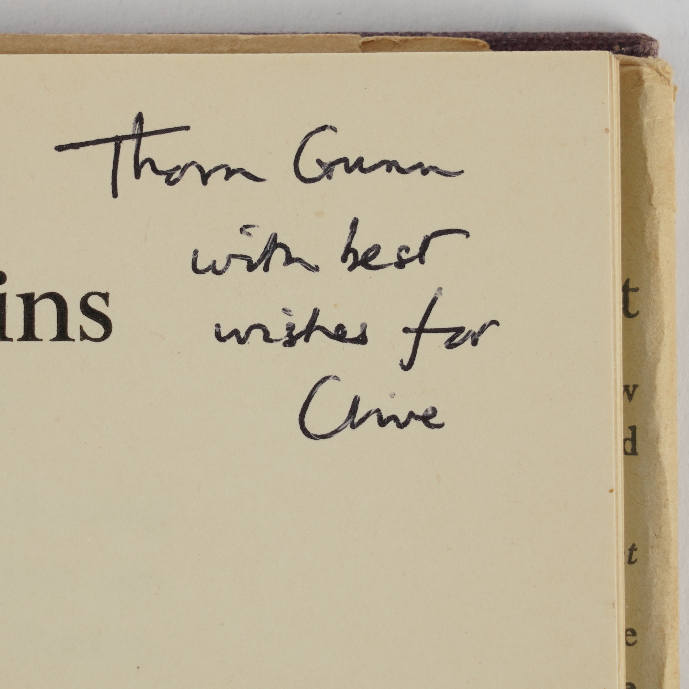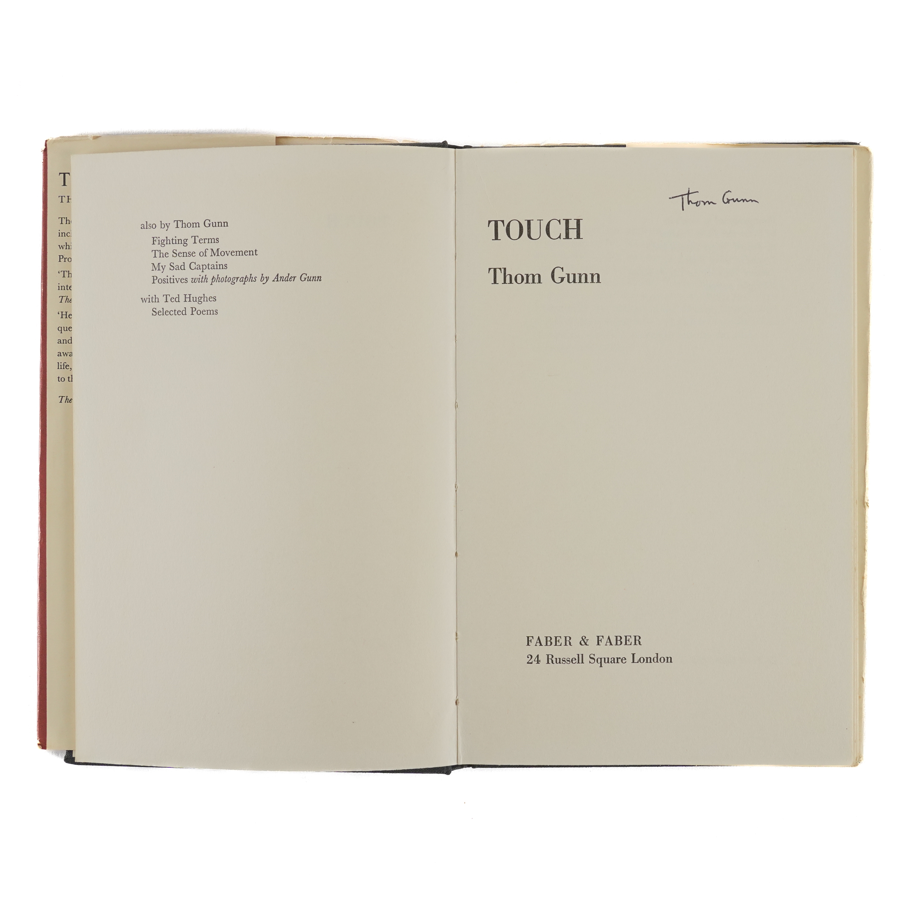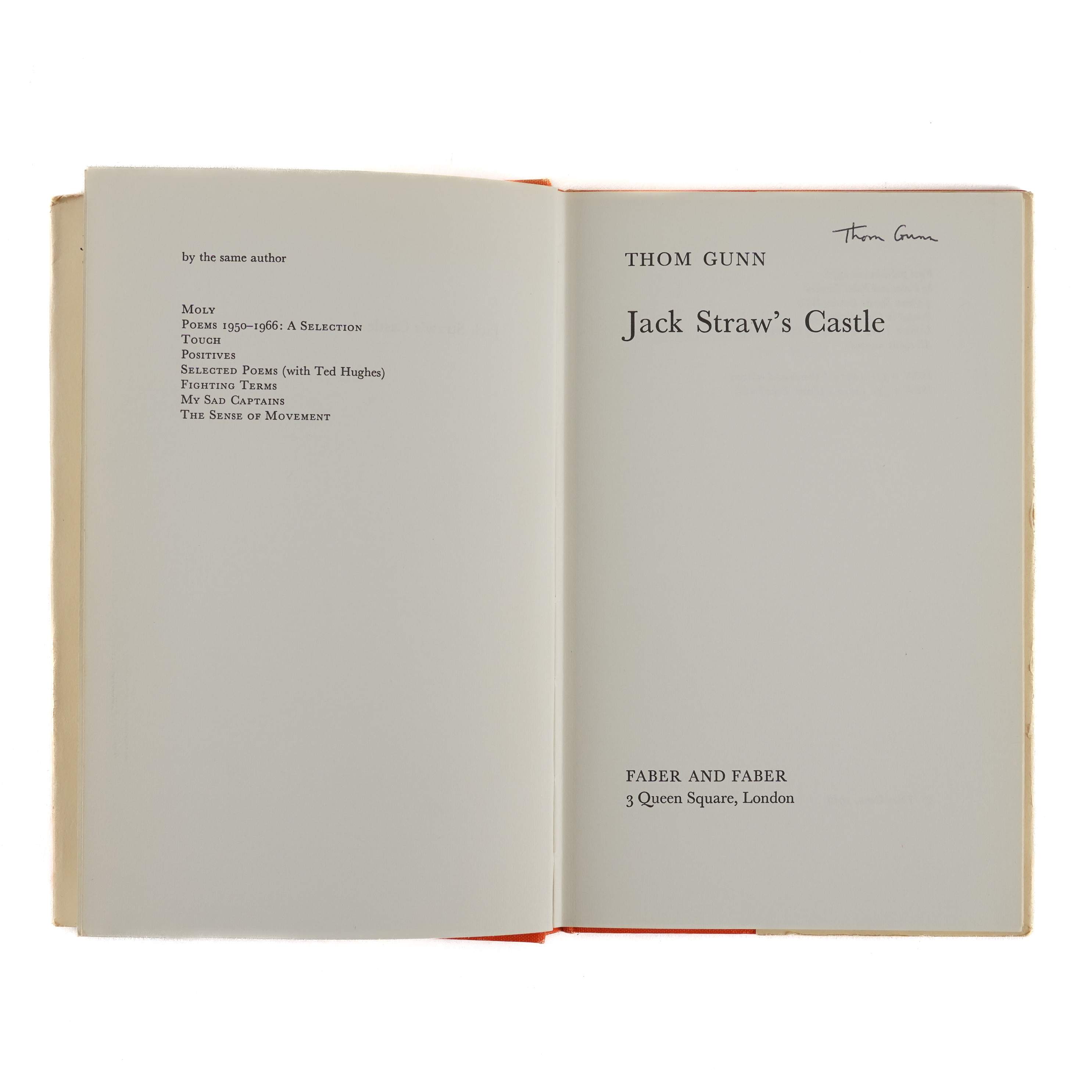 GUNN, Thom (1929-2004). My Sad Captains and other poems. London: Faber and Faber, 1962. 8vo (217 x 140mm). Half title. Original purple cloth, the spine lettered in gilt, dust-jacket with the price of 12s 6d. unclipped (the jacket with a few short tears and very slight loss at the corners). Provenance: Clive Wilmer (signature on the front free endpaper); a few pencil notes by the same. FIRST EDITION, second impression, PRESENTATION COPY, inscribed on the title page, "Thom Gunn, with best wishes for Clive." A modern reproduction of Caravaggio's "Conversion on the Way to Damascus" is pasted onto the front free endpaper, the painting which forms the subject matter of the opening poem of the collection, "In Santa Maria Del Popolo." With 5 other books by Thom Gunn, namely, Fighting Terms (London, 1962, original cloth, dust-jacket, reprint based on the 1954 original with a printed note on the verso of the title stating: "This edition with revisions first published in 1962"), The Sense of Movement (London, 1963, original cloth, dust-jacket, third impression), Touch (London, 1967, original cloth, dust-jacket, FIRST EDITION), Moly (London, 1971, original cloth, dust-jacket, FIRST EDITION, with a newspaper photograph of the poet pasted onto the front free endpaper) and Jack Straw's Castle (London, 1976, original cloth, dust-jacket), ALL SIGNED BY THOM GUNN on the title pages. "[Thom Gunn's] celebration of men of action (soldiers, motorcyclists, tough boys), his fascination with violence, his gallery of heroes (who range from Elvis Presley to Caravaggio), together with his predominantly low-key, rational, laconic, colloquial manner provide an interesting synthesis of the English Movement and the romantic elements of American Beat Poetry" (The Oxford Companion to English Literature, ed. Drabble, 1985). Provenance: From the Collection of Clive Wilmer (1945-2025; please see lot 418 for further biographical information about Clive Wilmer, in particular the section relating to Thom Gunn, with whom Clive Wilmer, a distinguished poet himself, maintained an enduring friendship over forty years). (6)