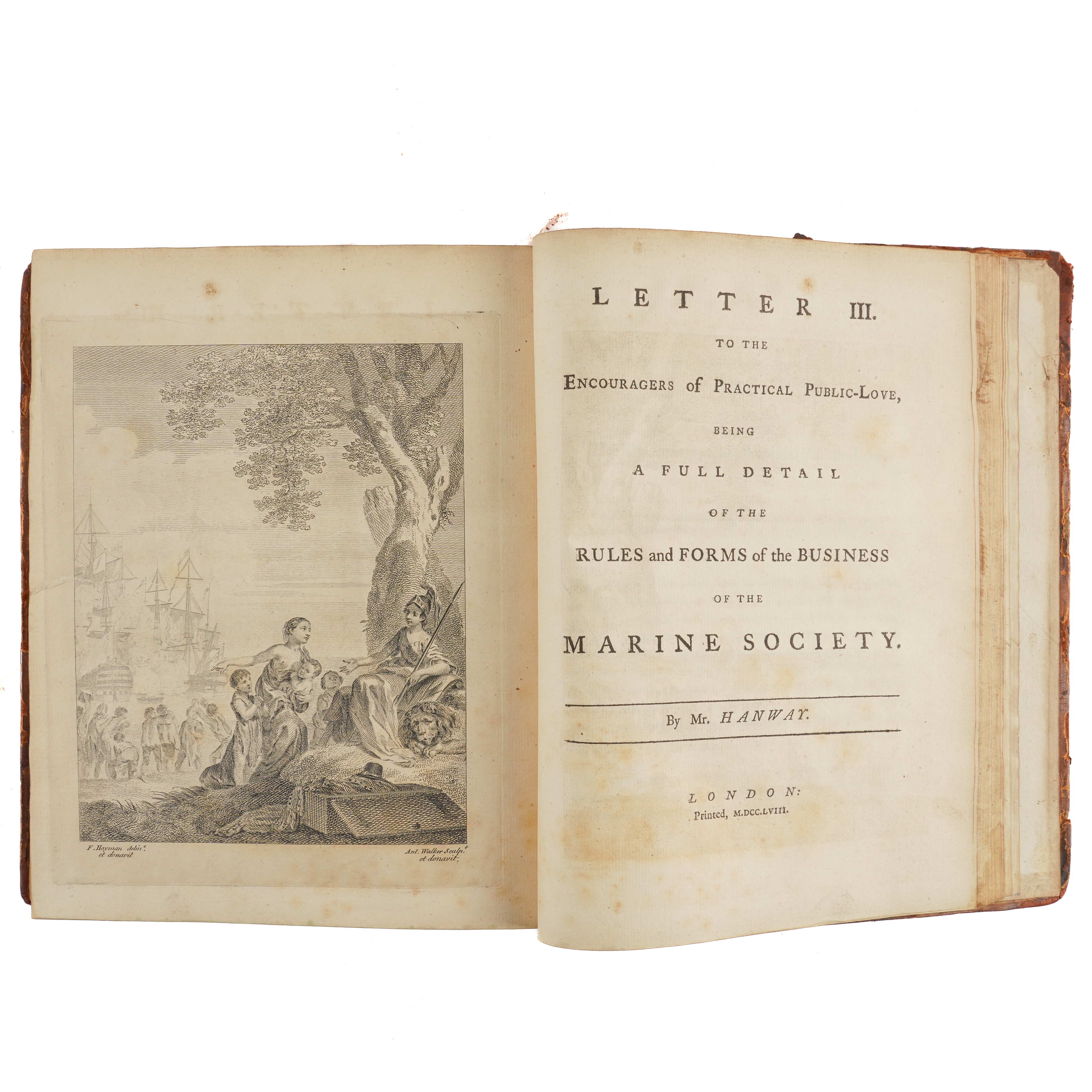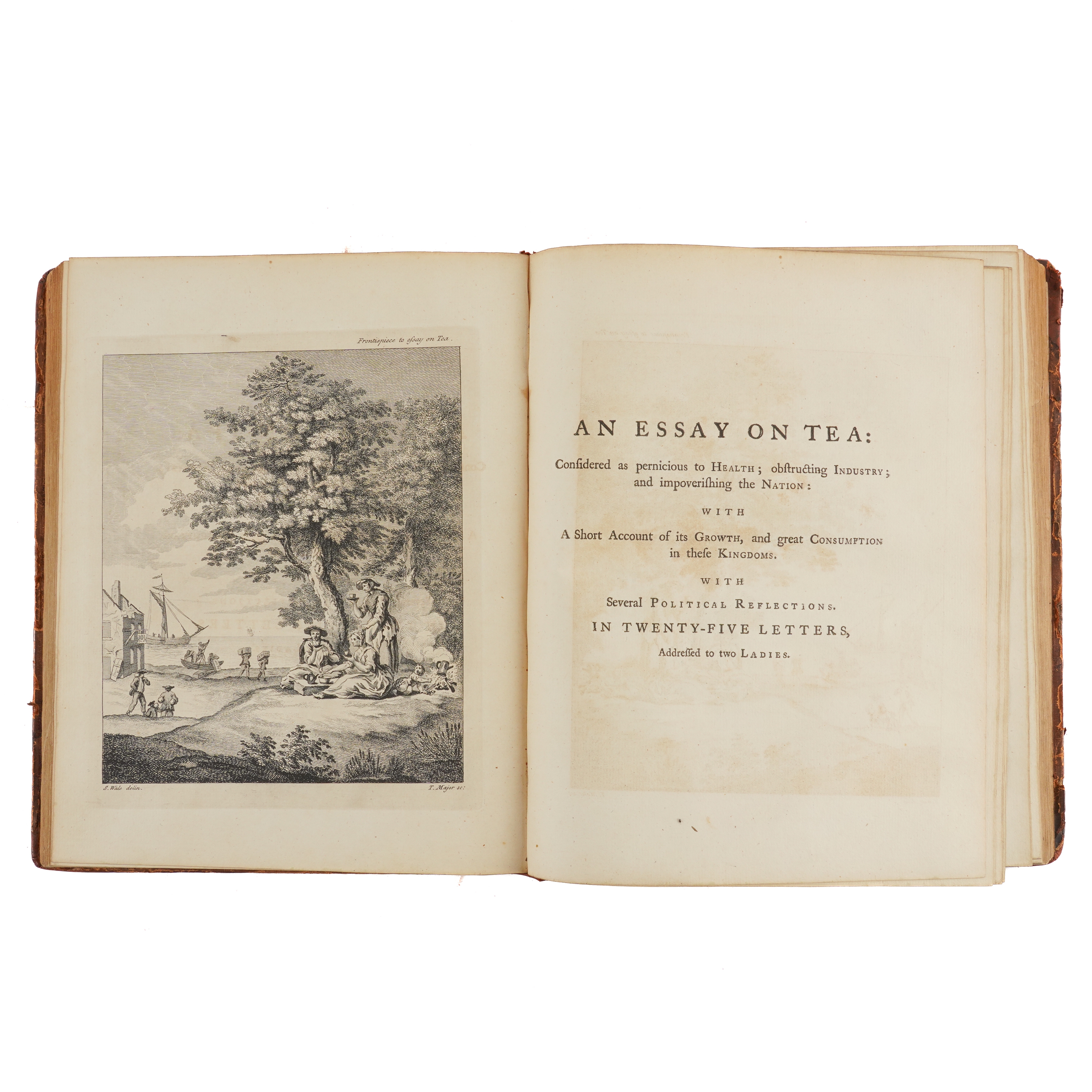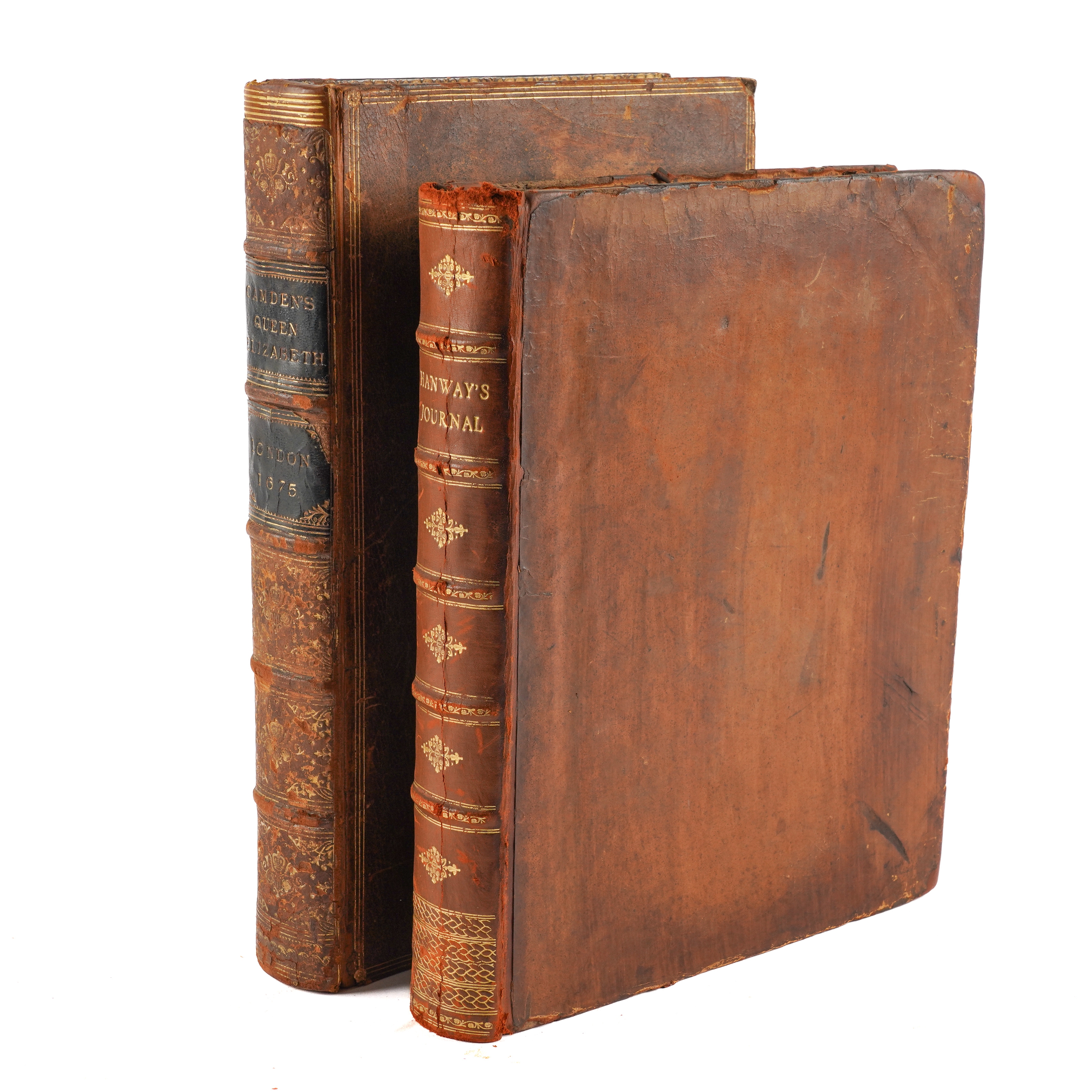[HANWAY, Jonas (1712-86)]. A Journal of Eight Days Journey from Portsmouth to Kingston upon Thames; through Southampton, Wiltshire, &c. with Miscellaneous Thoughts, Moral and Religious; In a Series of Sixty-Four Letters: Addressed to two Ladies of the Partie. To which is added, to An Essay on Tea, Considered as Pernicious to Health, Obstructing Industry, and Impoverishing the Nation: With an Account of its Growth, and great Consumption in these Kingdoms. With Several Political Reflections; and Thoughts on Public Love. In Twenty-Five Letters to the same Ladies. By a Gentleman of the Partie. London: Printed by H. Woodfall, 1756-58. 4to (264 x 210mm). Engraved frontispiece, and 3 further engraved plates or "frontispieces", one engraved illustration, one sectional title page printed in red and black (some plates offset onto text, some leaves lightly stained and/or browned). Contemporary speckled calf (recornered and rebacked with modern old-style spine, rubbed and scuffed). Provenance: John Cornwall (armorial bookplate); "London 28 Feb. 1756" (inscription of that date at the foot of p.361). FIRST EDITION of this eclectic travelogue which, in addition to describing the folklore and topography en route - including, notably, Stonehenge ("the St. Paul's of the Druids") - also includes a diatribe against the iniquities of drinking tea, an unusual form of temperance; furthermore, it includes three letters on the subject of the "Marine Society", founded by the author in 1756, the first of which is titled, "On Occasion of their clothing for the Sea 3097 Men, and 2045 Boys ...." Cox I, p.19; Gibson's Library p.144; Goldsmiths'-Kress 9083. With 3 other miscellaneous works in 5 volumes, namely William Camden's The History of the most Renowned and Victorious Princess Elizabeth, Late Queen of England ... The Third Edition (London, 1675, folio, engraved frontispiece portrait, contemporary speckled calf, yellow edges, rubbed, rebacked preserving old worn spine, later endpapers), James Cook's A Voyage towards the South Pole and Round the World (London, 1777, 2 volumes., 4to, LACKING ALL THE PLATES except for the portrait frontispiece in the first volume, contemporary calf, repaired) and Thomas Bewick's History of British Birds (Newcastle, 1797-1804, 2 volumes, large 8vo (230 x 140mm), wood-engraved illustrations by Bewick, contemporary calf, rebacked, FIRST EDITION, on - according to a pencil note on the endpaper - "large paper"). (6)