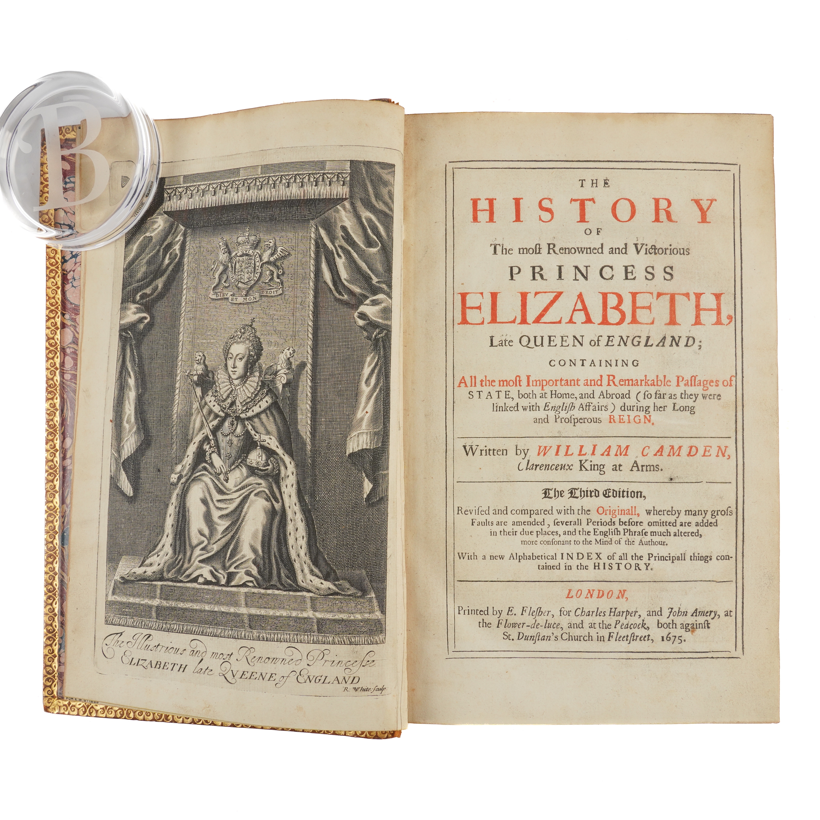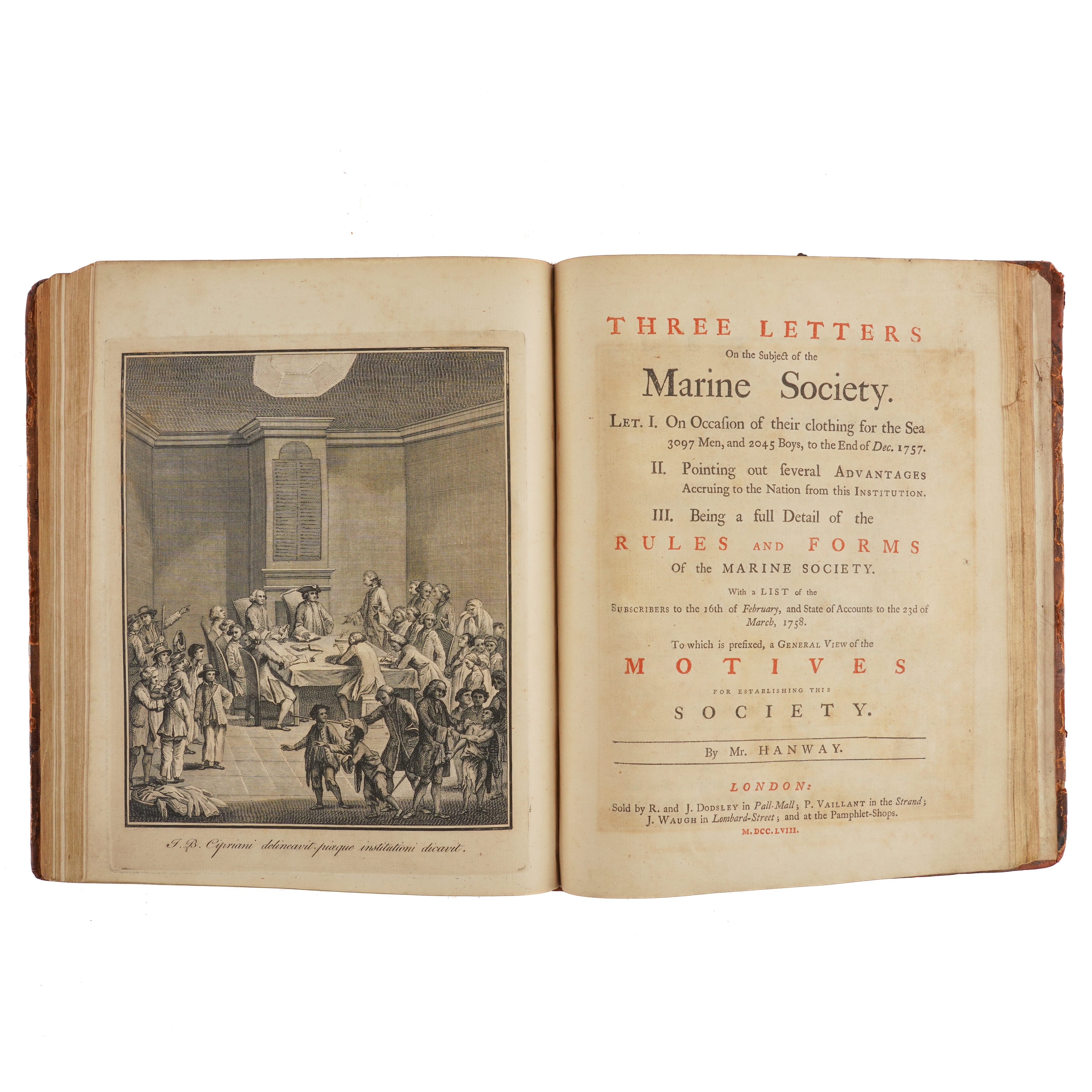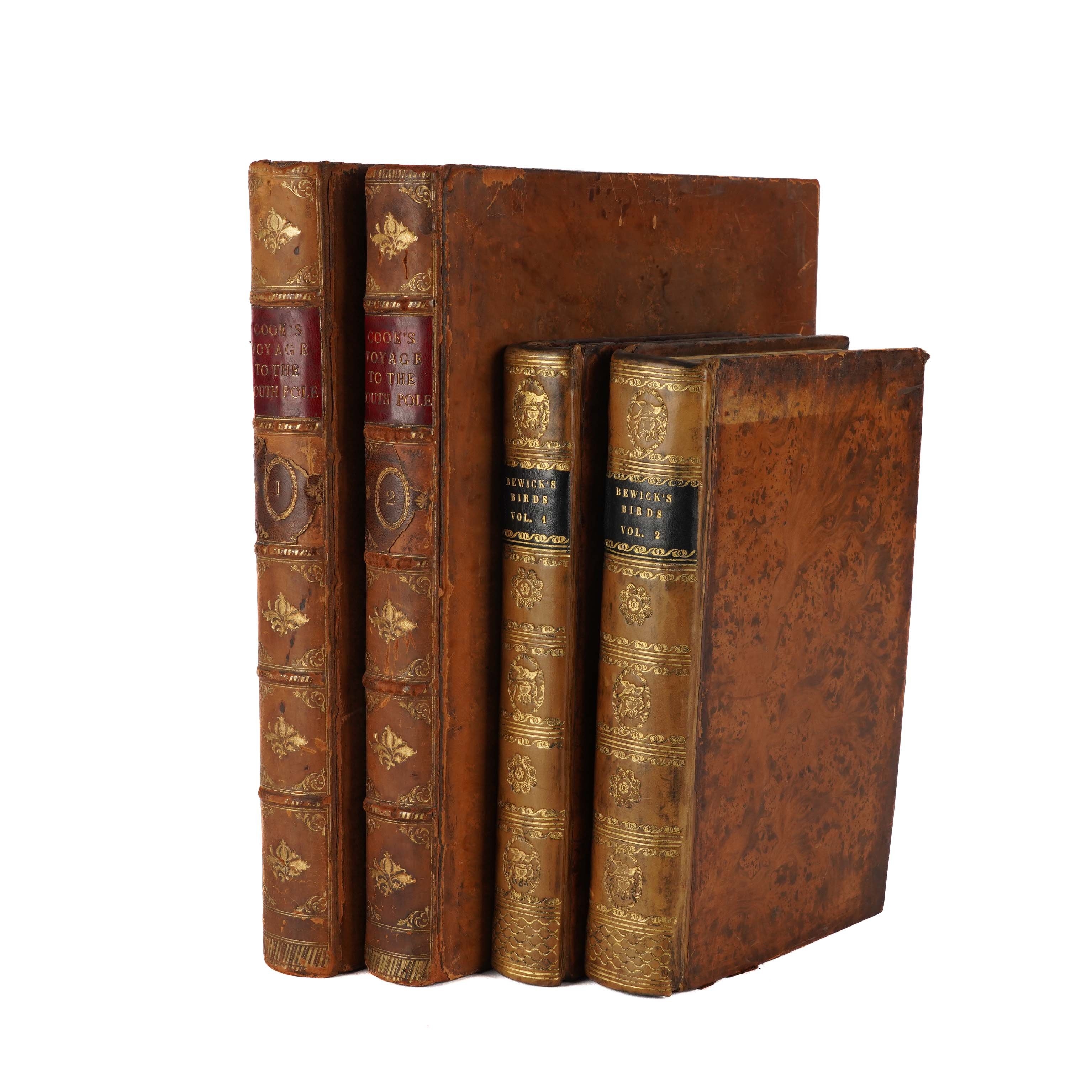 [HANWAY, Jonas (1712-86)]. A Journal of Eight Days Journey from Portsmouth to Kingston upon Thames; through Southampton, Wiltshire, &c. with Miscellaneous Thoughts, Moral and Religious; In a Series of Sixty-Four Letters: Addressed to two Ladies of the Partie. To which is added, to An Essay on Tea, Considered as Pernicious to Health, Obstructing Industry, and Impoverishing the Nation: With an Account of its Growth, and great Consumption in these Kingdoms. With Several Political Reflections; and Thoughts on Public Love. In Twenty-Five Letters to the same Ladies. By a Gentleman of the Partie. London: Printed by H. Woodfall, 1756-58. 4to (264 x 210mm). Engraved frontispiece, and 3 further engraved plates or "frontispieces", one engraved illustration, one sectional title page printed in red and black (some plates offset onto text, some leaves lightly stained and/or browned). Contemporary speckled calf (recornered and rebacked with modern old-style spine, rubbed and scuffed). Provenance: John Cornwall (armorial bookplate); "London 28 Feb. 1756" (inscription of that date at the foot of p.361). FIRST EDITION of this eclectic travelogue which, in addition to describing the folklore and topography en route - including, notably, Stonehenge ("the St. Paul's of the Druids") - also includes a diatribe against the iniquities of drinking tea, an unusual form of temperance; furthermore, it includes three letters on the subject of the "Marine Society", founded by the author in 1756, the first of which is titled, "On Occasion of their clothing for the Sea 3097 Men, and 2045 Boys ...." Cox I, p.19; Gibson's Library p.144; Goldsmiths'-Kress 9083. With 3 other miscellaneous works in 5 volumes, namely William Camden's The History of the most Renowned and Victorious Princess Elizabeth, Late Queen of England ... The Third Edition (London, 1675, folio, engraved frontispiece portrait, contemporary speckled calf, yellow edges, rubbed, rebacked preserving old worn spine, later endpapers), James Cook's A Voyage towards the South Pole and Round the World (London, 1777, 2 volumes., 4to, LACKING ALL THE PLATES except for the portrait frontispiece in the first volume, contemporary calf, repaired) and Thomas Bewick's History of British Birds (Newcastle, 1797-1804, 2 volumes, large 8vo (230 x 140mm), wood-engraved illustrations by Bewick, contemporary calf, rebacked, FIRST EDITION, on - according to a pencil note on the endpaper - "large paper"). (6)