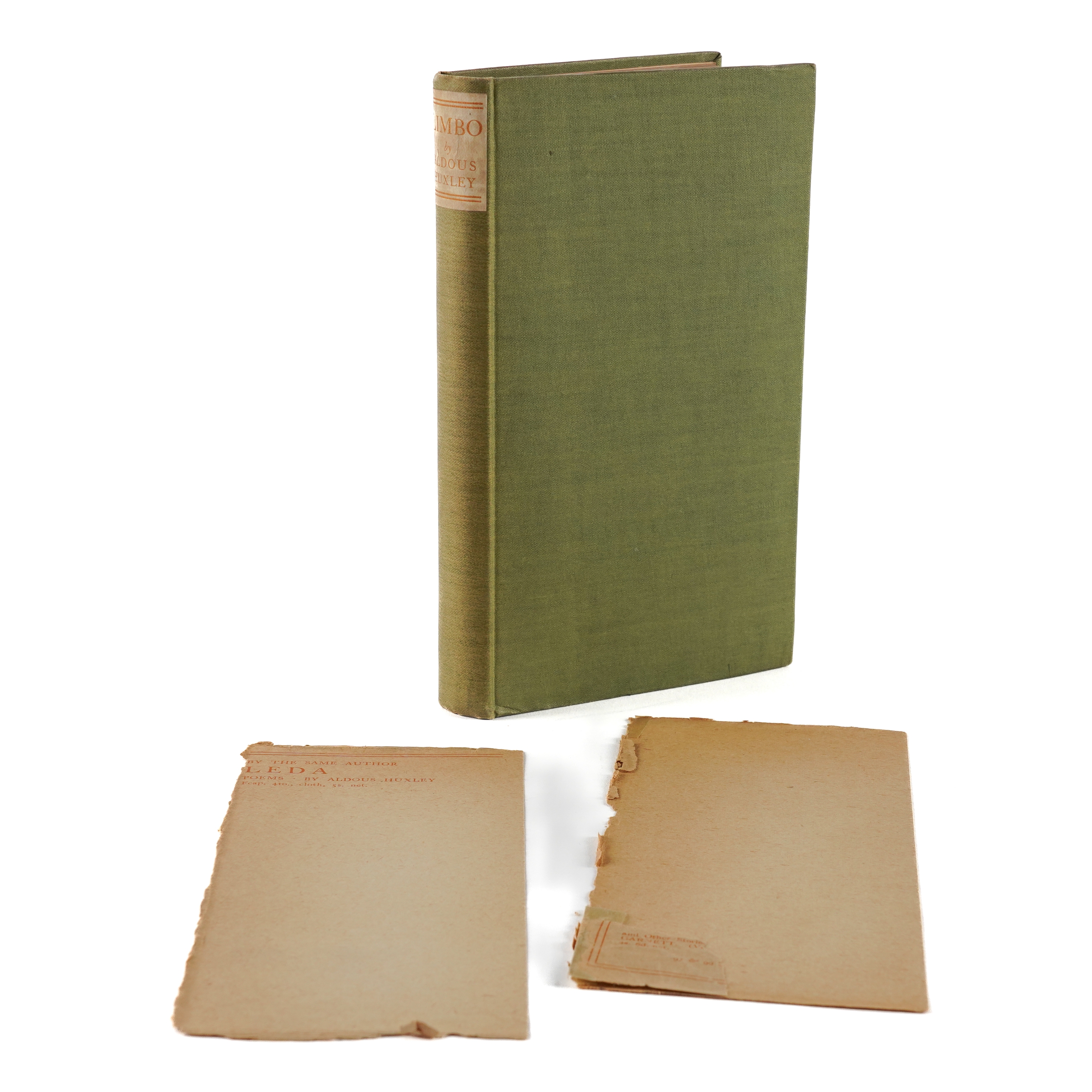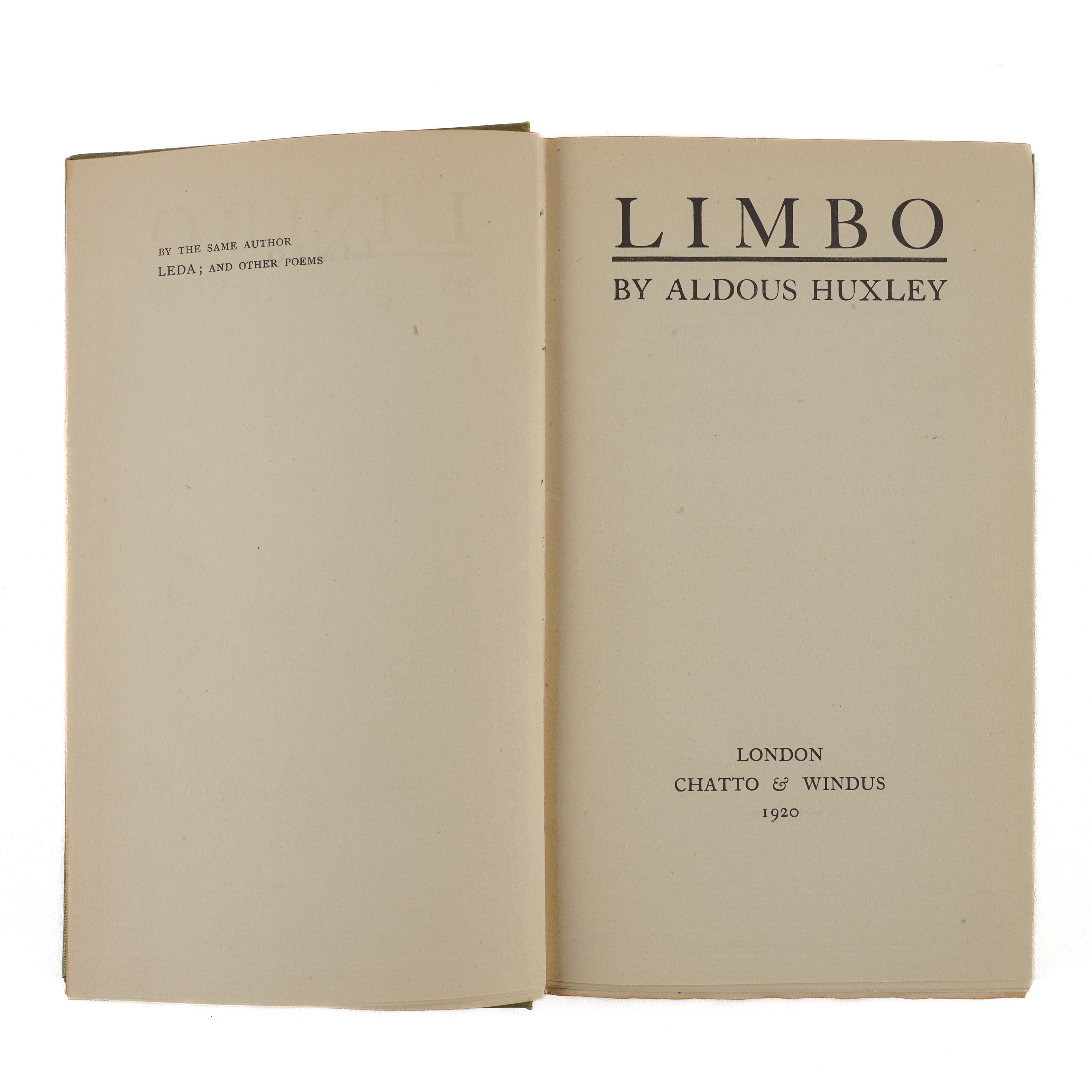 HUXLEY, Aldous (1894-1963). Limbo. London: Chatto & Windus, 1920. 8vo (190 x 110mm). Half title. Original green buckram, the spine with paper label printed in orange, with 2 fragments of the dust-jacket (the turn-ins?). A FINE COPY OF THE FIRST EDITION OF THE AUTHOR'S FIRST PUBLISHED FICTION, which took the form of "novelette", a play and five short stories. Previously, Huxley had only published four collections of poetry. Eschelbach & Shober Aldous Huxley: A Bibliography (1961) 40. RARE.