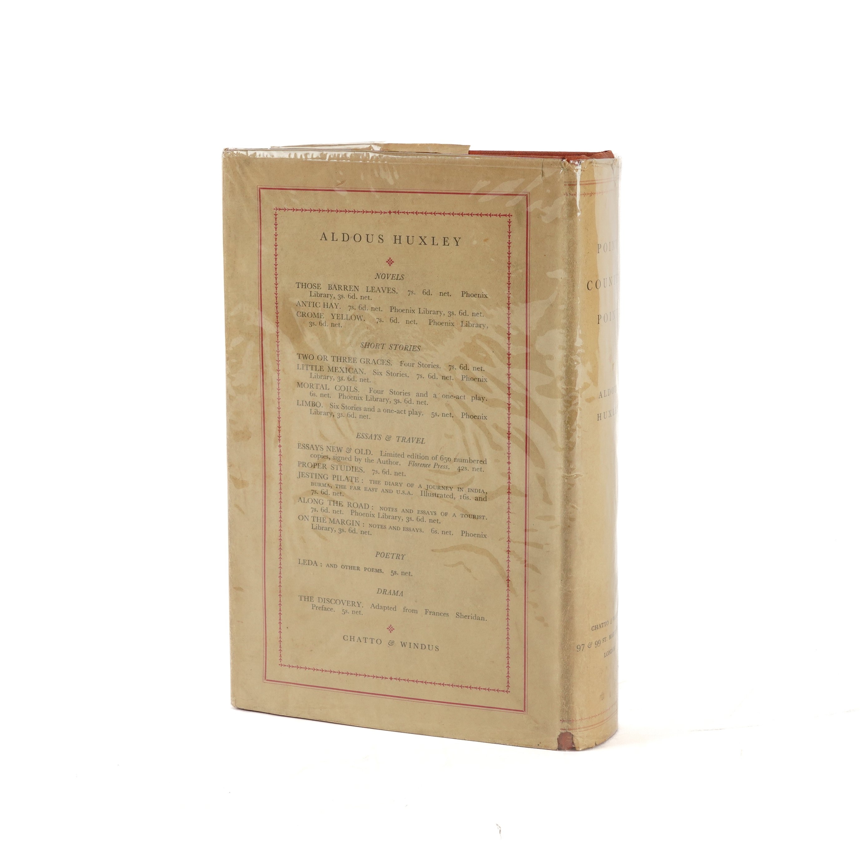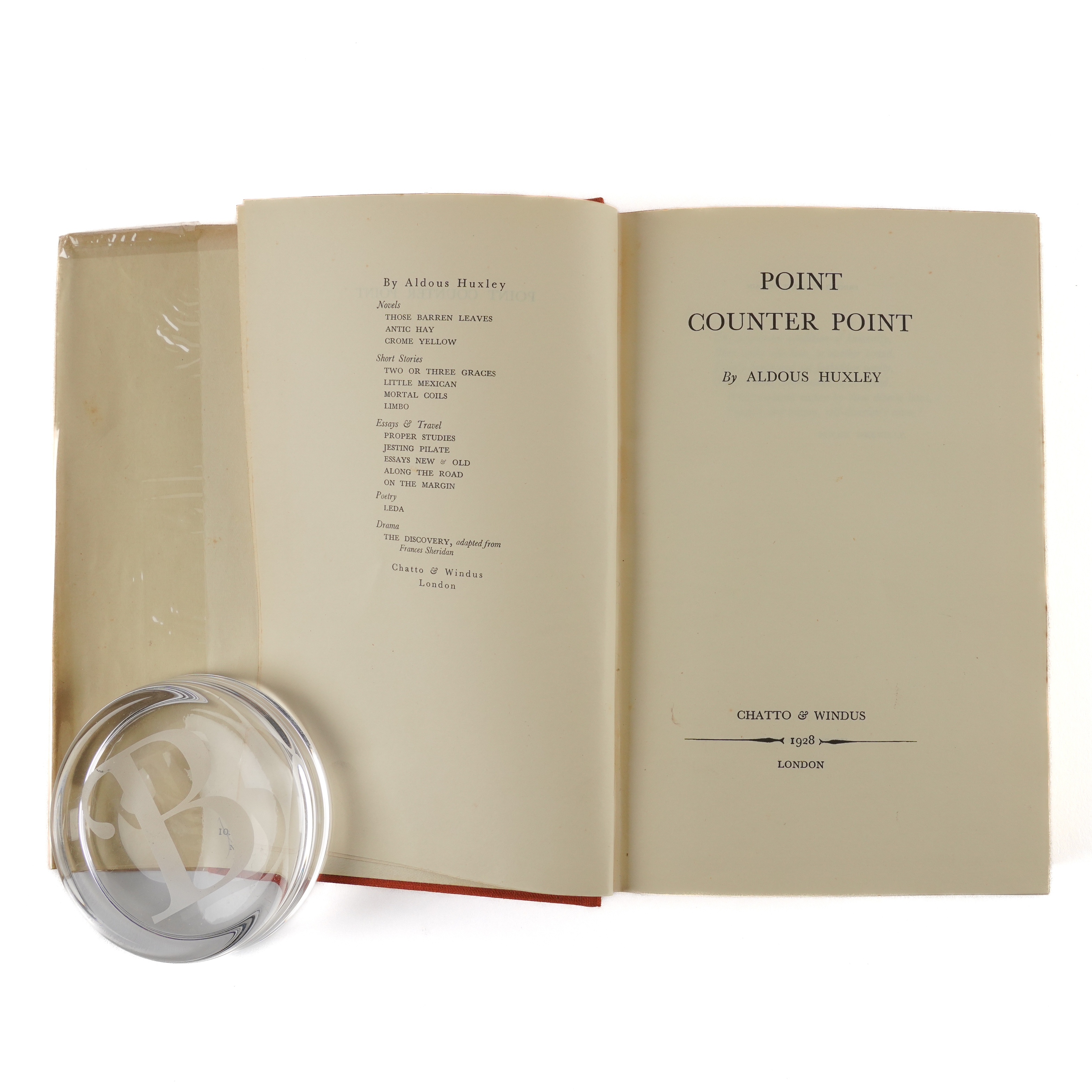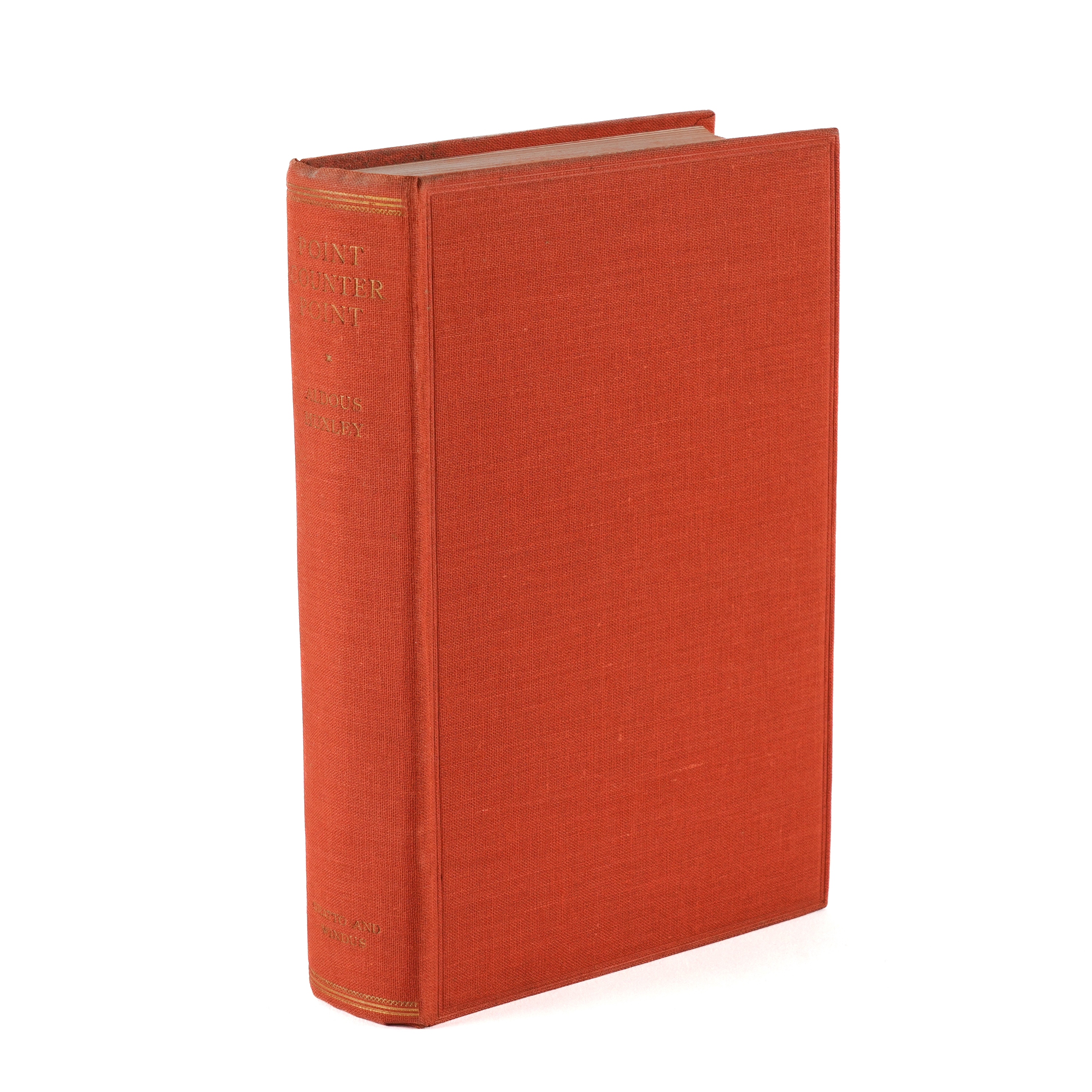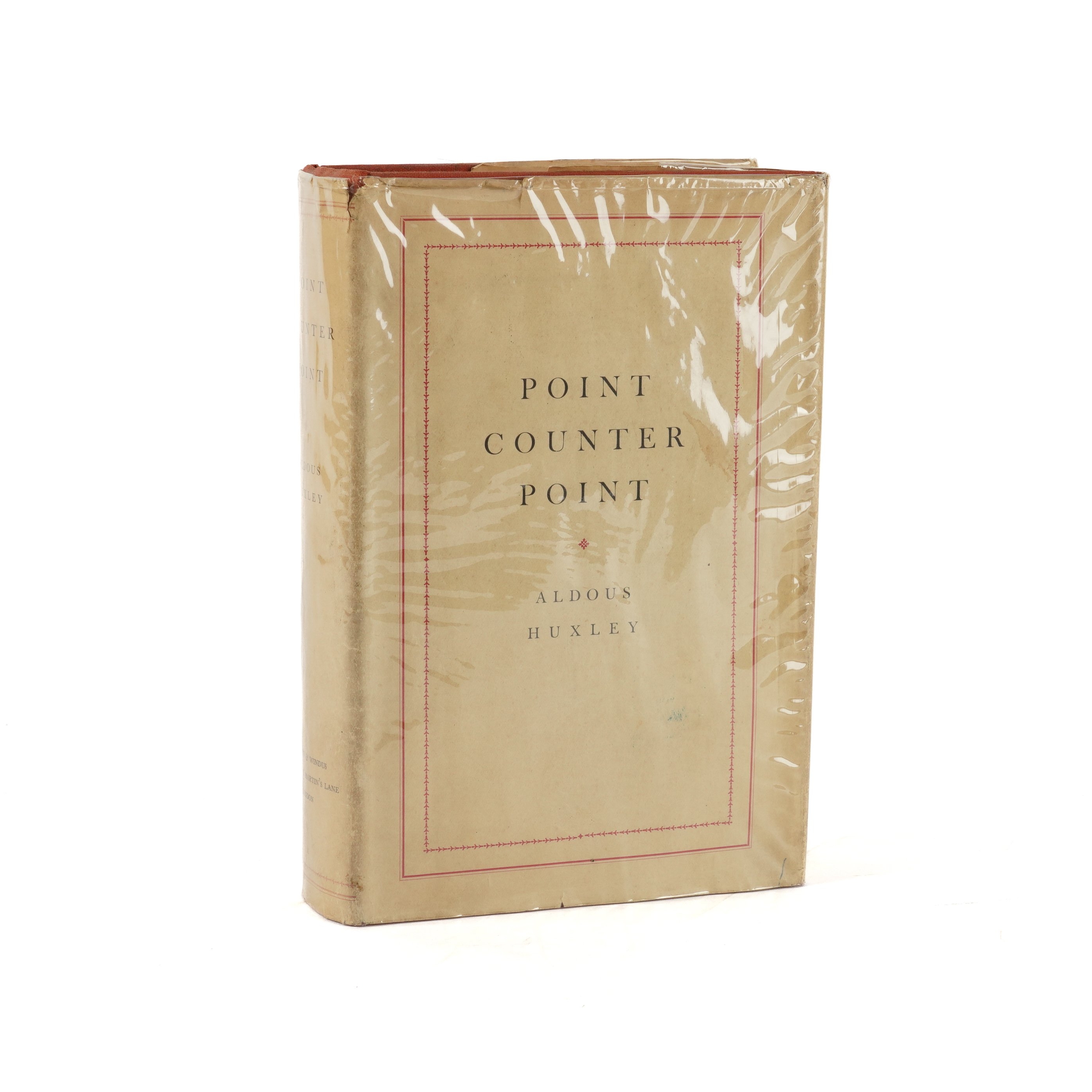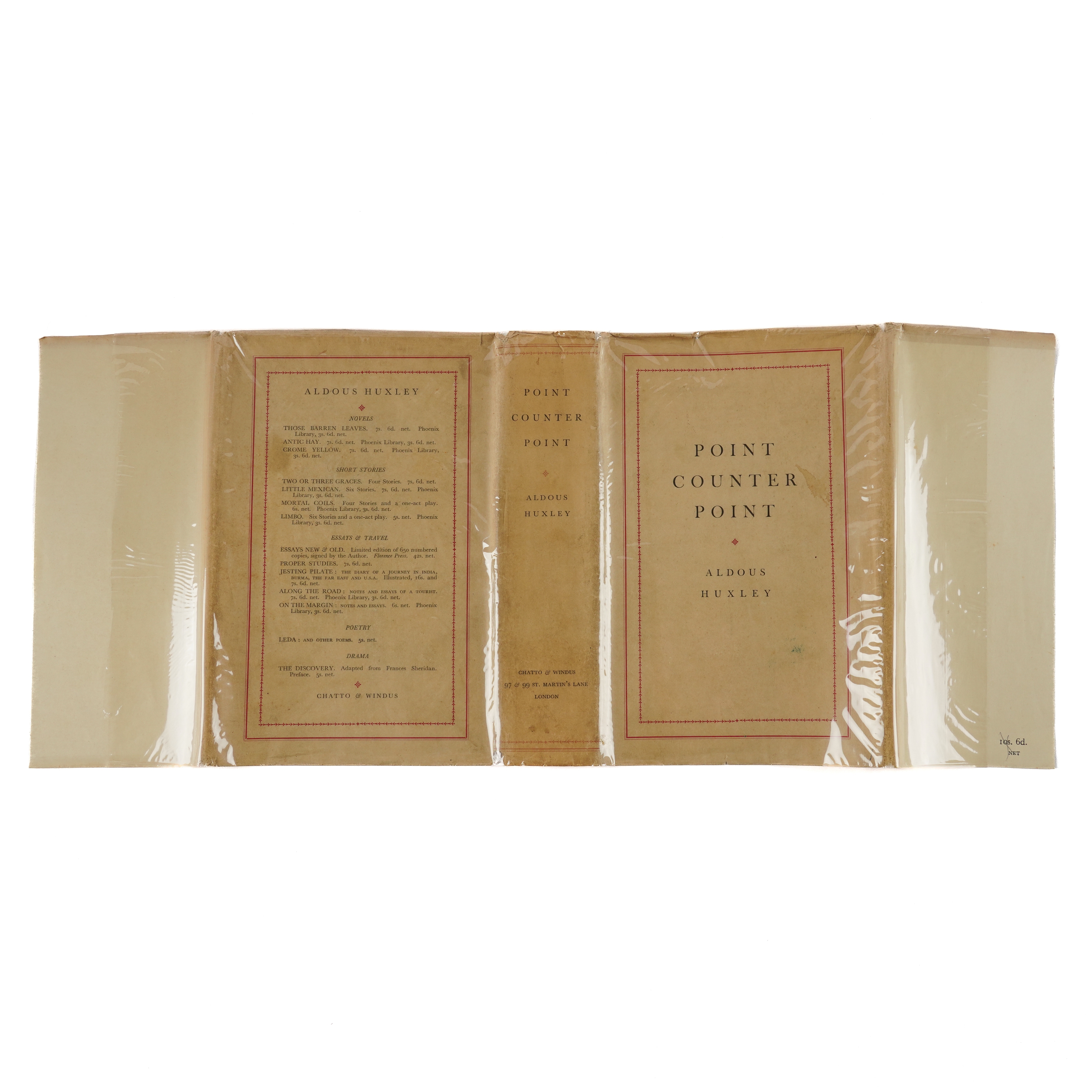 HUXLEY, Aldous (1894-1963). Point Counter Point. London: Chatto & Windus, 1928. 8vo (204 x 135mm). Half title (some light spotting to the first four pages of the text, not affecting the half title or title, occasional light spotting at the edges). Original orange cloth, the spine lettered in gilt, dust-jacket with the price of 10s. 6d. unclipped, top edges red (a few short tears, some light creasing at edges, some very light staining). FIRST EDITION. Please note that the original dust-jacket has been photographed in its modern protective archival Mylar wrapper, thereby avoiding any risk of damage through its temporary removal. Bromer Aun Aprendo: A Comprehensive Bibliography of the Writings of Aldous Leonard Huxley (2011) A18; Eschelbach & Shober Aldous Huxley: A Bibliography (1961) 49.
