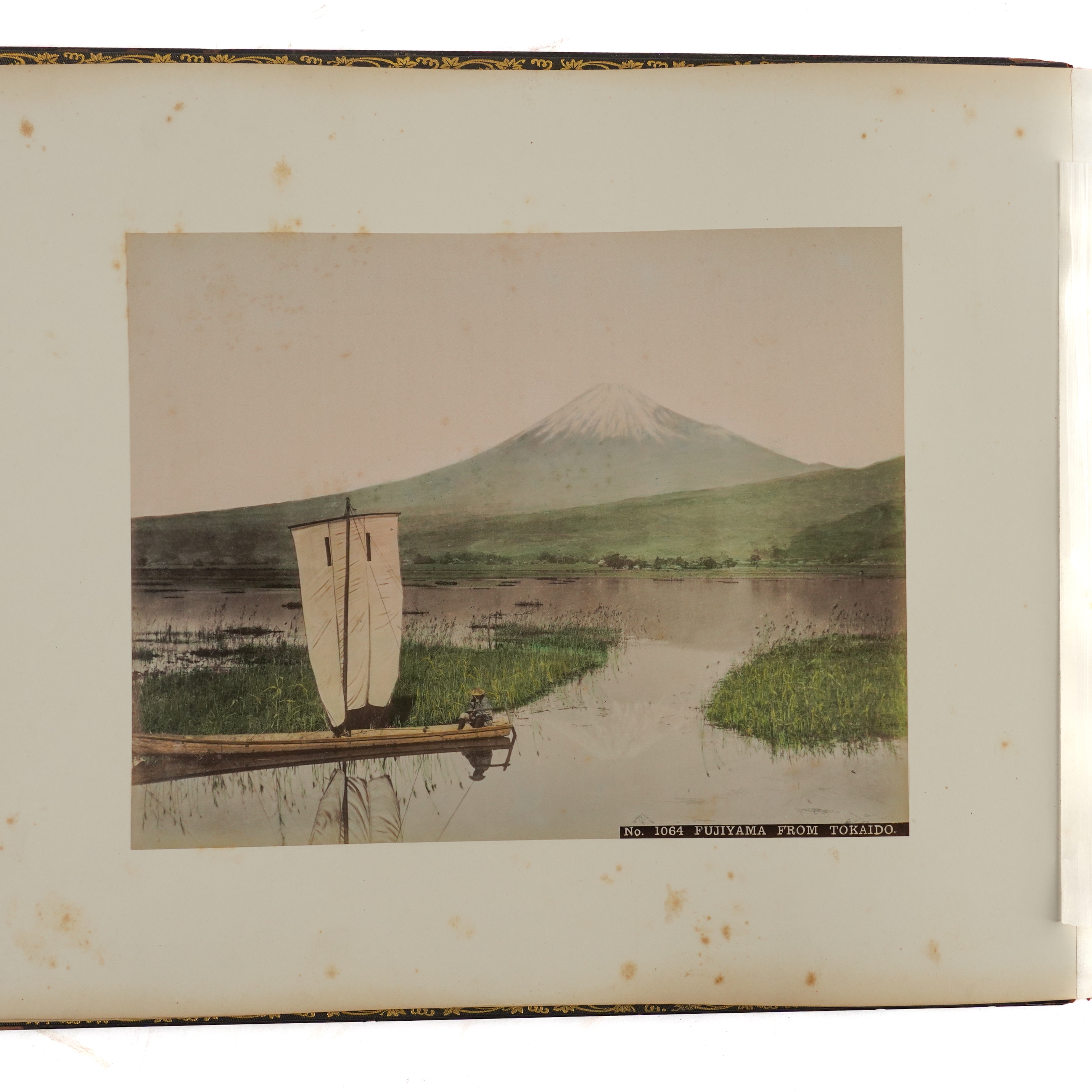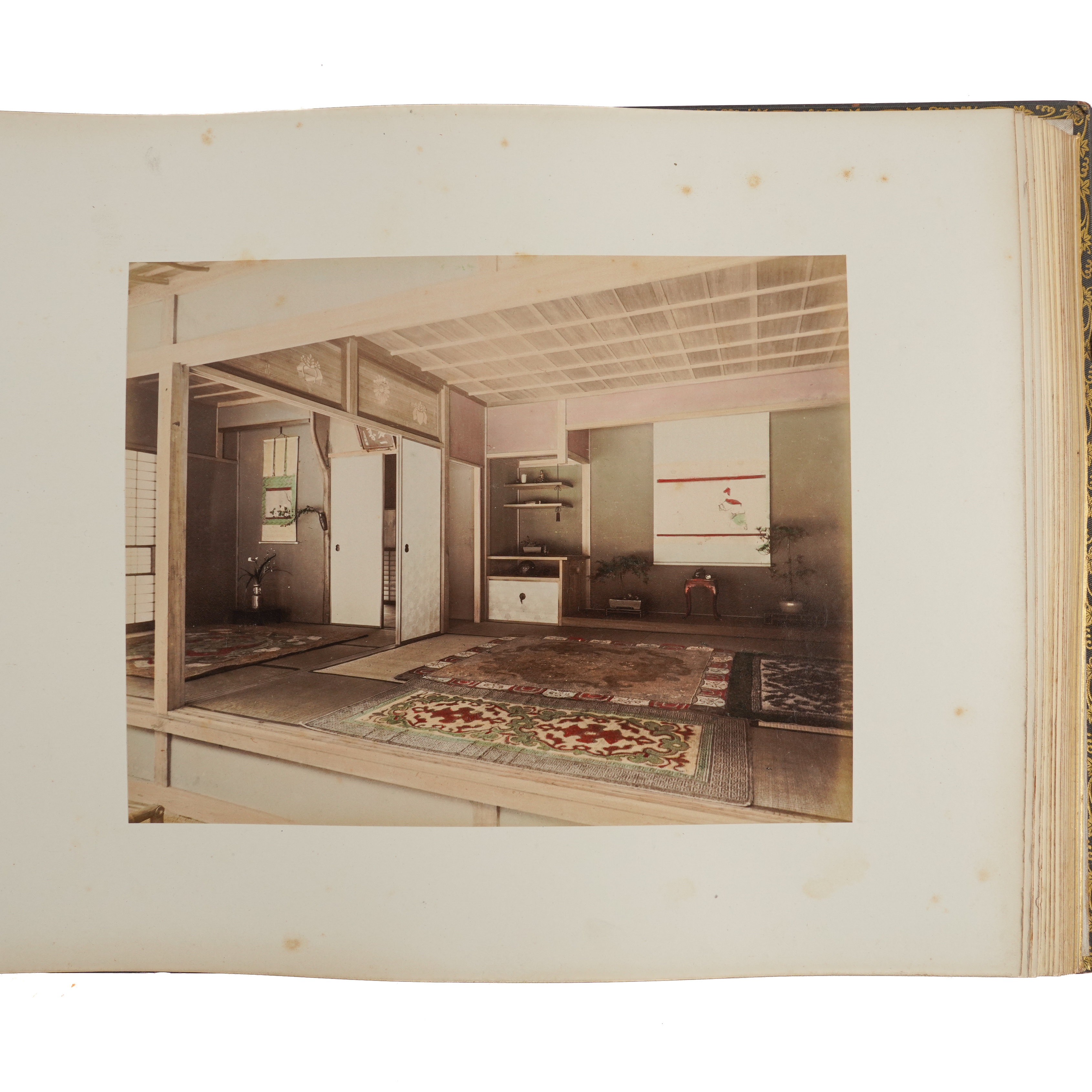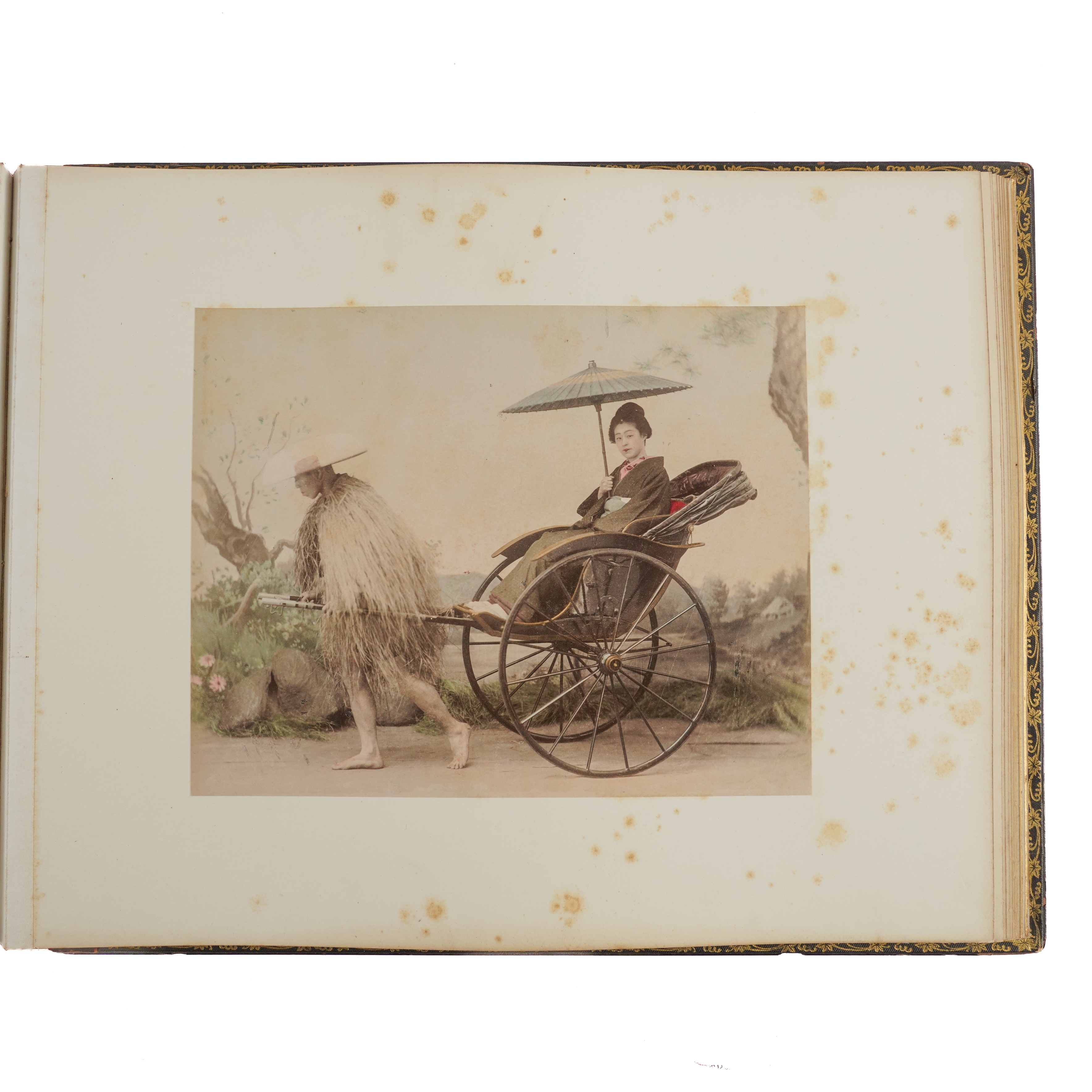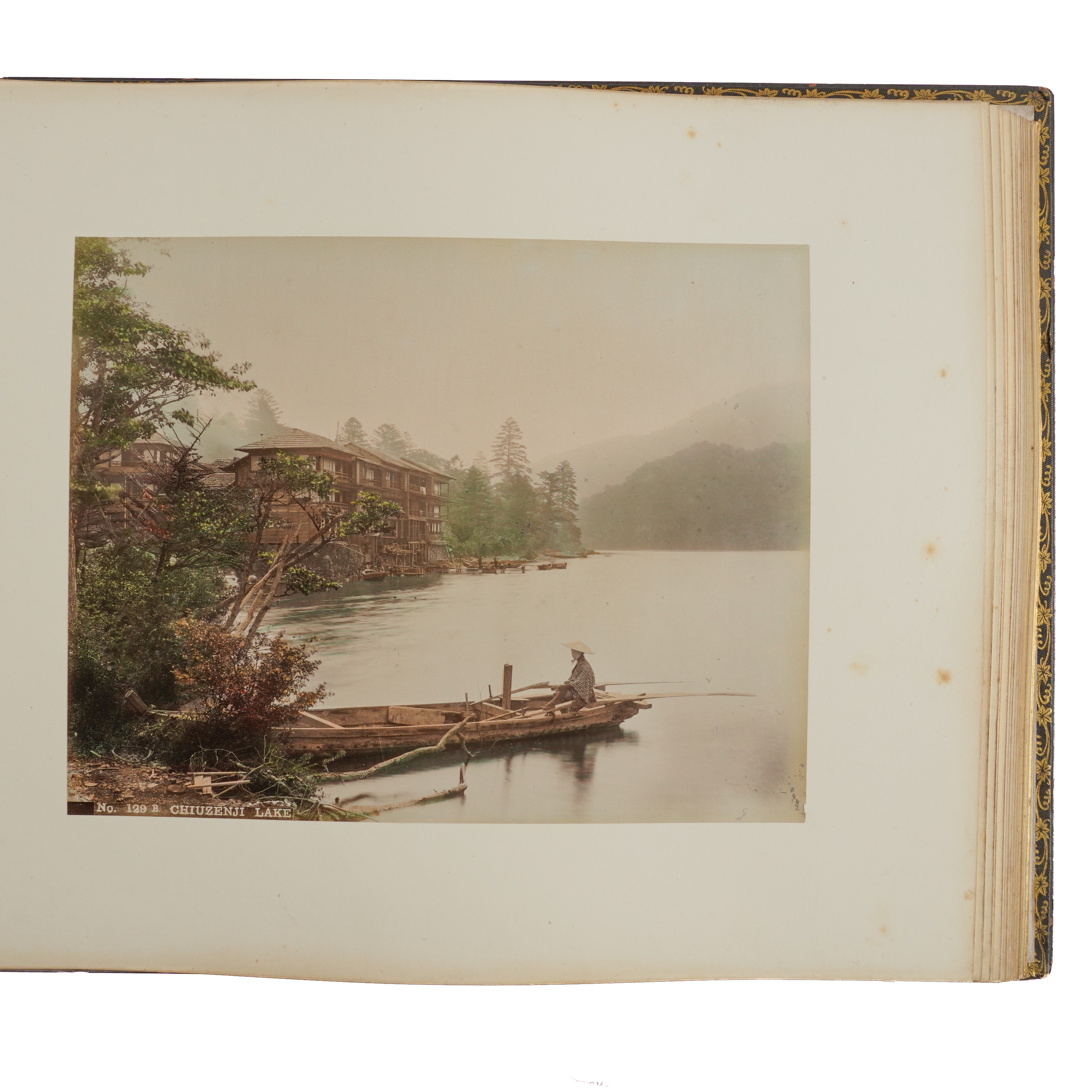 JAPAN - An album of 50 colour-tinted mounted photographs of Japan in a fine lacquer album elaborately decorated with a floral design, the photographs 195 x 250mm., the oblong 4to album 325 x 420mm., with a sepia photograph inset into the upper cover (some minor chipping, some spotting mainly to the mounts), gilt edges, [c.1880]. The subjects of the photographs include landscapes, towns, interiors and domestic scenes. Some of the photographs, principally the landscapes at the beginning of the album, are numbered and captioned in the corners as follows (in the order in which they appear in the album): "938. Harbor of Kobe"; "No. 622. Gion Street at Kioto"; "901. Hozugawa, a Rapids, at Kioto"; "1087. Lake of Biwa from Miidera"; "1096. Large Pine at Karasaki"; "No. 1064. Fujiyama from Tokaido"; "No. 397B. Miyanoshita"; "No. 215. Bronze Bell"; "574. Daibutsu at Kamakura"; "1008. F Ikegami Near Omori"; "741. Imaichi Road at Nikko"; "No. 748. Sacred Bridge at Nikko"; "757. Pagoda at Nikko"; "&15. Yomeimon Gate at Nikko"; "711. Stone Steps at Nikko"; "1130. Urami Falls at Nikko"; "No. 32B. Road to Chiuzenji, from Nikko" and "No. 129B. Chiuzenji Lake"; "1016. Rice Planting".