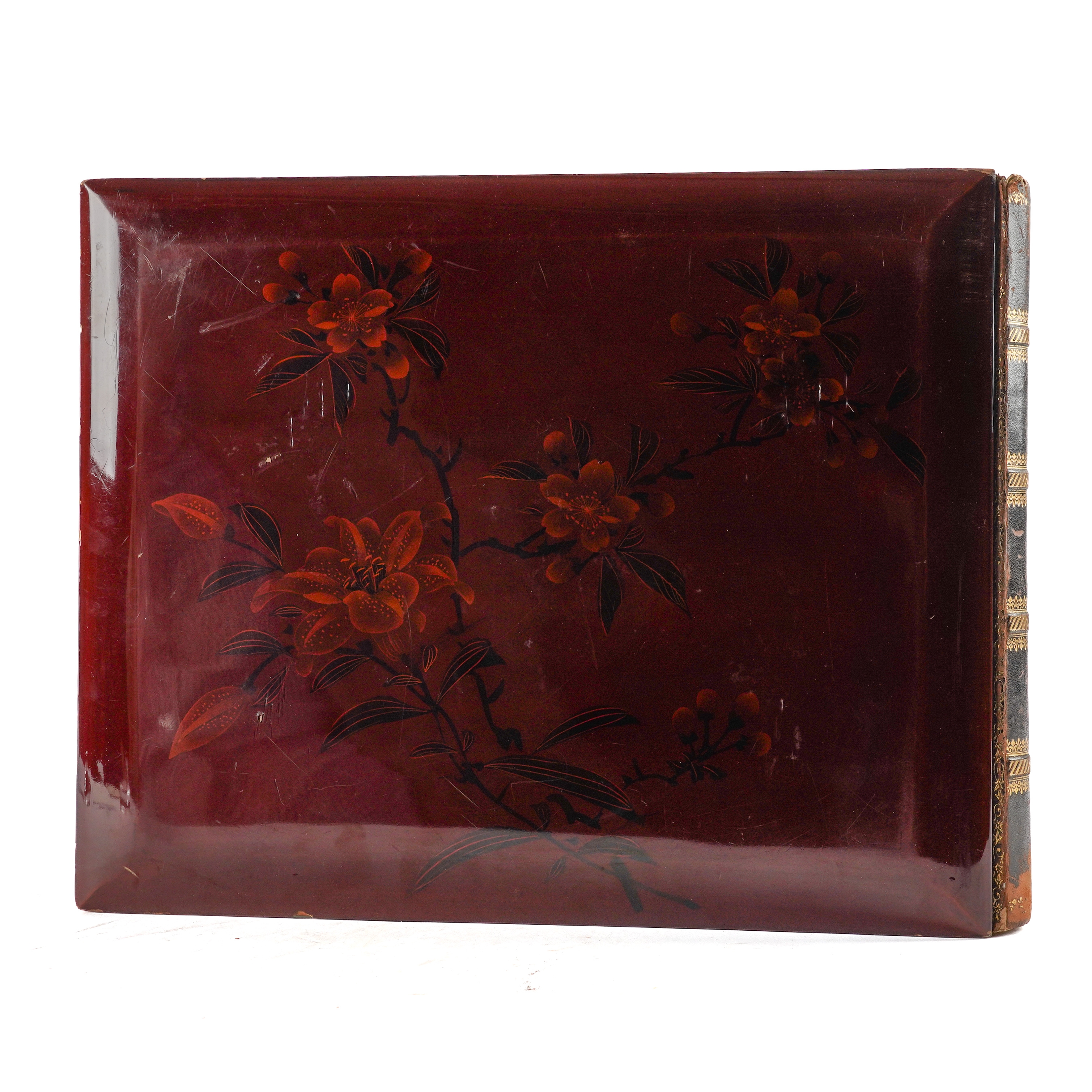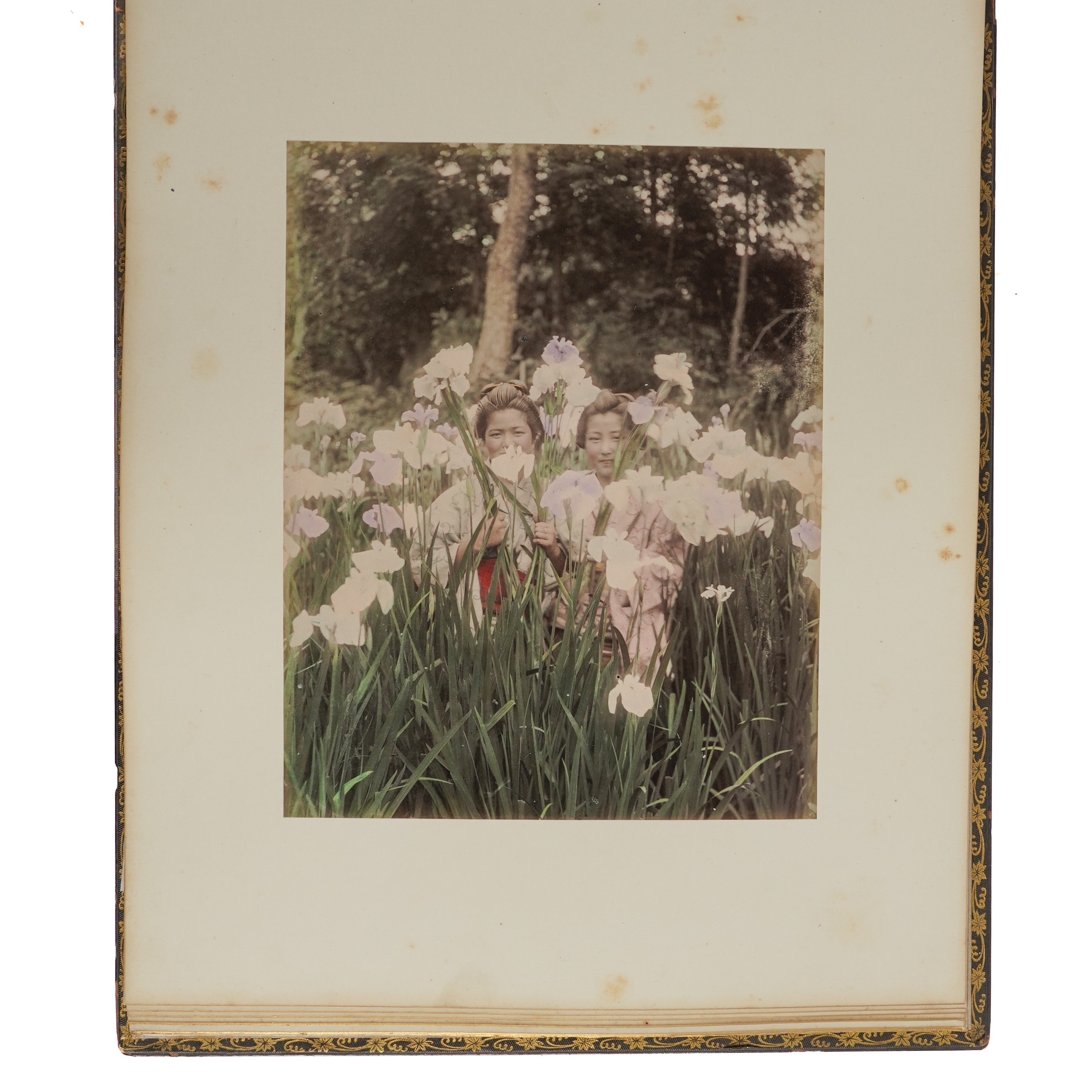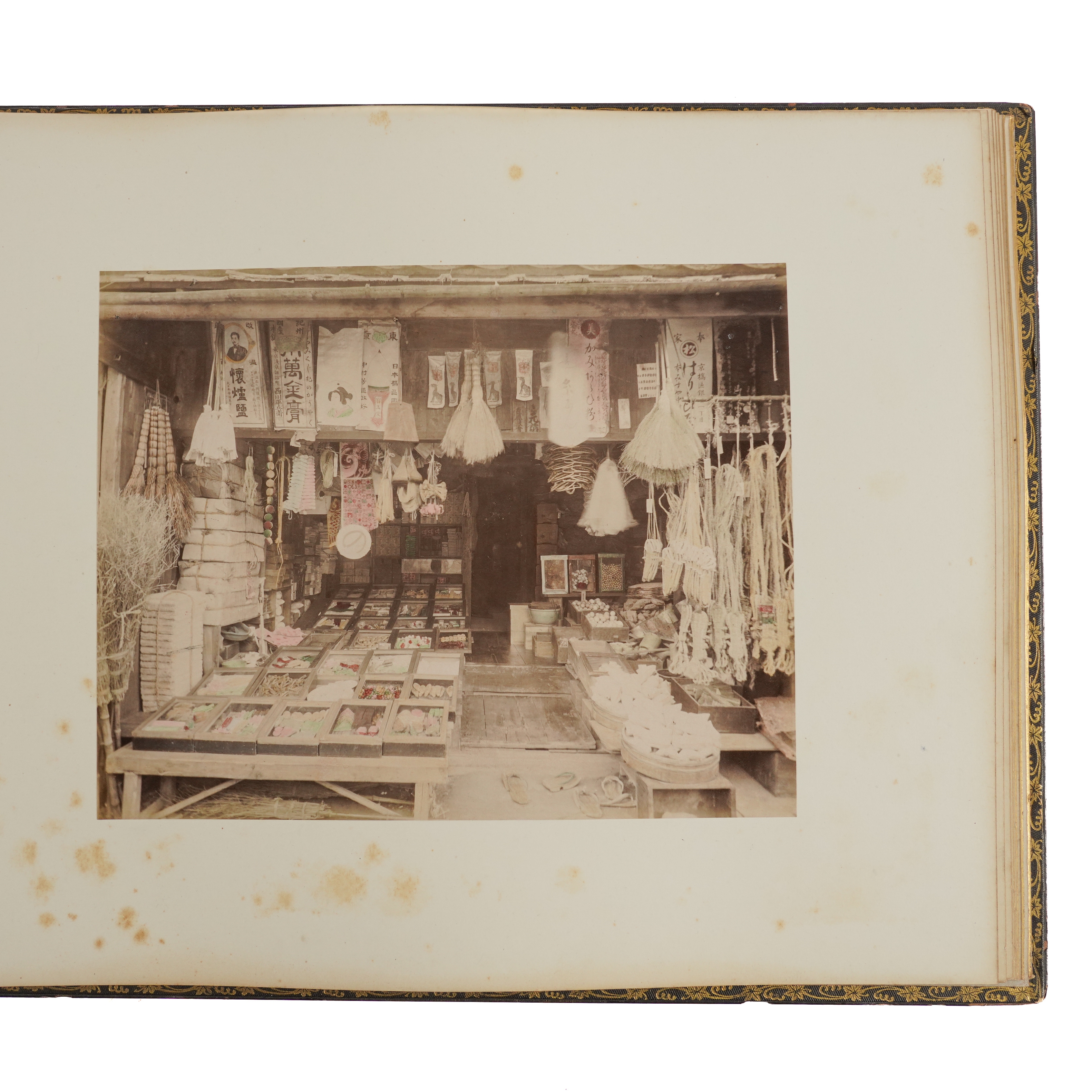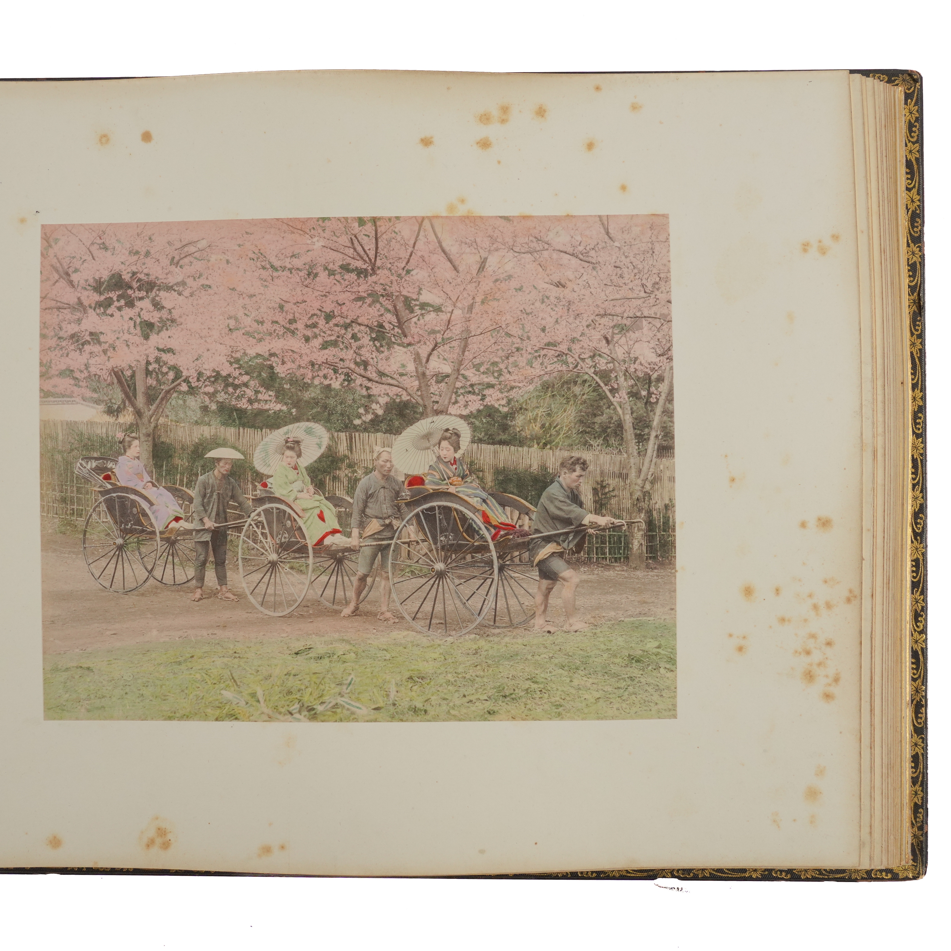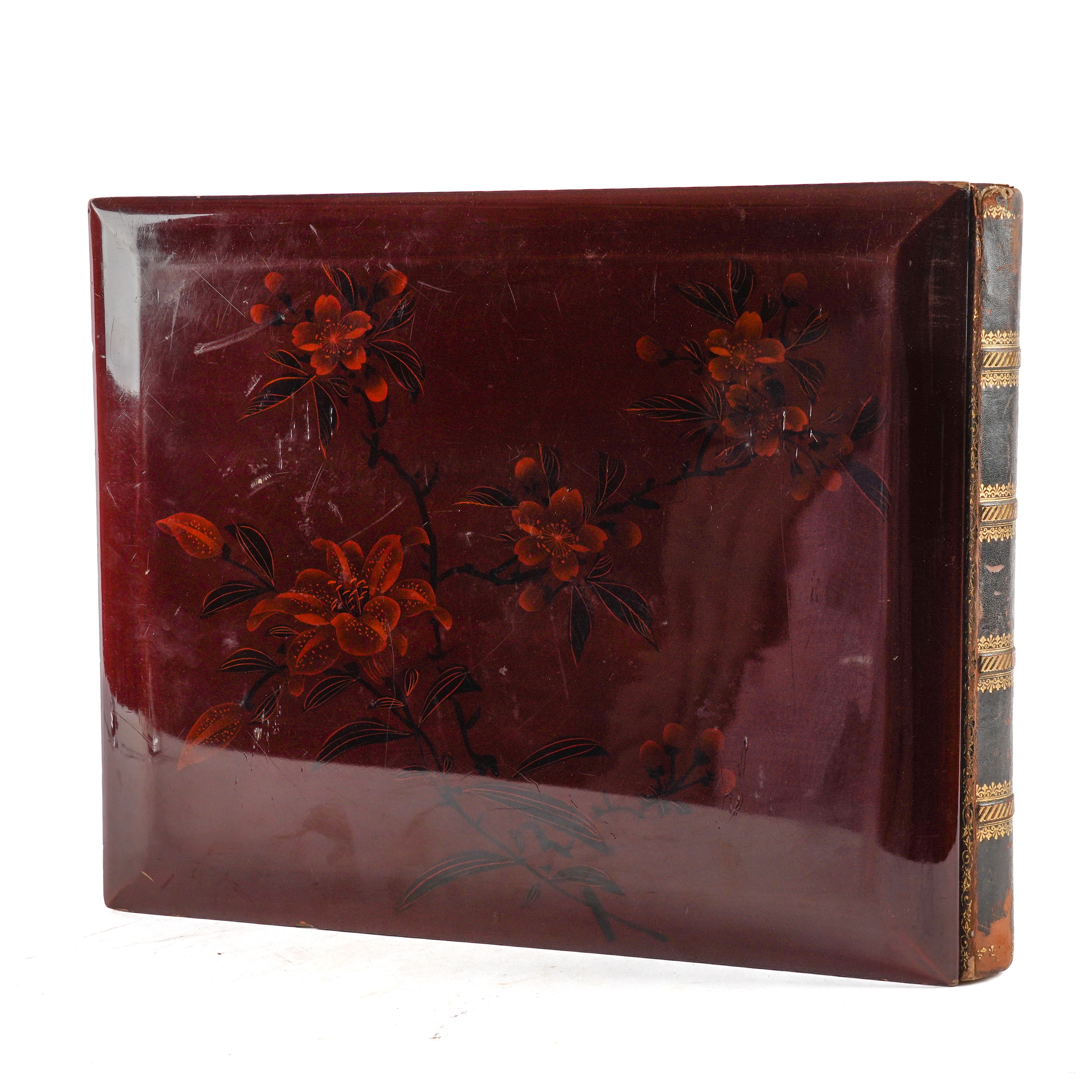 JAPAN - An album of 50 colour-tinted mounted photographs of Japan in a fine lacquer album elaborately decorated with a floral design, the photographs 195 x 250mm., the oblong 4to album 325 x 420mm., with a sepia photograph inset into the upper cover (some minor chipping, some spotting mainly to the mounts), gilt edges, [c.1880]. The subjects of the photographs include landscapes, towns, interiors and domestic scenes. Some of the photographs, principally the landscapes at the beginning of the album, are numbered and captioned in the corners as follows (in the order in which they appear in the album): "938. Harbor of Kobe"; "No. 622. Gion Street at Kioto"; "901. Hozugawa, a Rapids, at Kioto"; "1087. Lake of Biwa from Miidera"; "1096. Large Pine at Karasaki"; "No. 1064. Fujiyama from Tokaido"; "No. 397B. Miyanoshita"; "No. 215. Bronze Bell"; "574. Daibutsu at Kamakura"; "1008. F Ikegami Near Omori"; "741. Imaichi Road at Nikko"; "No. 748. Sacred Bridge at Nikko"; "757. Pagoda at Nikko"; "&15. Yomeimon Gate at Nikko"; "711. Stone Steps at Nikko"; "1130. Urami Falls at Nikko"; "No. 32B. Road to Chiuzenji, from Nikko" and "No. 129B. Chiuzenji Lake"; "1016. Rice Planting".