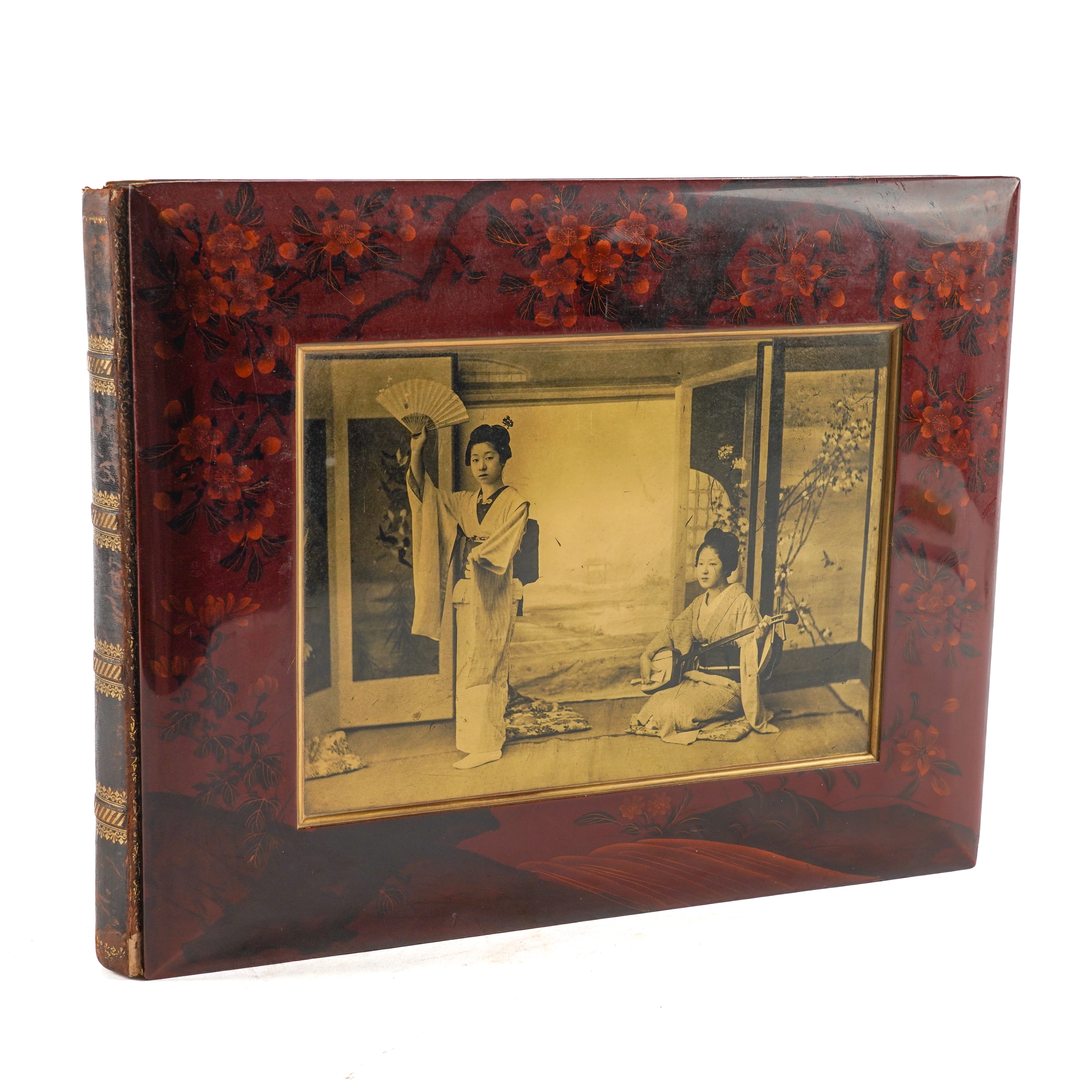 JAPAN - An album of 50 colour-tinted mounted photographs of Japan in a lacquer album, the photographs 195 x 250mm., the oblong 4to album 325 x 420mm., with a sepia photograph inset into the upper cover (some minor chipping), [c.1880].