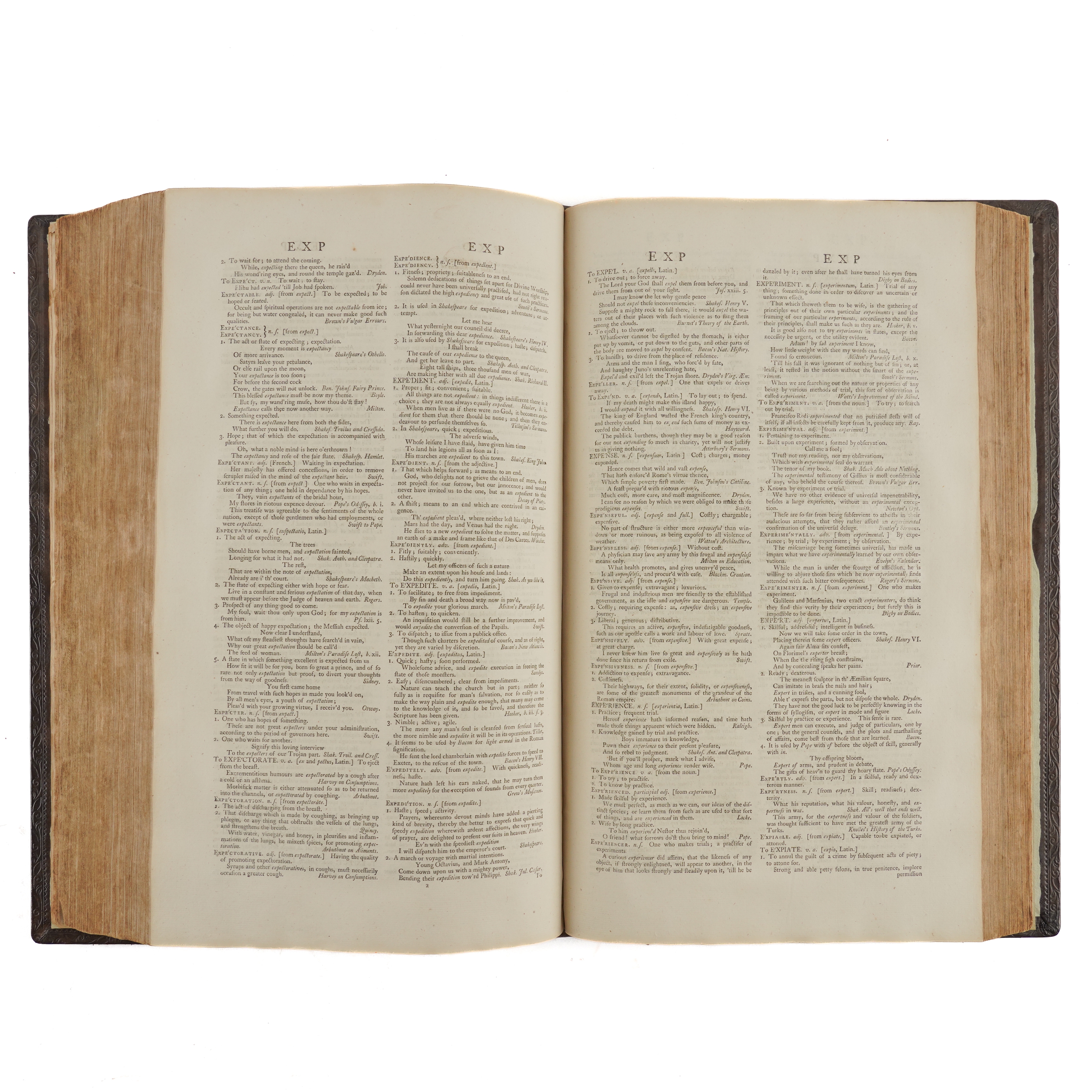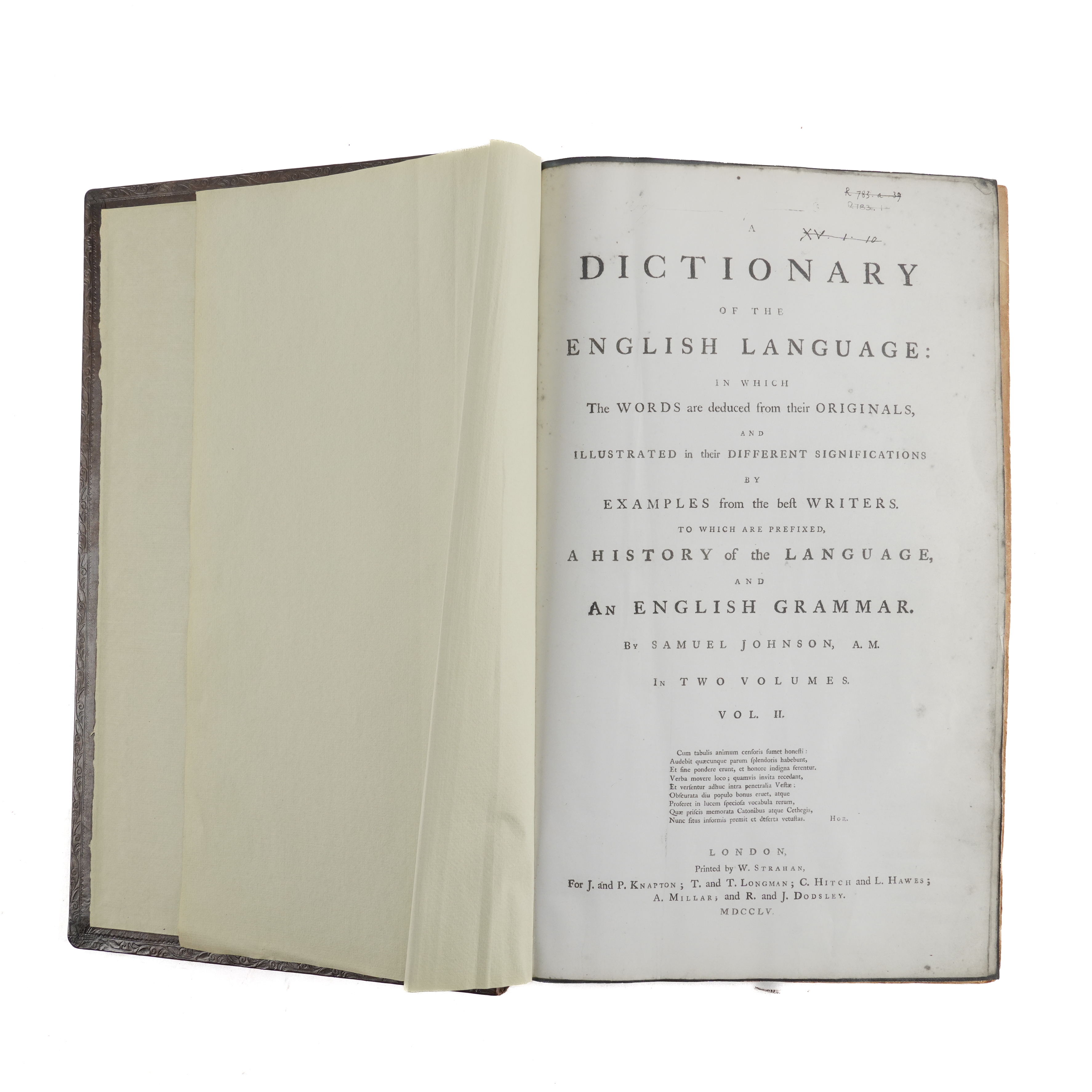 JOHNSON, Samuel (1709-84). A Dictionary of the English Language: in which the Words are Deduced from their Originals, and Illustrated in their Different Significations by Examples from the Best Writers, to which are Prefixed, a History of the Language and an English Grammar. London: "Printed by W. Strahan, For J. and P. Knapton; T. and T. Longman; C. Hitch and L. Hawes; A. Millar; and R. and J. Dodsley," 1755. 2 volumes, folio (420 x 260mm). Title to volume one printed in red and black, printed almost entirely in double column, ornaments (lacking the title page to volume two which has been supplied in functional modern facsimile, followed immediately by the leaf with the signature 15A, the title page to volume one lightly browned and torn at the edges and frayed without loss, some mainly marginal staining at the front and end of volume one, occasional mainly light marginal spotting and staining). Modern old-style calf (lightly scuffed, new endpapers). Provenance: From the Collection of Clive Wilmer (1945-2025; please see lot 418 for further biographical information); G. David Bookseller, Cambridge (small modern bookseller's label on the front pastedowns). FIRST EDITION, FIRST ISSUE, conforming to Todd's requirements of the first issue that the verso of 19D has the press figure '9' and the verso of the following leaf the figure '7'. In addition, the seventh definition of the word "Part" has the quotation sources both written out in full (Bacon's Natural History and Milton's Paradise Lost) rather than abbreviated, as they were the in second issue. "Dr Johnson performed with his Dictionary the most amazing, enduring and endearing one-man feat in the field of lexicography ... The preface ranks among Johnson's finest writings ... It is the dictionary itself which justifies Noah Webster's statement that 'Johnson's writings had, in philology, the effect which Newton's discoveries had in mathematics'. Johnson introduced into English lexicography principles which had already been accepted in Europe but were quite novel in mid-eighteenth-century England. He codified the spelling of English words; he gave full and lucid definitions of their meanings (often entertainingly coloured by his High Church and Tory propensities); and he adduced extensive and apt illustrations from a wide range of authoritative writers ... [D]espite the progress made during the past two centuries in historical and comparative philology, Johnson's book may still be consulted for instruction as well as pleasure" (PMM). Brunet II, 725 (citing the fourth edition of 1773); Chapman & Hazen Johnsonian Bibliography (1938) p.137; Courtney & Smith A Bibliography of Samuel Johnson (1915) p.54; Fleeman A Bibliography of the Works of Samuel Johnson (2000) I, p.410; PMM 201; The Rothschild Library. A Catalogue of the Eighteenth-Century Printed Books and Manuscripts formed by Lord Rothschild 1237. (2)