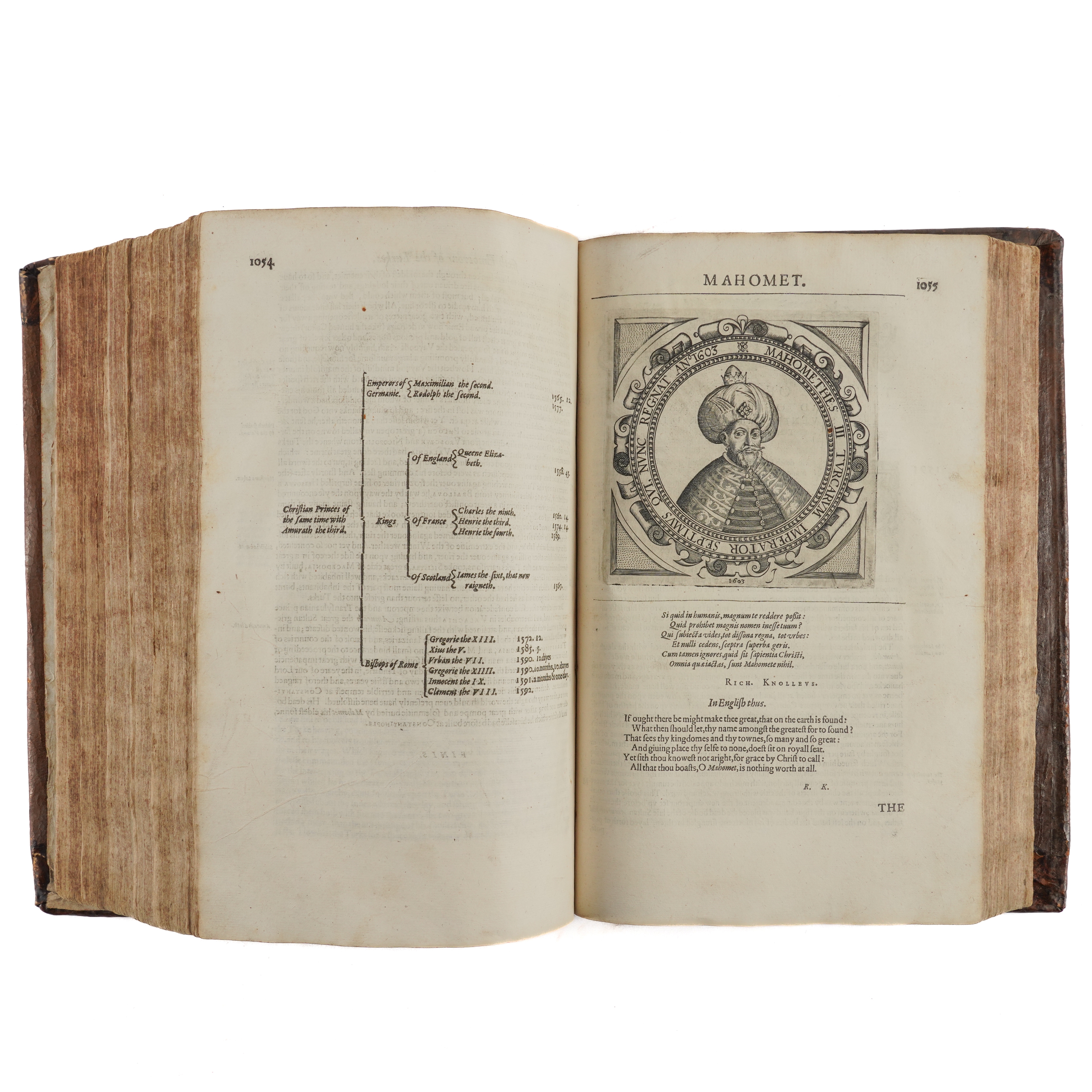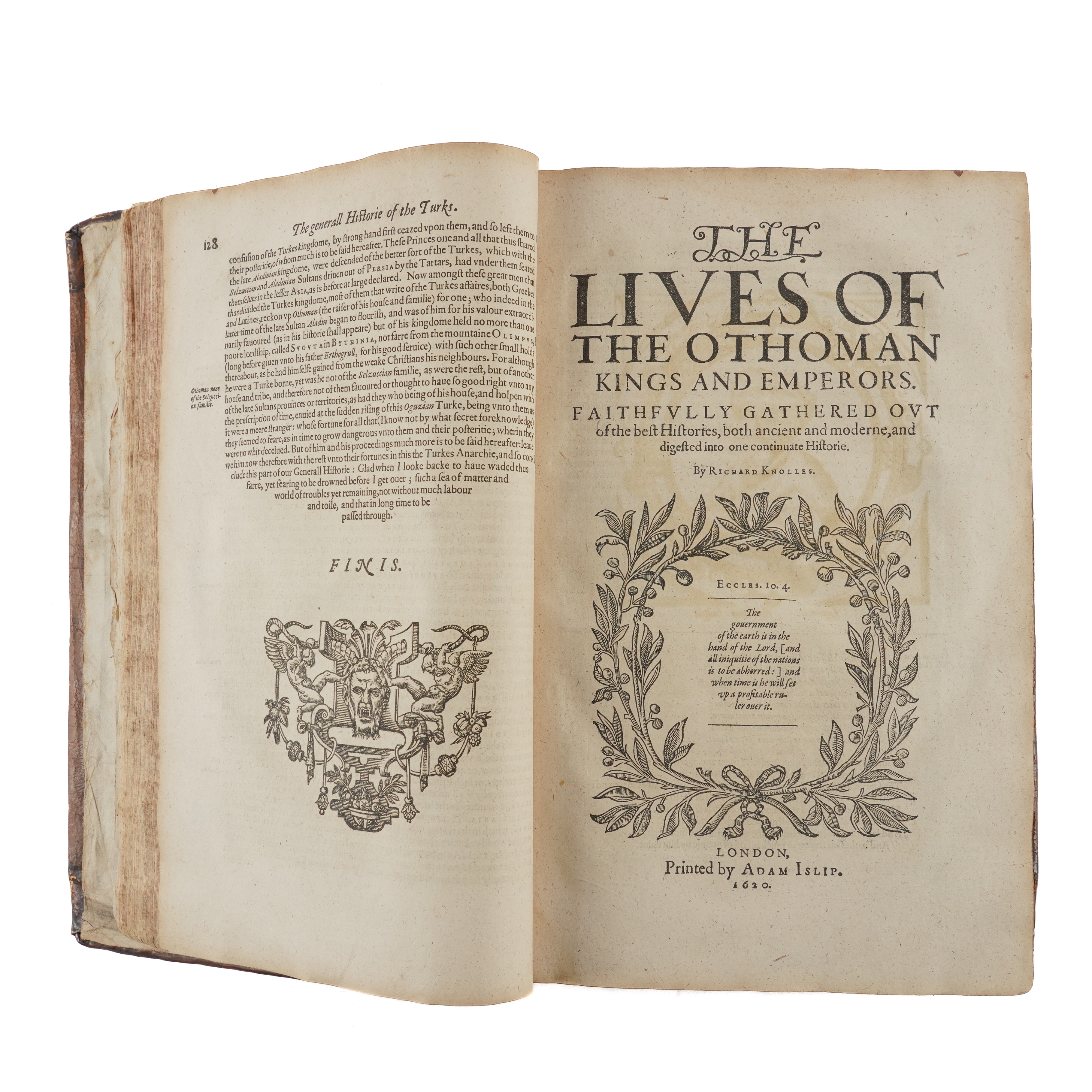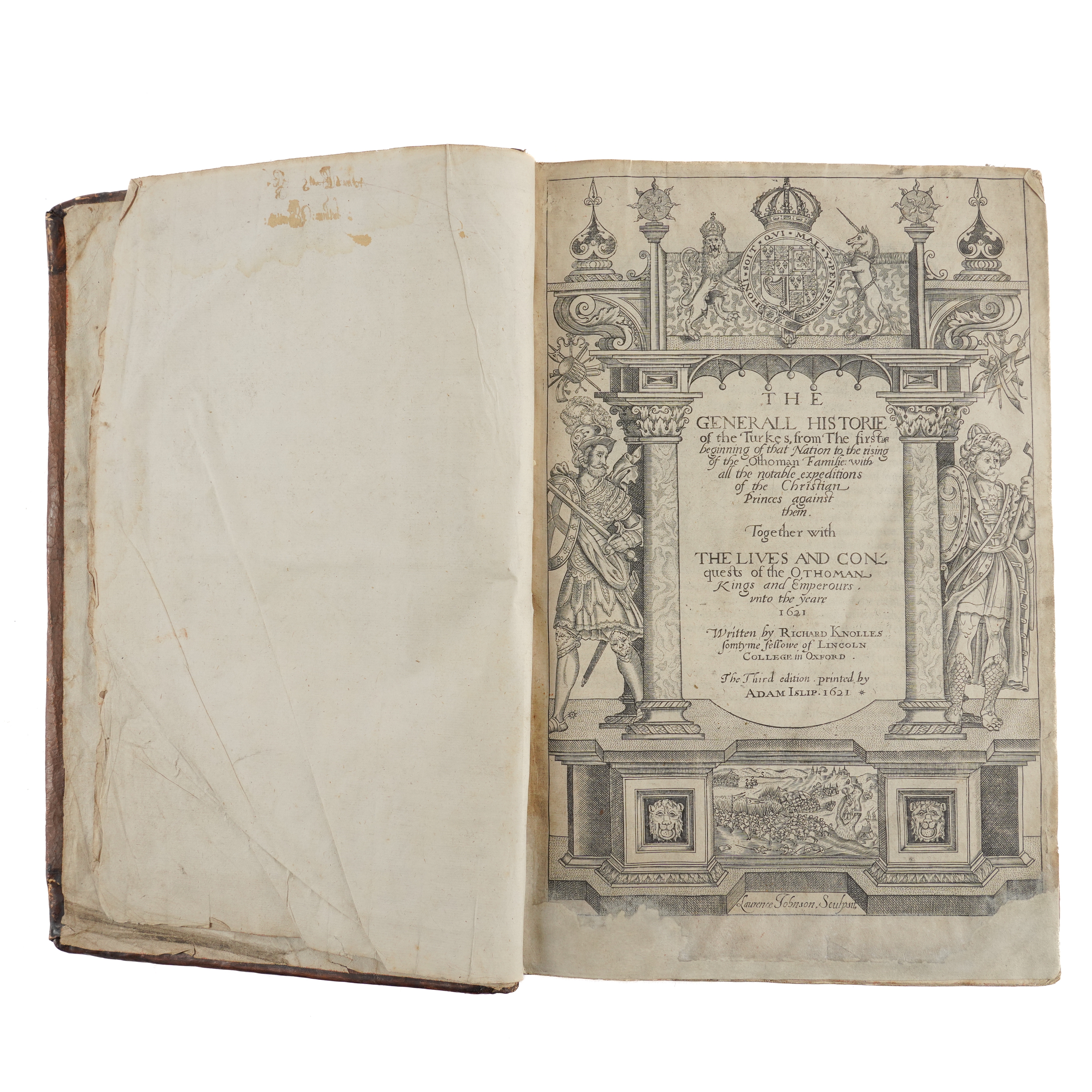 KNOLLES, Richard ([?]1545-1610). The Generall Historie of the Turkes, from the first beginning of that Nation to the rising of the Ottoman Familie: with all the notable expeditions of the Christian Princes against them. Together with the Lives and Conquests of the Othoman Kings and Emperours unto the year 1621 ... The Third Edition. [London:] Adam Islip, 1621 [the second title for "The Lives of the Othoman Kings and Emperors" dated 1620]. Folio (335 x 215mm). Fine highly elaborate architectural engraved title by Laurence Johnson, woodcut initials, headpieces and tailpieces, 28 engraved medallion portraits by Lawrence Johnson in the text, each within a baroque frame, engraved illustration on p.1,076 captioned "... the Bridge made over Danubius by Sinan Bassa, Anno. 1595" with a battle scene in progress, the table at the end printed in triple column (the engraved title repaired at corners with very slight loss, the first leaf after the title signed A3 (dedication "To the High and Mightie Prince James, by the grace of God King of England ..."), blank corner torn away from [Aaa6], short tear to Iiii3 without loss, small hole in upper margin of [Ooo6], corner torn away from [Bbbb5] touching letters, some mainly minor marginal staining, a few darker ink spots more pronounced to one text leaf and the last leaves of the table at the end, some light creasing). Contemporary calf with six raised bands (old repairs to the spine and corners, endpapers heavily creased). Provenance: Arthur Watts (several old signatures on the endpapers); illegible old annotation to a stub at the front; other illegible old inscriptions and/or signatures to the front endpaper; a few old pen trials. "Dr. Johnson lavished somewhat excessive praise on Knolles's style. 'None of our writers,' he asserted in the 'Rambler', No. 122, 'can in my opinion justly contest the superiority of Knolles, who in his 'History of the Turks' has displayed all the excellencies that narration can admit. His style ... is pure, nervous, elevated, and clear. A wonderful multiplicity of events is so artfully and so distinctly explained that each facilitates the knowledge of the next.' ... Hallam confirms Johnson's verdict: 'Knolles's descriptions are vivid and animated - circumstantial, but not to feebleness; his characters are drawn with a strong pencil' ... Byron acknowledged deep indebtedness to Knolles. Shortly before his death at Missolonghi, he wrote: 'Old Knolles was one of the first books that gave me pleasure when a child; and I believe it had much influence on my future wishes to visit the Levant, and gave perhaps the oriental colouring which is observed in my poetry'" (DNB). Baer The Ottomans (2021) pp.106-7; cf. Blackmer 919 (citing the first edition of 1603); not in Atabey or Brunet; STC 15053. A FINE CRISP COPY.