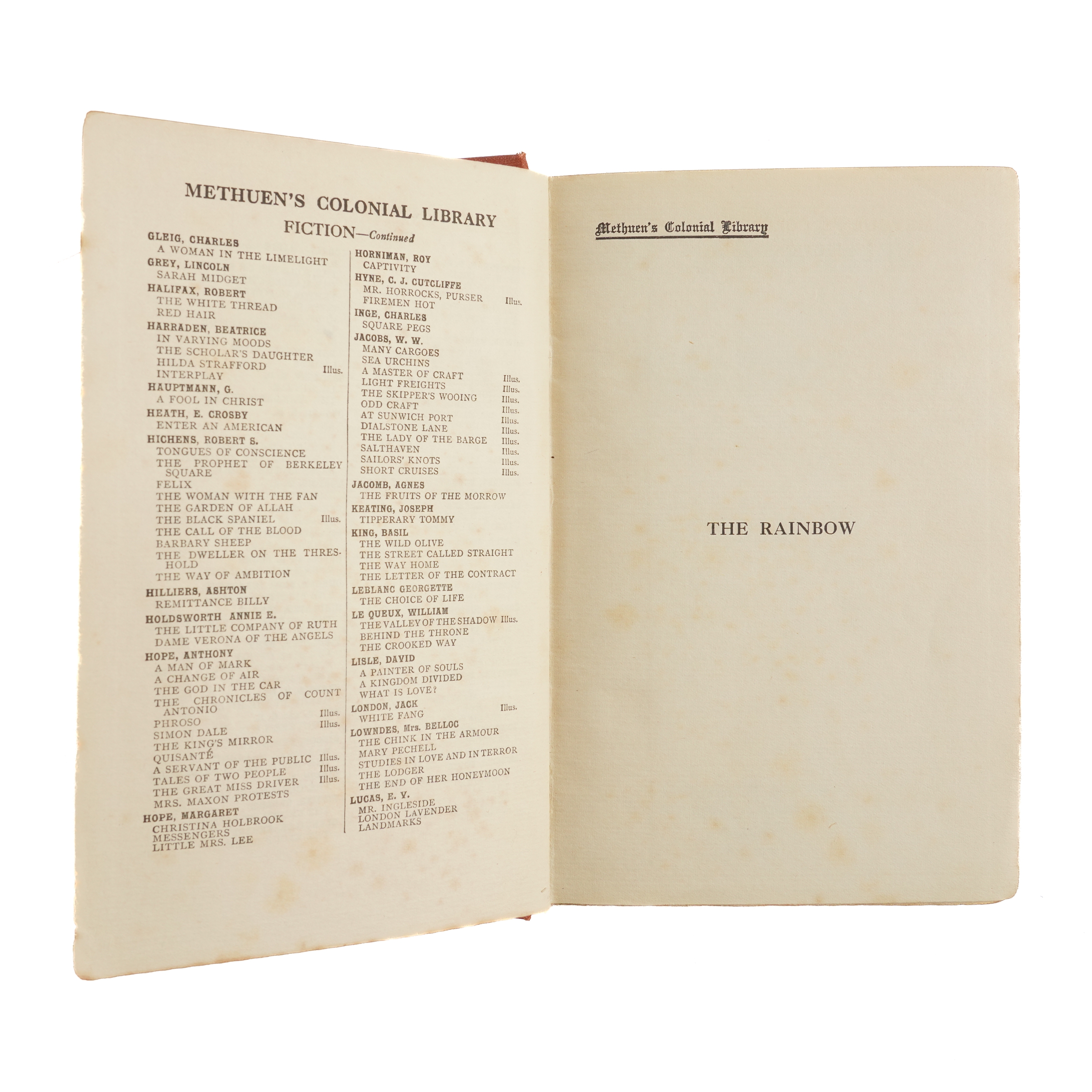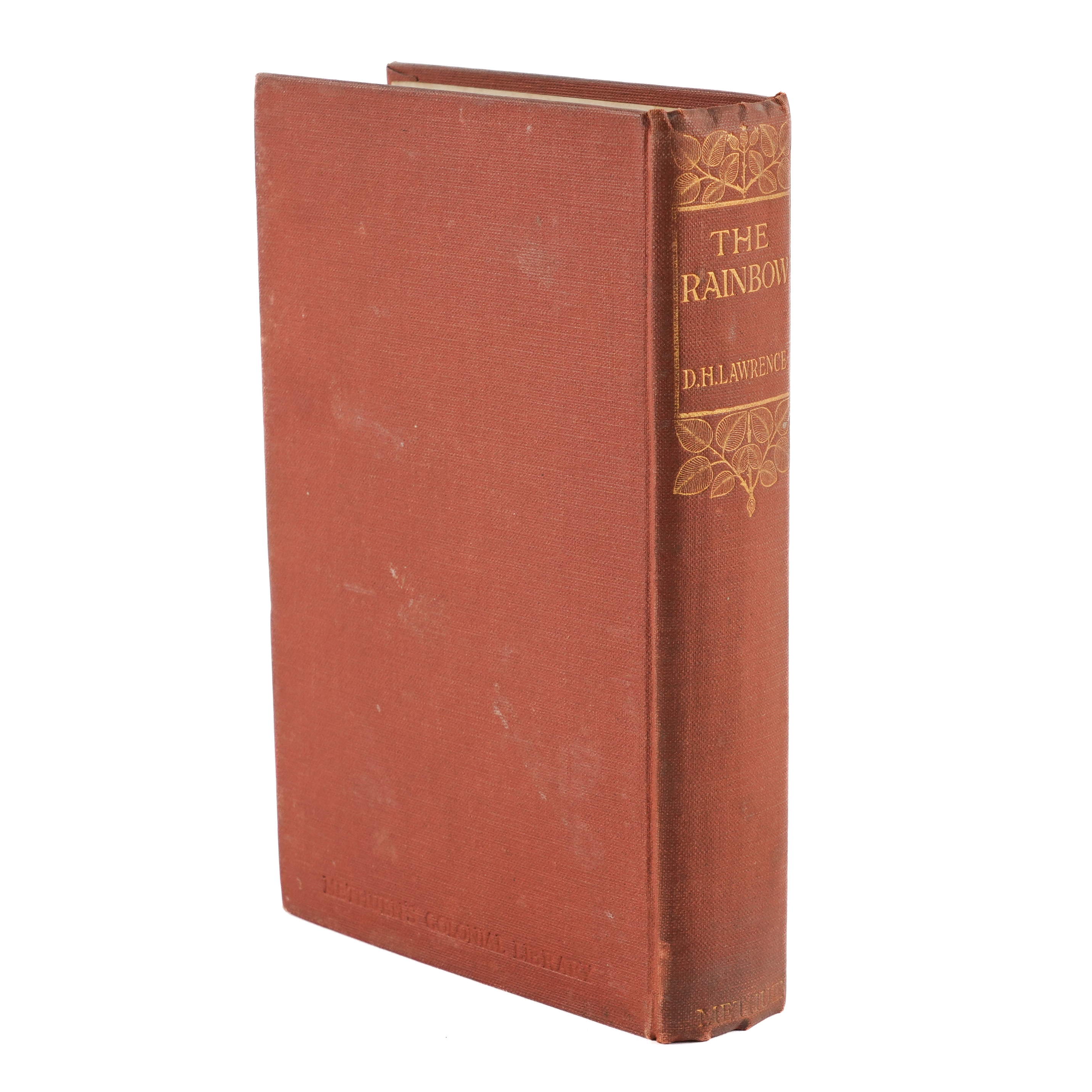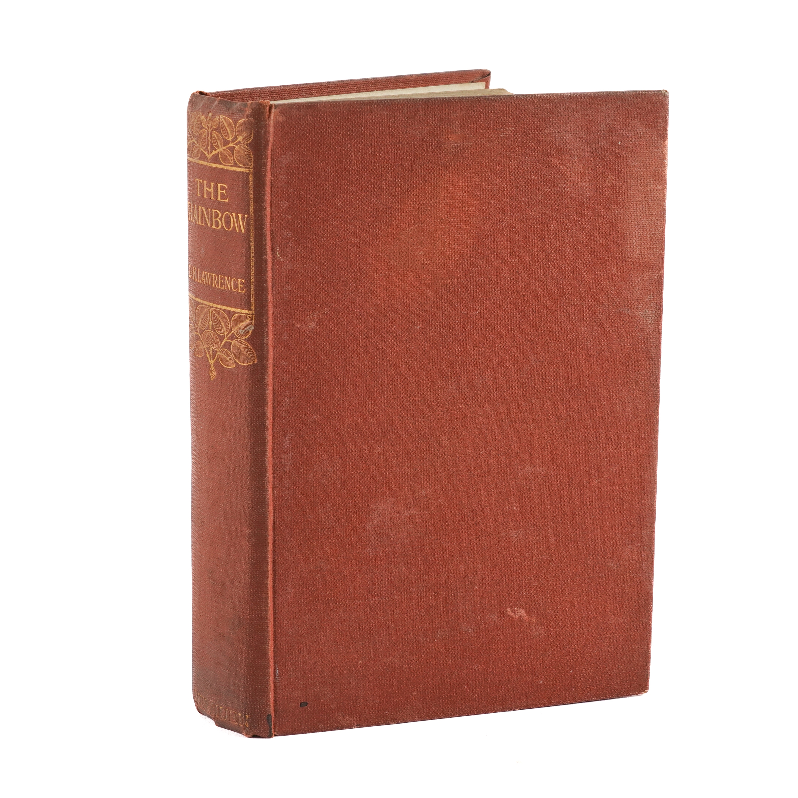 LAWRENCE, D. H. (1885-1930). The Rainbow. London: Methuen & Co. Ltd. ["Methuen's Colonial Library" on half title], 1915. 8vo (188 x 125mm). Half title (maginal stain to a few leaves near the end). Original 'rust'-coloured cloth, the spine lettered and decorated in gilt, with "Methuen Colonial Library" advertisements to the front pastedown and endpaper, and 6-pages of advertisements at the end on and the rear pastedown (without the dust-jacket). A FINE COPY OF THE FIRST EDITION, ONE OF APPROXIMATELY 500 COPIES PRINTED FOR 'METHUEN'S COLONIAL LIBRARY'. In November 1915 The Rainbow was prosecuted for obscenity at Bow Street Magistrate's Court, as a result of which in excess of a thousand copies of the standard Methuen first edition, of a total of approximately 2,500, were destroyed. However, Methuen had simultaneously printed a 'Colonial Library Edition' of approximately 500 copies and these, distributed to the British colonies prior to the ban, managed to evade destruction. The novel was not republished in the U.K. until Martin Secker's edition of 1926, albeit in an expurgated form. The first completely unexpurgated edition, repeating Methuen's original text verbatim, was by Penguin Books in 1949. It would be just over a decade later that Penguin would achieve its most celebrated, albeit posthumous, victory against censorship on Lawrence's behalf. "The book is remarkable for its study of the 'recurrence of love and conflict' within the marriages it describes; for its attempt to capture the flux of human personality; and for its sense of a mysterious procreative continuity within the 'rhythm of eternity' both of the seasons and of the Christian year" (The Oxford Companion to English Literature, ed. Drabble, 1985). cf. Roberts A Bibliography of D. H. Lawrence (1963) A7: "The first printing consisted of 2500 copies, of which the majority presumably were destroyed as a result of the court action against the book." Curiously, Roberts makes no mention of the present 'Colonial Library Edition'.