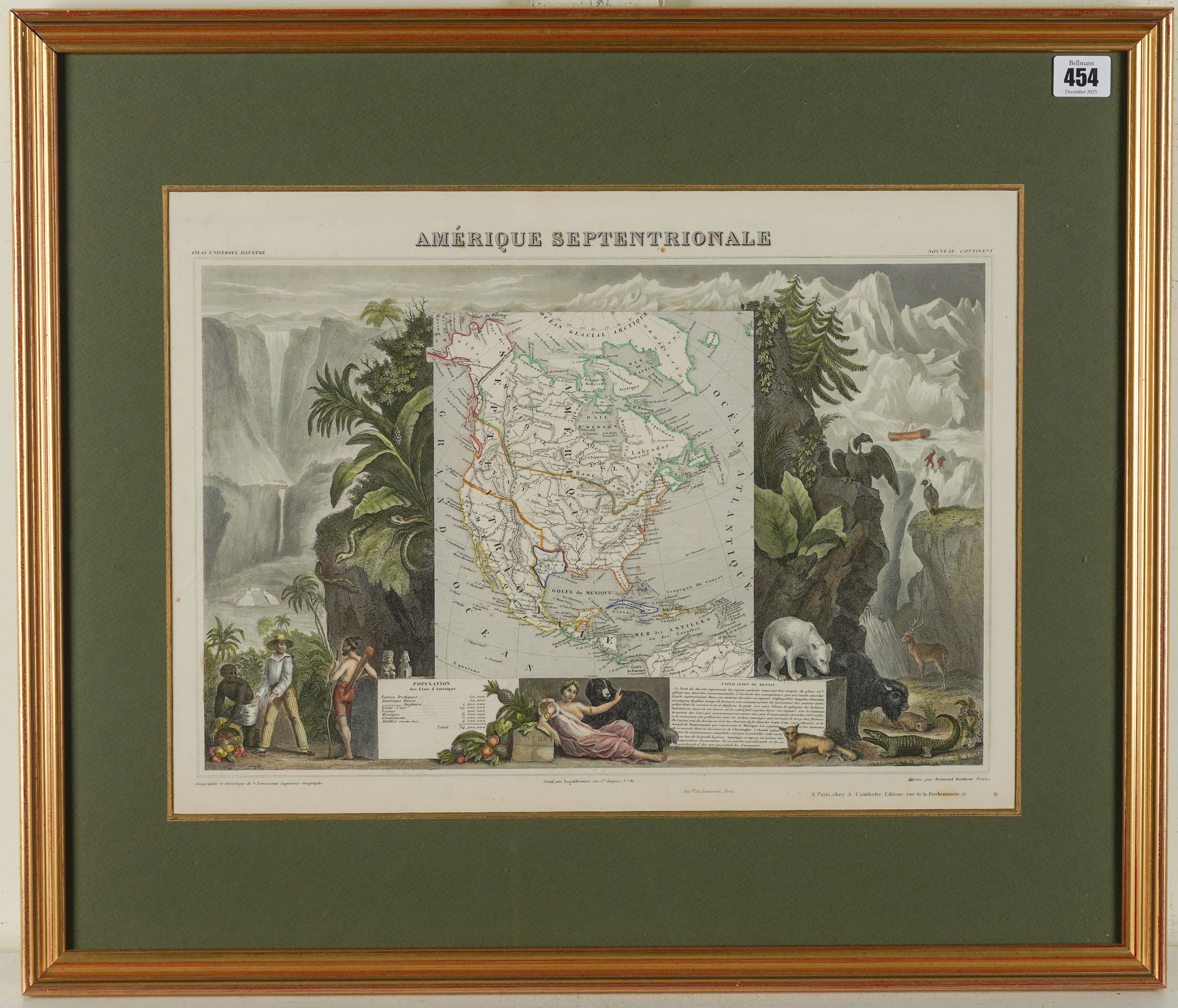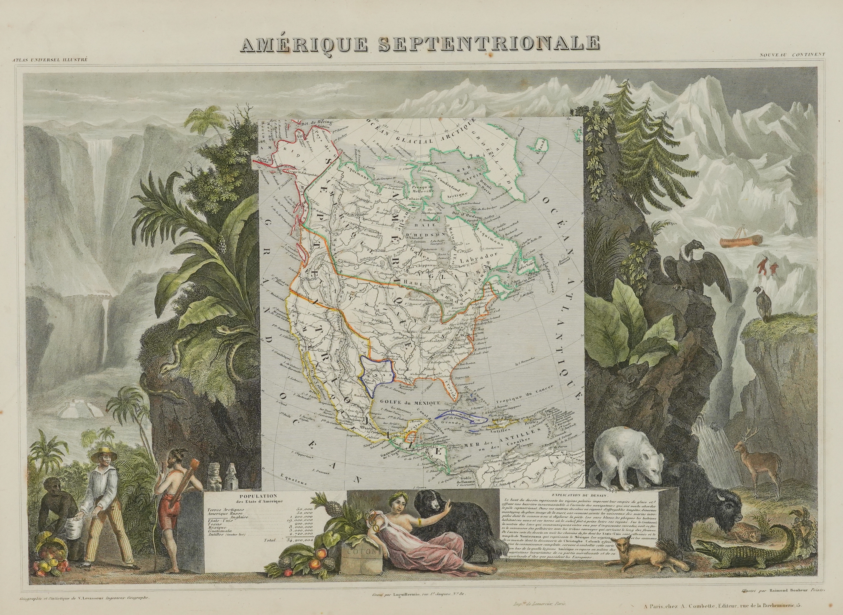 LEVASSEUR, Victor (1800-70). Amérique Septentrionale. Paris: chez A. Combette, [c.1845]. Hand-coloured engraved map of north America, with wide elaborate pictorial borders by Raimond Bonheur fully coloured by hand, national and state borders hand-coloured in outline, including Texas boldly outlined in dark blue (a few spots), 290 x 430mm., framed and glazed. The elaborate decorative borders feature indigenous peoples and flora and fauna including, on the right hand side, a great eagle, a polar bear, an alligator, a bison, and an elk, and, on the left hand side, a European settler bargaining with a native, a pyramid behind, the whole backed by a dramatic landscape of mountains and waterfalls, with an allegorical reclining classical figure of a woman at the base, with a St. Bernard and a bale of cotton. A small table gives the populations of the various countries included in the map, with the United States (i.e. "Etats-Unis") having 19,000,000 and Texas 200,000. The map is important as a record of the short-lived independent Republic of Texas which existed between 1836 and 1846, whereupon it formally ceded to the United States and became the 28th state of the union. Phillips A List of Geographical Atlases in the Library of Congress 3003.
