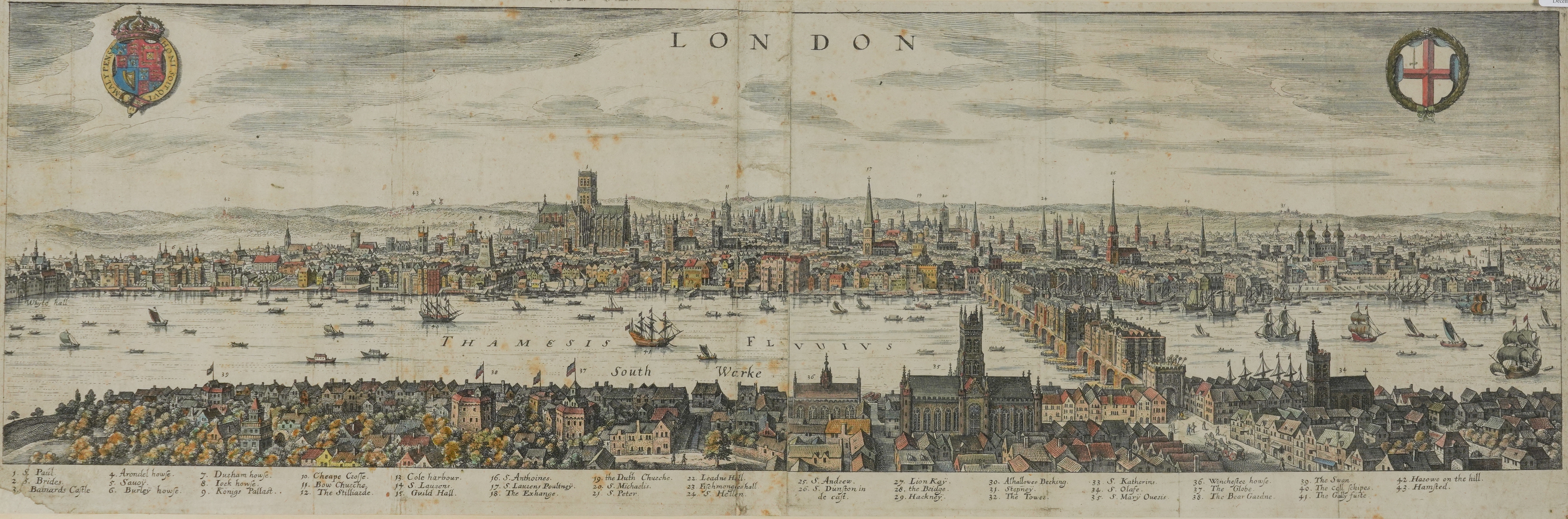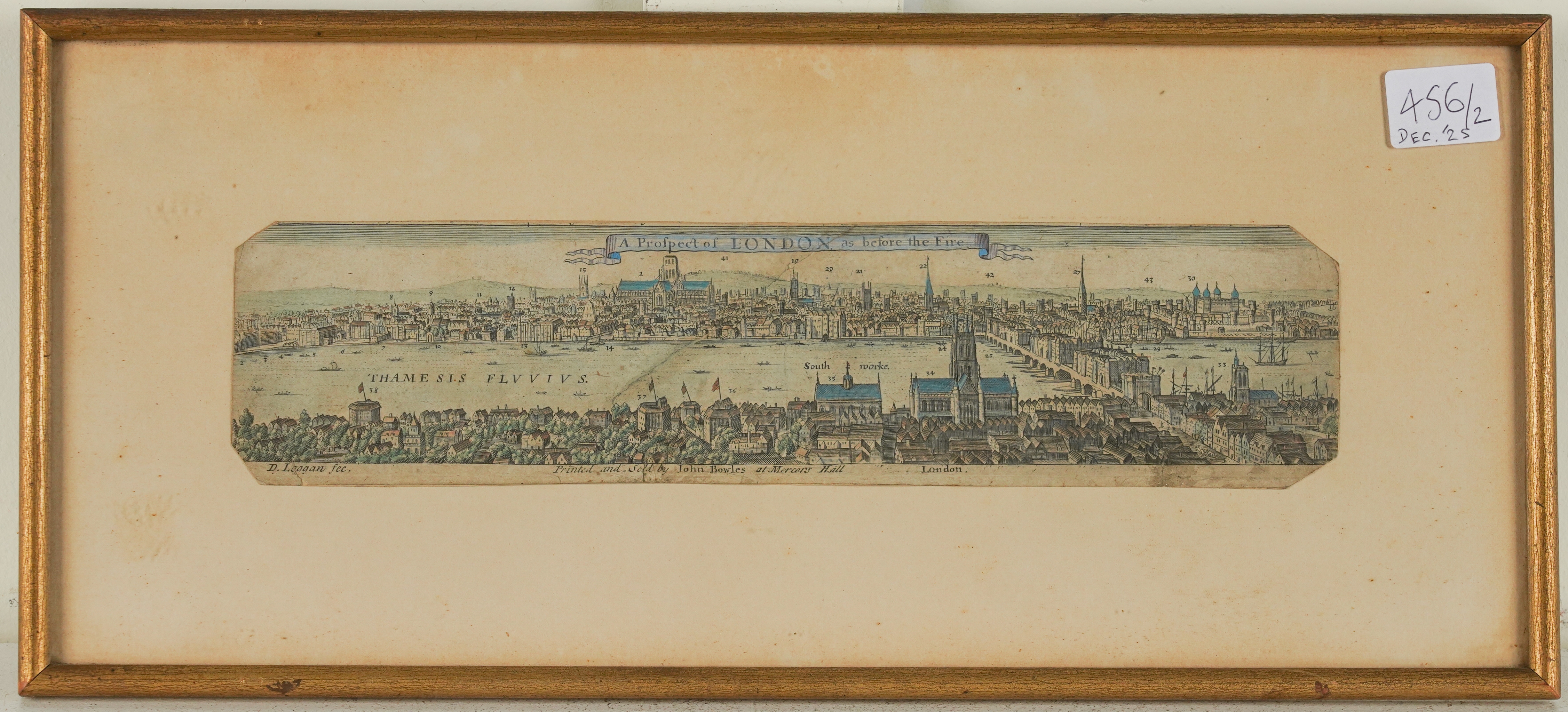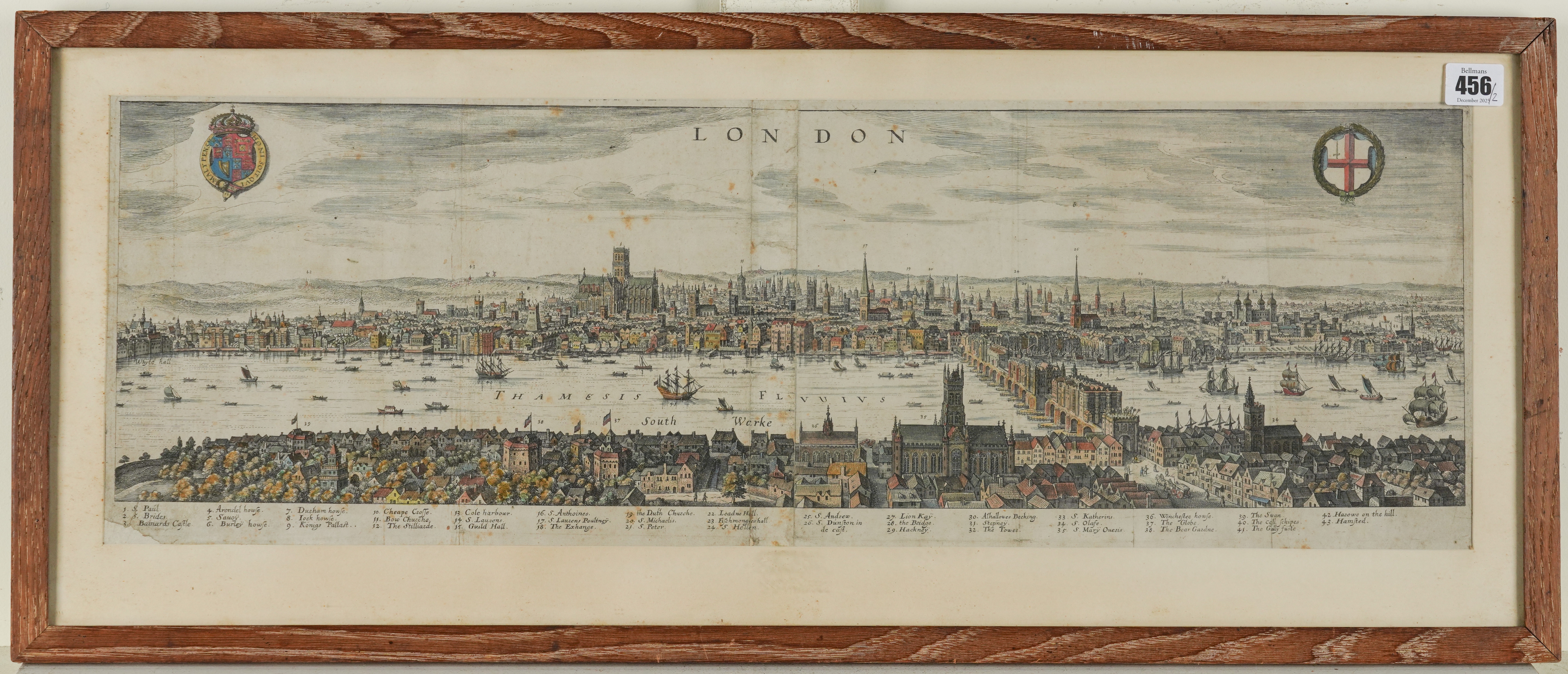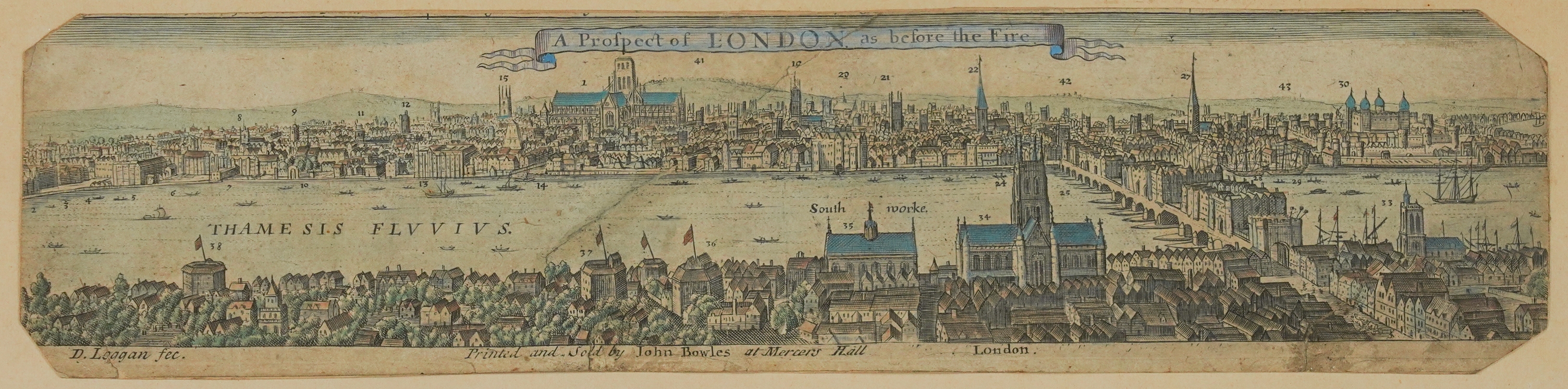 LONDON PANORAMAS - [Matthäus MERIAN (1593-1650), the Elder], attributed. London. [Frankfurt: 1638 or later]. Hand-coloured engraved panorama of London extending from "Whyte Hall" to the Tower of London, 2 coats-of-arms, with a key beneath to 43 locations, on 2 sheets, joined (some spotting and staining, lower left blank corner torn away, just touching one number of the key), 230 x 710mm., framed and glazed. Howgego Printed Maps of London p.7: "A smaller panorama generally known as the 'Merian' view is one of a number of views of European cities in Gottfried's Neuwe archontologia cosmica published at Frankfurt in 1638. Some of these are signed by Merian and for this reason the unsigned London view is attributed to him. Although it has certain marked characteristics of its own it is undoubtedly based to a large extent on Visscher." With David Loggan's A Prospect of London as before the Fire ... Printed and Sold by John Bowles at Mercers Hall London (London, [c.1700], small hand-coloured engraved panorama, 75 x 310mm., framed and glazed). (2)