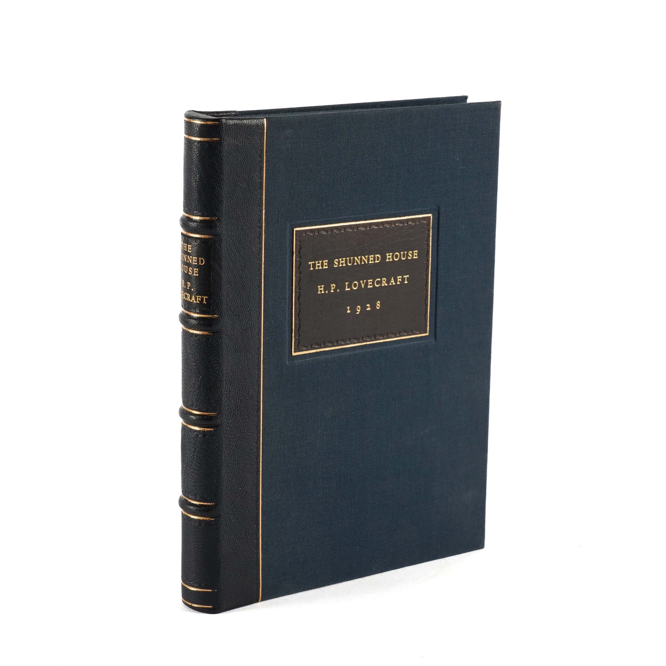 LOVECRAFT, H. P. (1890-1937). The Shunned House ... With a Preface by Frank Belknap Long, Jr. Athol, Massachusetts: "Published by W. Paul Cook. The Recluse Press, 1928" [but please see the important note below relating to this imprint]. 8vo (187 x 130mm). Small woodcut typographical ornament on the title page, printed on paper watermarked "Canterbury Laid" (inconspicuous small rectangular hole at the lower gutter of the title page, very small triangular piece of the lower fore-corner of the title page cut away, 2 tiny marginal tears to the dedication and preface leaves, faint marginal spot on p.43). Original black publisher's [i.e. Arkham House] cloth, the spine lettered in gilt (the gilt lightly rubbed, but more heavily to the word "House" of "Arkham House"), housed in a black morocco-backed book box with a black morocco label on the upper cover lettered in gilt. Provenance: Spokane Community College (very faint, easily missed, stamps on the top and bottom edges); small unidentified pictorial label at the foot of the front pastedown of the box. Frank Belknap Long's preface to the book opens: "The Shunned House is a wonderful story. It is so far removed in theme from our familiar world of radios and politicians and adding machines that it does not touch, at any point, the ancillary stream of modern writing. I can discern in it, here and there, faint analogies to contemporary 'terror tales', to the work of Lord Dunsany and Arthur Machen and Algernon Blackwood, but in the main Mr. Lovecraft begins where other writers leave off ..." On the verso of the title, pasted over the original copyright details, is a printed note stating: "THE SHUNNED HOUSE [in bold], by H. P. Lovecraft. Copyright, 1936, by H. R. Barlow. Copyright, 1937, by Popular Fiction Publishing Company, for Weird Tales. Copyright, 1939, 1947, by August Derleth and Donald Wandrei for The Outsider and Others, Arkham House: 1939. Though the sheets of this story were printed and marked for copyright in 1928, the story was neither bound nor circulated at that time. A few copies were bound, put under copyright, and circulated by R. H. Barlow in 1936, but the first wide publication of the story was in the magazine, Weird Tales, in the following year. The story was originally set up and printed by the late W. Paul Cook, publisher of The Recluse." S. T. Joshi, the author of the now standard and most exhaustive bibliography of H. P. Lovecraft, opens his Introduction to the work with the words: "The difficulties involved in Lovecraft bibliography may perhaps be as formidable as those for any writer of the twentieth century ..." and this statement may be seen as particular pertinent to any discussion of "The Shunned House." The following is an edited extract from Joshi's extensive entry: "The legendary stillborn first 'book' by Lovecraft ... Cook printed approximately 300 copies in mid-1928 ... but bound none ... Paper bears the watermark 'Canterbury Laid' ... In 1934 Barlow received about 225 copies of the unbound sheets. It is rumoured that he bound only eight copies ... Of the 225 copies, Barlow apparently distributed only about 50, having found some unusable. COPIES BOUND OR DISTRIBUTED BY ARKHAM HOUSE ... Arkham House, when obtaining the remainder of the unbound sheets, bound or distributed 150 as follows: 50 unbound copies bear a printed label pasted over the original copyright notice; 100 are bound in black cloth bearing the printed copyright notice. Spine stamped in gold. The former were distributed ca. 1959; the latter ca. 1961. The Arkham House copyright label is in two states: the one for the unbound sheets prints books and other magazine titles in boldface; that for the bound sheets prints these titles in italics" (Joshi). Wikipedia states of the Arkham House issue: "The genuine item, watermarked 'Canterbury', is the rarest book associated with Arkham House (several variants exist involving the copyright notice). It is considered the 'holy grail' for Arkham House collectors ..." Bleiler The Guide to Supernatural Fiction (1983) 1037; Brennan H. P. Lovecraft: A Bibliography (1952), p.1; Currey Science Fiction and Fantasy Authors: A Bibliography (1979) p.325; Jaffery The Arkham House Companion (1992) 62; Joshi H. P. Lovecraft: A Comprehensive Bibliography (2009) A5; cf. Ransom Private Presses and their Books (1929) p.394 (citing Cook's 300 unbound copies printed in 1928). LIMITED TO 300 COPIES, THIS ONE OF 100 ISSUED BY ARKHAM HOUSE AND BOUND IN BLACK CLOTH. EXCEPTIONALLY RARE.