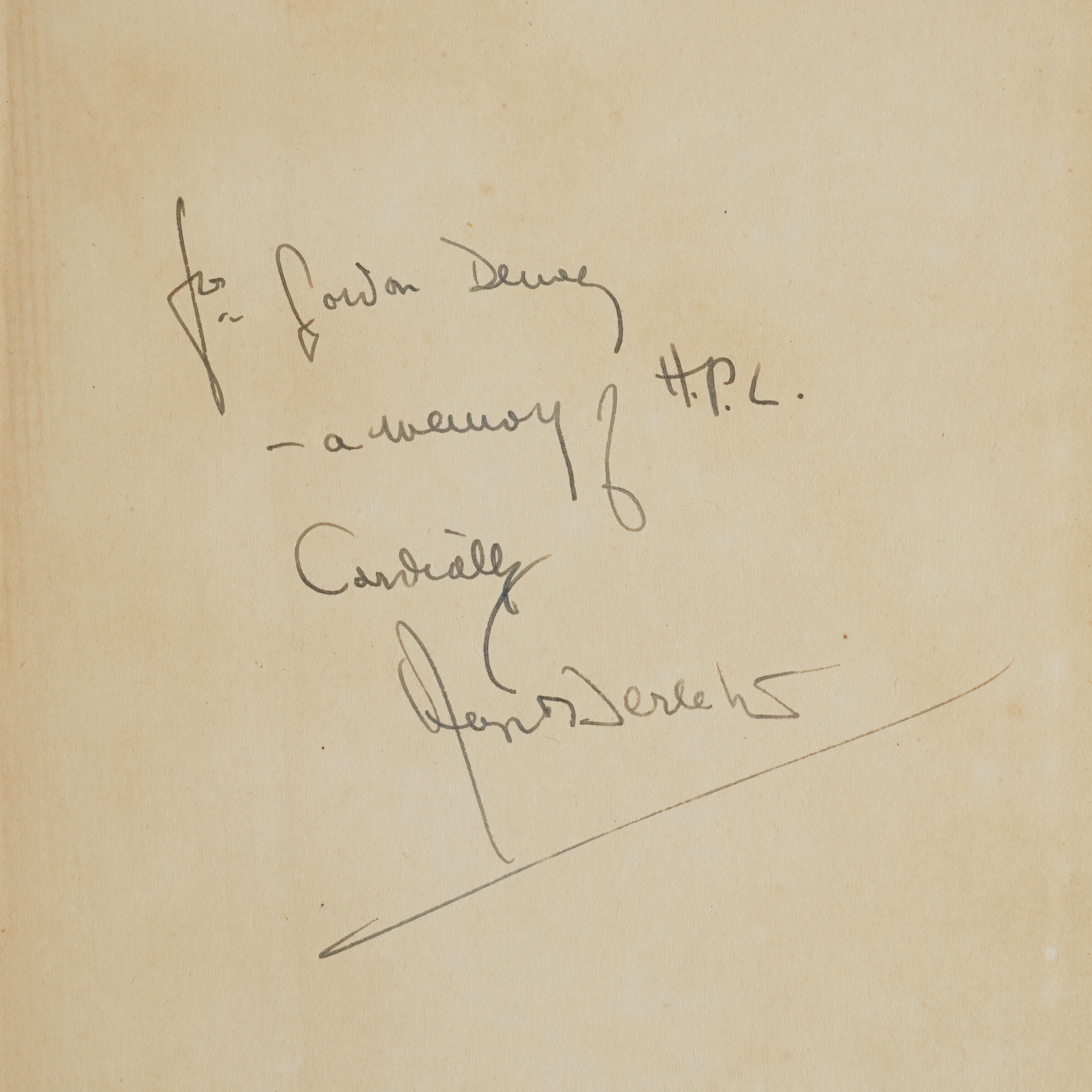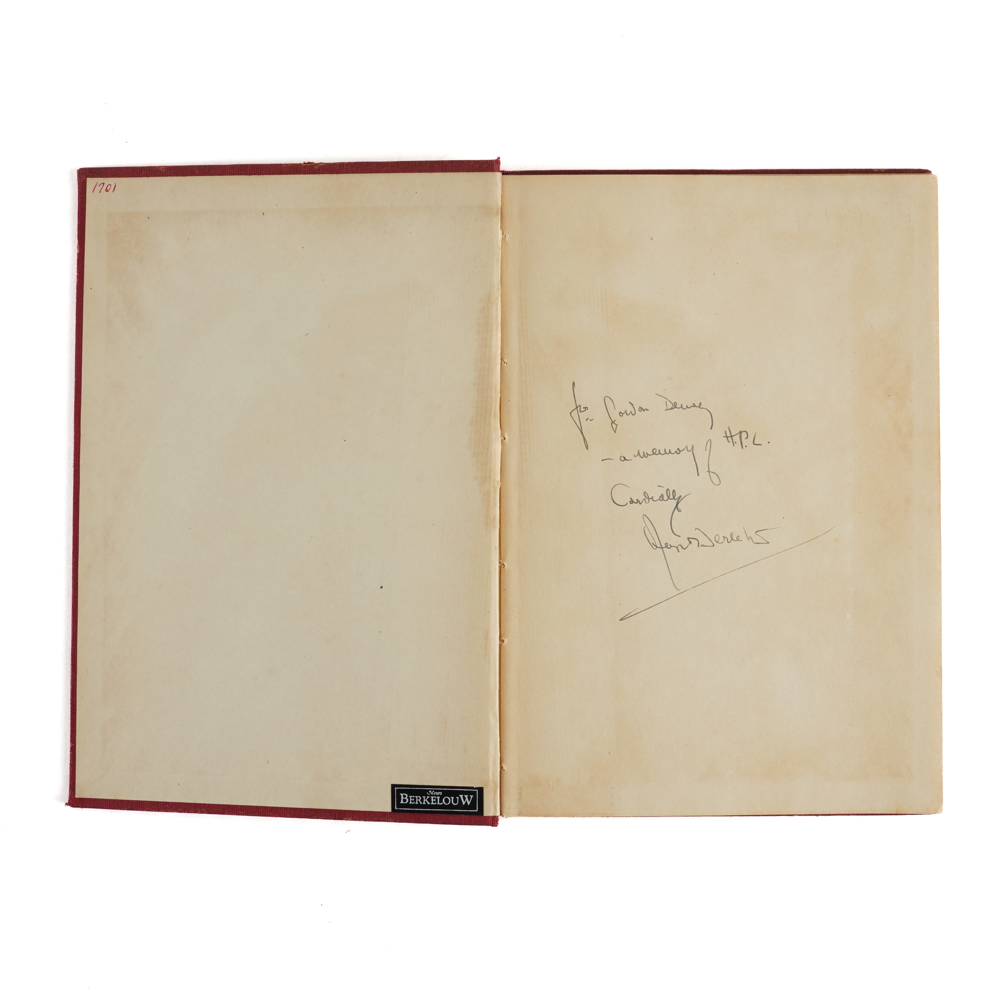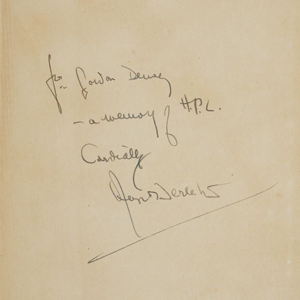 LOVECRAFT, H. P. (1890-1937) - August DERLETH (1909-71). H. P. L.: a memoir. New York: Ben Abramson, 1945. 8vo (203 x 140mm). Half title, mounted portrait frontispiece of H. P. Lovecraft printed in red. Original red cloth, the spine lettered in gilt (some fading to the gilt lettering, without a dust-jacket). Provenance: Messrs. Berkelouw (small bookseller's label on the front pastedown). FIRST EDITION, PRESENTATION COPY, inscribed on the front free endpaper, "For Gordon Dewey - a memory of H. P. L. Cordially, August Derleth." Little is known of the recipient of this copy, George Gordon Dewey (1906-75), apart from the fact that he was a writer of science fiction stories and was a member of the Los Angeles Science Fiction Society. The memoir concludes with what must be the first bibliography of H. P. Lovecraft (pp.113-118).
