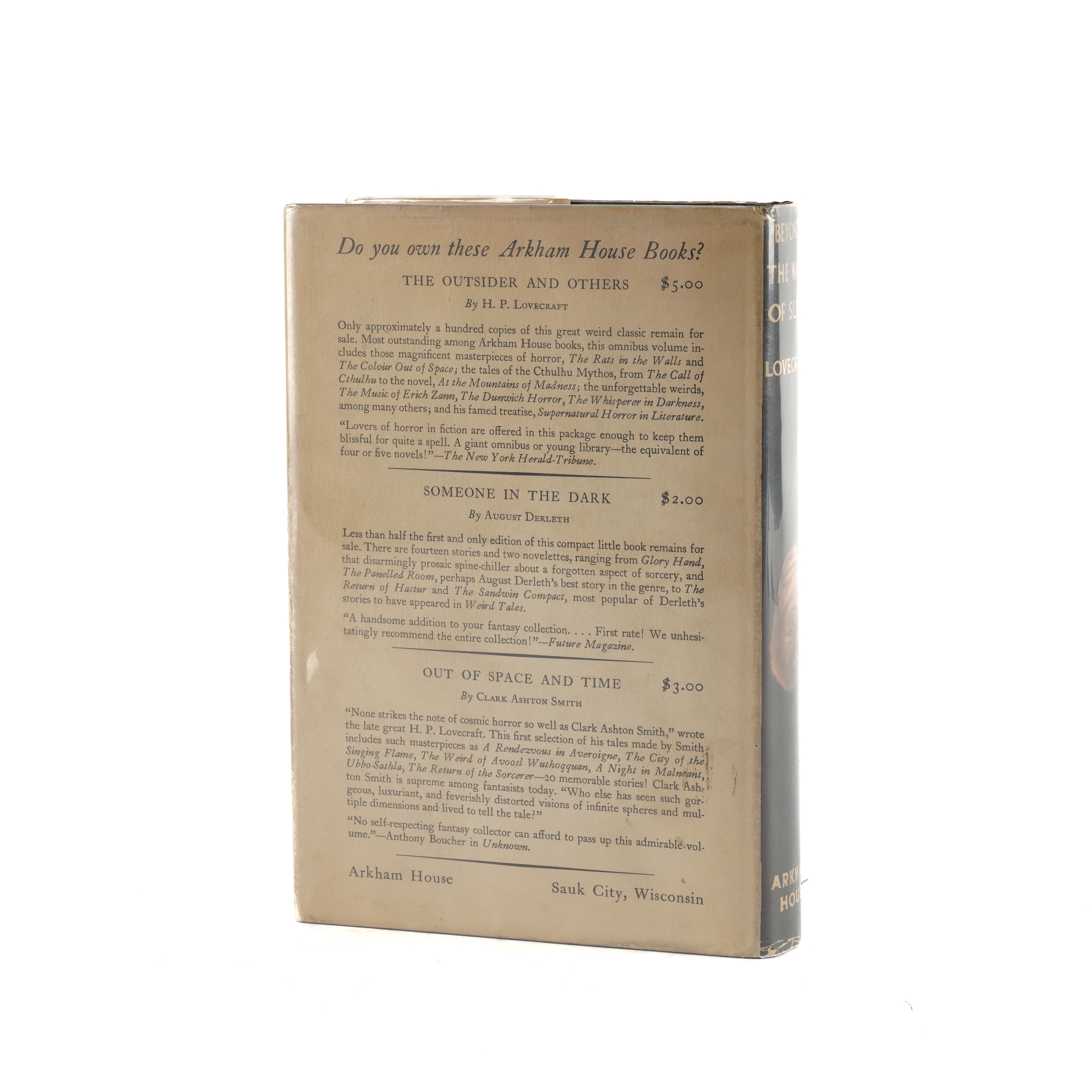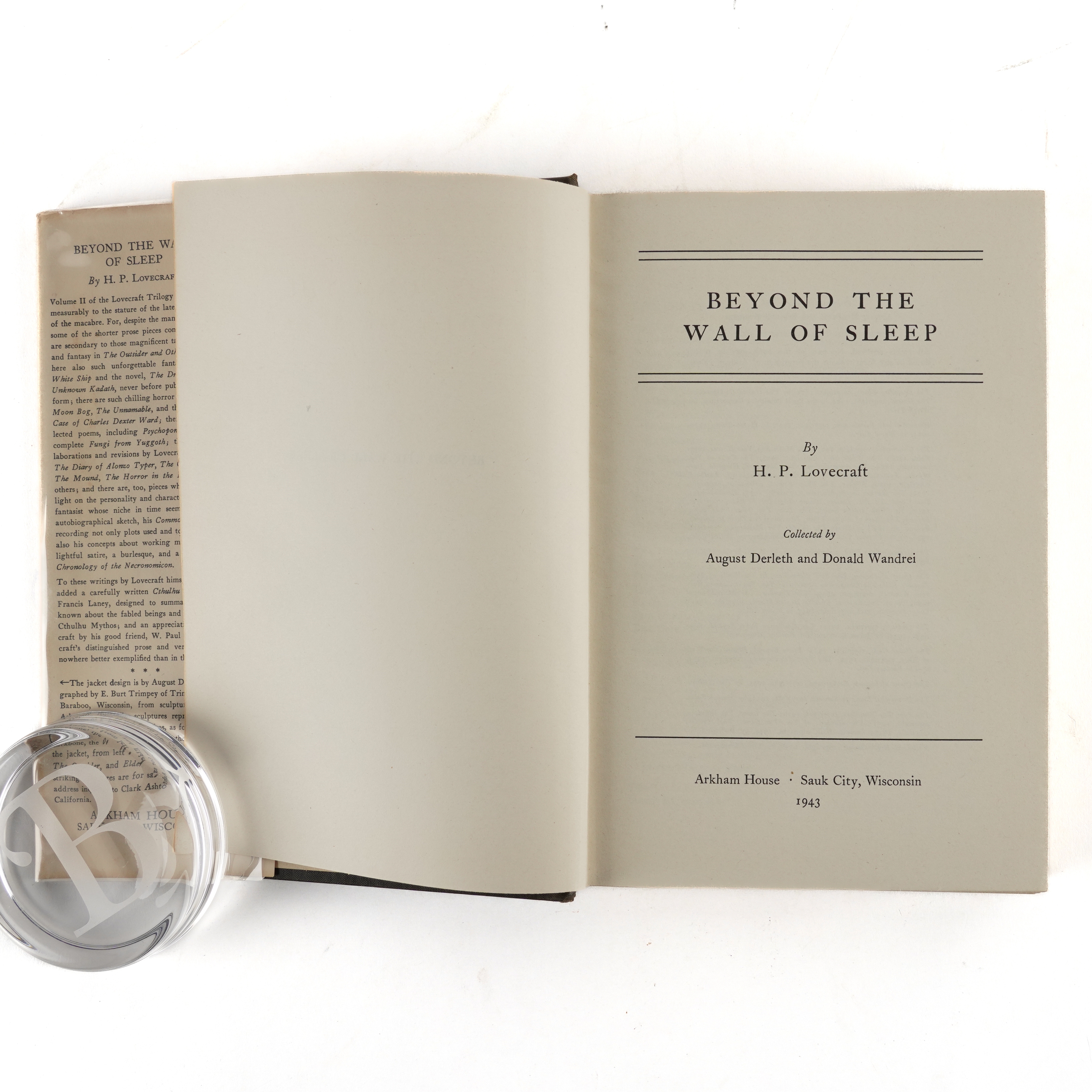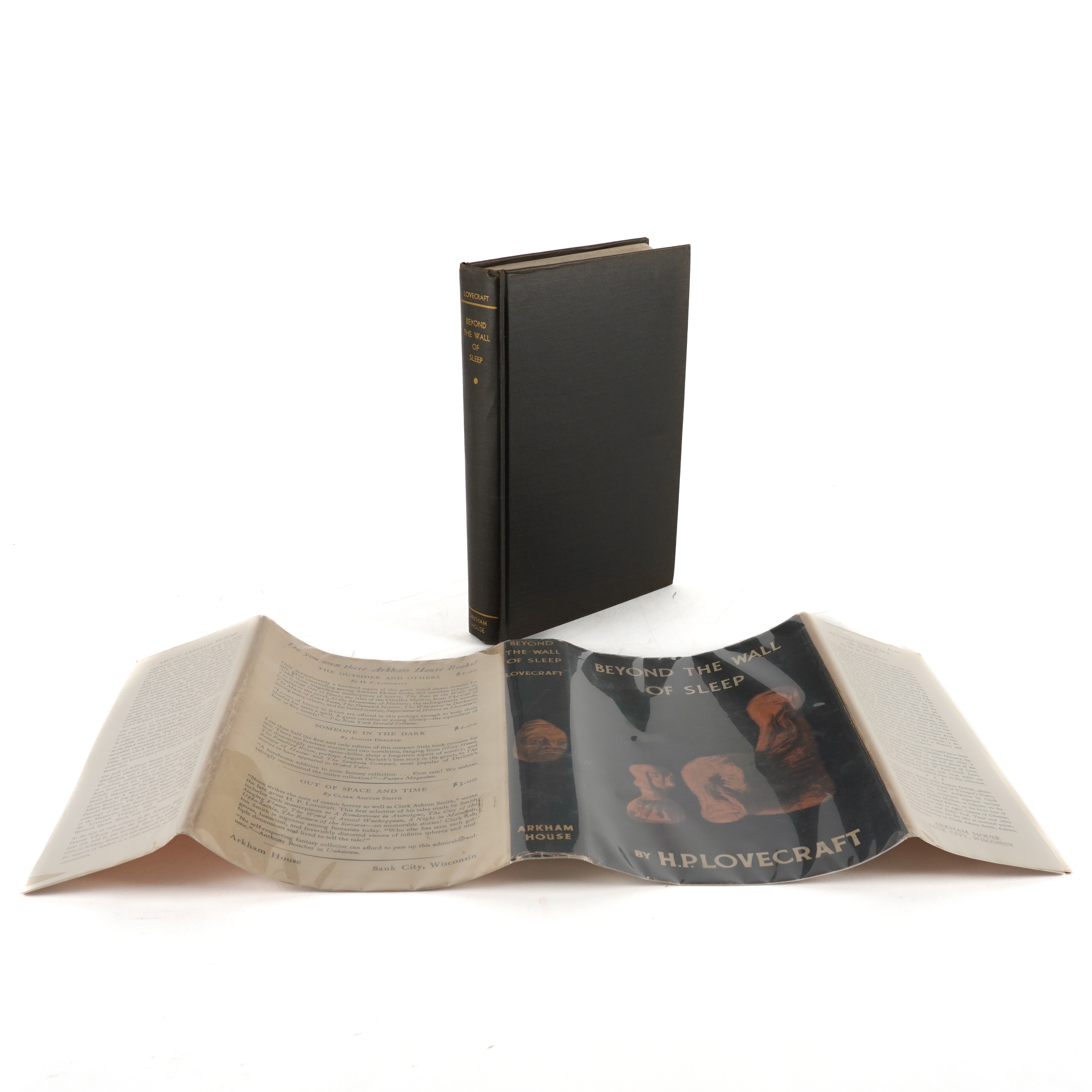 LOVECRAFT, H. P. (1890-1937). Beyond the Wall of Sleep ... Collected by August Derleth and Donald Wandrei. Sauk City, Wisconsin: Arkham House, 1943. Large 8vo (231 x 155mm). Half title. Original black cloth, the spine lettered in gilt (minor indentation to upper cover), the dust-jacket designed by August Derleth and photographed by E. Burt Trimpey from sculptures by Clark Ashton Smith and with the price of $5.00 unclipped (some creasing to the head and foot of the backstrip, lower wrapper lightly browned). Provenance: Harold J. Isaac (bookplate). FIRST EDITION of the second "omnibus" volume of the author's short stories, including two previously unpublished. A printed note at the end states: "Twelve hundred copies of this book have been printed by The Collegiate Press, George Banta Publishing Company, from linotype Caslon Old Face on Winnebago Eggshell. The binding cloth is Bancroft Arrestox, black natural finish." The Introduction by August Derleth and Donald Wandrei opens: "When the late great Howard Philips Lovecraft died five years ago, he left a singularly fascinating body of work, to the collecting and publishing of which the editors of this volume and its predecessor dedicated themselves. It was almost immediately apparent that, whole by no means all the Lovecraft writings could be preserved, the best of those writings might be published in a trilogy of omnibus volumes. The material, moreover, fell easily into three groupings, of which the first was made up of the best prose fiction and the masterly exposition of Supernatural Horror in Literature. The second must clearly contain the remaining prose, fiction and non-fiction, selected poems, and various miscellaneous pieces, while the third must with equal certainty be a volume of Selected Letters. It with the present volume, the second in the projected trilogy, that we are here concerned ..." Please note that the original dust-jacket has been photographed in its modern protective archival Mylar wrapper, thereby avoiding any risk of damage through its temporary removal. Bleiler The Guide to Supernatural Fiction (1983) 1041; Currey Science Fiction and Fantasy Authors: A Bibliography (1979) p.320; Jaffery The Arkham House Companion (1992) 4; Joshi H. P. Lovecraft: A Comprehensive Bibliography (2009) A17: "... The second major omnibus of Lovecraft's work, containing a mix of stories, revisions, and poems; 1,217 copies." RARE.