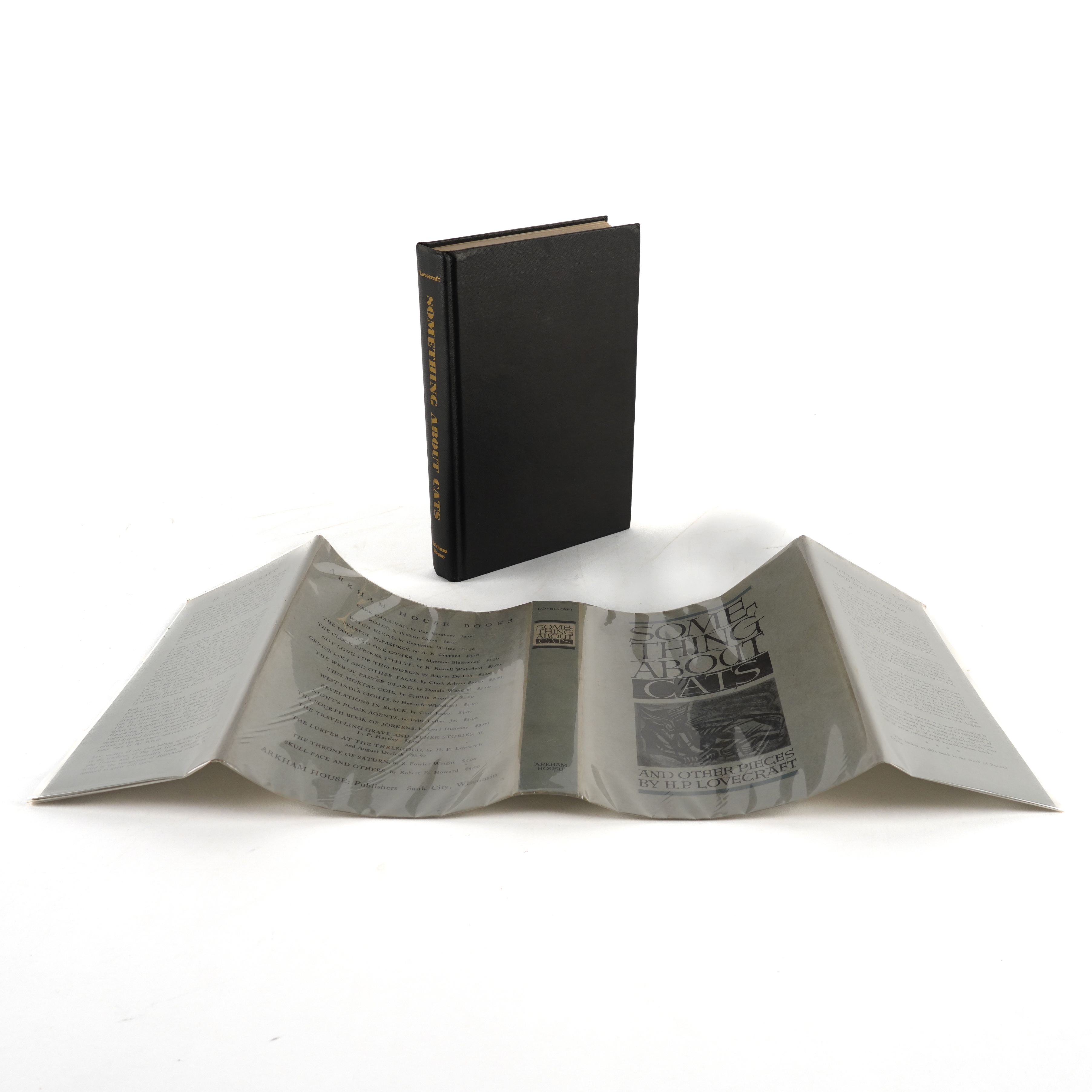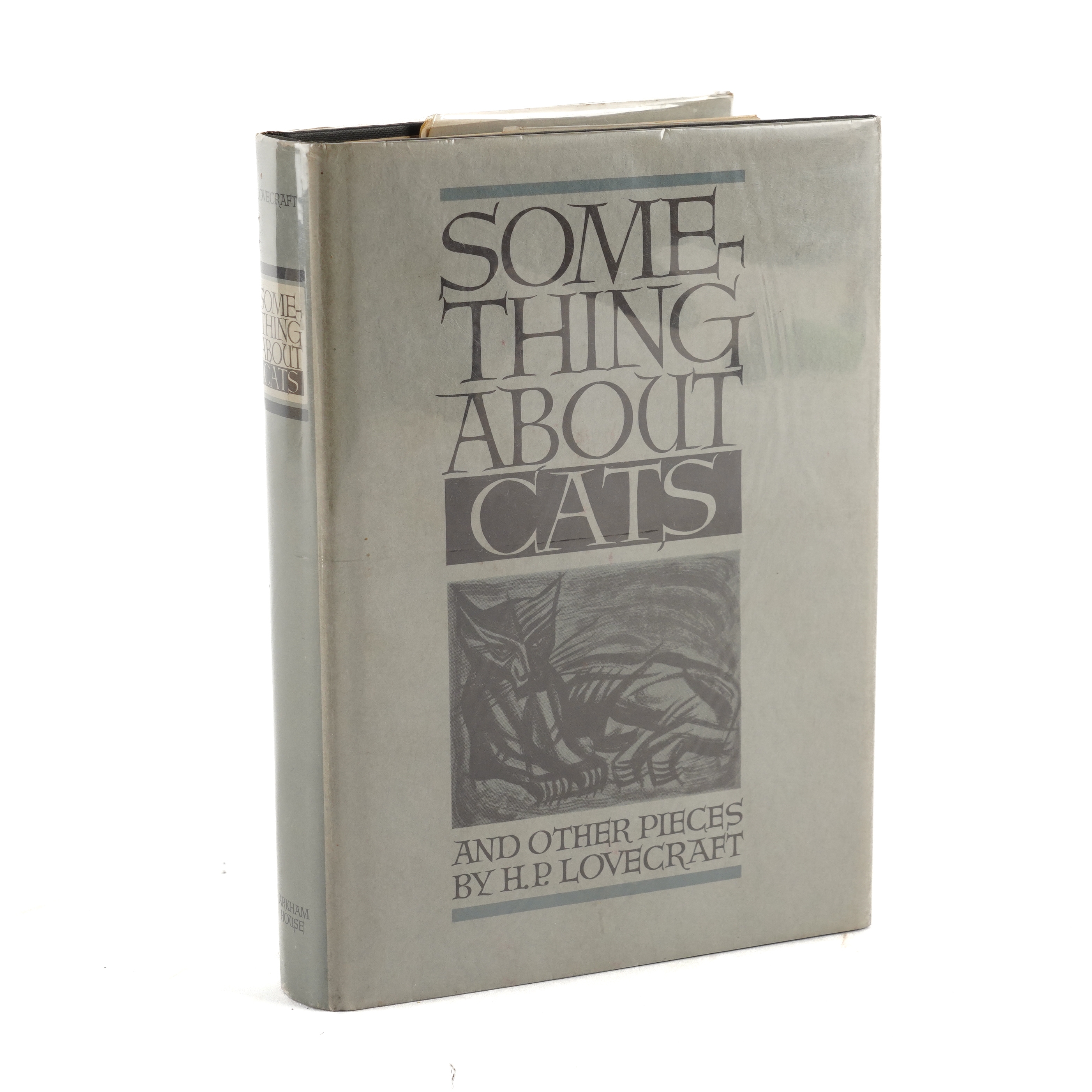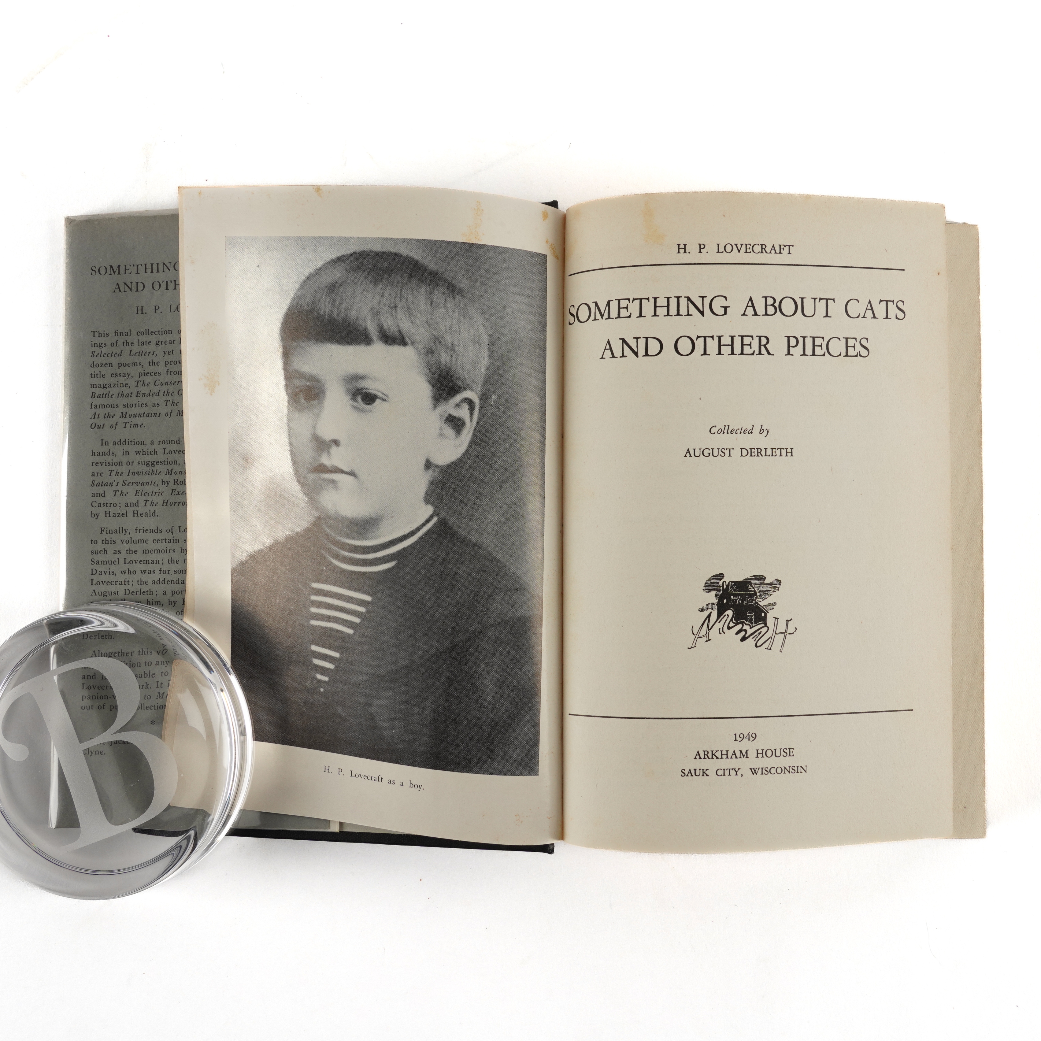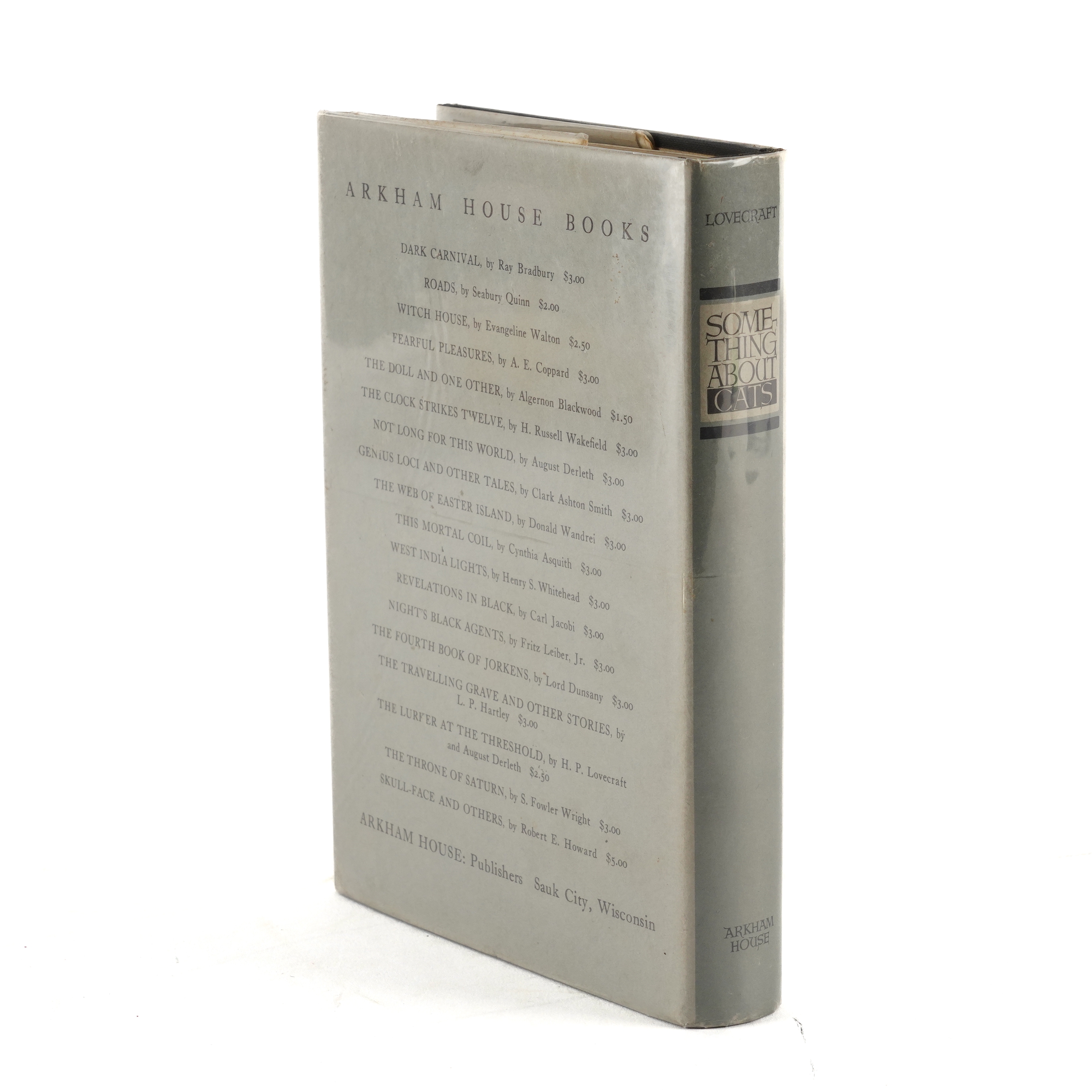 LOVECRAFT, H. P. (1890-1937). Something about Cats and Other Pieces. Collected by August Derleth. Sauk City, Wisconsin: Arkham House, 1949. 8vo (188 x 130mm). Half title, half tone frontispiece portrait, woodcut printer's device on the title, 4 full-page half tone illustrations, other illustrations in the text (some staining to the illustrations and adjacent text leaves). Original black cloth, the spine lettered in gilt, grey endpapers, dust-jacket by Ronald Clyne with the price of $3.00 unclipped. Provenance: Ross Gordon Graves, August, 1950 (colourful bookplate); some minor pencil annotation, both grudging ("Quite good. Style quite like H.P.L.'s" on p.25, at the end of Sonia H. Greene's story "The Invisible Monster") and more encouraging ("Good dramatic reading brings out the fine lines in this story" on p.30, at the end of the same author's story "Four O'Clock"). FIRST EDITION of this collection of Lovecraft's writings which includes, in addition, "a round half dozen stories by other hands, in which Lovecraft took part, either by revision or suggestion ..." (from the front turn-in). A printed note at the end states: "Three thousand copies [but 2,995 (!) according to Joshi] of this book have been printed from Intertype Garamond by the Collegiate Press, George Banta Publishing Company, Menasha, Wisconsin. The paper is Winnebago Eggshell. The binding cloth is Holliston Black Novelex." Please note that the original dust-jacket has been photographed in its modern protective archival Mylar wrapper, thereby avoiding any risk of damage through its temporary removal. Bleiler The Guide to Supernatural Fiction (1983) 1047; Jaffery The Arkham House Companion (1992) 38; Joshi H. P. Lovecraft. A Comprehensive Bibliography A25: "... Illustrations include photographs of Lovecraft, Sonia Davis, Adolphe de Castro, and facsimiles of illustrations and notes in Lovecraft's hand. 2,995 copies."