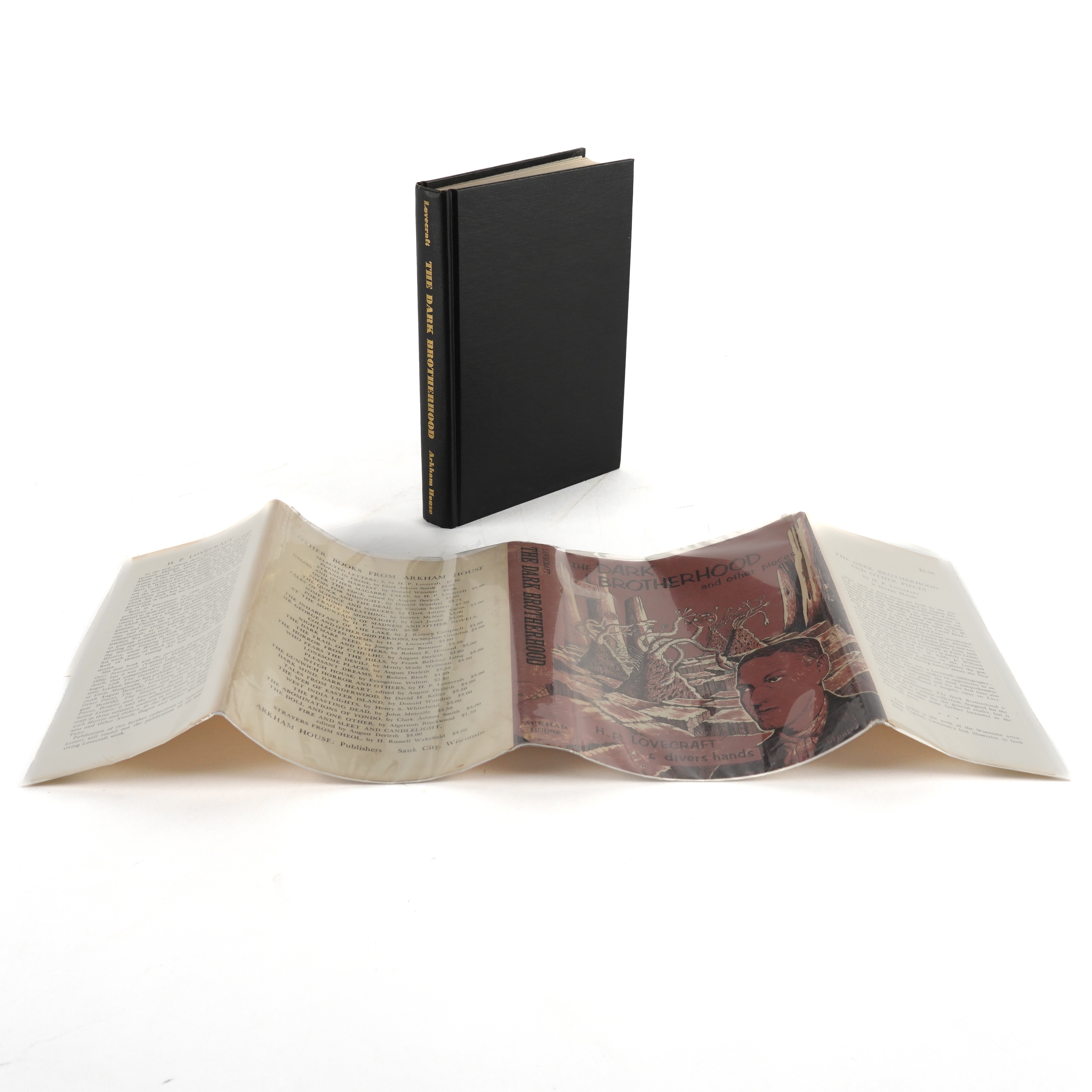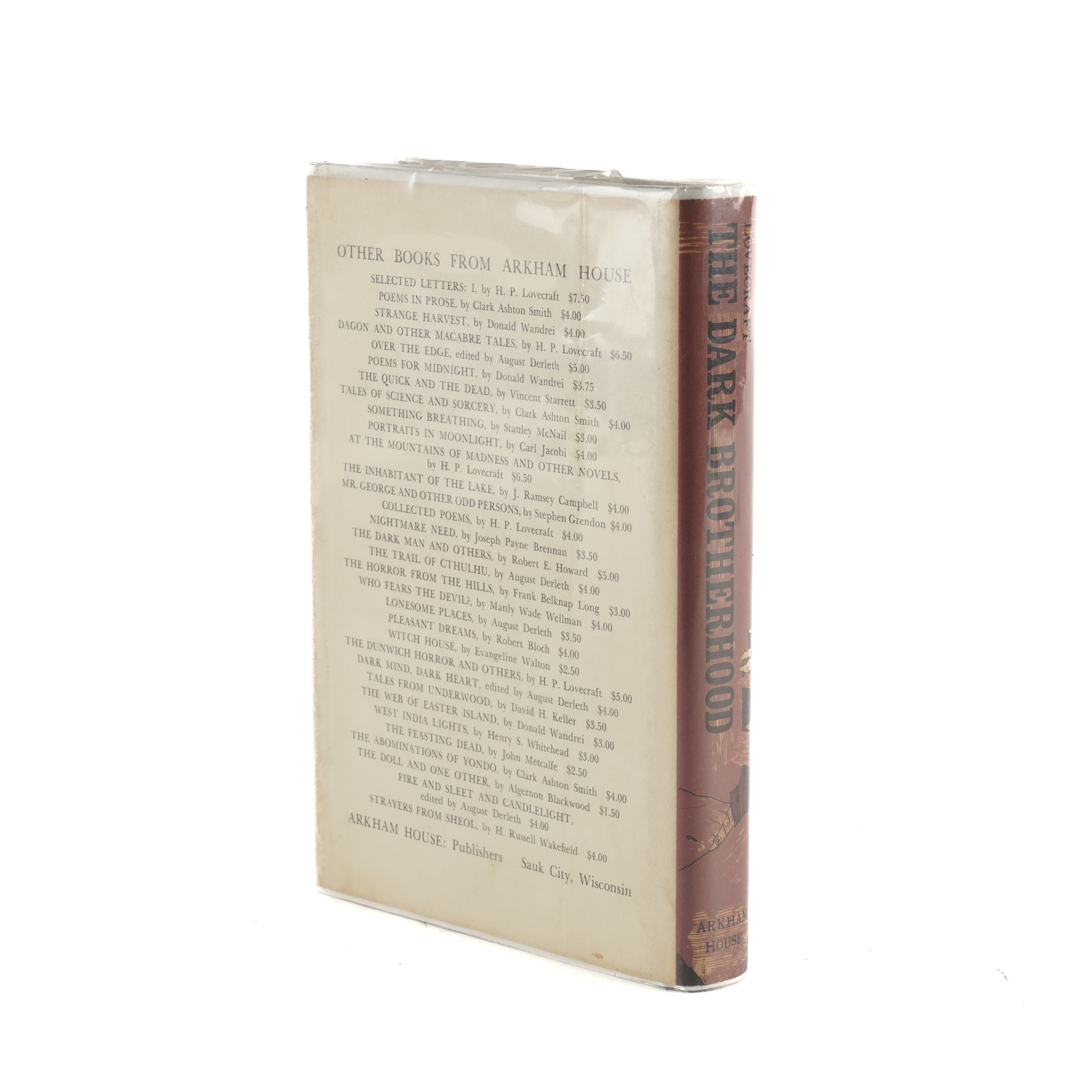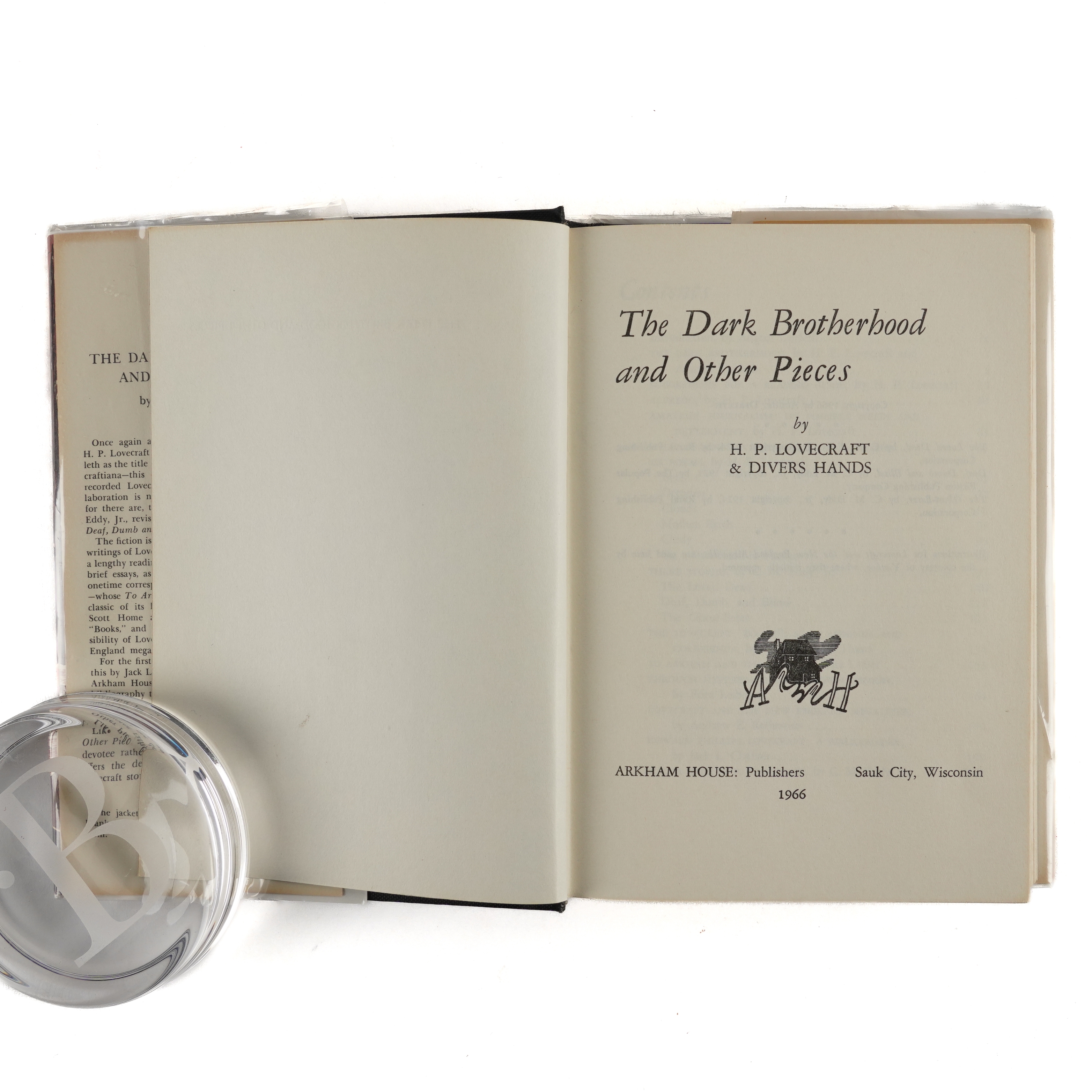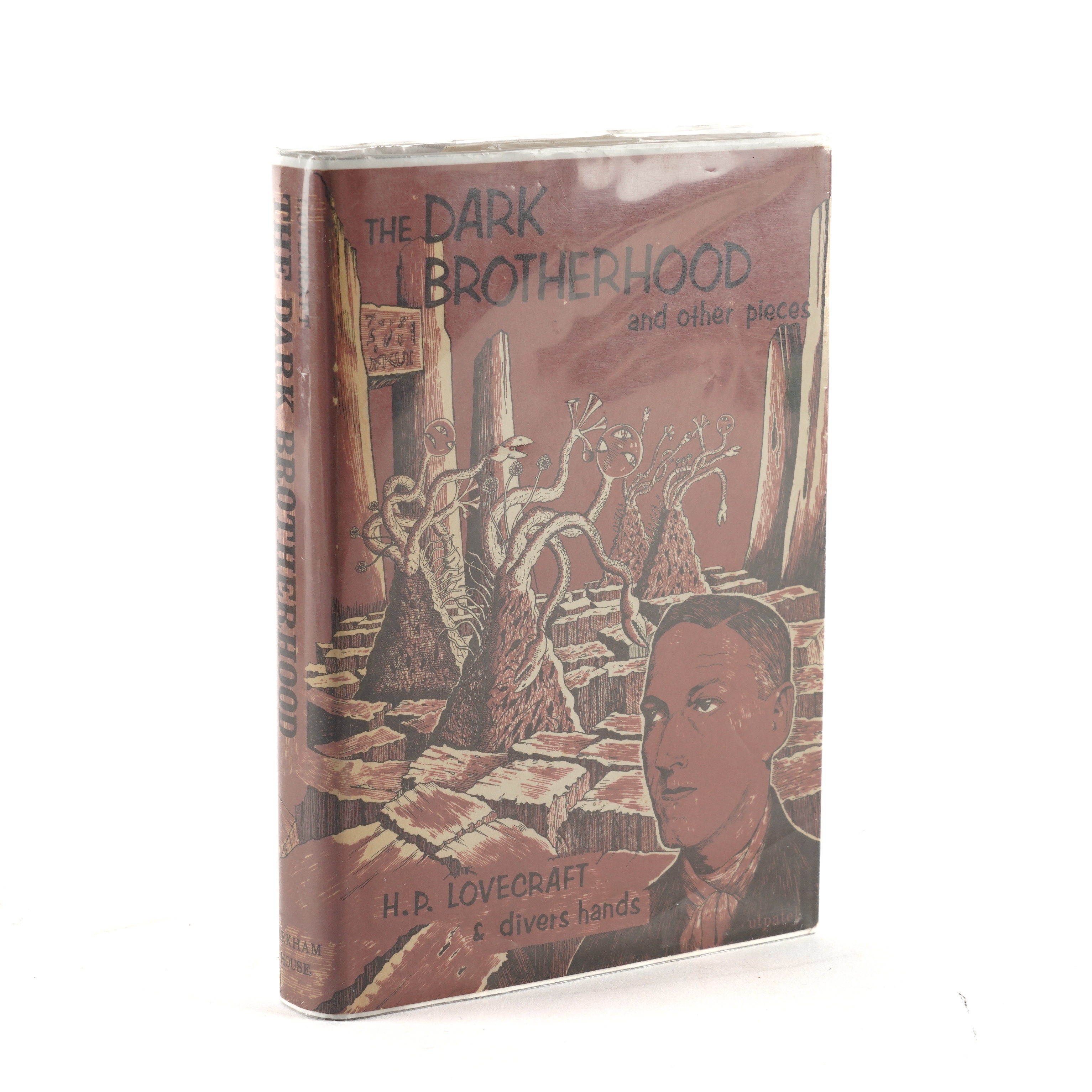 LOVECRAFT, H. P. (1890-1937). The Dark Brotherhood and Other Pieces by H. P. Lovecraft & Divers Hands. Sauk City, Wisconsin: Arkham House, 1966, 8vo (187 x 130mm). Half title, woodcut printer's device on the title, half tone plates and illustrations. Original black cloth, the spine lettered in gilt, the dust-jacket by Frank Utpatel with the price of $5.00 unclipped, grey endpapers (some staining to the internal edges of the jacket, the lower wrapper very lightly browned). Provenance: Michael S. Killoran (bookplate). FIRST EDITION. A printed note at the end states: "Thirty-five hundred copies of this book have been rpinted by The Collegiate Press, Georges Banta Company, Inc., Menasha, Wisconsin from Linotype Garamond on Winnebago Eggshell. The binding is Holliston Black Novelex." The work includes a bibliography of Lovecraft compiled by Jack Laurence Chalker, based on his previously privately-published work of 1962. Please note that the original dust-jacket has been photographed in its modern protective archival Mylar wrapper, thereby avoiding any risk of damage through its temporary removal. Bleiler The Guide to Supernatural Fiction (1983) 1057; Currey Science Fiction and Fantasy Authors: A Bibliography (1979) p.321; Jaffery The Arkham House Companion (1992) 94; Joshi H. P. Lovecraft: A Comprehensive Bibliography (2009) A43: "... Illustrations include photographs of C. M. Eddy Jr., the De Bry plate in Pigafetta's Regnum Congo (mentioned in 'The Picture in the House'), some New England megaliths, and illustrations by Clark Ashton Smith, Virgil Finlay, Utpatel, and others. 3,460 copies."