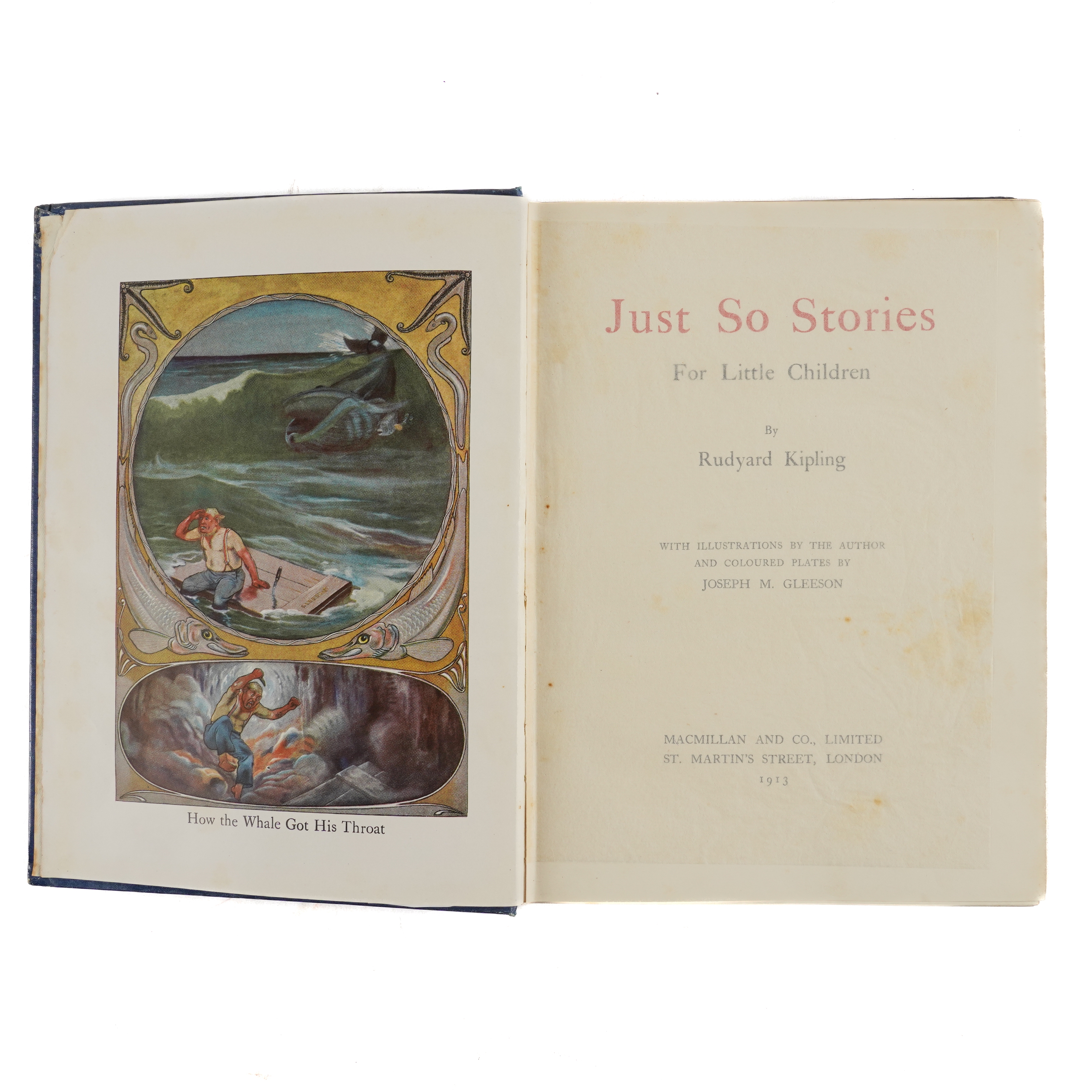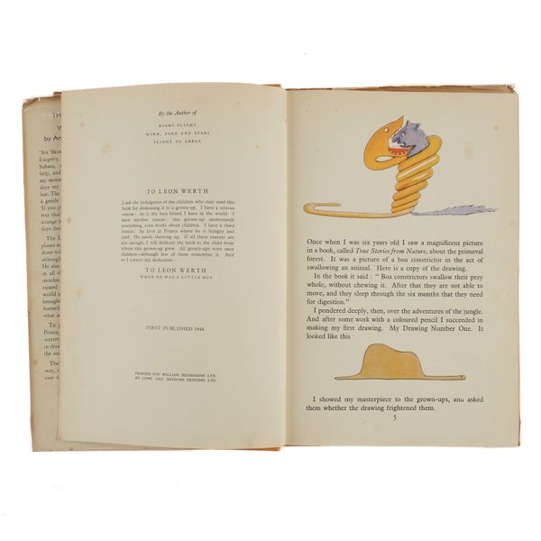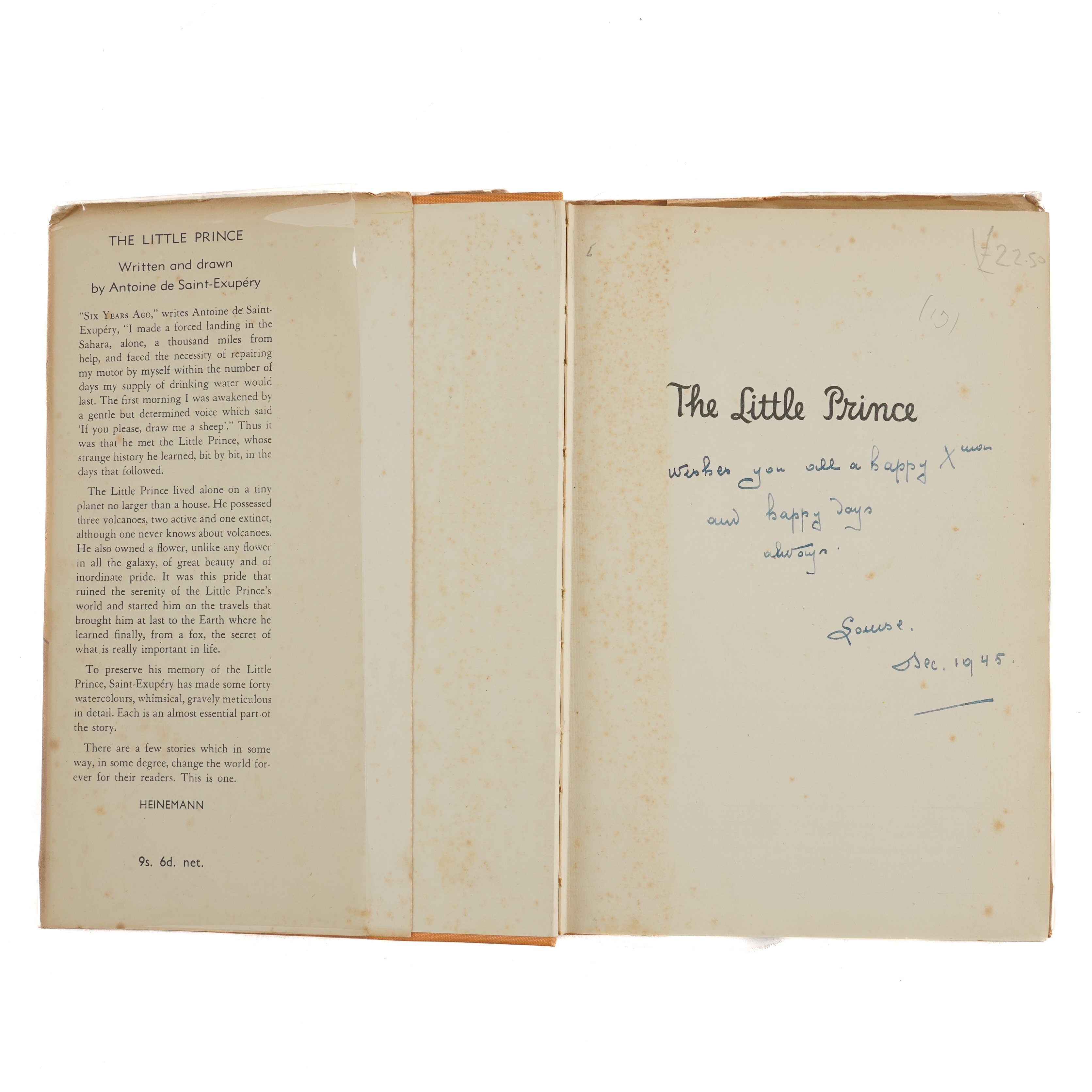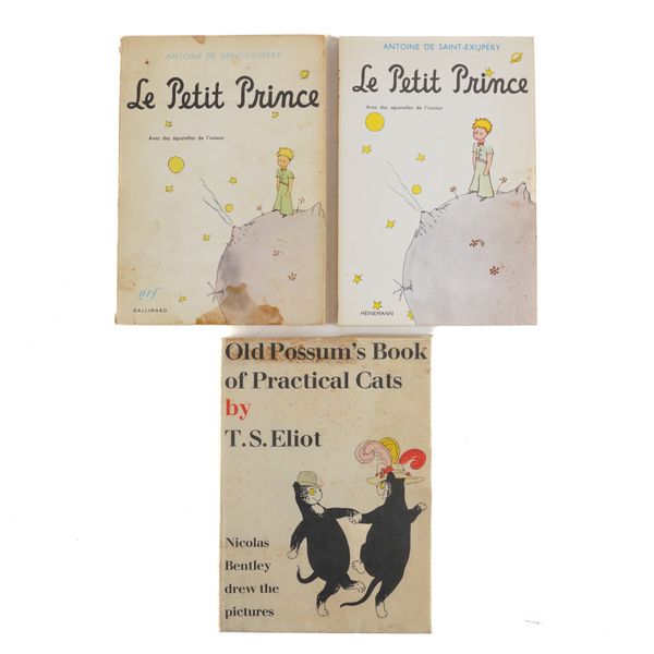 SAINT-EXUPÉRY, Antoine de (1900-44). The Little Prince ... Translated from the French by Katherine Woods. London: William Heinemann, 1944. Large 8vo (220 x 150mm). Half title, coloured illustrations by the author, 91-pages (vertical section to the left of the half title spotted, some very faint mainly marginal spotting and staining, more pronounced to the final leaf). Original salmon-pink pictorial cloth (a patch of very light spotting to the lettering on the upper cover), dust-jacket with the price of 9s. 6d. unclipped (endpapers spotted, minor erosion to the head and foot of the backstrip, a few short tears, a few small stains to the upper wrapper, turn-ins lightly spotted, lightly browned). Provenance: [The Little Prince] "... wishes you all a happy Xmas and happy days always. Louise. Dec. 1945" (inscription on the half title incorporating its printed title). THE FIRST EDITION TO BE PRINTED IN THE U.K., and preceding the first edition to be published in France. "The Little Prince" has a complicated printing history, exacerbated by its wartime publication. It was first published in 1943 in French and English language editions by Reynal & Hithcock in New York, since the author's works at that time were banned in France by the Vichy regime. The first edition to be published in France was not until April 1946 (posthumously, following the author's mysterious disappearance as a pilot with the French Air Force during a reconnaissance mission in July 1944), although it was originally intended to have been published in time for Christmas of the previous year, the first after the end of the war. "There are a few stories which in some way, in some degree, change the world forever for their readers. This is one" (from the front turn-in). Boxall (ed.) 1001 Books (2006) p.422: "Saint-Exupéry's tale is a surreal one, defying the conventions of reality and entering into the realm of dreamscape, where the imagination can run riot. The narrator is gently led into a discovery of his capacity for imagining. And so the role reversal begins, and the child tutors the adult in the sacred art of wondering. Written during the final year of his life, Saint-Exupry's The Little Prince reads as a manifesto on how the adult life can and should be lived"; Grolier Children 88. RARE. With 4 other books including two later editions of the same work; and two others, namely, Rudyard Kipling's Just So Stories For Little Children ... With Illustrations by the Author and Coloured Plates by Joseph M. Gleeson (London, 1913, 4to, coloured plates and illustrations, fine original blue decorated cloth gilt, the first edition with coloured illustrations) and T. S. Eliot's Old Possum's Book of Practical Cats (London, 1953, seventh impression, coloured illustrations by Nicolas Bentley, original coloured pictorial cloth, dust-jacket). (5)