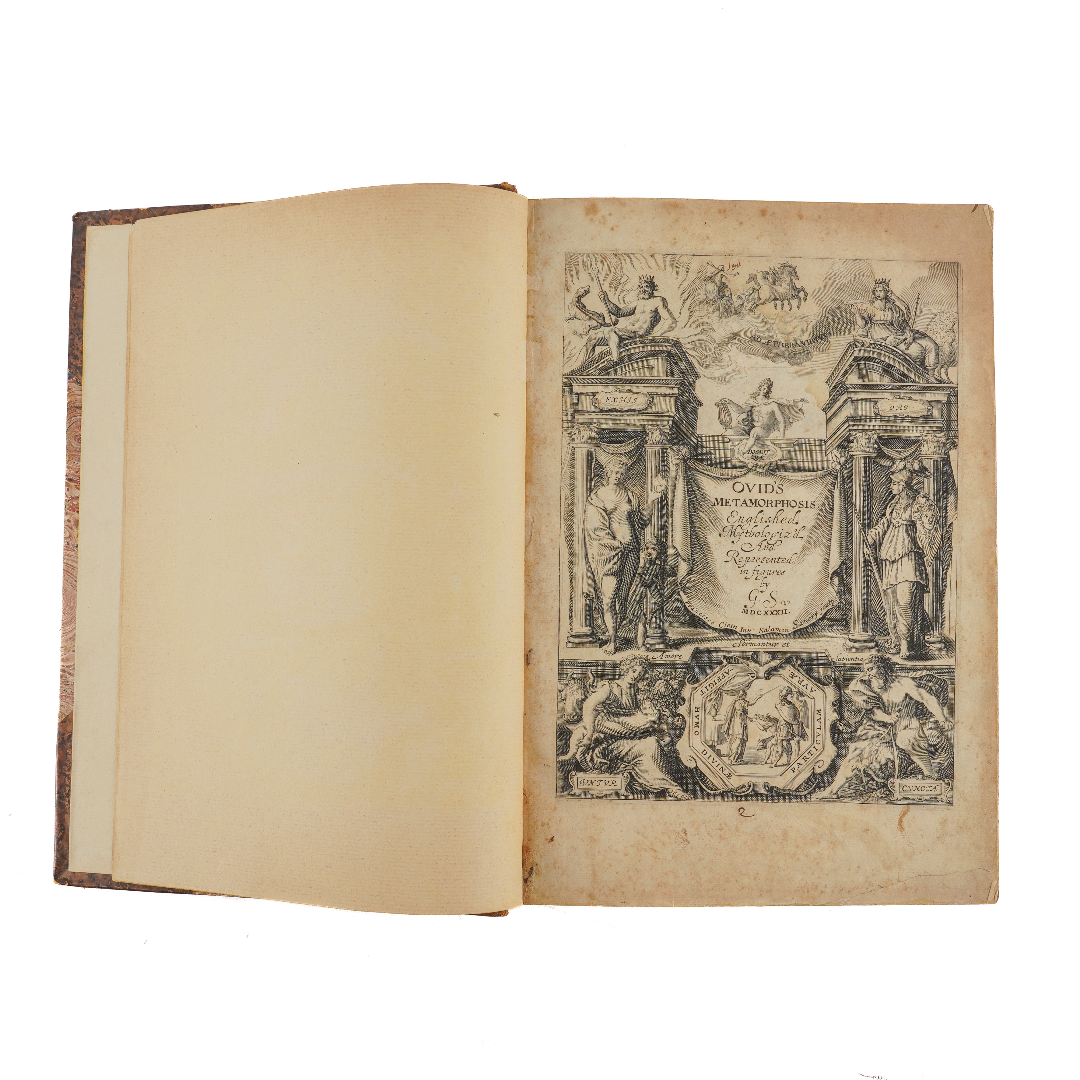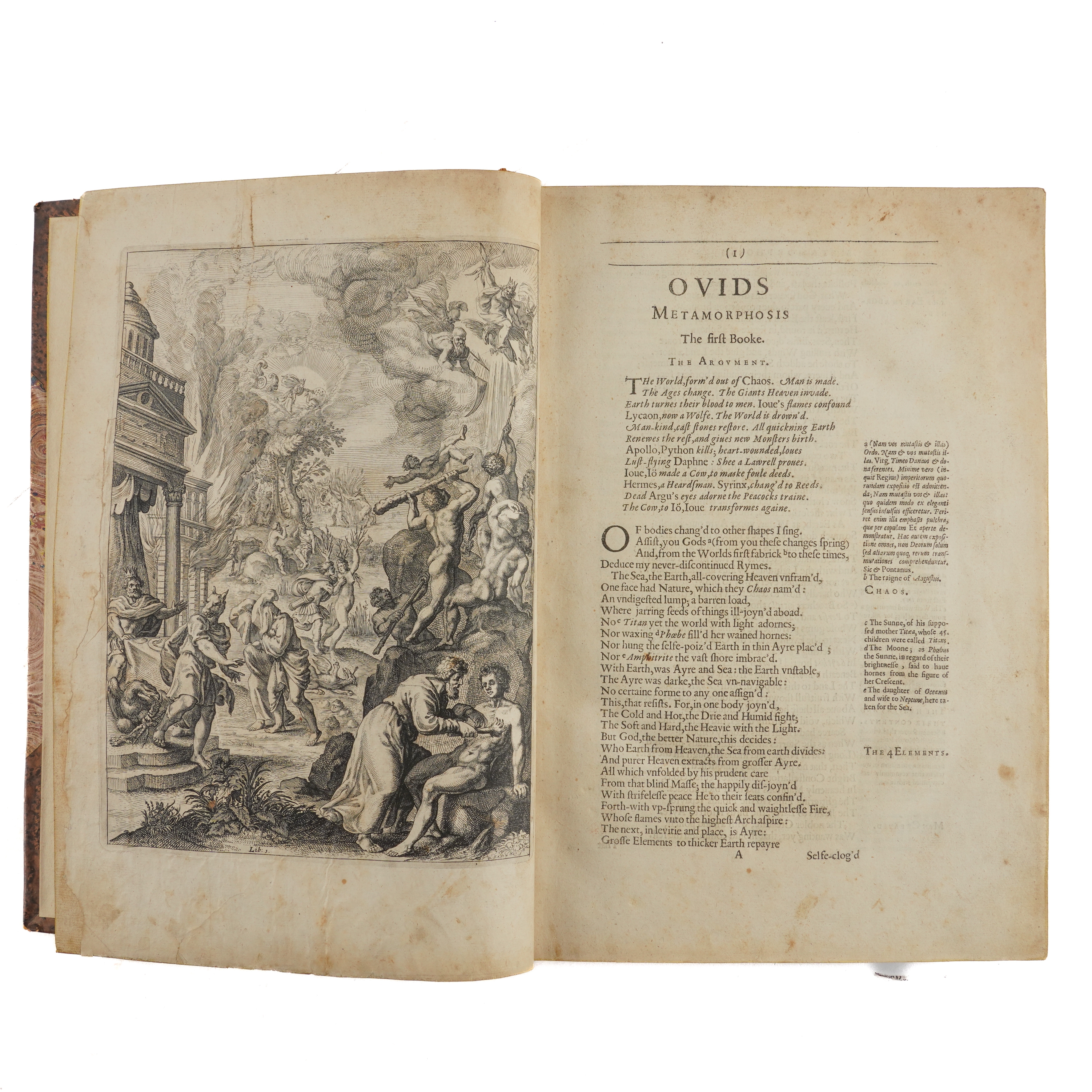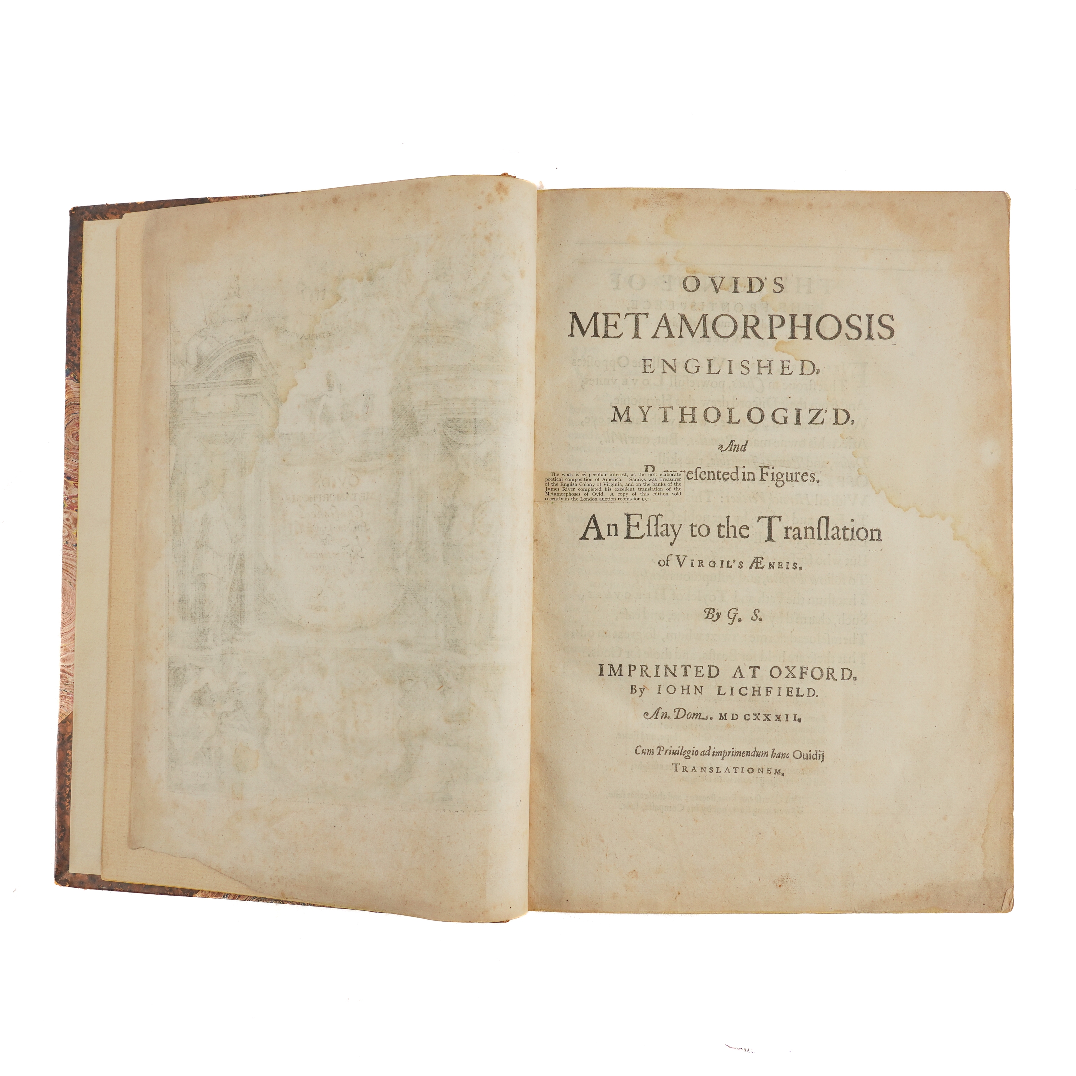 [SANDYS, George (1578-1644), translator]. Ovid's Metamorphosis Englished, Mythologiz'd, and Represented in Figures. An Essay to the Translation of Virgil's Æneis. By G. S. Oxford: John Lichfield, 1632. Folio (316 x 220mm). Additional engraved allegorical title, engraved portrait of Ovid, 15 engraved plates by Salomon Savery after Francis Clien, one-page of errata at the end (lacks text leaves G3-4 (i.e. pp.57-60), replaced by 4 later blank leaves; also lacks text leaves Mm1-2 (i.e. pp.481-484), replaced by 4 later blank leaves, part of the blank corner of the additional engraved title torn away without loss, the engraved title spotted and stained, the letterpress title stained, some mainly marginal spotting and staining throughout, a few darker spots or short ink lines, with several faults in the pagination, but complete apart from the missing leaves itemized above). 19th-century half mottled calf, spine gilt with red morocco lettering-piece (extremities and spine rubbed, later endpapers). Provenance: B. & J. F. Meehan, Export Booksellers, 32, Gay Street, Bath (small label on front pastedown). The second folio edition of Sandy's verse translation of Ovid's "Metamorphoses", and the first to include the engraved plates; the translation can also lay claim to being, at least in part, the first poetry written in English in the New World. "While in America Sandys completed a verse translation of Ovid's 'Metamorphoses,' which he had begun in England ... An elaborate edition in folio appeared at Oxford in 1632, under the title 'Ovid's Metamorphosis Englished, mythologized, and represented in Figures' ... In an address to the reader Sandys refers to this as the 'second edition carefully revised.' The engraved title-page, although resembling in design that of 1626, is new; it was the work of Francis Clein, and was engraved by Salomon Savery. Each of the fifteen books, as well as the 'Life of Ovid', is preceded by a full-page engraving. The first book of the 'Æneid' is alone attempted. The copy in the Bodleian Library, which lacks the engraved title, was the gift of Sandys ... Sandys' rendering of Ovid's 'Metamorphoses' has chiefly preserved his name in literary circles ..." (DNB). Please also see DNB for a full account of the work's complicated publishing history. A later printed catalogue description slip is inserted at the letterpress title in the present copy, stating, "The work is of peculiar interest, as the first elaborate poetical composition of America. Sandys was Treasurer of the English Colony of Virginia, and on the banks of the James River completed his excellent translation of the Metamorphosis of Ovid. A copy of this edition sold recently [date unspecified] in London for £31." Sabin 76458; STC 18966; not in Brunet.