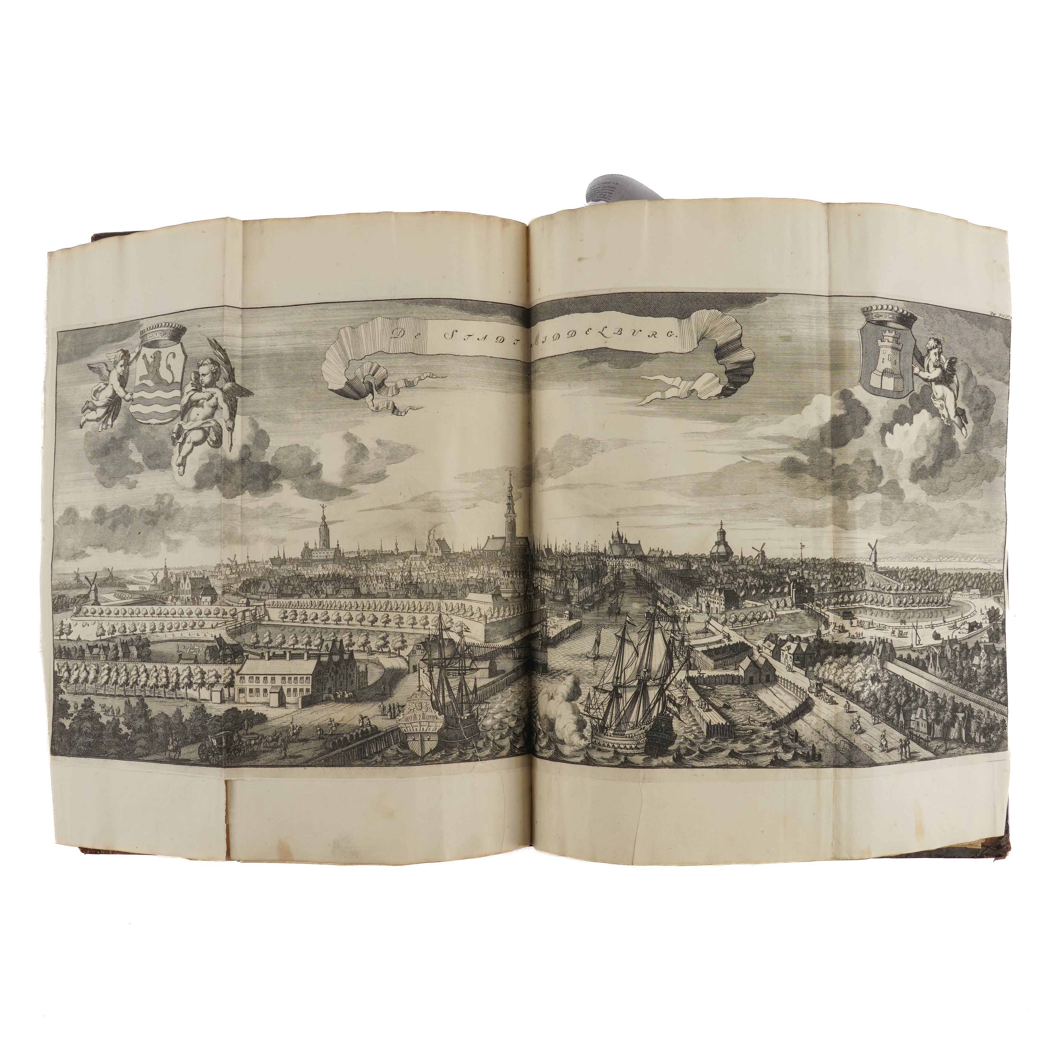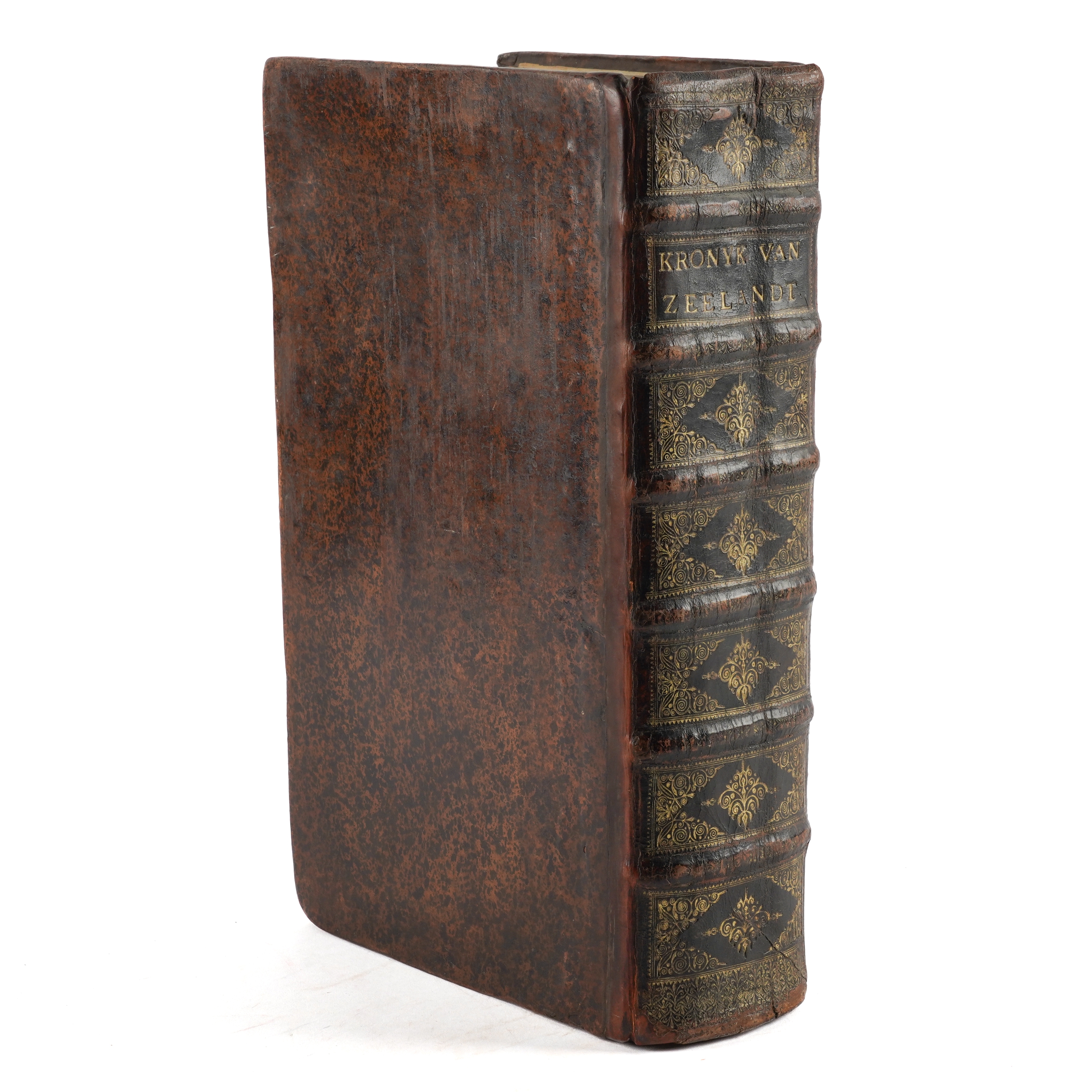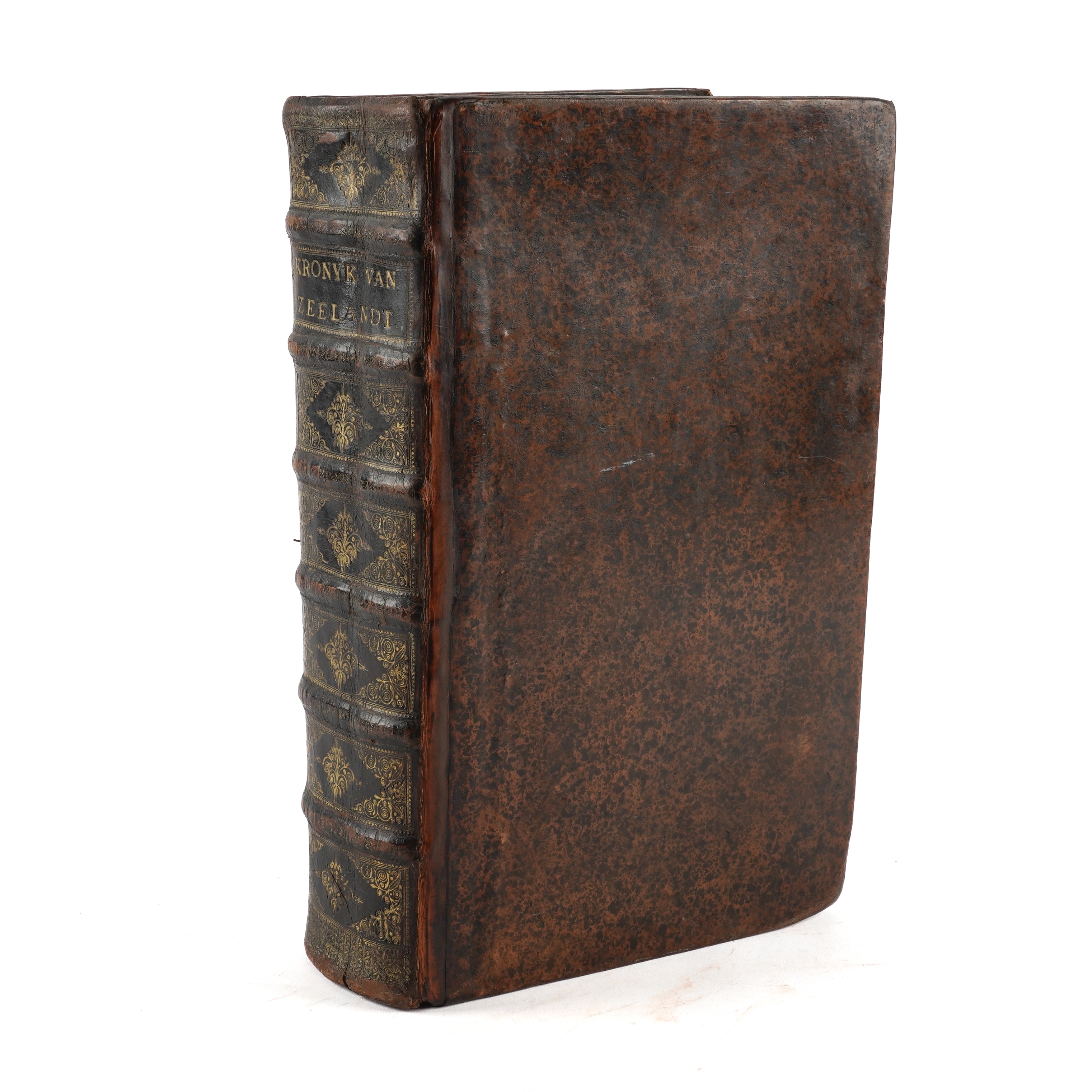 SMALLEGANGE, Matthaeus (1624-1710, editor and contributor). Nieuwe Cronyk Van Zeeland. Eerste Deel [all published], Vervattende De voor uitgegeven Cronyken van de Heeren, Jacobus Eyndius, en Johan Reygersberg, veel vermeerdert ontrent deses Landschaps Oudheden en Herkomsten, Wateren en Stroomen, Eilanden, Steden, en Heerlykheden. Middelburg: "By Joannes Meertens, Boekverkooper in de Gist-straet, en zyn mede te bekomen tot Amsterdam, by Abraham van Someren, Boekverkooper," 1696 [but 1700-[?]1704]. Part I only [all published], folio (374 x 225mm). Half title, engraved additional allegorical title by Joseph Mulder, title printed in red and black with engraved coat-of-arms, large folding engraved map mounted on a hinge, 2 further double-page engraved maps, 81 engraved plates, bird's-eye-views and heraldic plates (?only, of 87), most double-page or folding, text printed in double column, one engraved map in the text, initials and headpieces (2 plates laid down, a few repairs on versos, a few tears without loss, some light mainly marginal spotting and staining). Contemporary speckled calf, rebacked and recornered preserving the old spine in 7 compartments elaborately decorated in gilt (extremities lightly rubbed). Provenance: A. [?] Reigersberg Vresluys, Zwaluwenburg (old signature on half title). This copy does not include the leaves - which are often lacking - headed "Besluyt Tot de Zeelandsche Cronyk" at the end (?printed in 1704) announcing the second part of the work, which never materialised. FIRST EDITION. Nederlands Scheepvaartmuseum I, 347; Verkruijsse Mattheus Smallegange: Zeeuws Historicus, Genealoog En Vertaler: Discriptieve Persoonsbibliografie 1046.