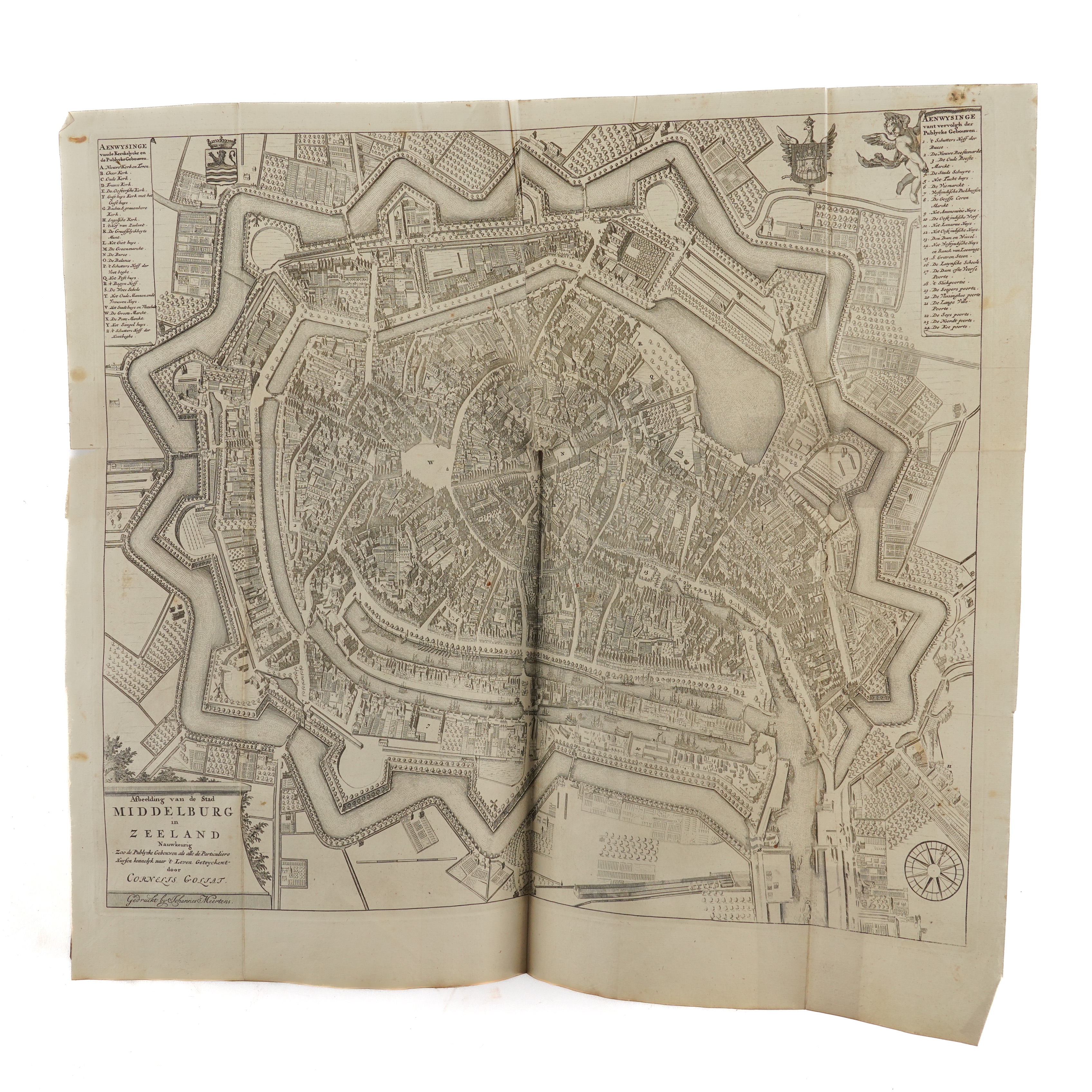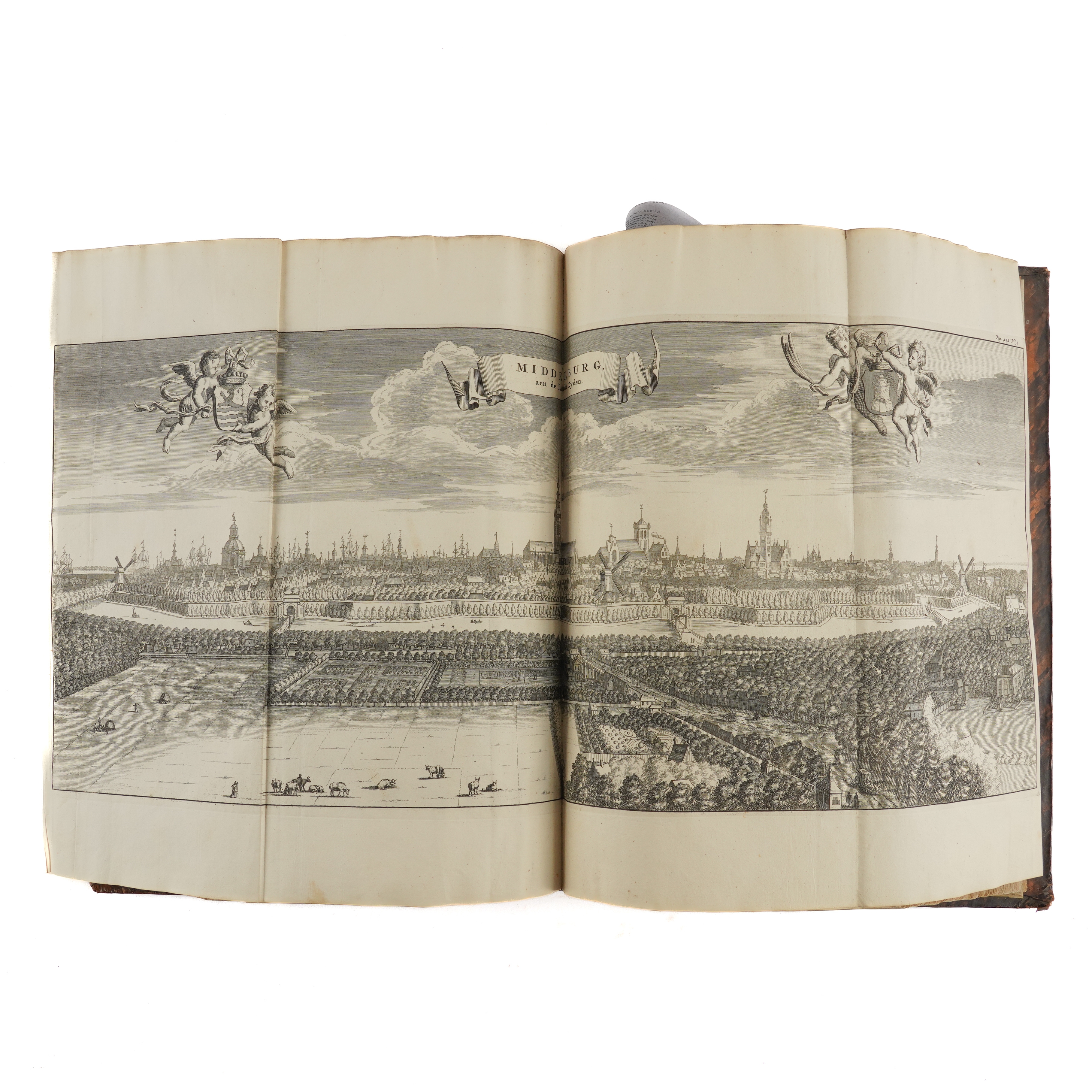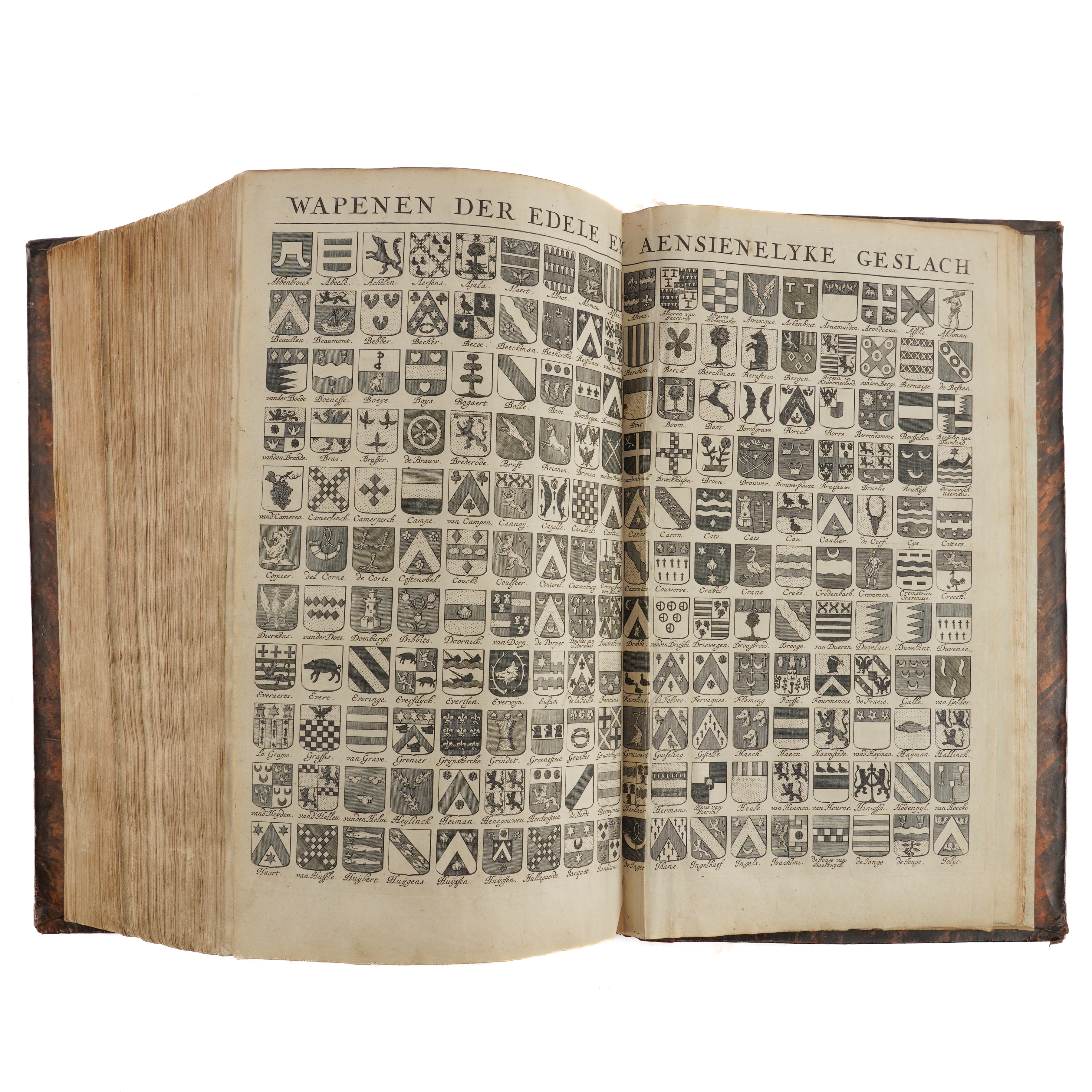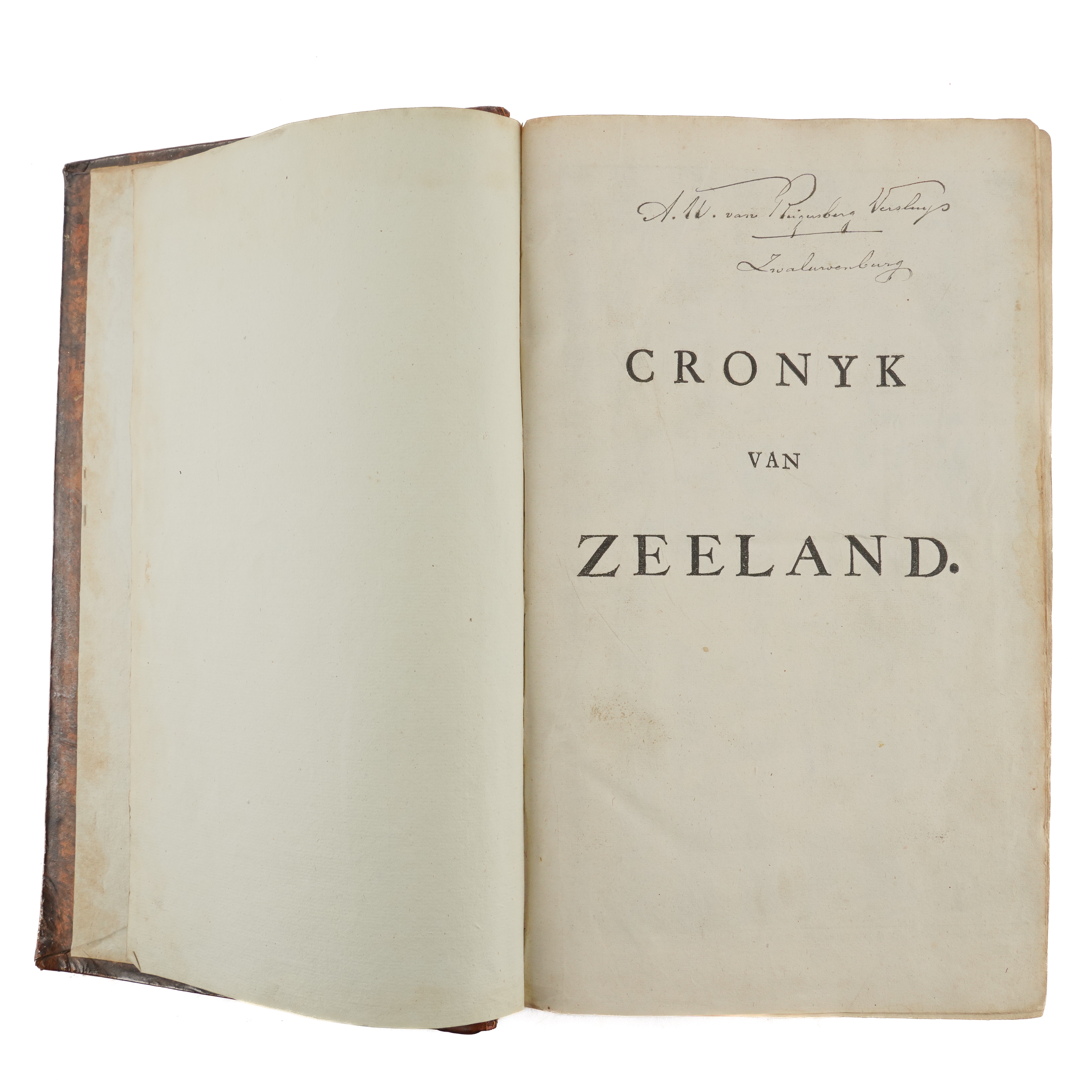 SMALLEGANGE, Matthaeus (1624-1710, editor and contributor). Nieuwe Cronyk Van Zeeland. Eerste Deel [all published], Vervattende De voor uitgegeven Cronyken van de Heeren, Jacobus Eyndius, en Johan Reygersberg, veel vermeerdert ontrent deses Landschaps Oudheden en Herkomsten, Wateren en Stroomen, Eilanden, Steden, en Heerlykheden. Middelburg: "By Joannes Meertens, Boekverkooper in de Gist-straet, en zyn mede te bekomen tot Amsterdam, by Abraham van Someren, Boekverkooper," 1696 [but 1700-[?]1704]. Part I only [all published], folio (374 x 225mm). Half title, engraved additional allegorical title by Joseph Mulder, title printed in red and black with engraved coat-of-arms, large folding engraved map mounted on a hinge, 2 further double-page engraved maps, 81 engraved plates, bird's-eye-views and heraldic plates (?only, of 87), most double-page or folding, text printed in double column, one engraved map in the text, initials and headpieces (2 plates laid down, a few repairs on versos, a few tears without loss, some light mainly marginal spotting and staining). Contemporary speckled calf, rebacked and recornered preserving the old spine in 7 compartments elaborately decorated in gilt (extremities lightly rubbed). Provenance: A. [?] Reigersberg Vresluys, Zwaluwenburg (old signature on half title). This copy does not include the leaves - which are often lacking - headed "Besluyt Tot de Zeelandsche Cronyk" at the end (?printed in 1704) announcing the second part of the work, which never materialised. FIRST EDITION. Nederlands Scheepvaartmuseum I, 347; Verkruijsse Mattheus Smallegange: Zeeuws Historicus, Genealoog En Vertaler: Discriptieve Persoonsbibliografie 1046.