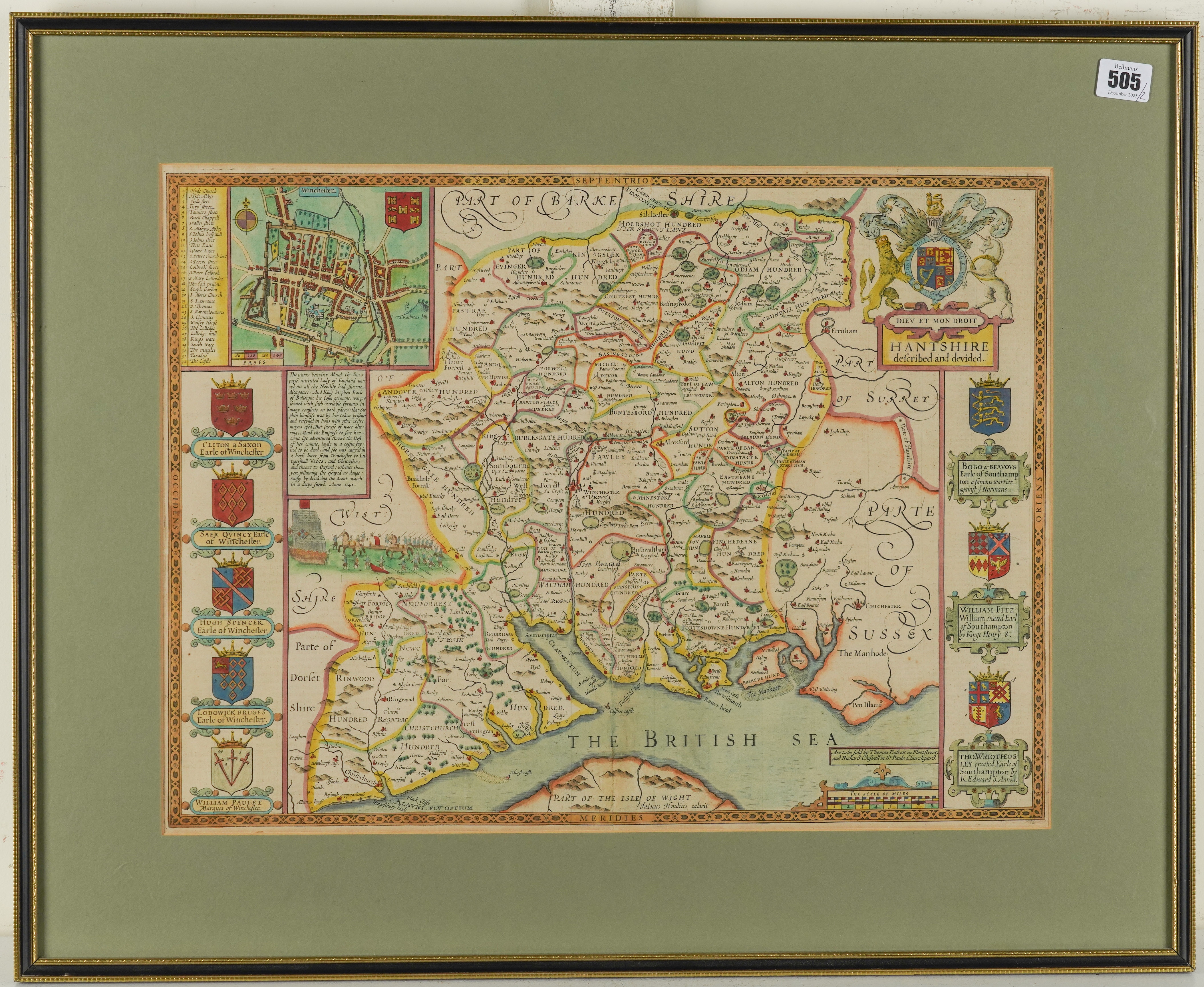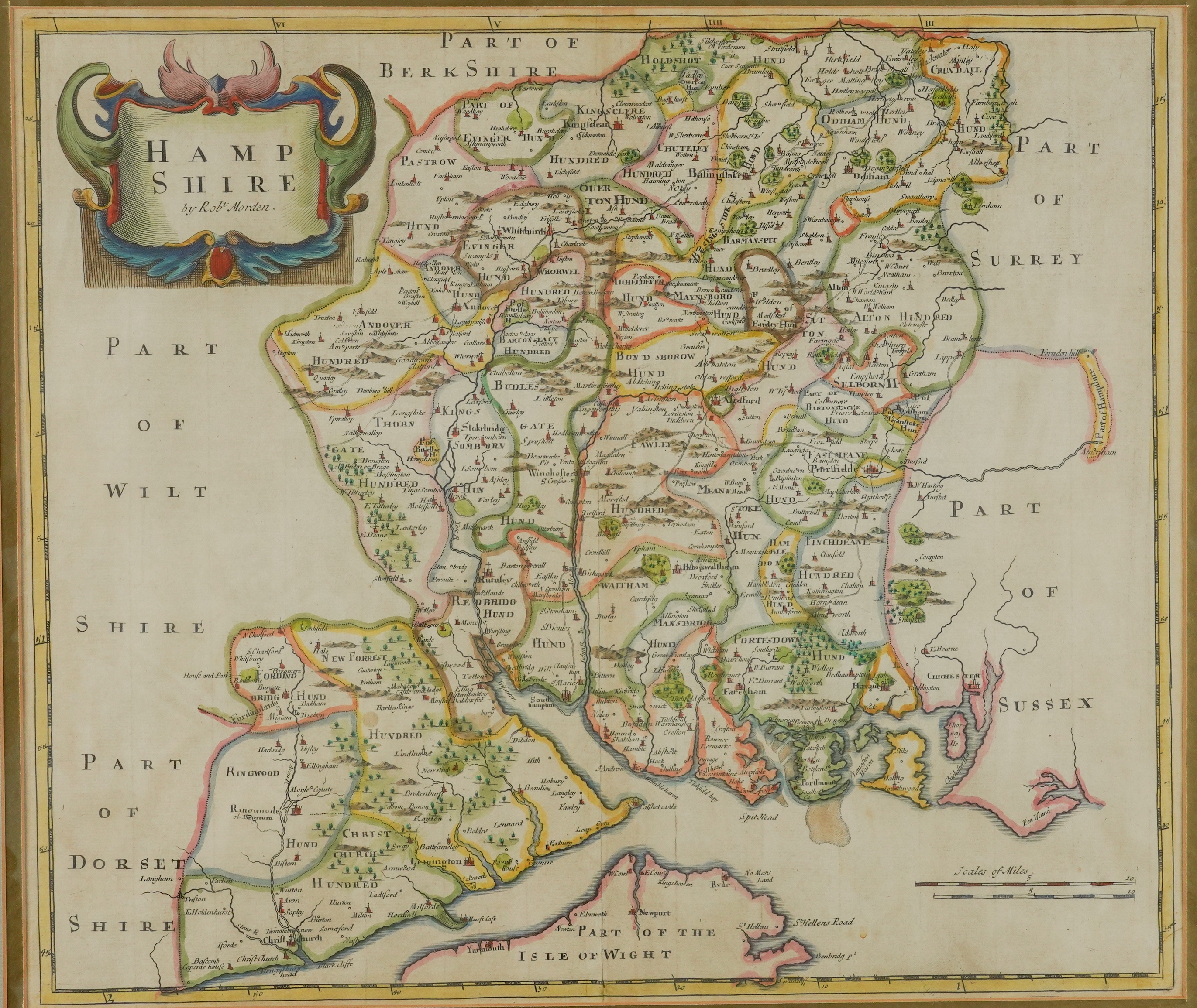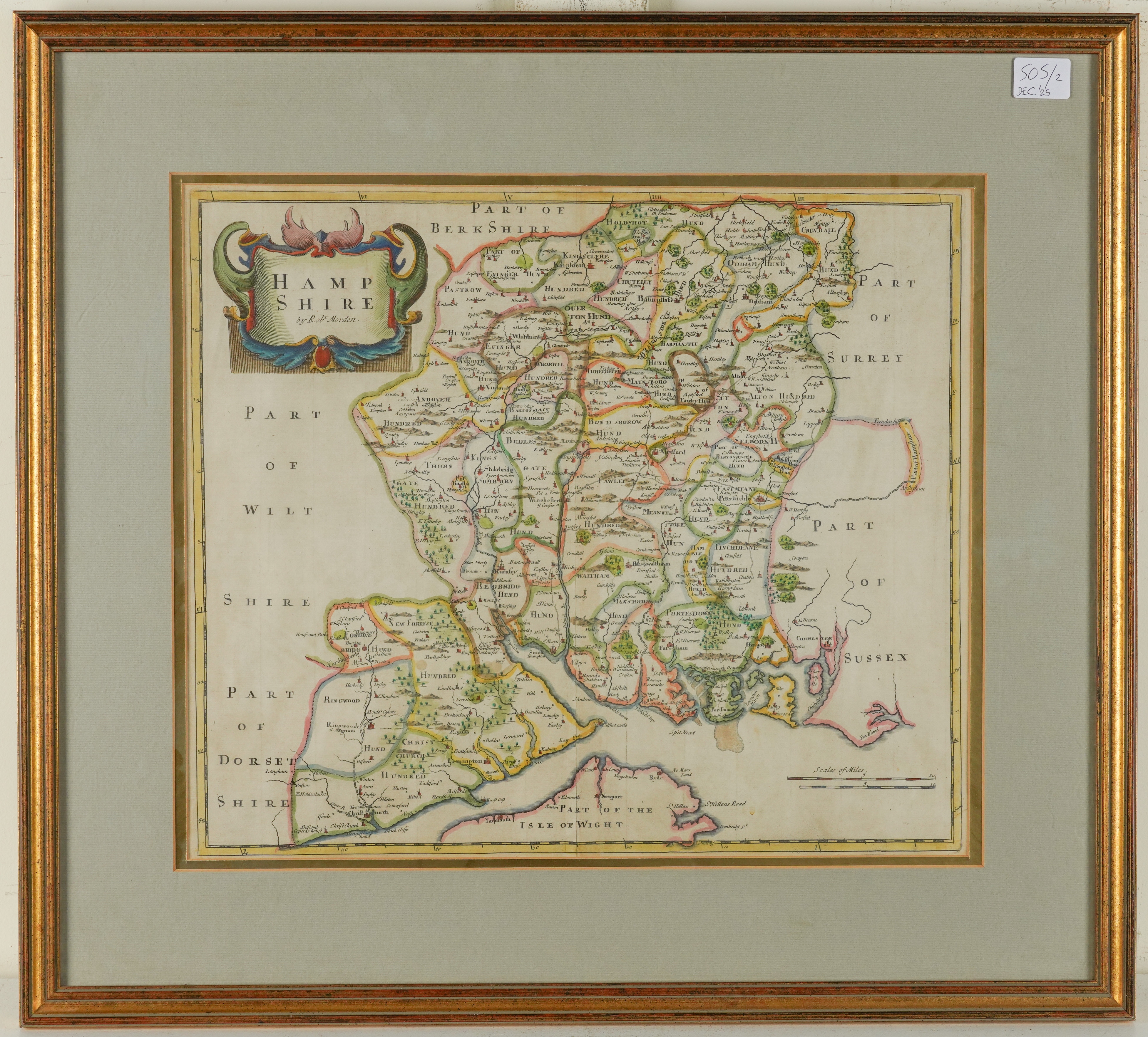 SPEED, John (1552-1629). Hantshire described and devided, [London, 1676], hand-coloured engraved map of Hampshire, inset bird's-eye-view of Winchester, 380 x 510mm., framed and glazed. A FINE COPY. With R. Morden's Hampshire (London, c.1695). (2)