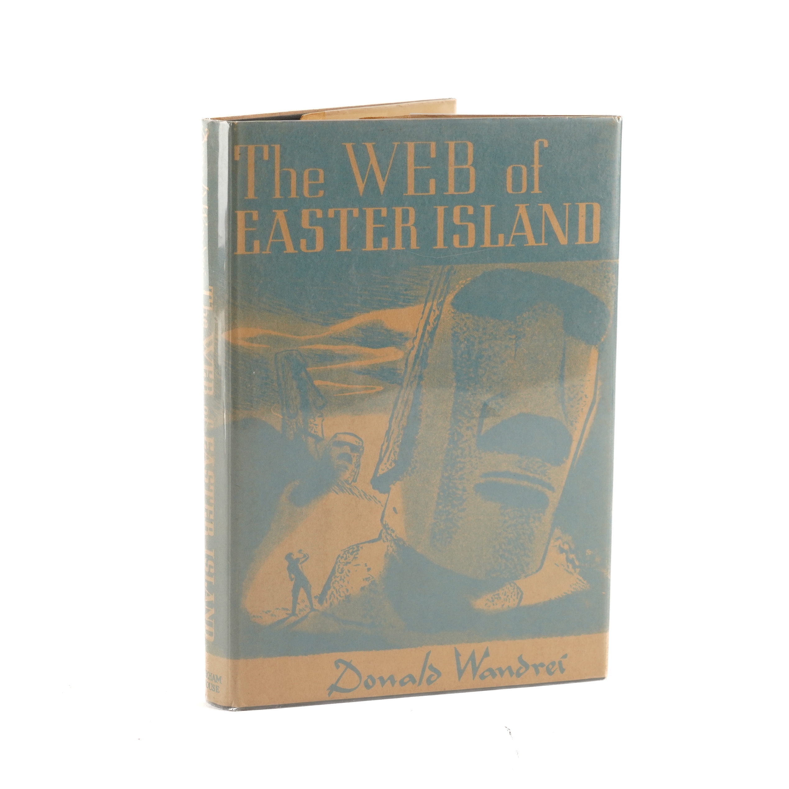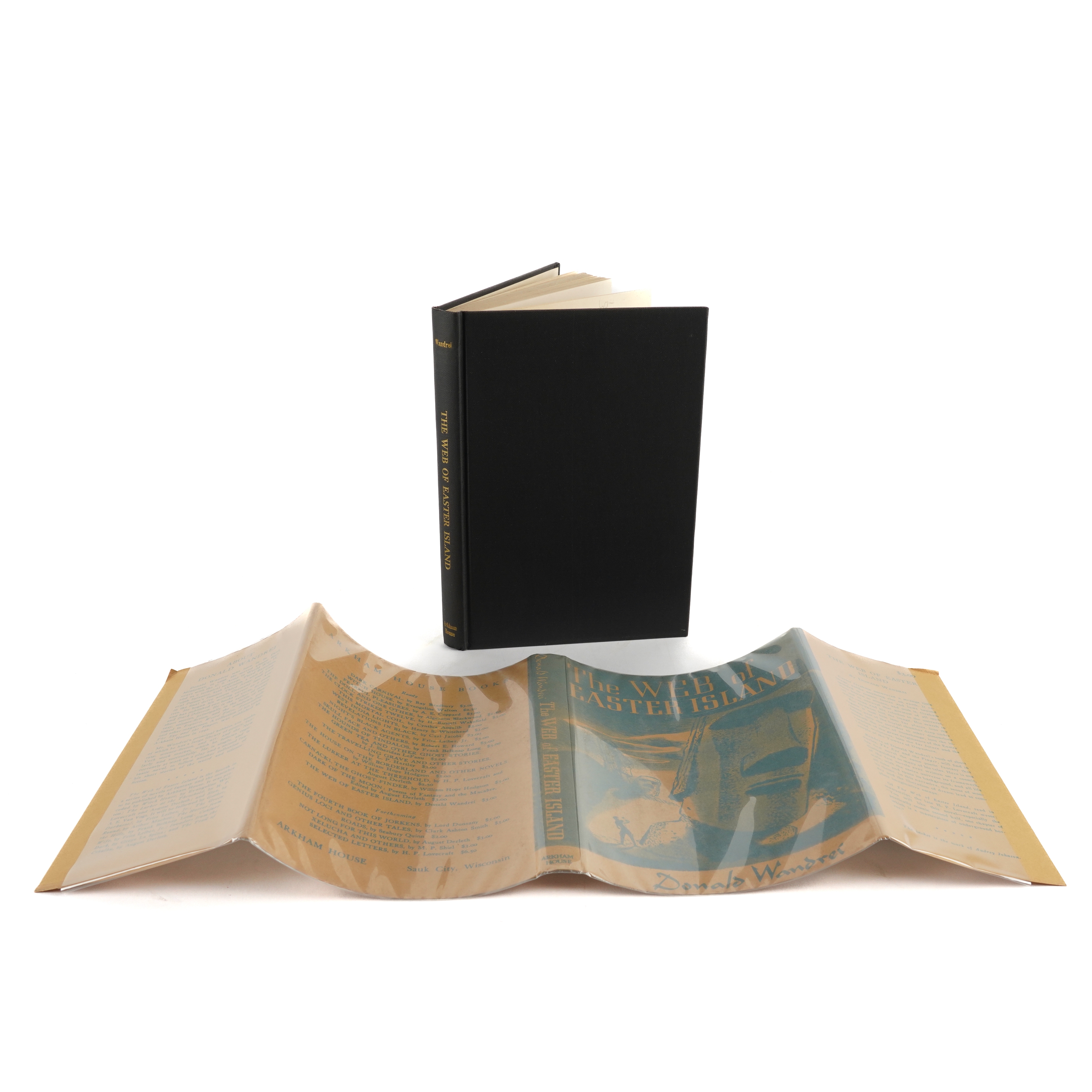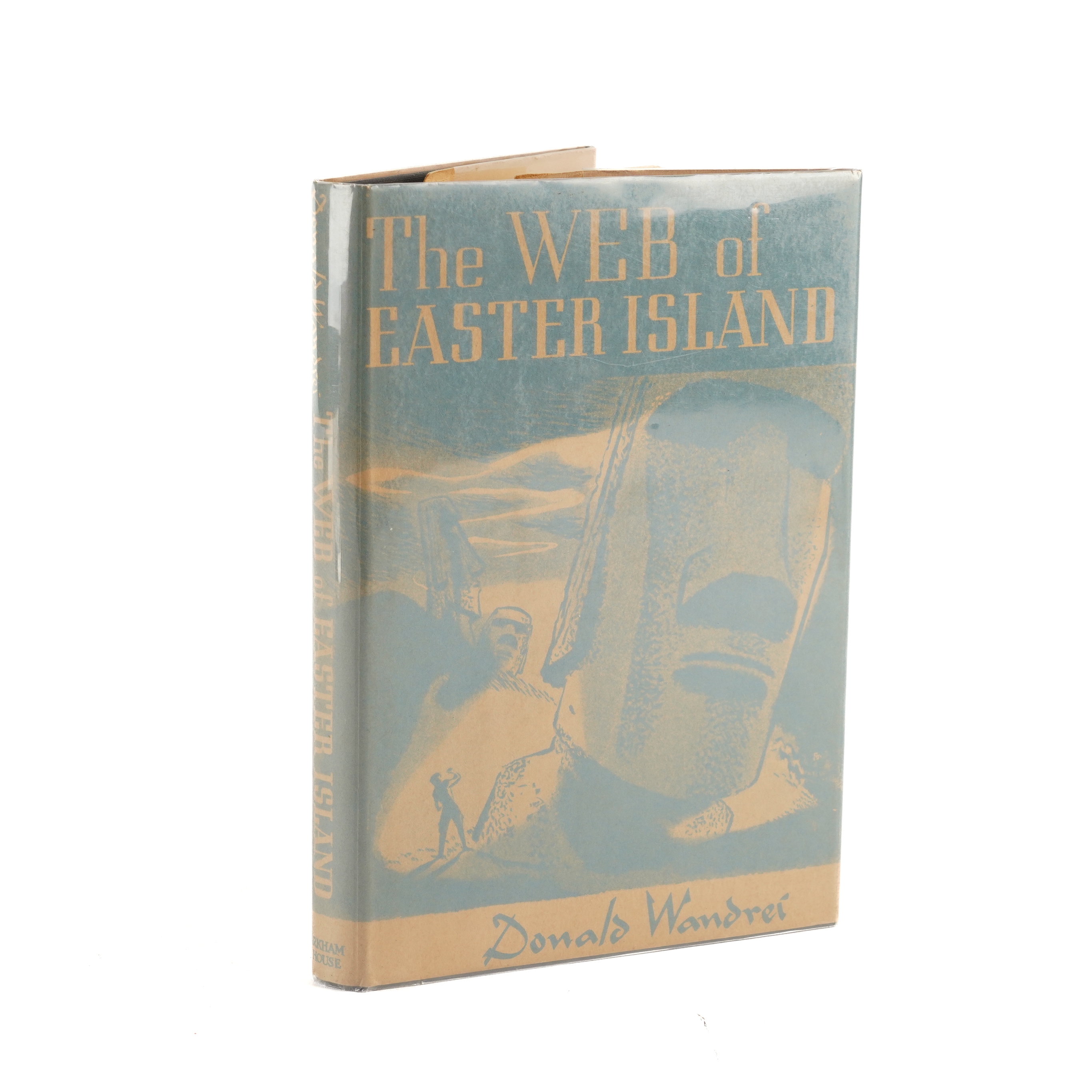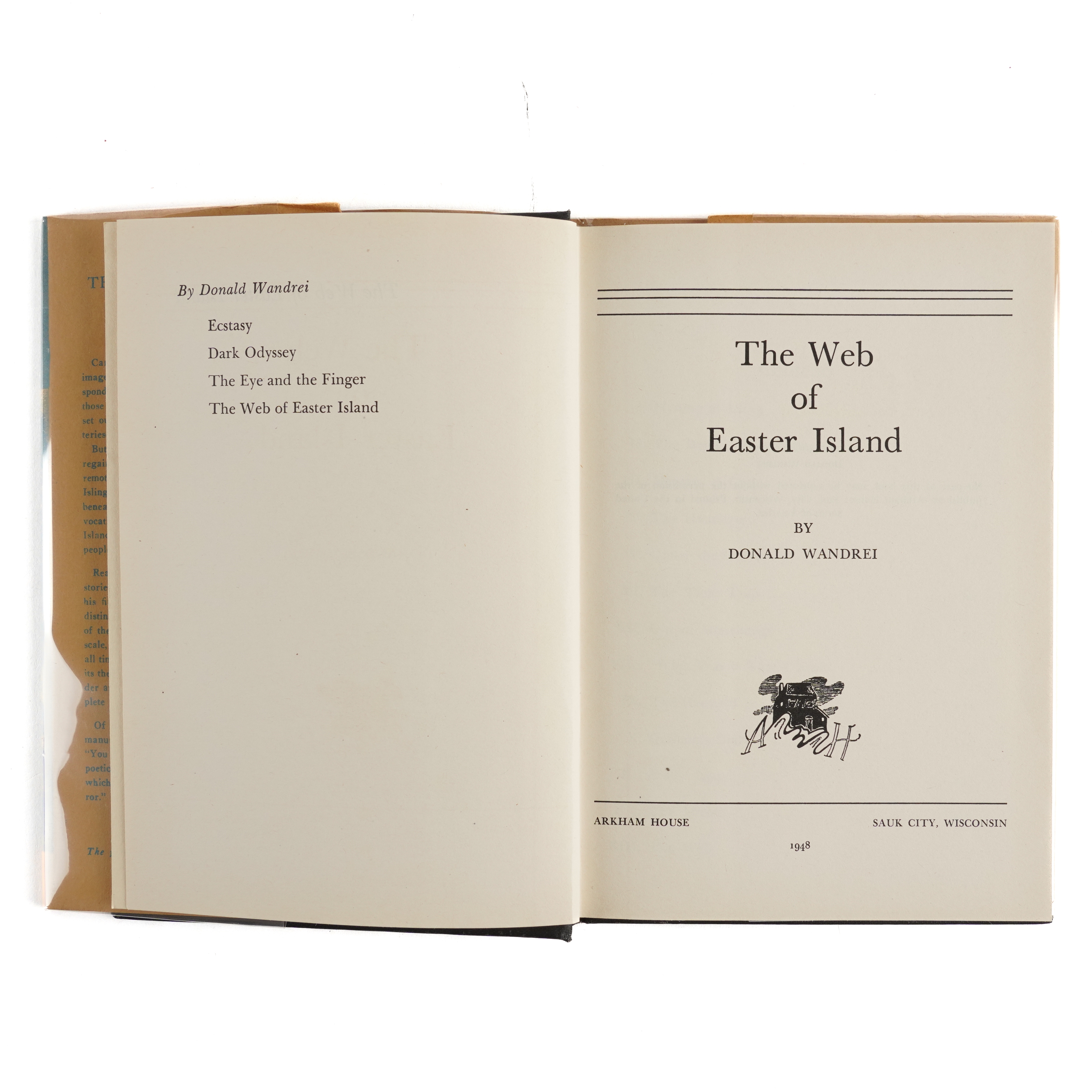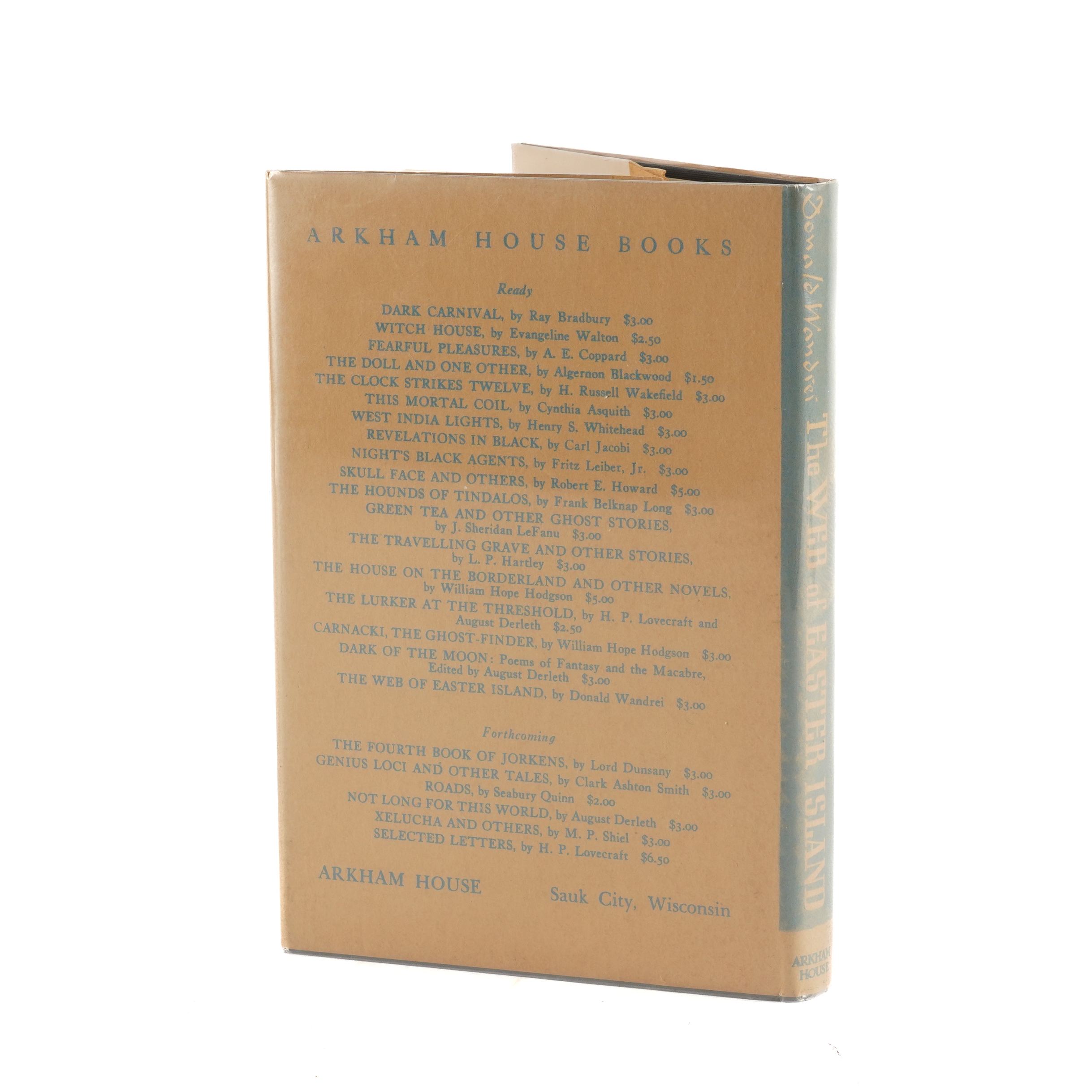 WANDREI, Donald (1908-87). The Web of Easter Island. Sauk City, Wisconsin: Arkham House, 1948. 8vo (184 x 130mm). Half title, woodcut printer's device on the title. Original black cloth, the spine lettered in gilt, the dust-jacket by Audrey Johnson with the price of $3.00 unclipped. A FINE COPY OF THE FIRST EDITION. A printed note at the end states: "Three thousand copies of this book have been printed from linotype Baskerville by the Collegiate Press, George Banta Publishing Company, Menasha, Wisconsin. This book is printed on Winnebago Eggshell. The binding cloth is Holliston Black Novelex." The book bears a printed dedication by the author to H. P. Lovecraft, who is mentioned on the front turn-in: "Of The Web of Easter Island, read in manuscript, the late H. P. Lovecraft wrote: 'You will like this novel - especially the poetically cosmic second half, one chapter of which is a masterpiece of underground horror'." Please note that the original dust-jacket has been photographed in its modern protective archival Mylar wrapper, thereby avoiding any risk of damage through its temporary removal. Bleiler The Guide to Supernatural Fiction (1983) 1657; Jaffery The Arkham House Companion (1992) 32.