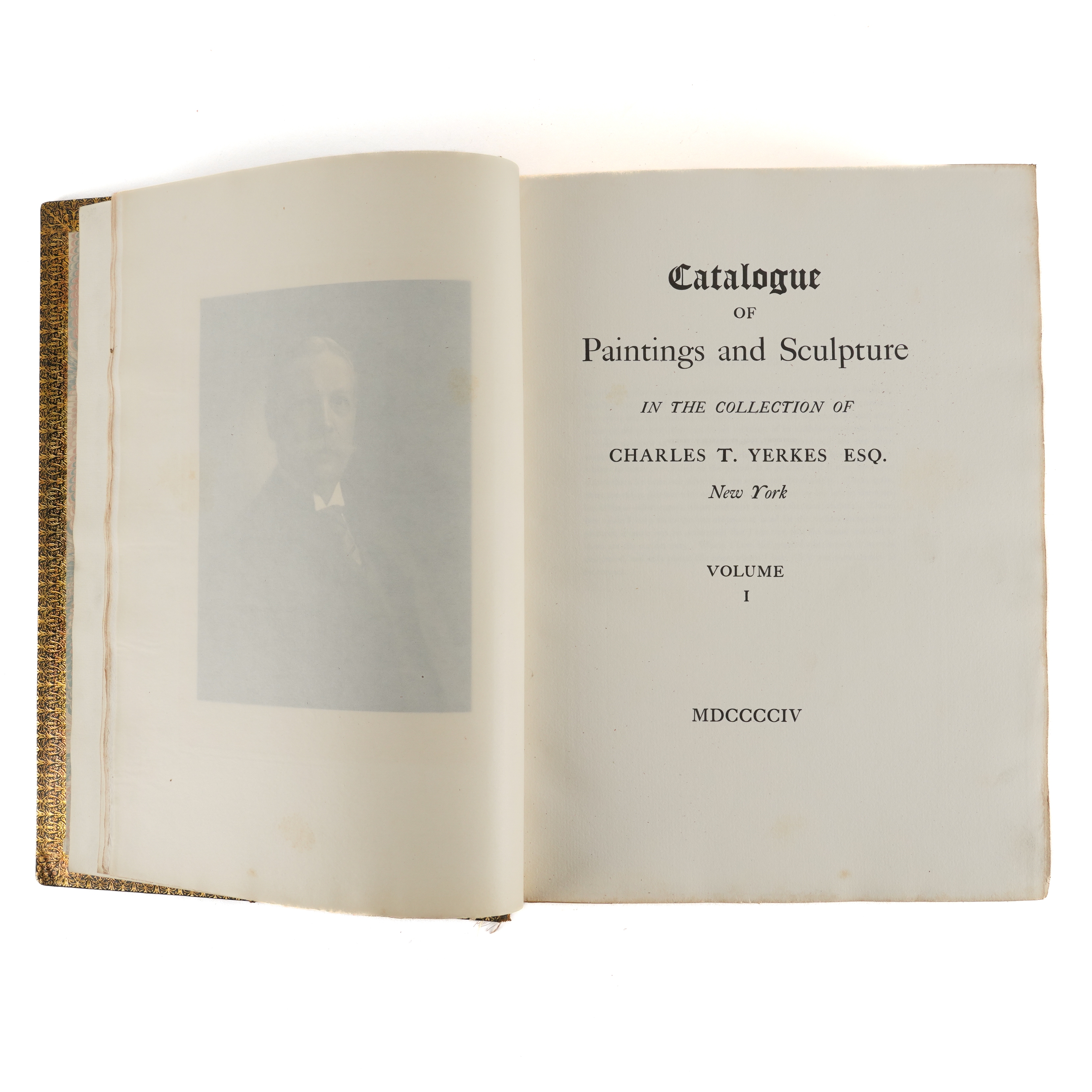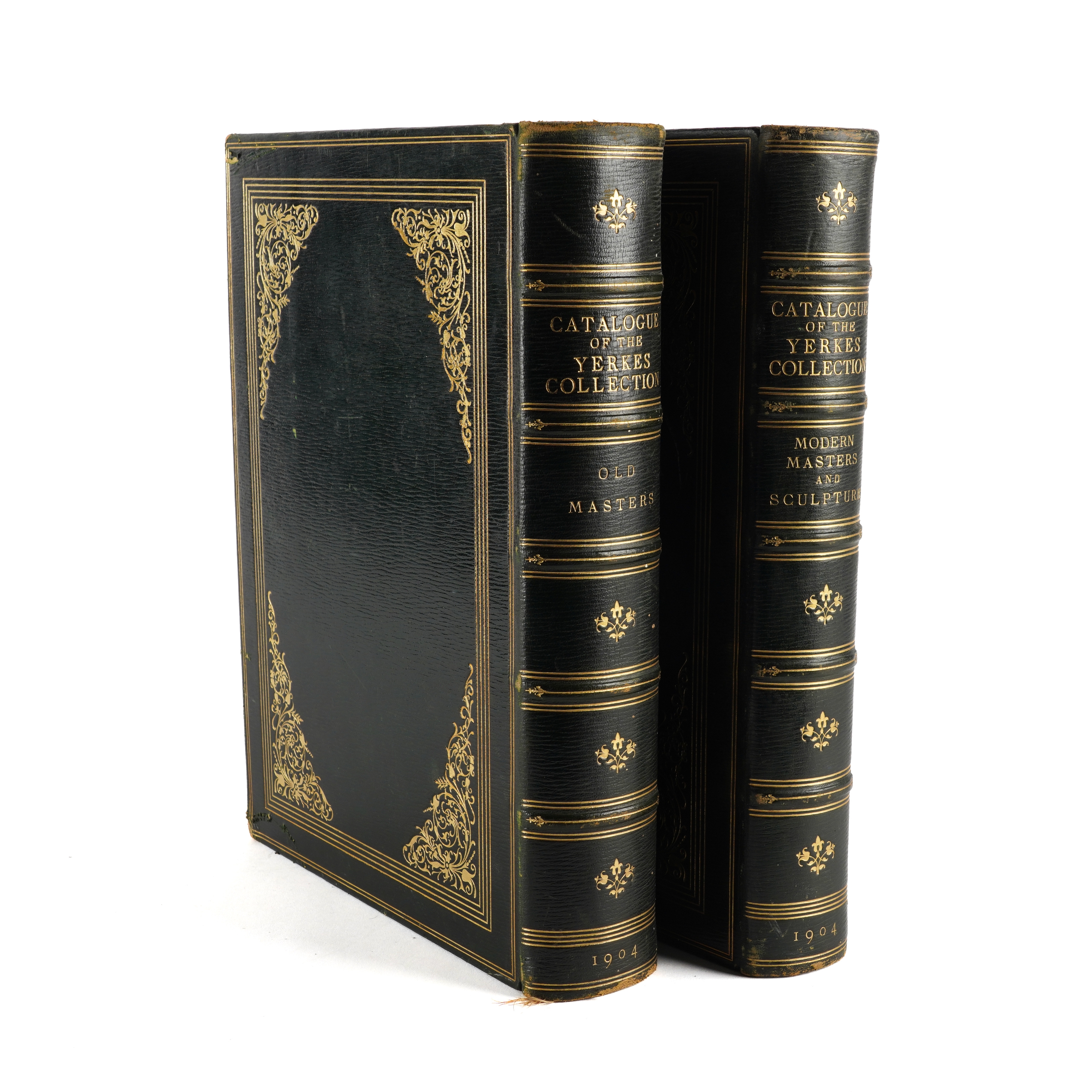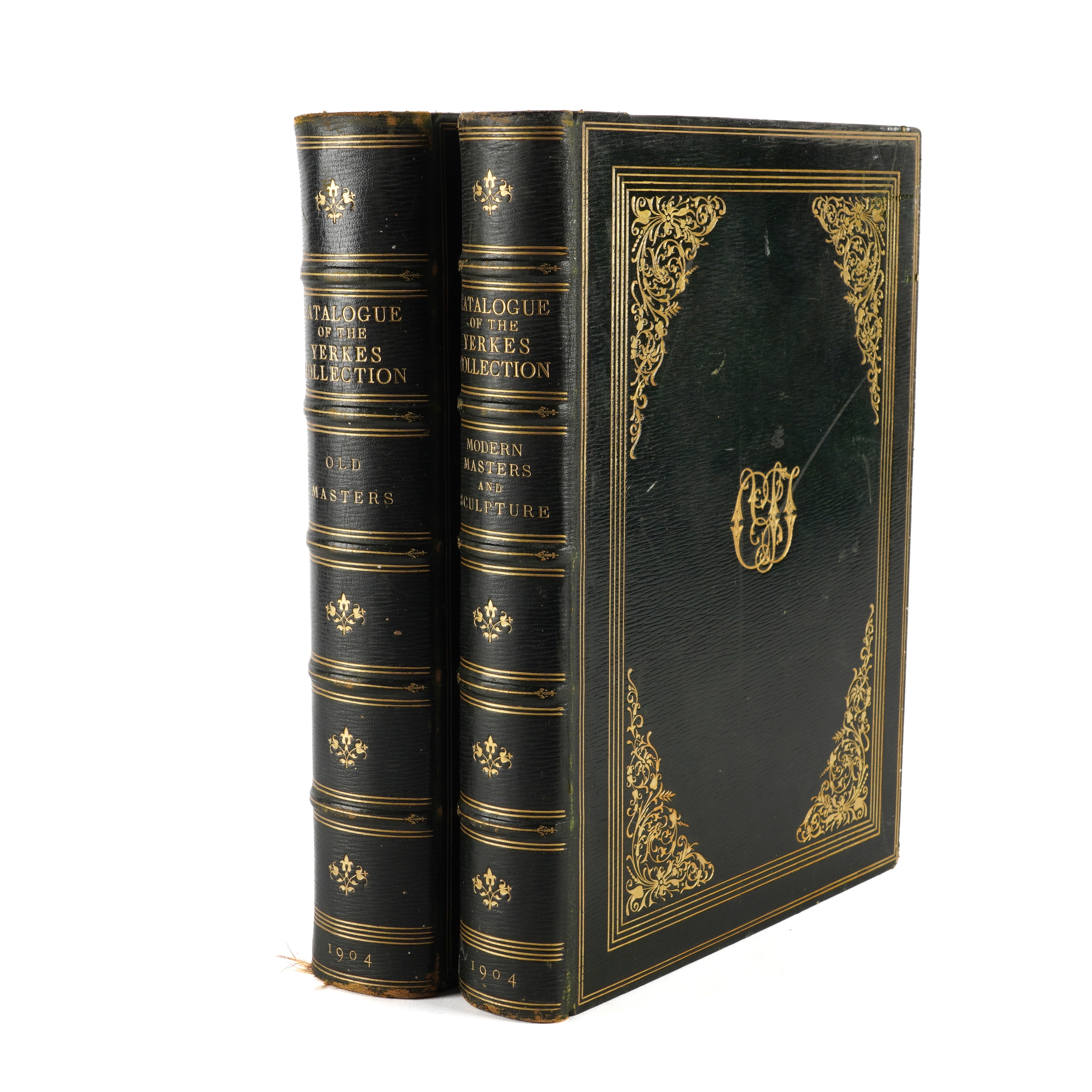 YERKES COLLECTION - Catalogue of Paintings and Sculpture in the Collection of Charles T. Yerkes Esq., New York. [Boston: A. W. Elson & Co.], 1904. 2 volumes, large 4to (360m x 265mm). Half titles, photogravure frontispiece portrait of Charles T. Yerkes, 200 photogravure plates (some light mainly marginal spotting and staining). FINELY BOUND IN CONTEMPORARY FULL STRAIGHT-GRAINED BLACK MOROCCO GILT, the covers with central Charles T. Yerkes' monogram within gilt-fillet borders with foliate cornerpieces, spines gilt in six compartments, top edges gilt, others uncut (some light rubbing and scuffing, extremities rubbed). FIRST EDITION. NUMBER 215 OF 250 COPIES. With a small quantity of art reference and miscellaneous books including Charles Morgan's Epitaph on George Moore (London, 1935, 8vo, plate of "Saturday Evening at the Vale" by Henry Tonks, original buckram-backed marbled paper boards, FIRST EDITION, PRESENTATION COPY, inscribed, "To Henry Tonks, in grateful recollection of other evenings at the Vale, from the author, Charles Morgan, November 22, 1935," with a further 2-page autograph letter from the author to Henry Tonks, with the same date as the presentation inscription, written in pencil from his sick-bed, concluding, "Here is the little book on G.M., published to-day. My big novel is finished, too [almost certainly Sparkenbroke, published in 1936], + the typescript is having its final revision. Yours very sincerely, Charles Morgan. Forgive my bedridden pencil." (qty)
