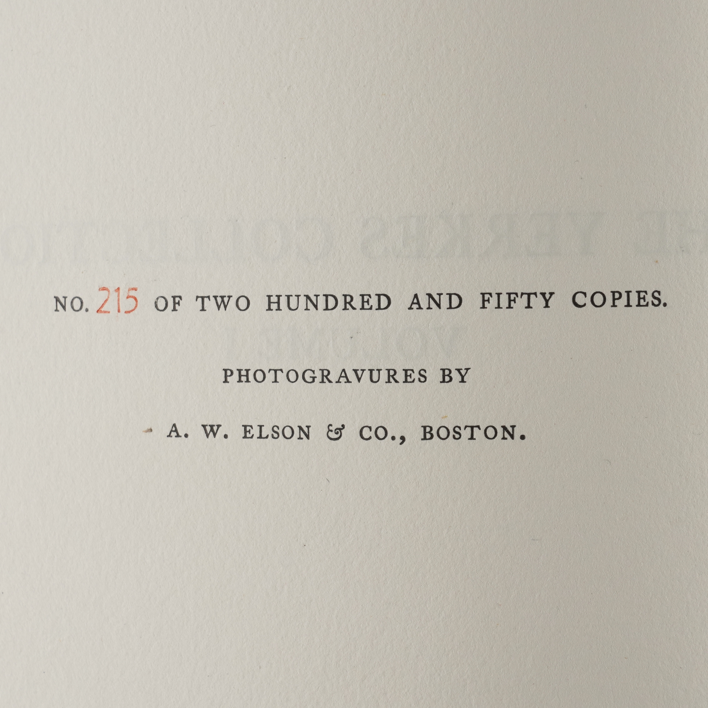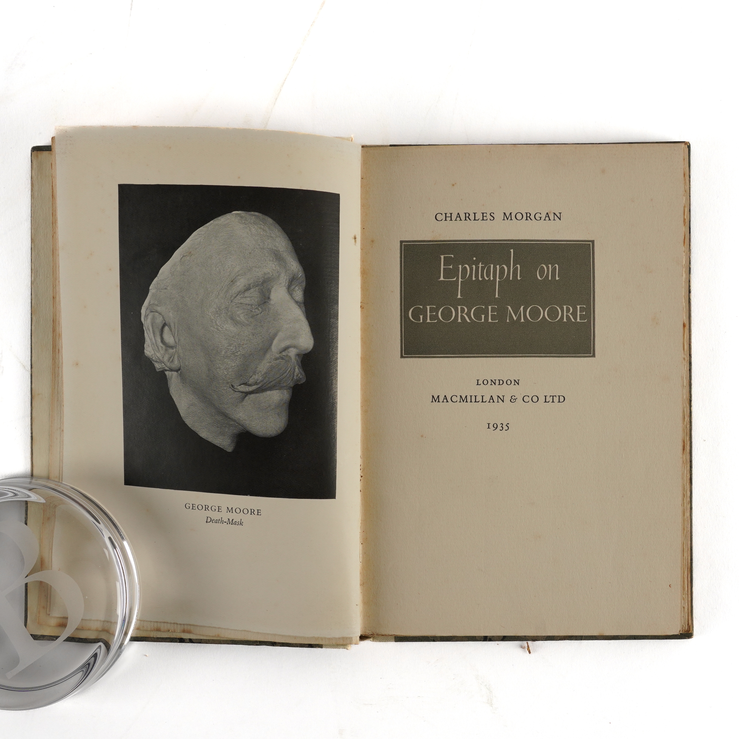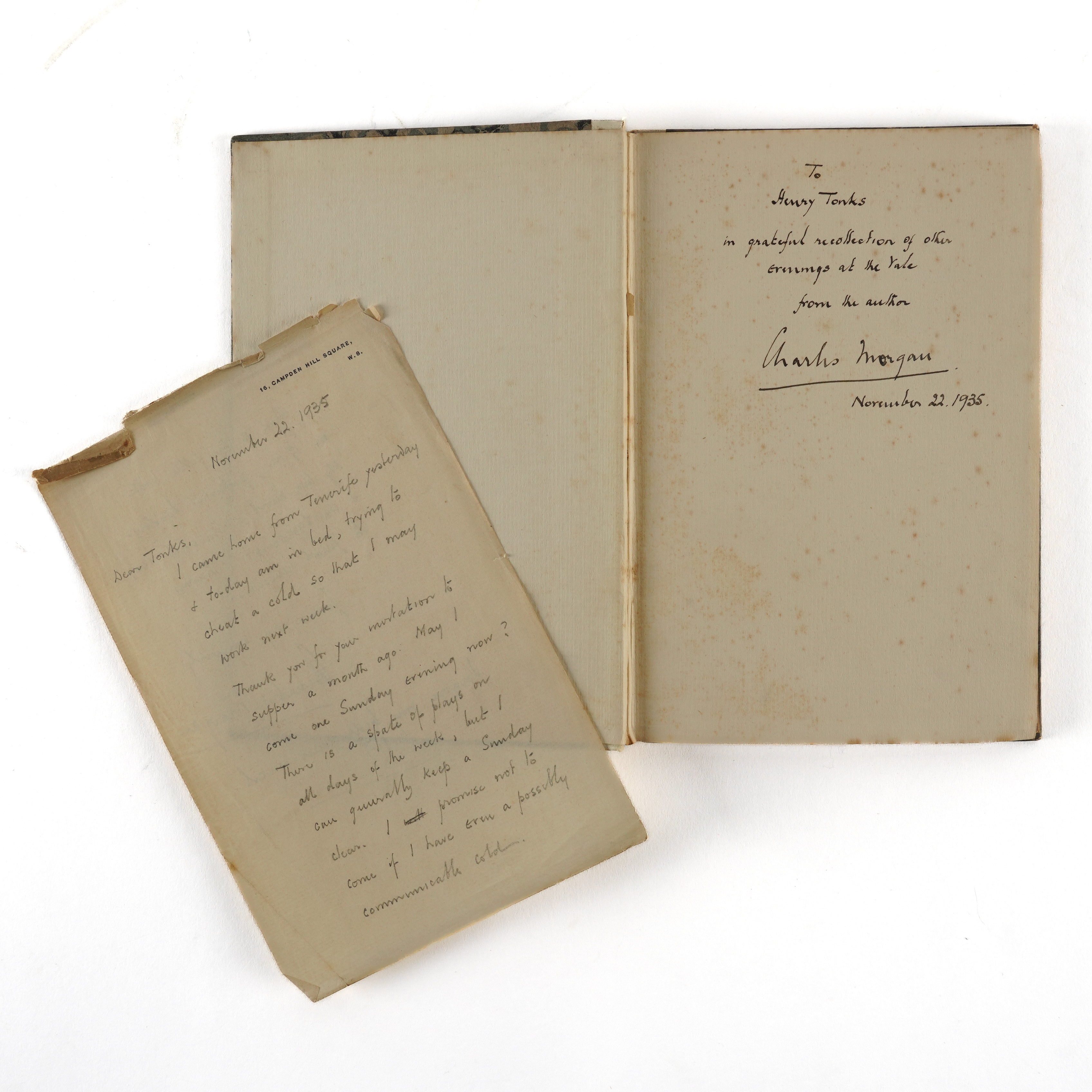 YERKES COLLECTION - Catalogue of Paintings and Sculpture in the Collection of Charles T. Yerkes Esq., New York. [Boston: A. W. Elson & Co.], 1904. 2 volumes, large 4to (360m x 265mm). Half titles, photogravure frontispiece portrait of Charles T. Yerkes, 200 photogravure plates (some light mainly marginal spotting and staining). FINELY BOUND IN CONTEMPORARY FULL STRAIGHT-GRAINED BLACK MOROCCO GILT, the covers with central Charles T. Yerkes' monogram within gilt-fillet borders with foliate cornerpieces, spines gilt in six compartments, top edges gilt, others uncut (some light rubbing and scuffing, extremities rubbed). FIRST EDITION. NUMBER 215 OF 250 COPIES. With a small quantity of art reference and miscellaneous books including Charles Morgan's Epitaph on George Moore (London, 1935, 8vo, plate of "Saturday Evening at the Vale" by Henry Tonks, original buckram-backed marbled paper boards, FIRST EDITION, PRESENTATION COPY, inscribed, "To Henry Tonks, in grateful recollection of other evenings at the Vale, from the author, Charles Morgan, November 22, 1935," with a further 2-page autograph letter from the author to Henry Tonks, with the same date as the presentation inscription, written in pencil from his sick-bed, concluding, "Here is the little book on G.M., published to-day. My big novel is finished, too [almost certainly Sparkenbroke, published in 1936], + the typescript is having its final revision. Yours very sincerely, Charles Morgan. Forgive my bedridden pencil." (qty)