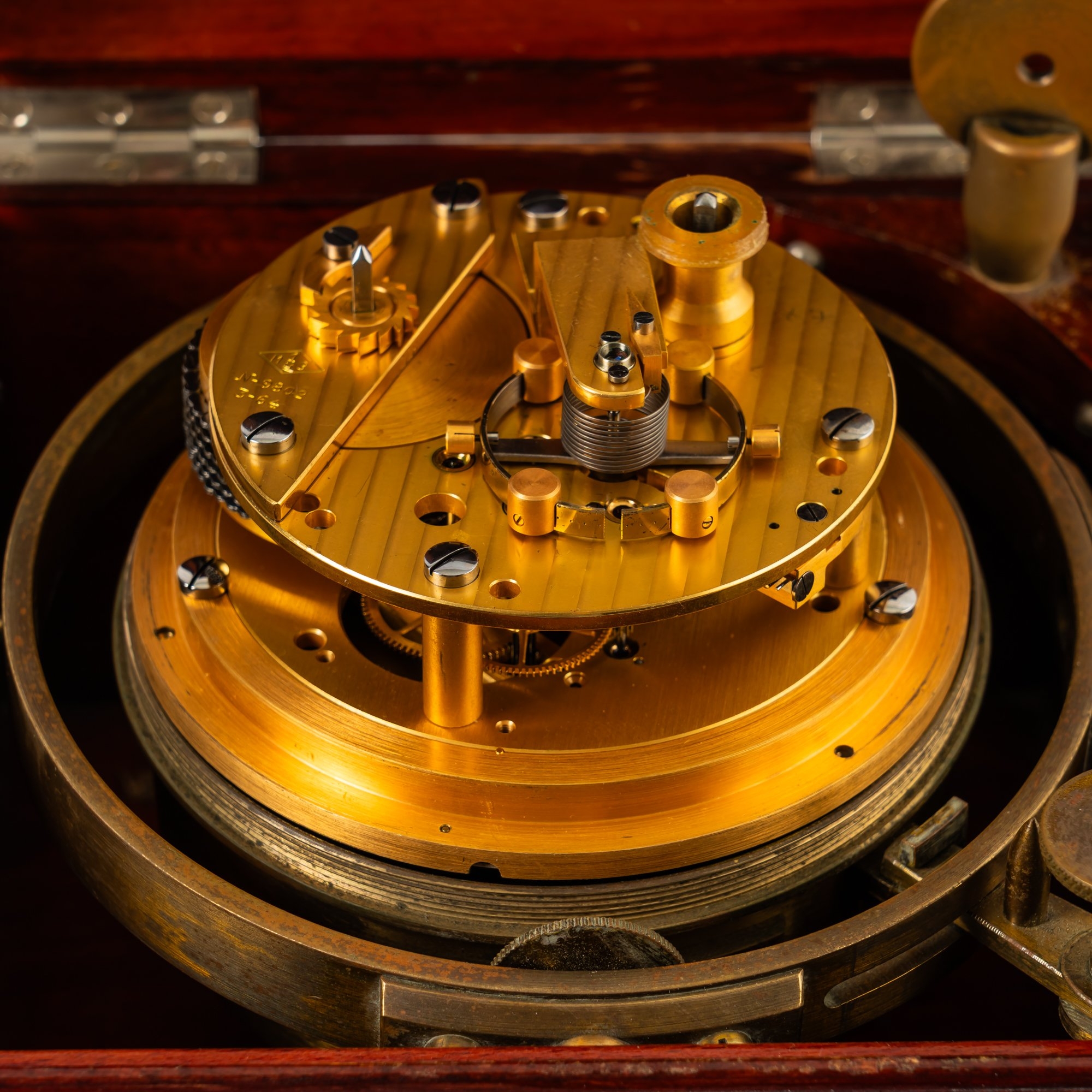The brass-bound three-tier case with hinged lid above glazed observation panel, with a pair of brass drop carrying handles, the brass bowl with screwed bezel and deep bevelled glass, held in a brass gimbal, the 4 1/4in silvered dial, signed and numbered 9802, with subsidiaries for seconds and state of winding, the chain fusée movement with Earnshaw type escapement, bi-metallic compensated balance, freesprung steel helical spring with jewelled endstone, maker’s mark and number to the barrel bridge